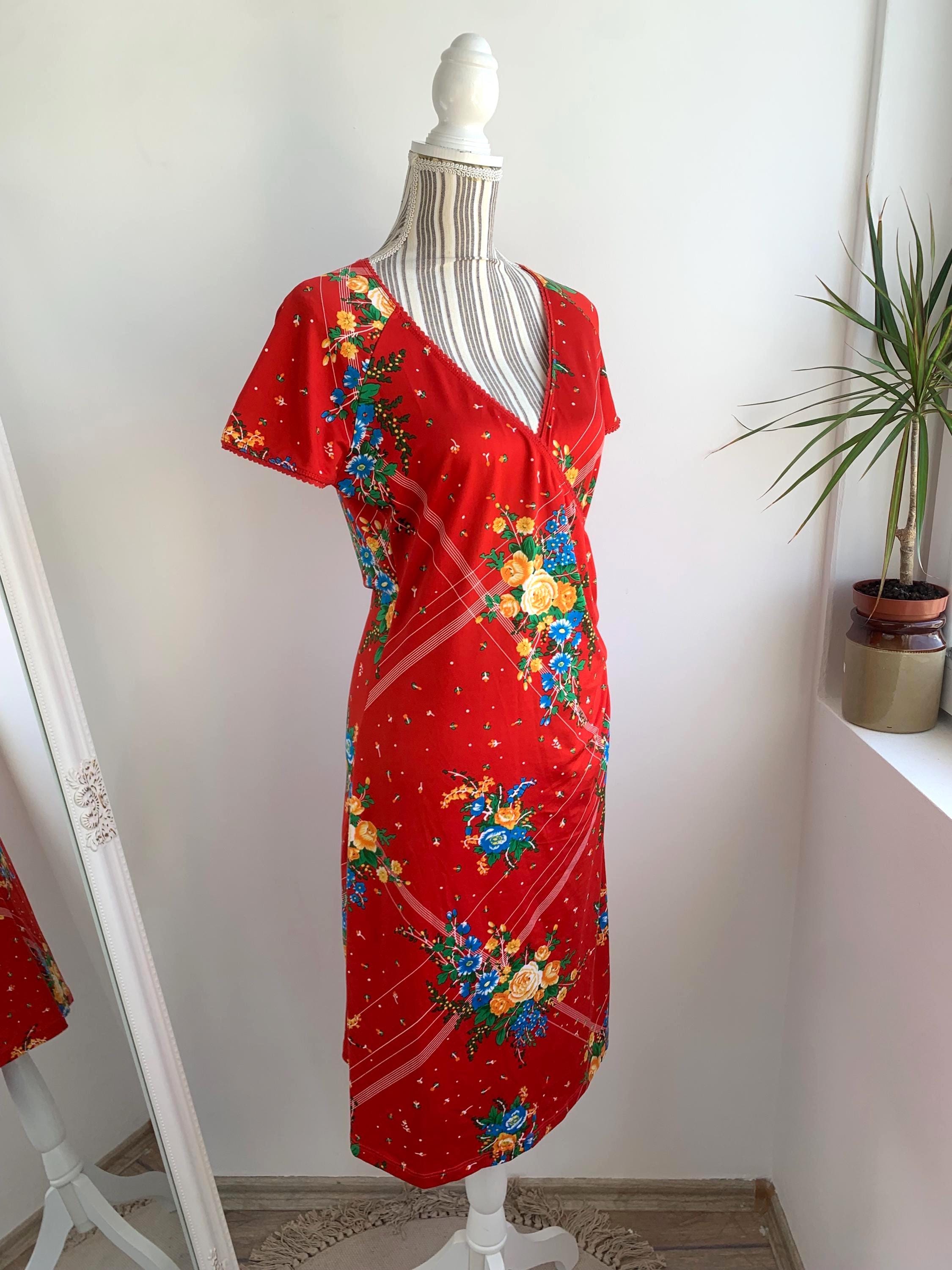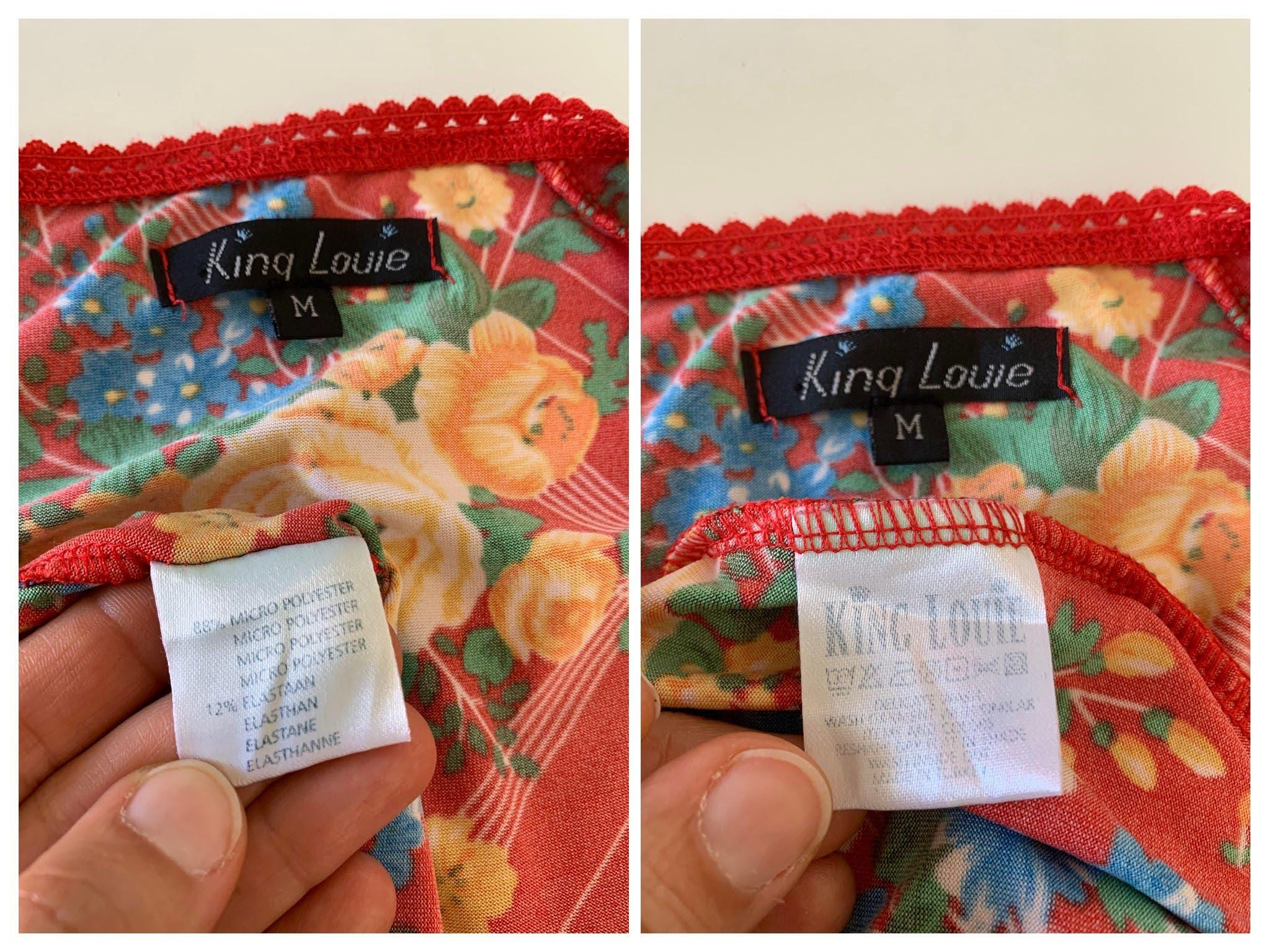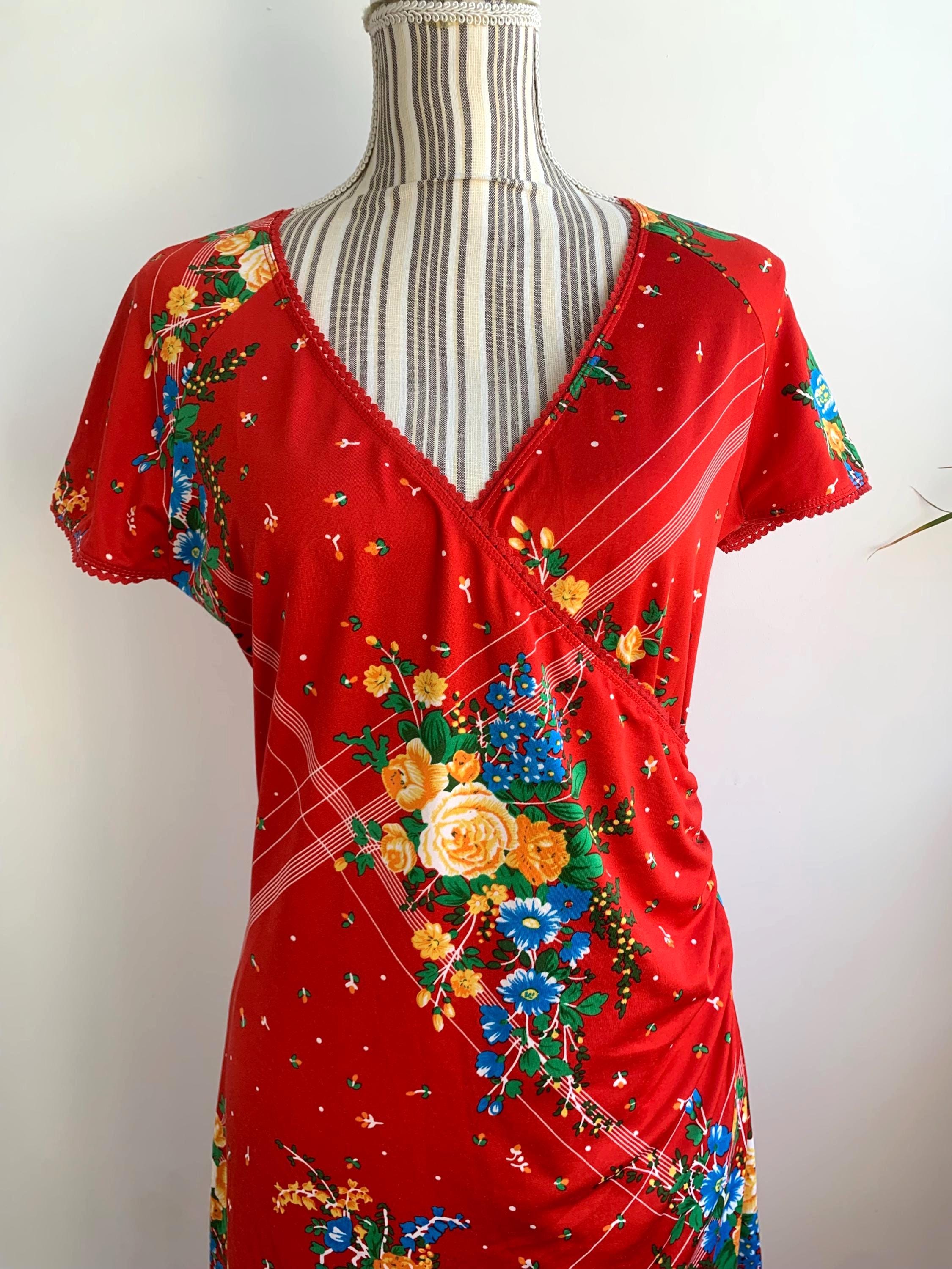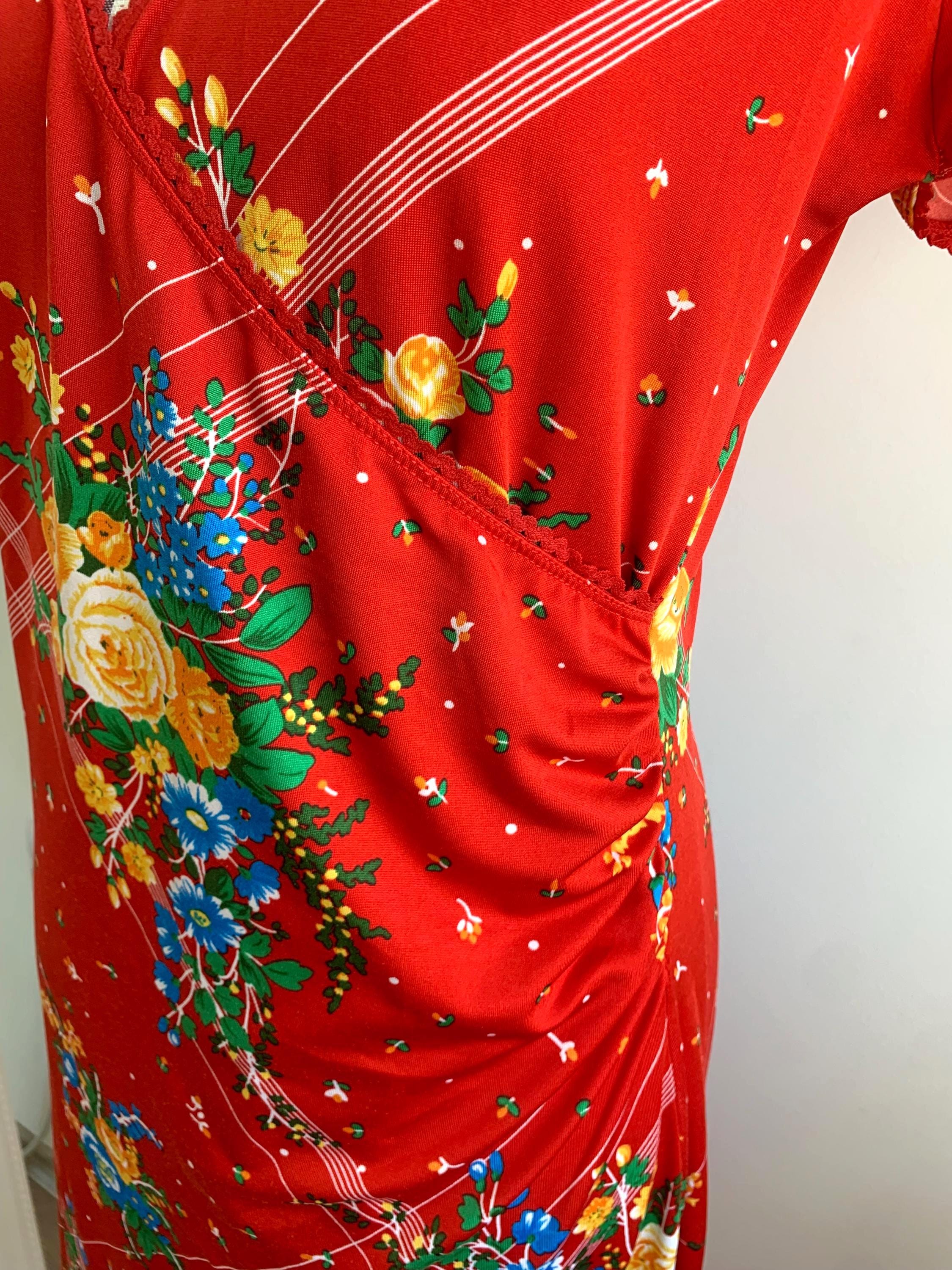 This is a beautiful vintage 90s King Louie mock wrap dress with V neck and short sleeves, made of stretchy jersey fabric which beautifully wraps the body. The size marked is M. The fabric is made of 88% micro polyester and 12% elastane.