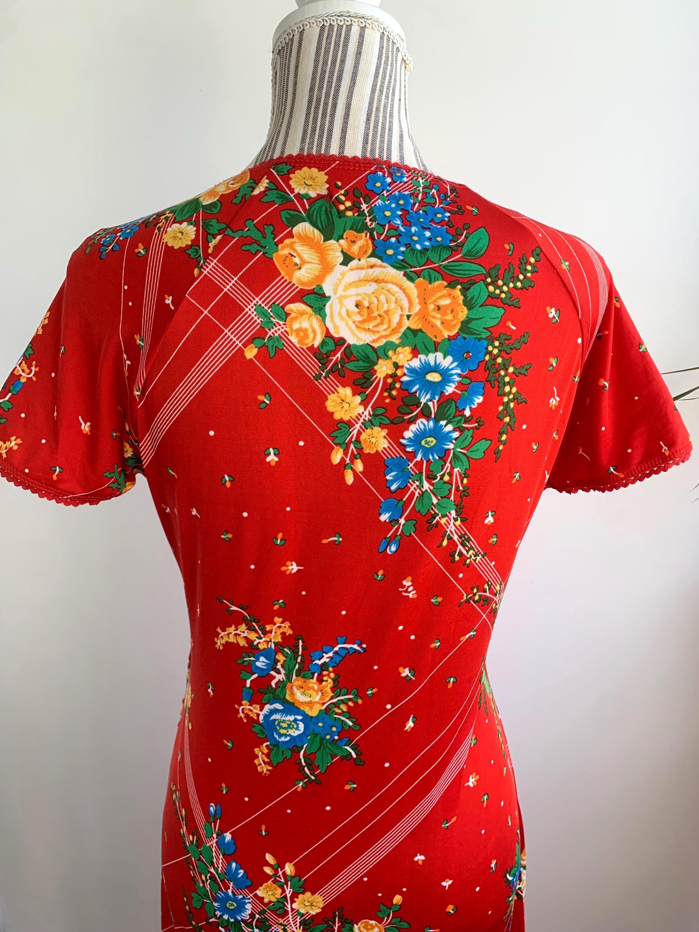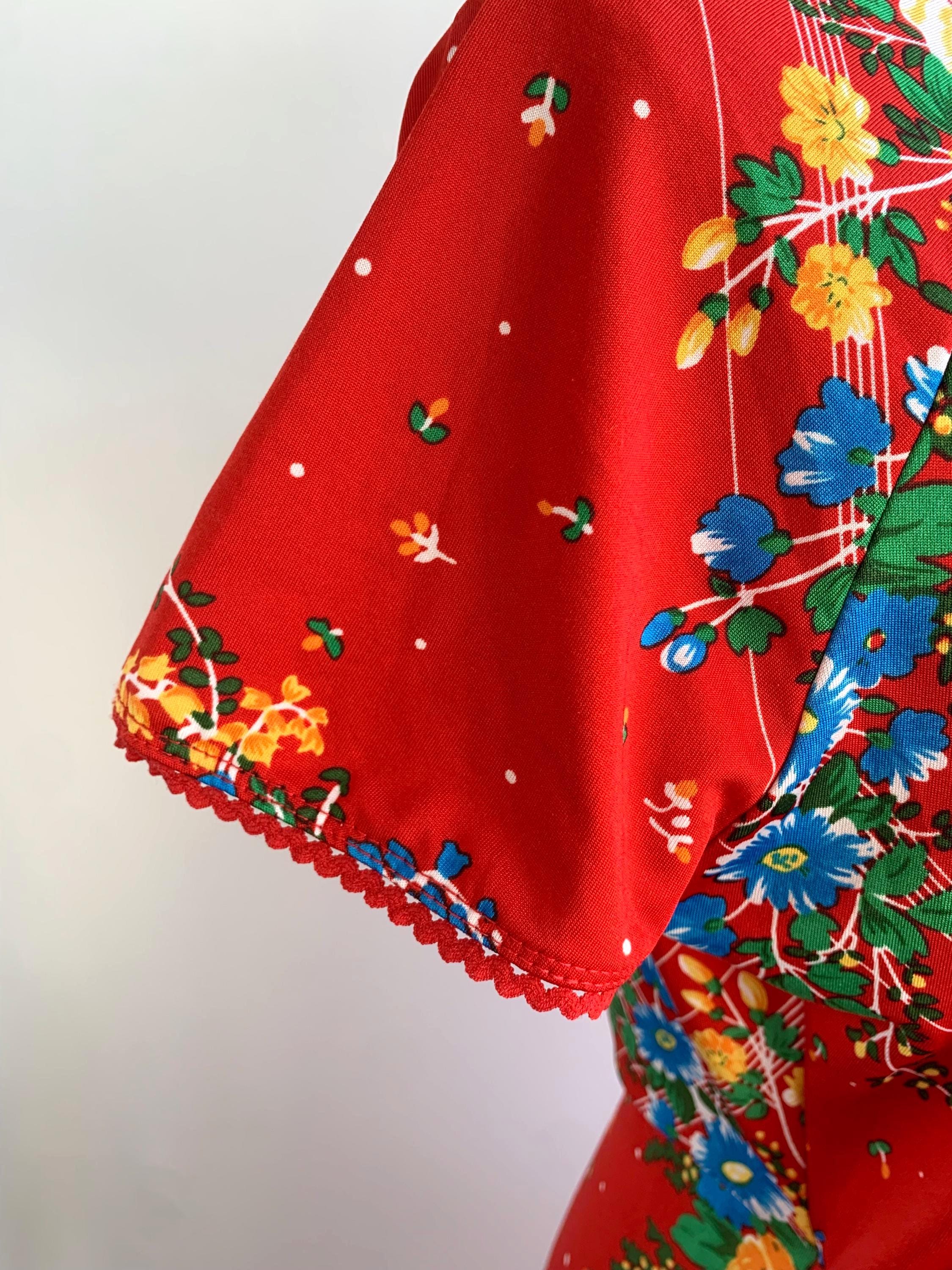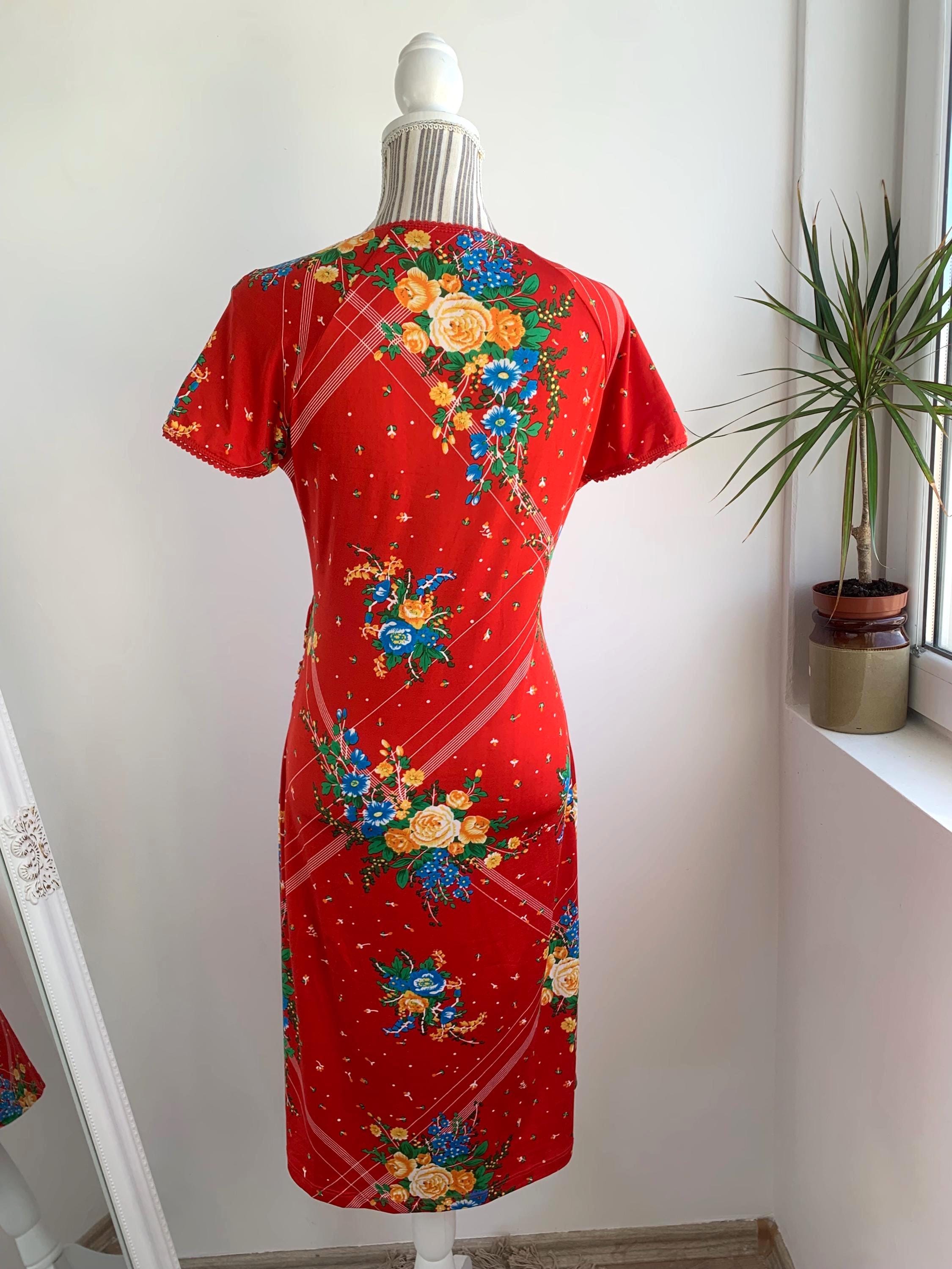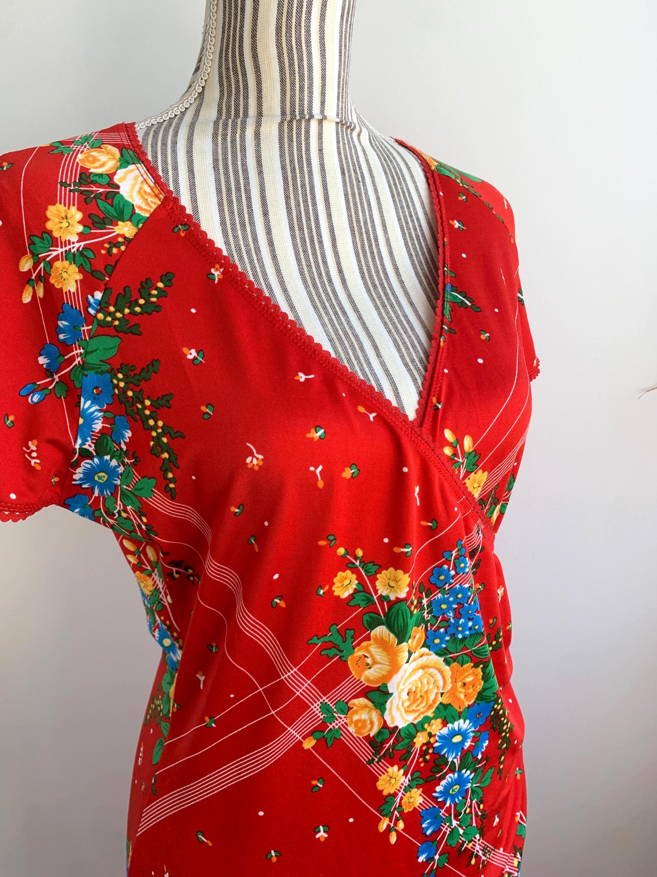 This is a beautiful vintage 90s King Louie mock wrap dress with V neck and short sleeves, made of stretchy jersey fabric which beautifully wraps the body. The size marked is M. The fabric is made of 88% micro polyester and 12% elastane.