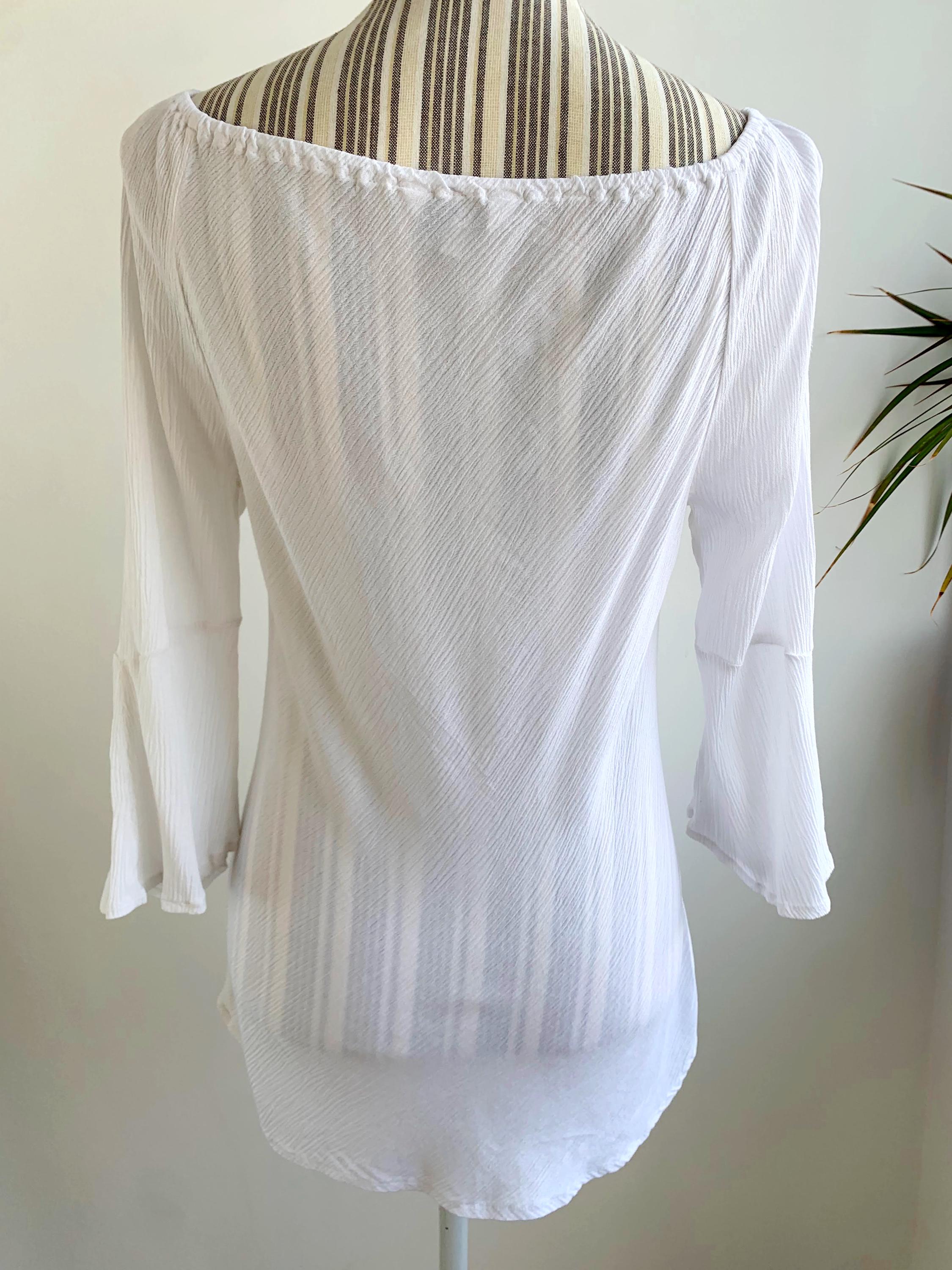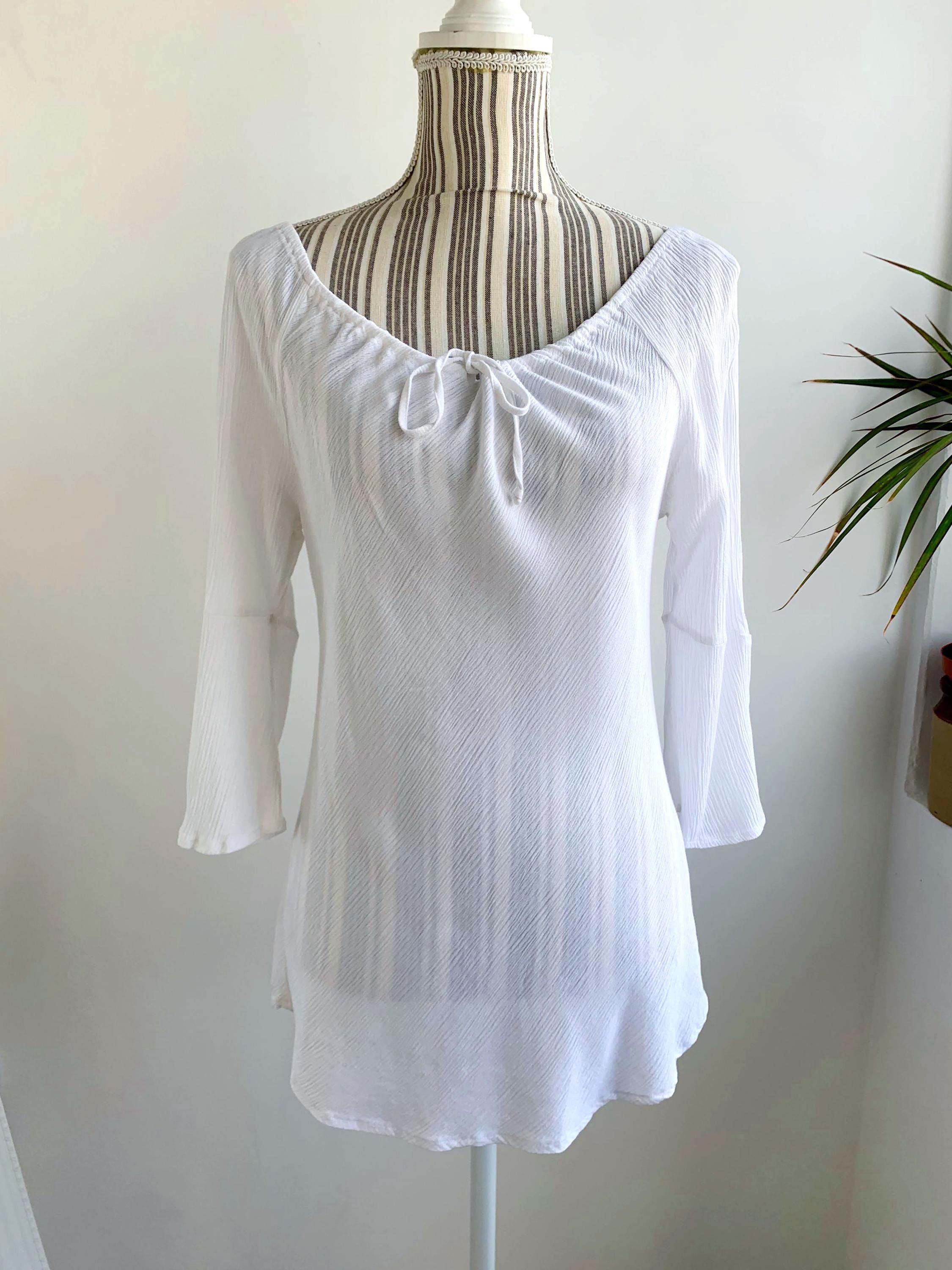 Vintage Y2K white off the shoulder top with drawstring neckline and 3/4 length sleeves. This boho white summer blouse is made of semi sheer crepe viscose fabric. This basic summer tunic top shirt is size S. This peasant blouse is a perfect breathable piece of clothing for the summer.