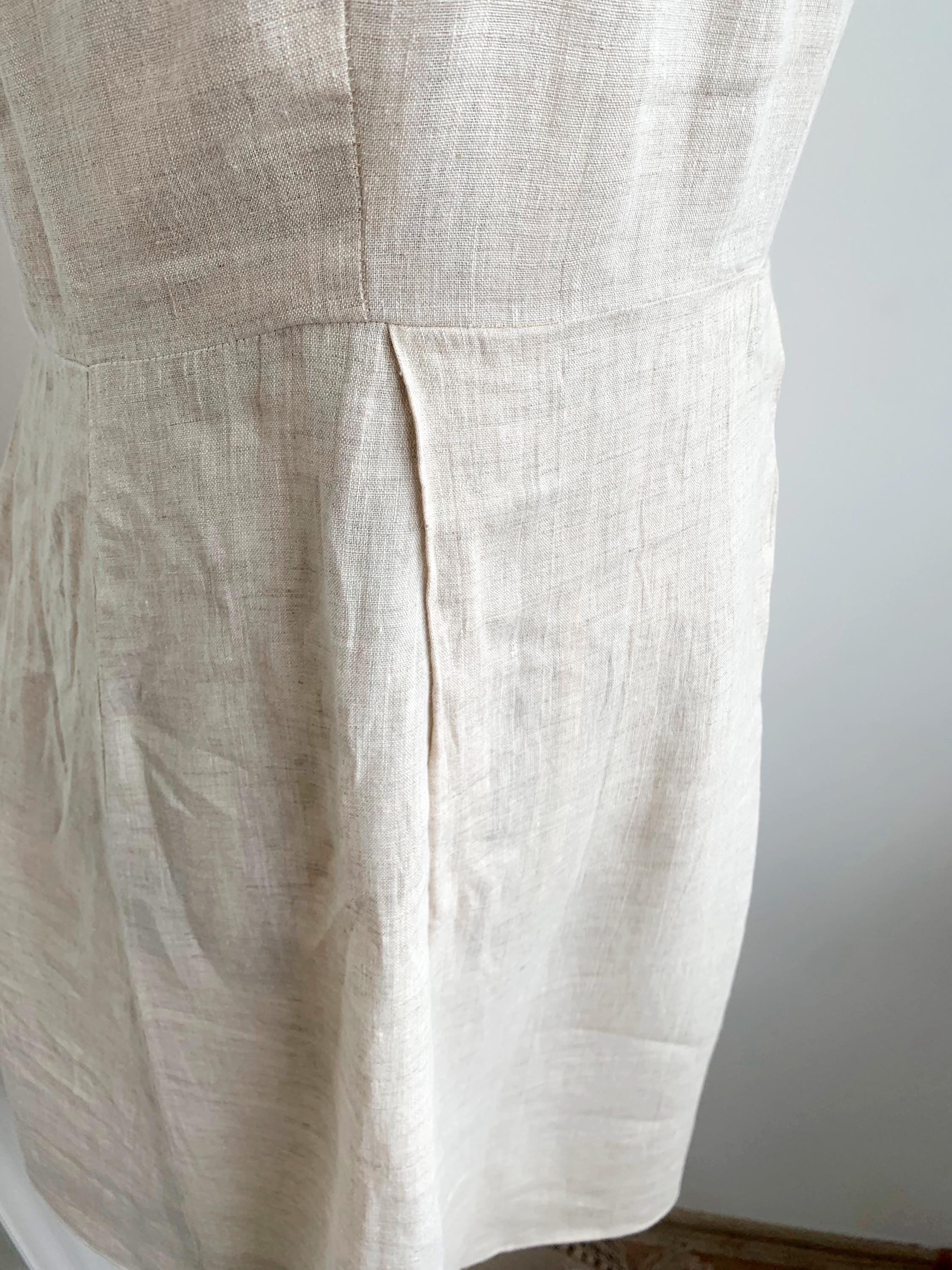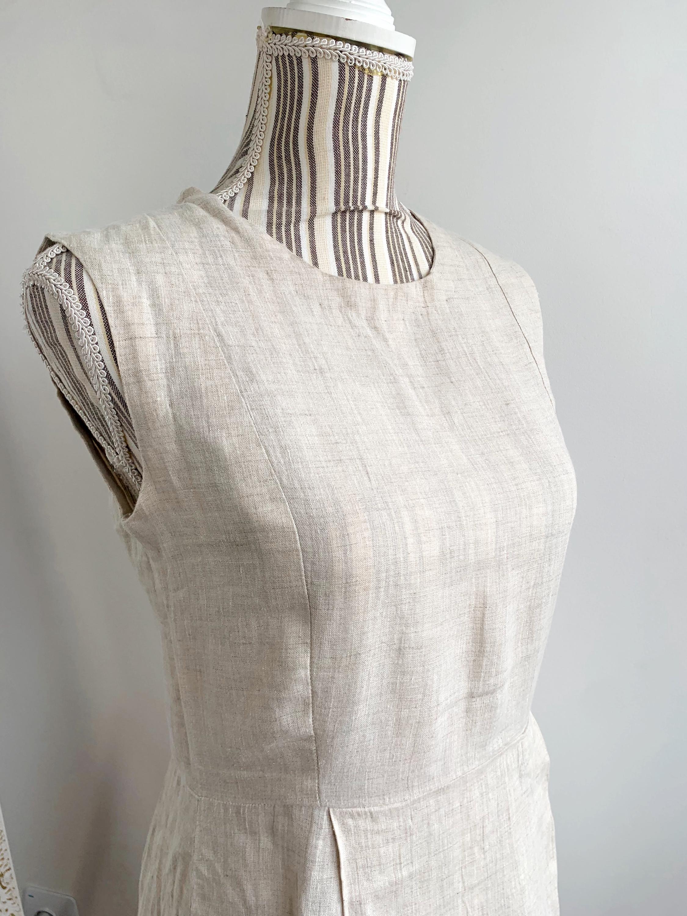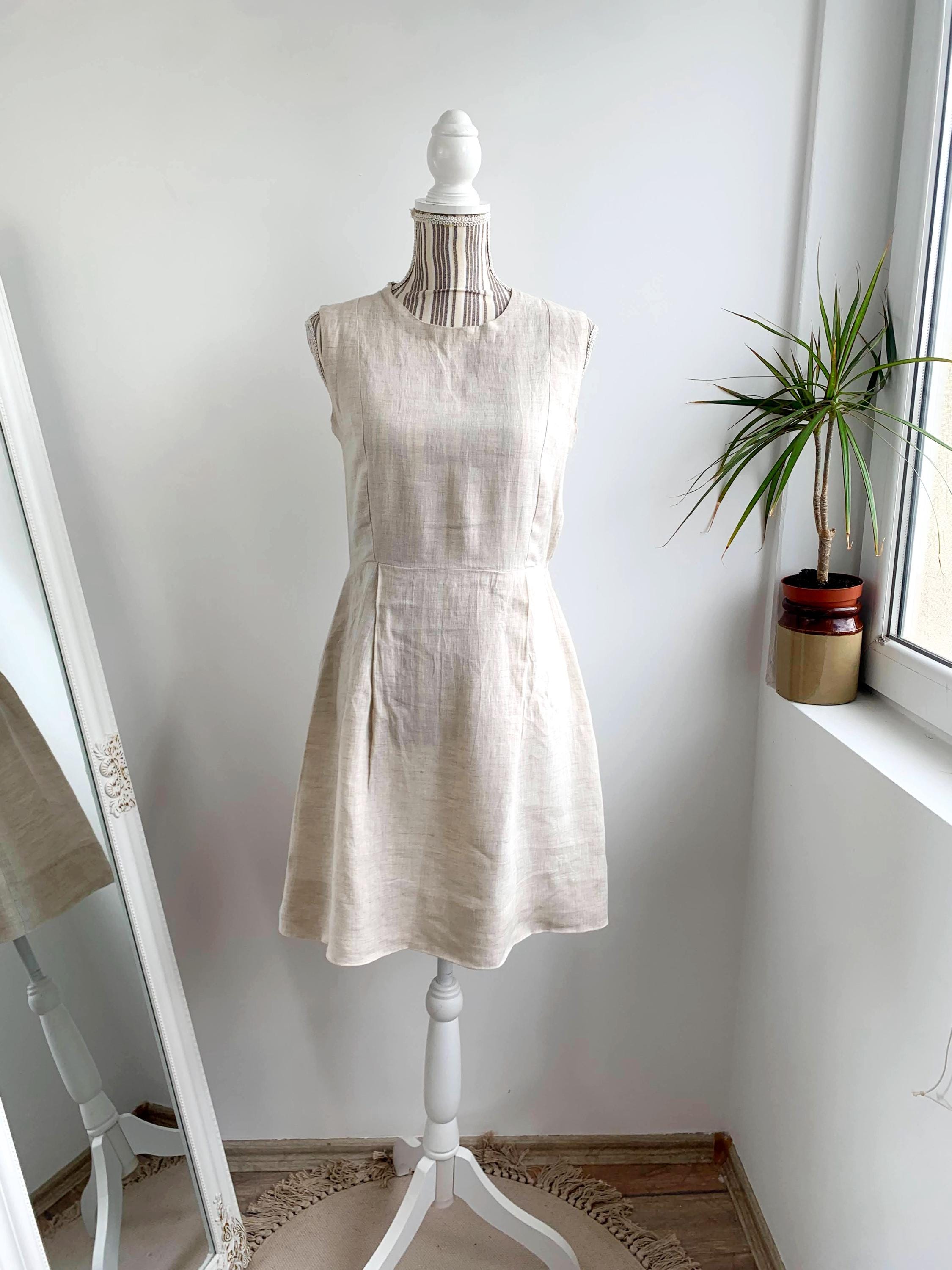 This is a vintage pre-loved handmade cream beige linen dress with fitted top and flared skirt, with side snap button closure. This basic linen summer dress has no tags or labels, it fits like size S.