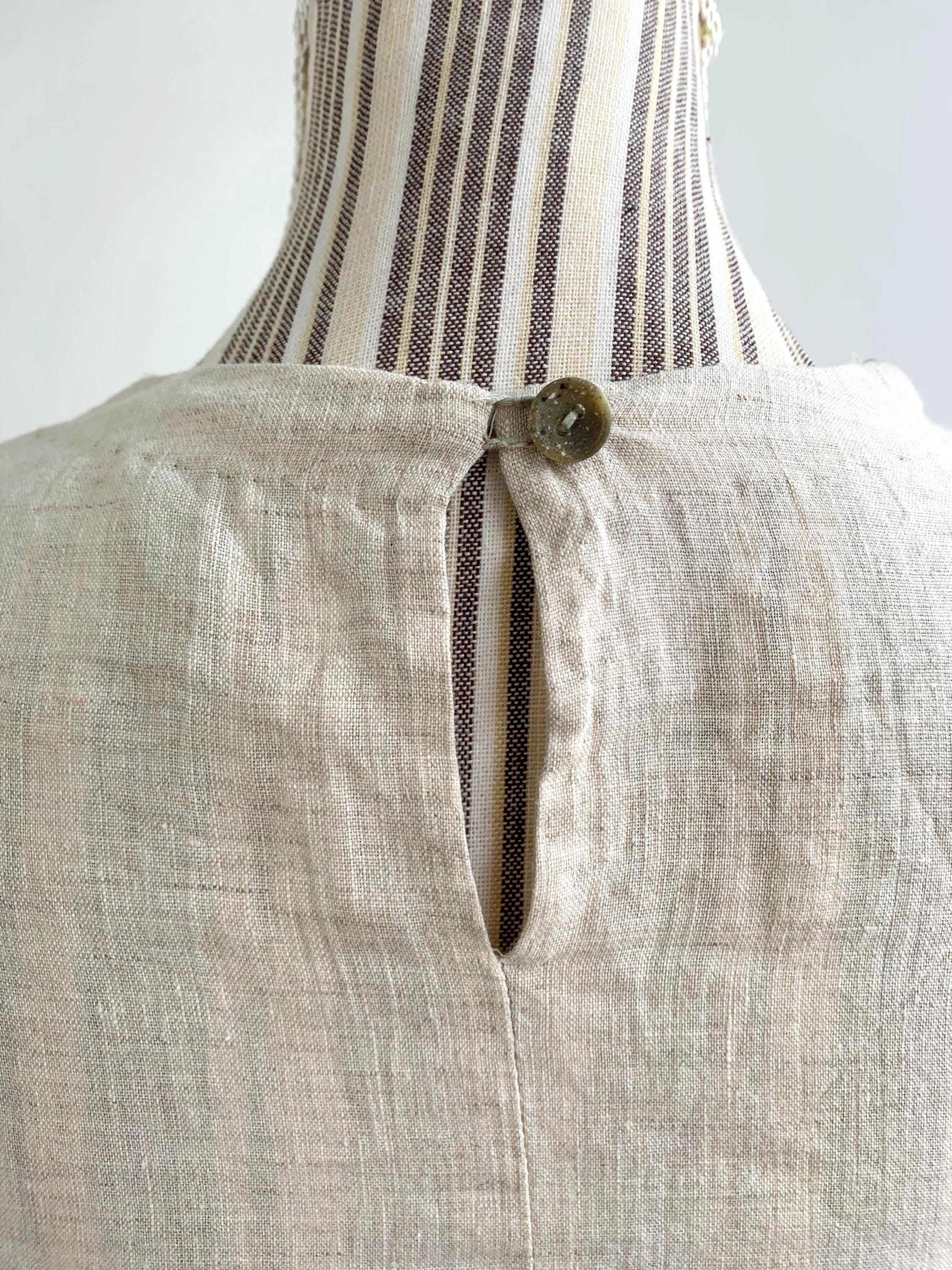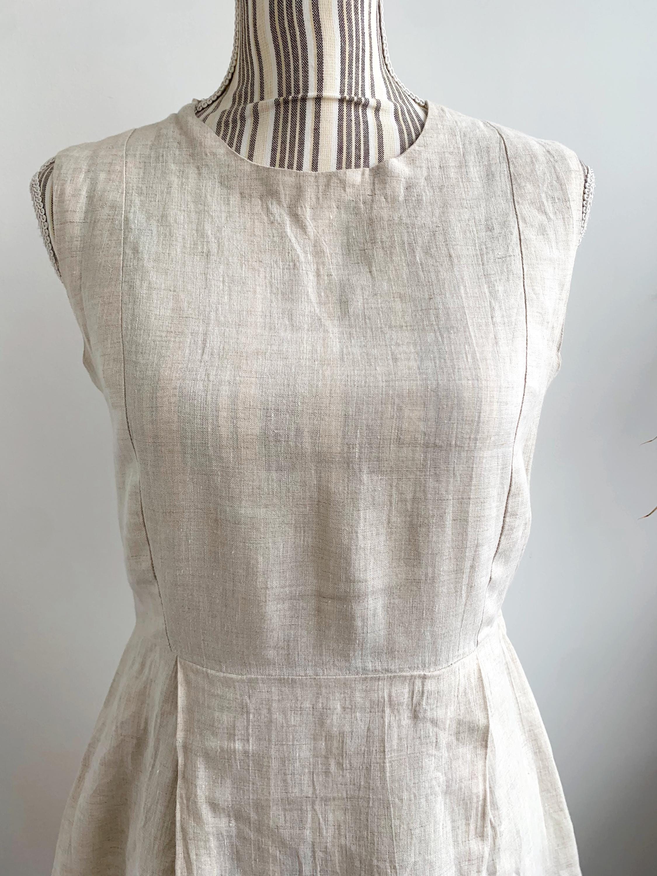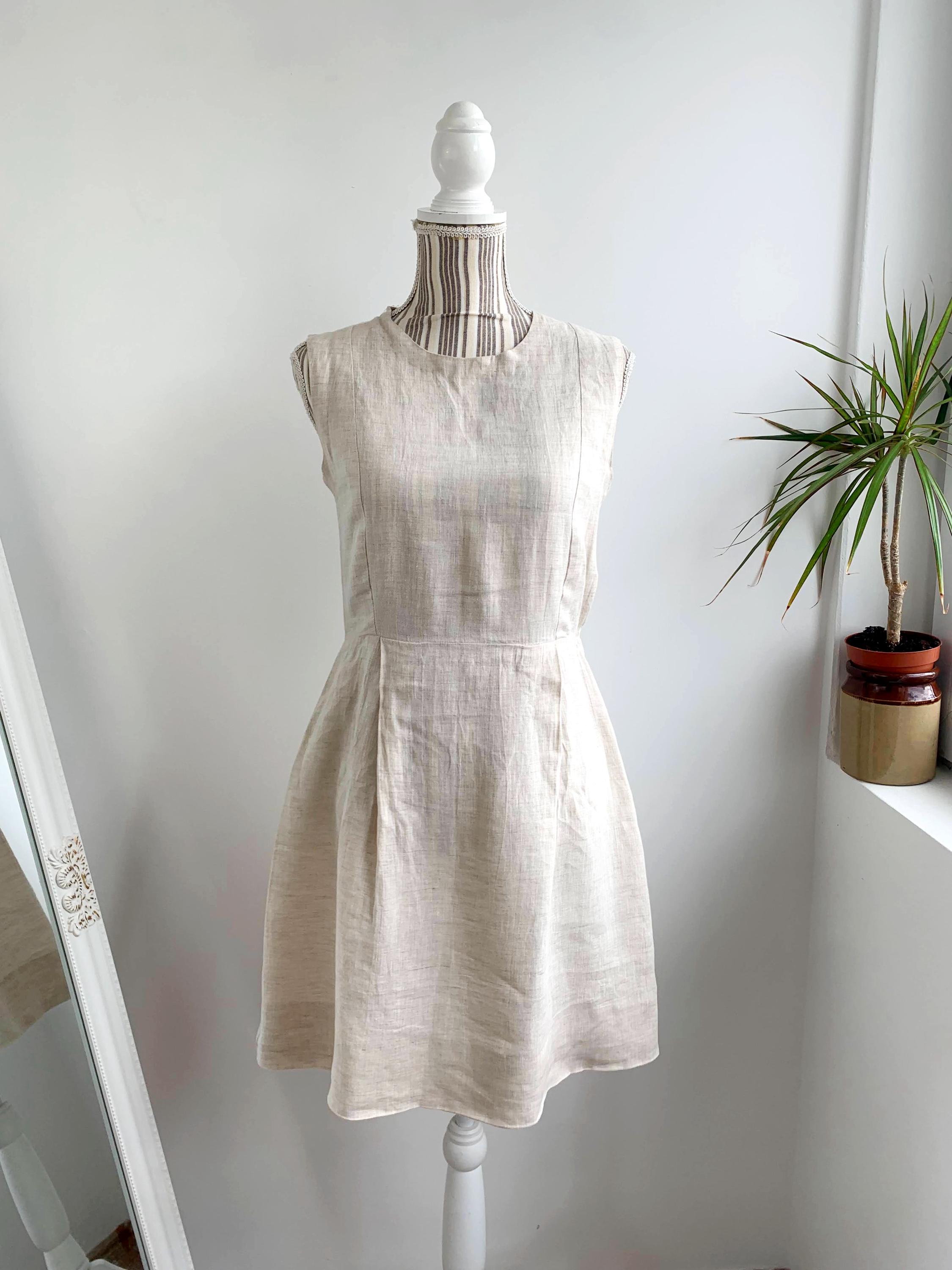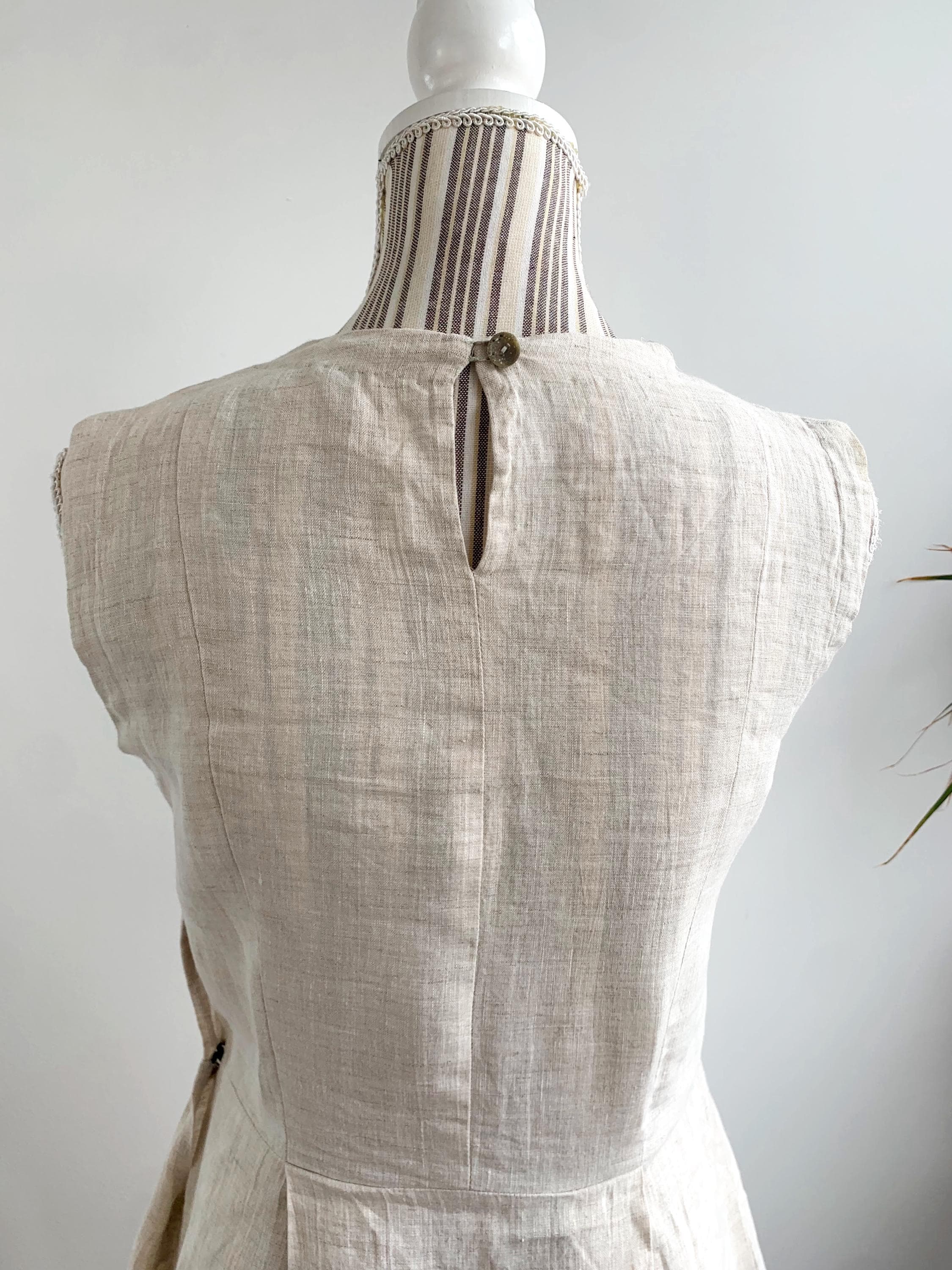This is a vintage pre-loved handmade cream beige linen dress with fitted top and flared skirt, with side snap button closure. This basic linen summer dress has no tags or labels, it fits like size S.