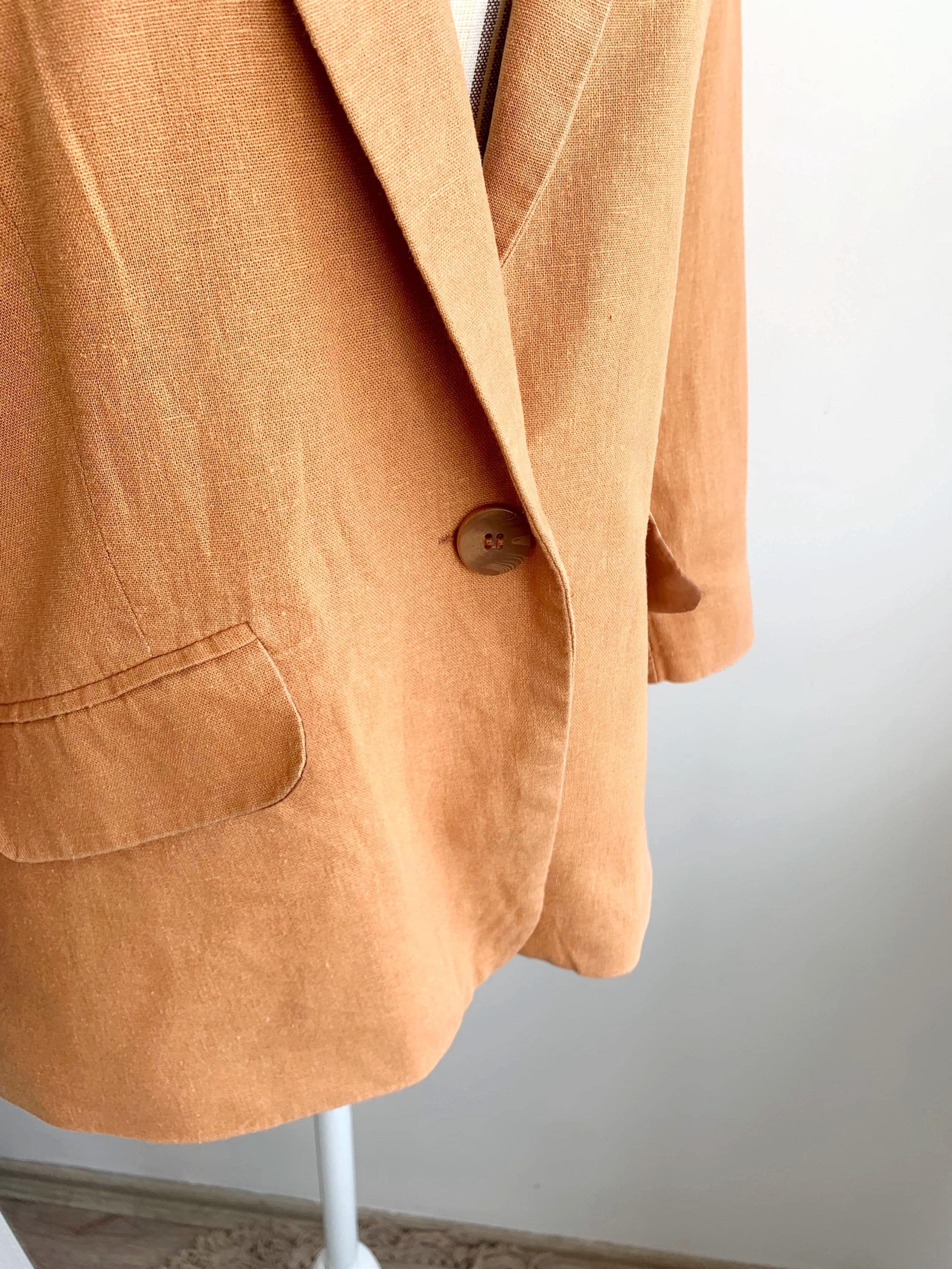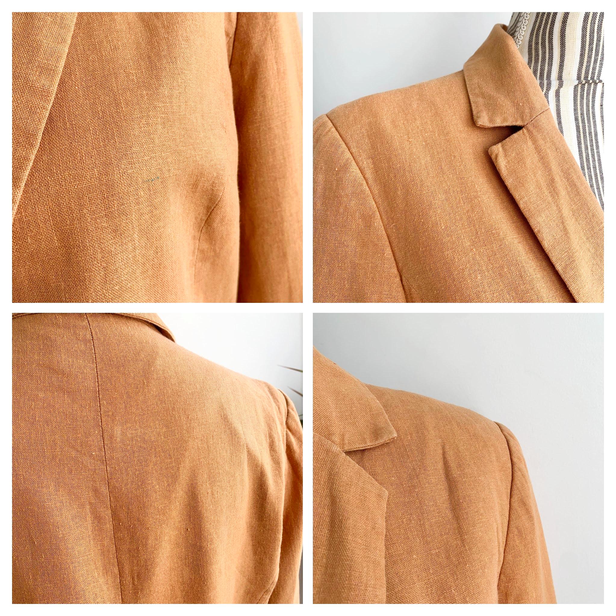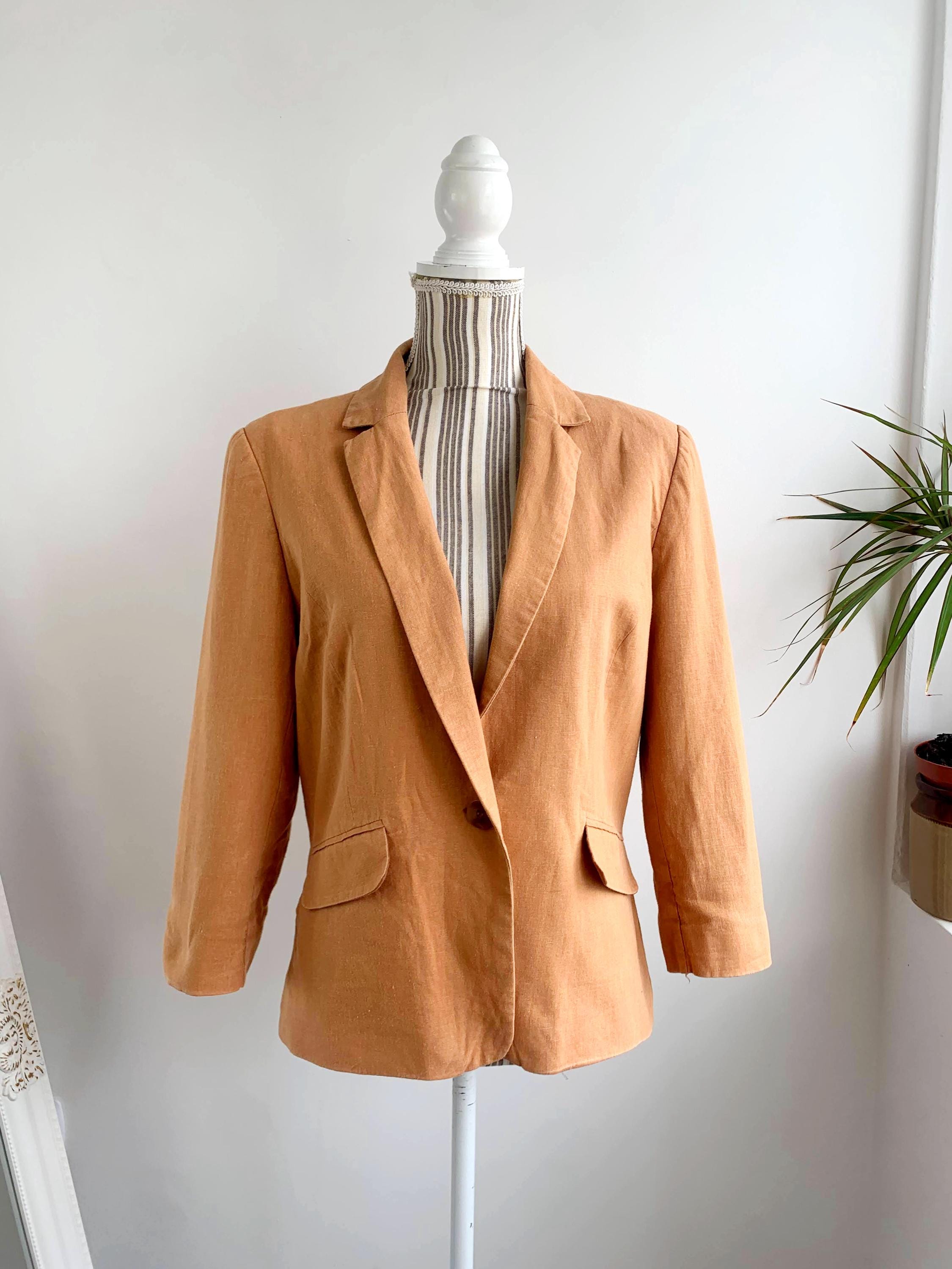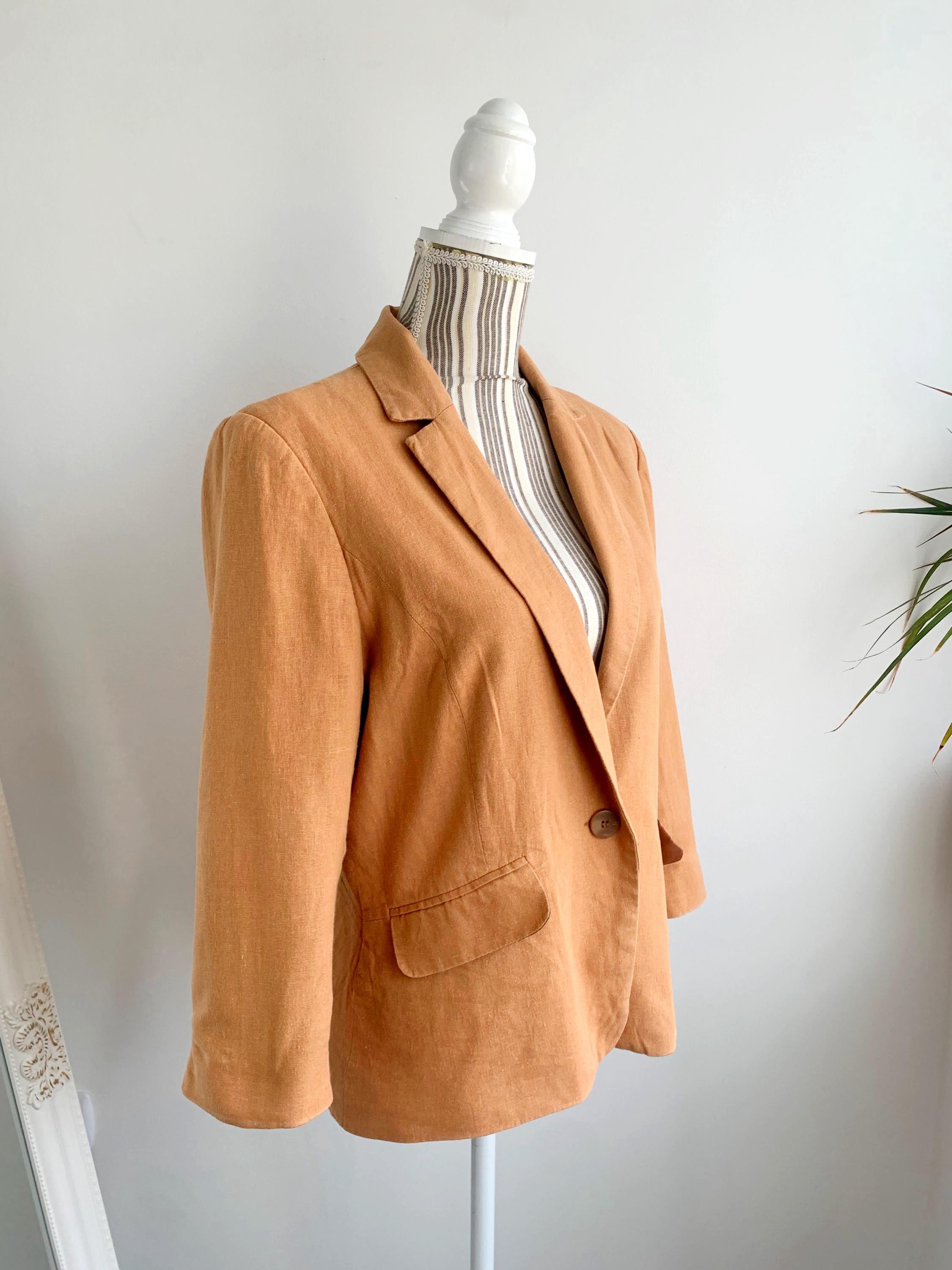 This is s beautiful vintage Y2K Dorothy Perkins pale orange linen blazer for women made of linen viscose blend fabric and cotton lining. This spring linen jacket is in soft orange color. This linen jacket has deep V neck, pockets and single button closure. This light casual linen coat has 3/4 ruched sleeves with buttons. The size marked is UK 16/ EUR 44, this linen blazer fits like size L. Please check the measurements below.