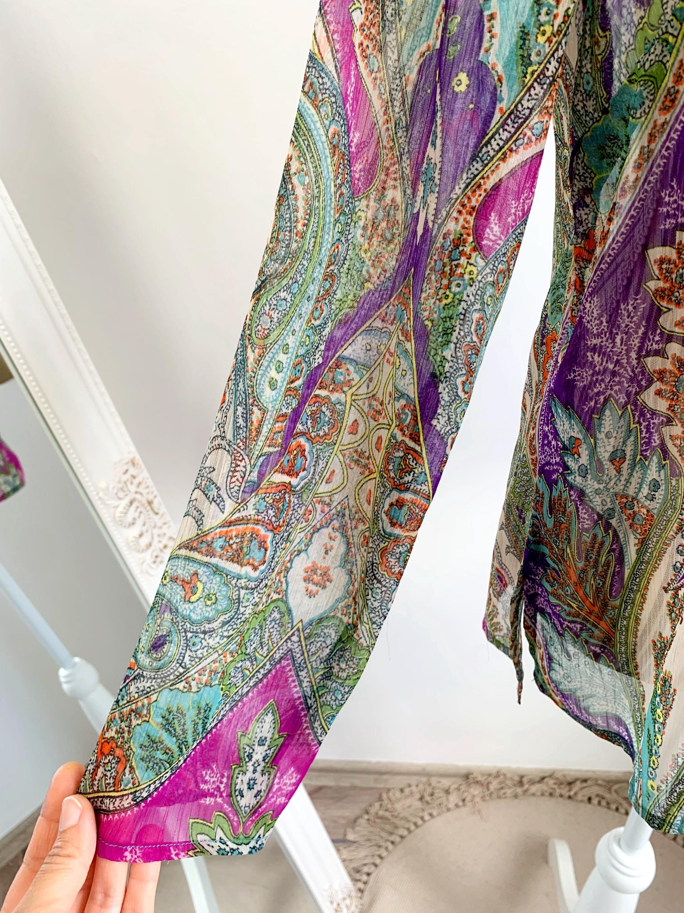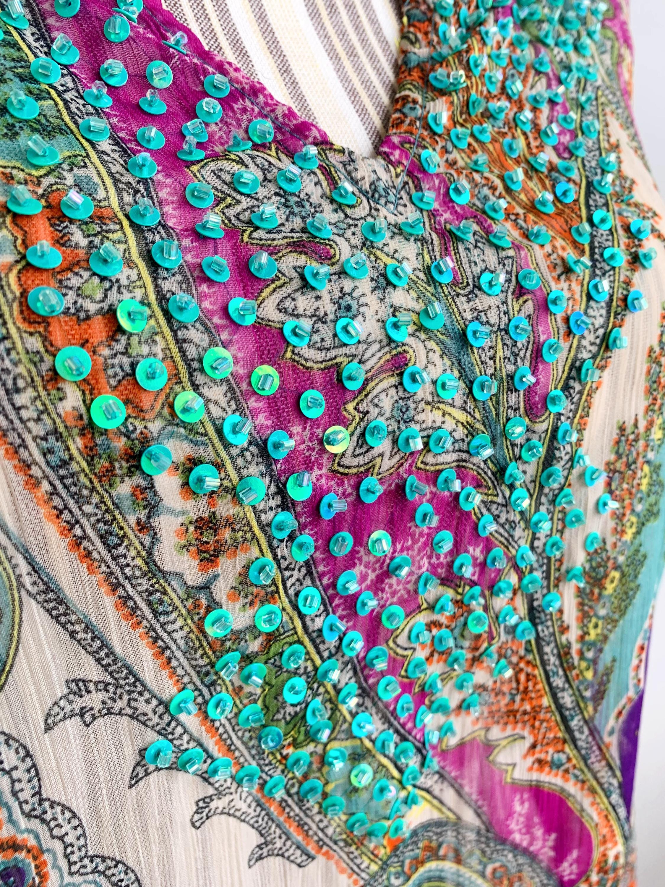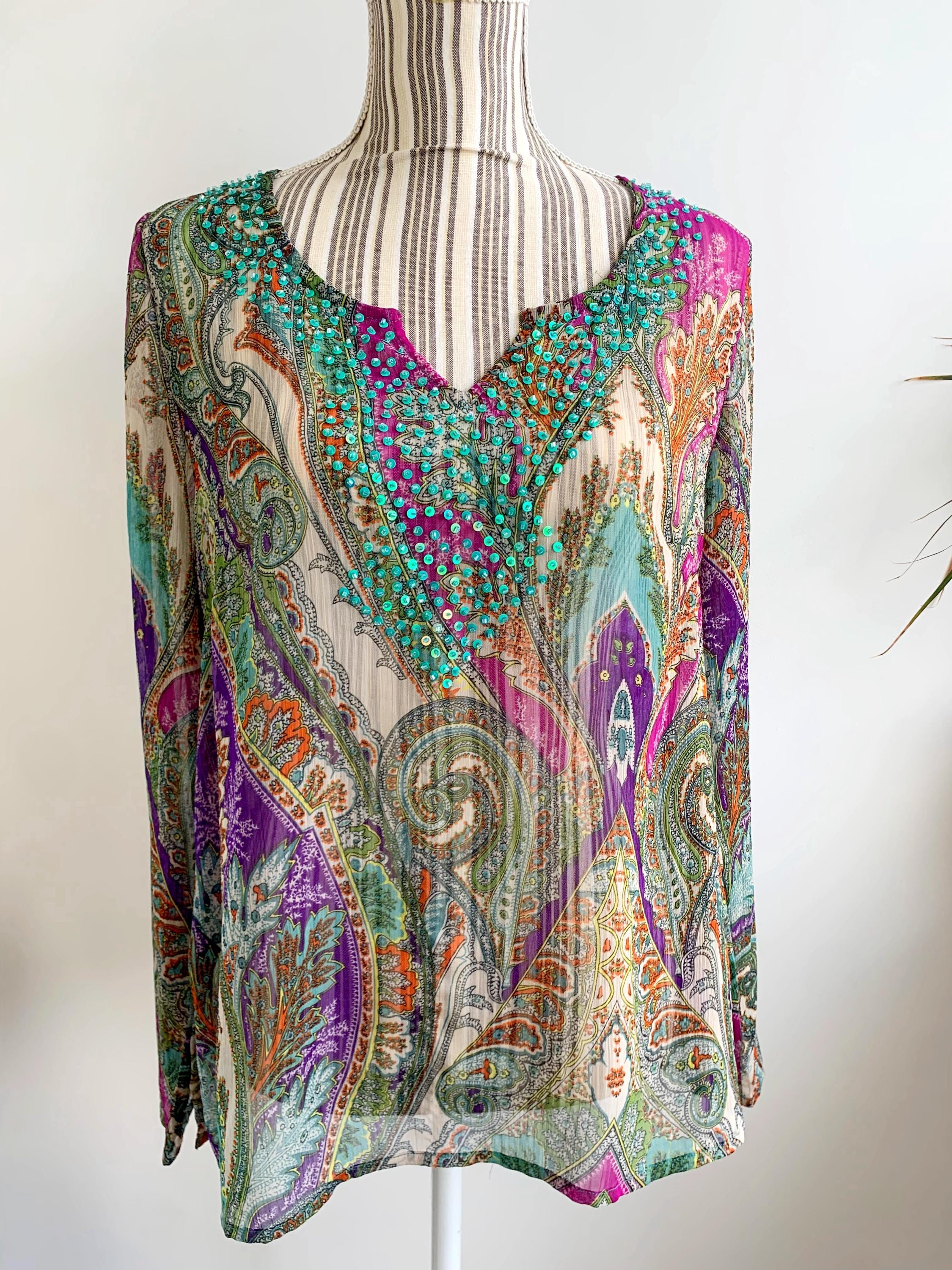 Lovely vintage sheer mesh overlay top with along sleeves and relaxed silhouette, made of see through lightweight polyester fabric with sequin beaded detailing at the decollate. This adorable transparent shirt can be worn as a beach cover up or as a vacation tunic top. The size marked is S