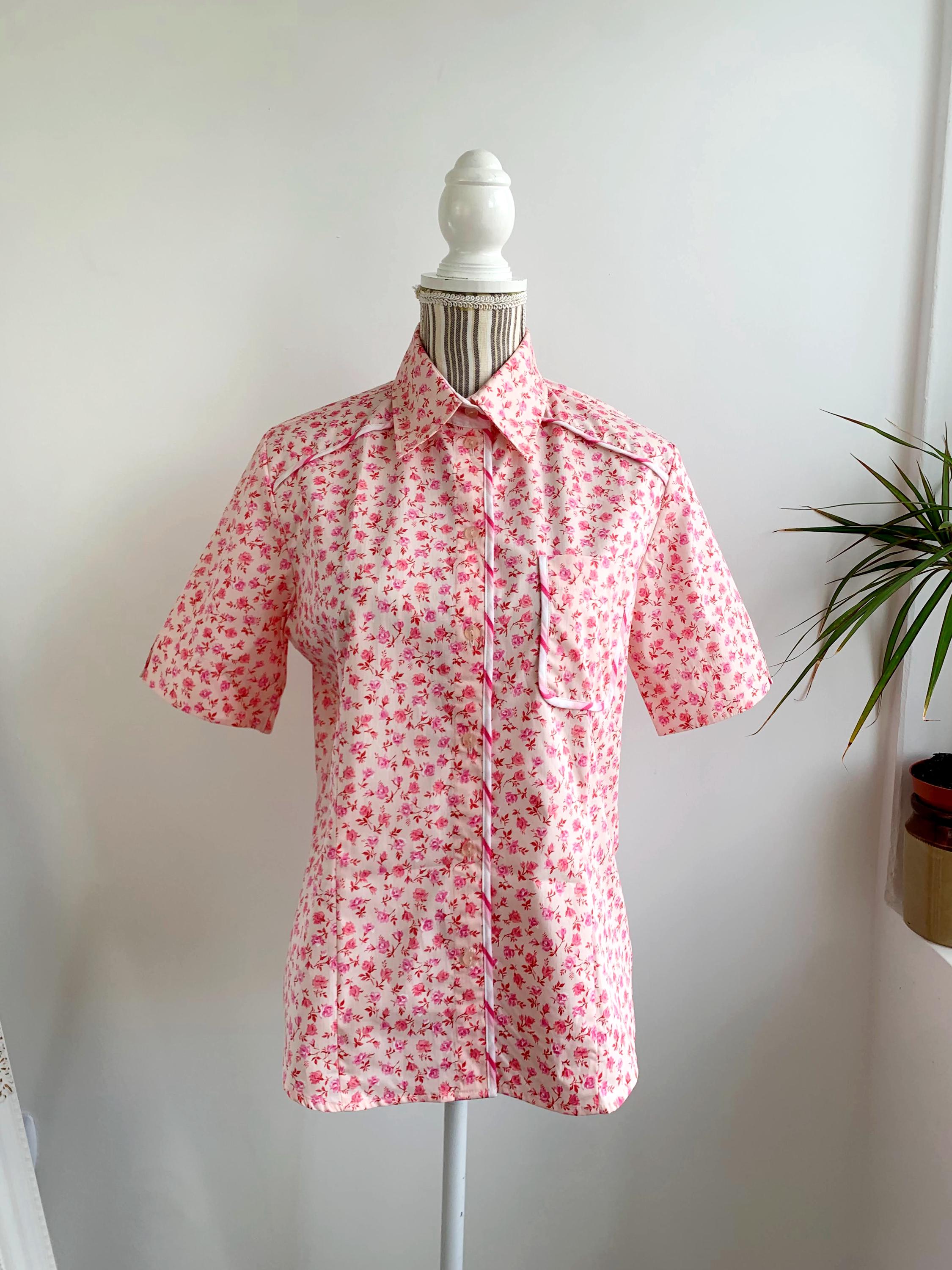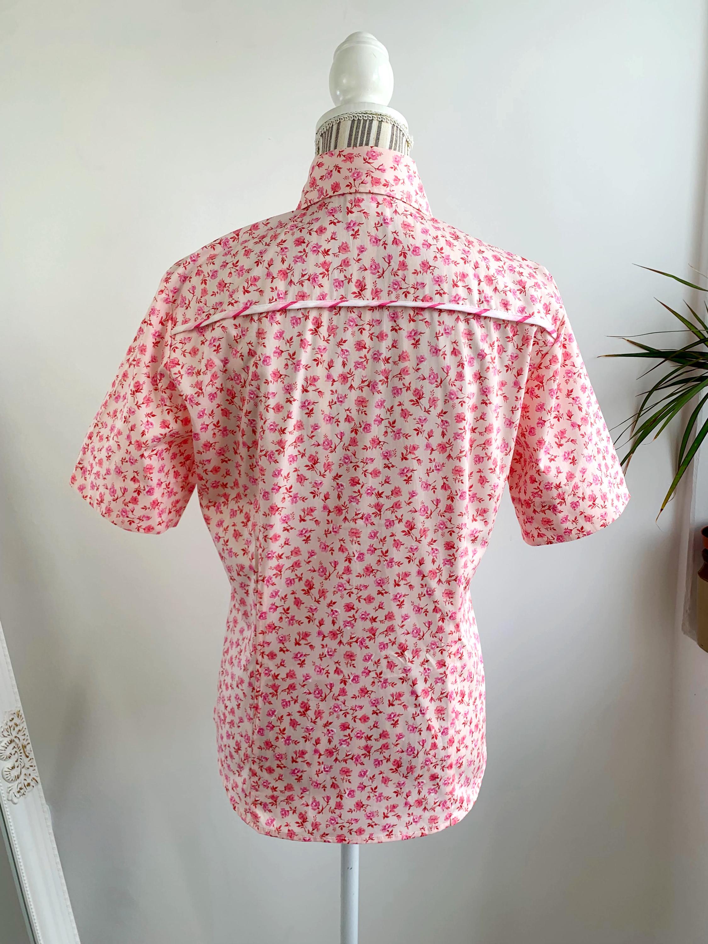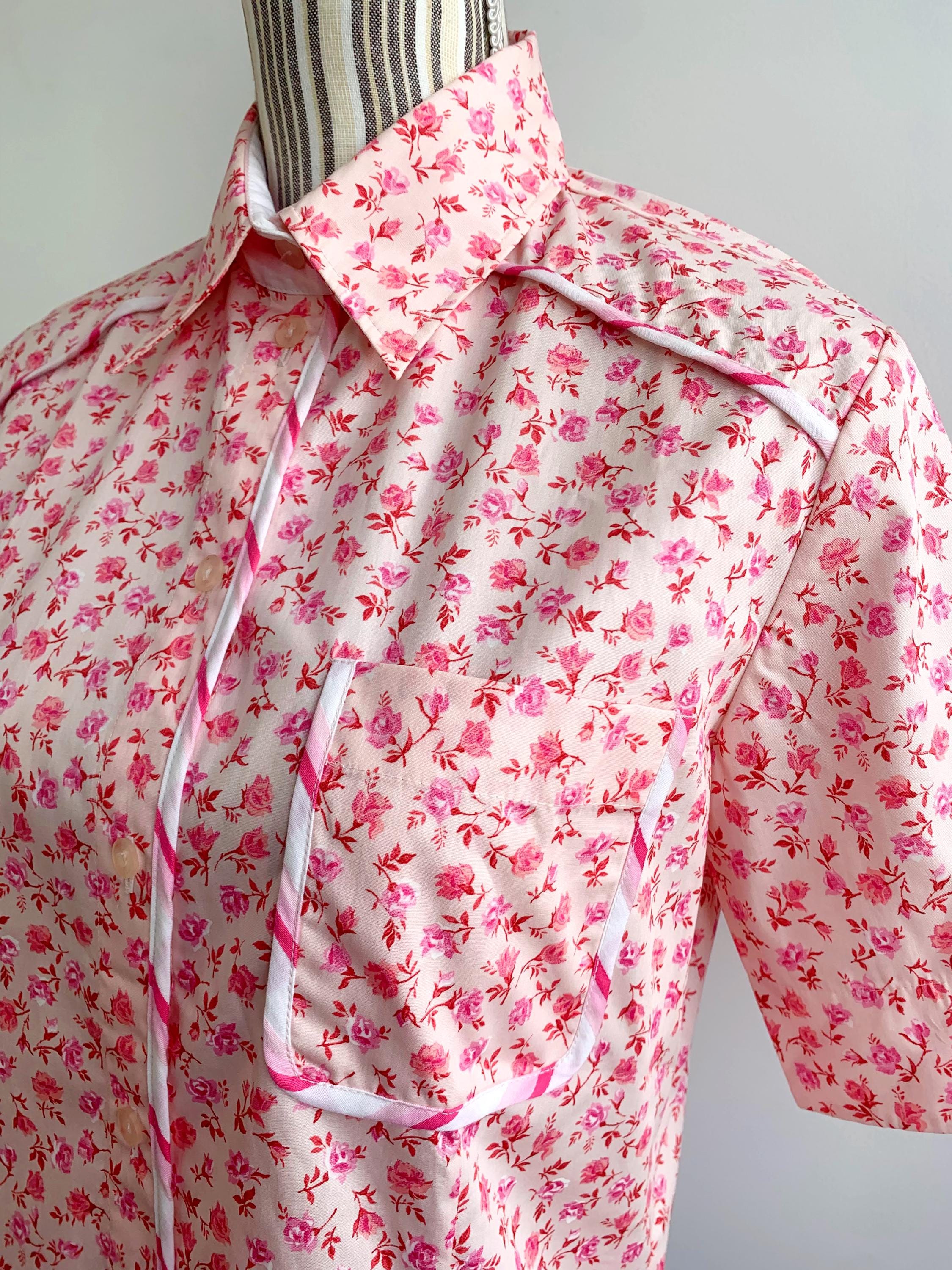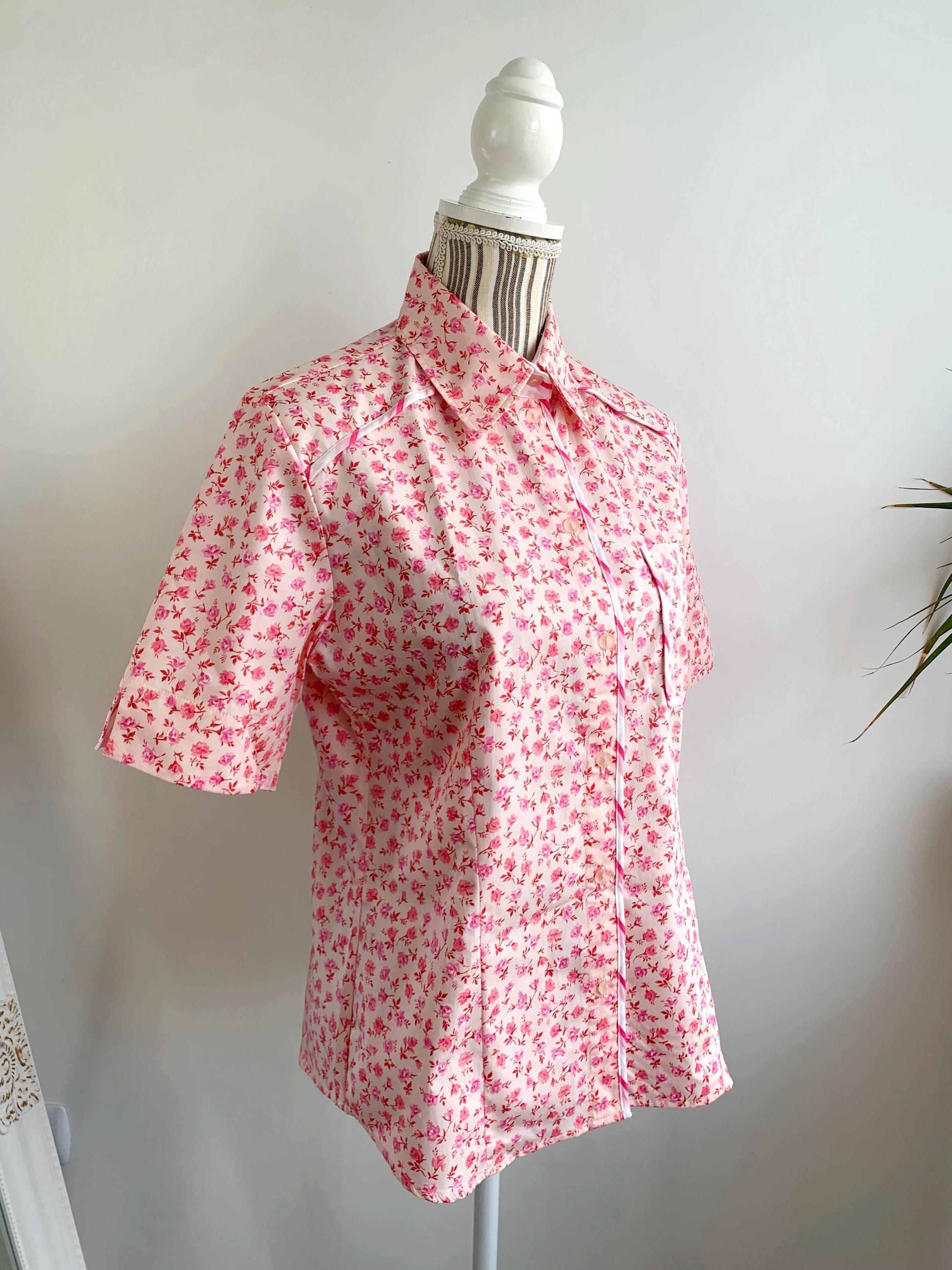 This is a vintage 90s short sleeve ditsy floral pink cotton shirt for women with button front closure and collar size M. This pure cotton floral shirt is made of 100% cotton fabric in pink. This summer cotton shirt has a casual minimalist design and vibrant 90s print. This cotton tartan shirt is size 38, which fits like size M, please check the measurements below.