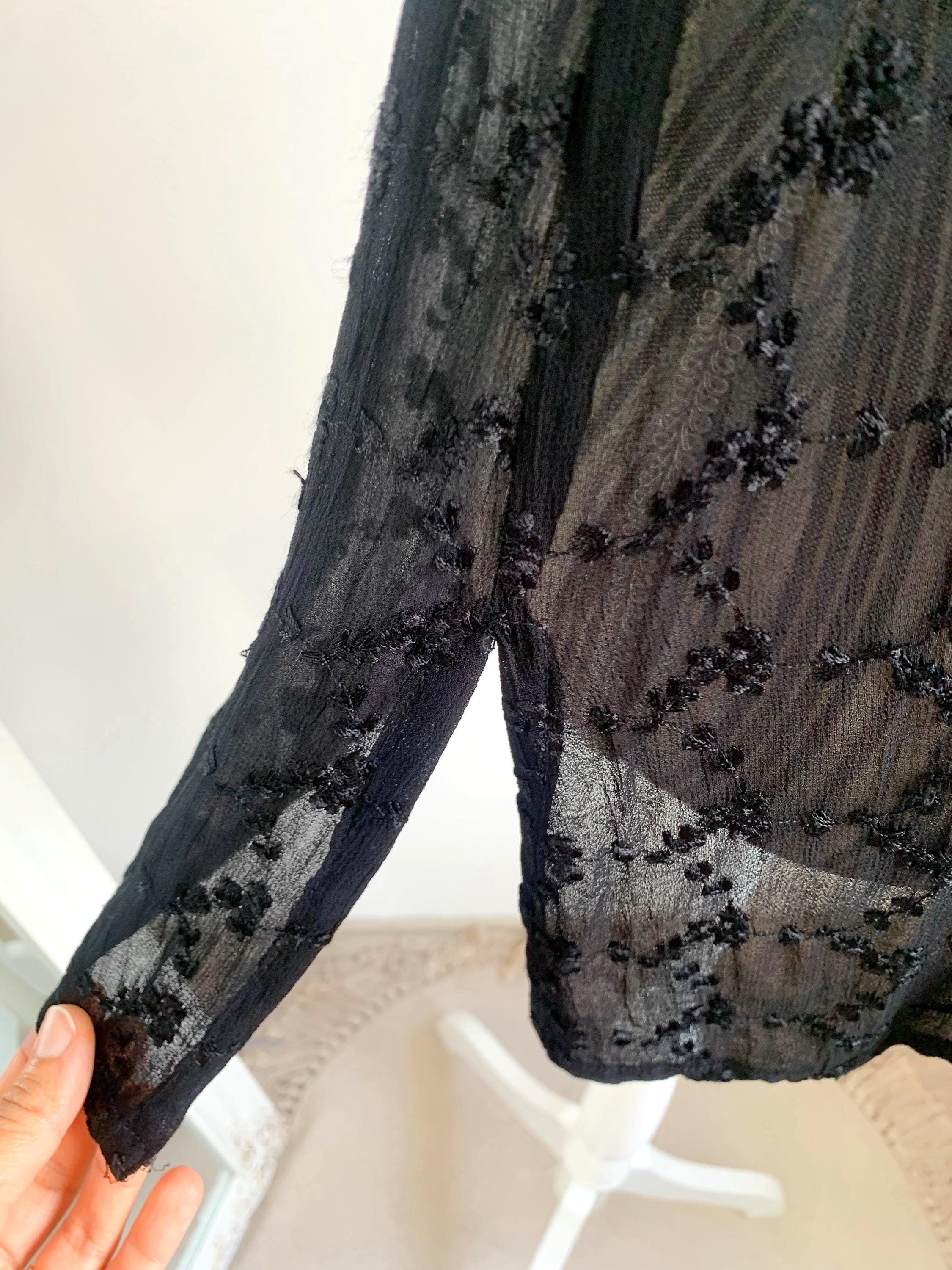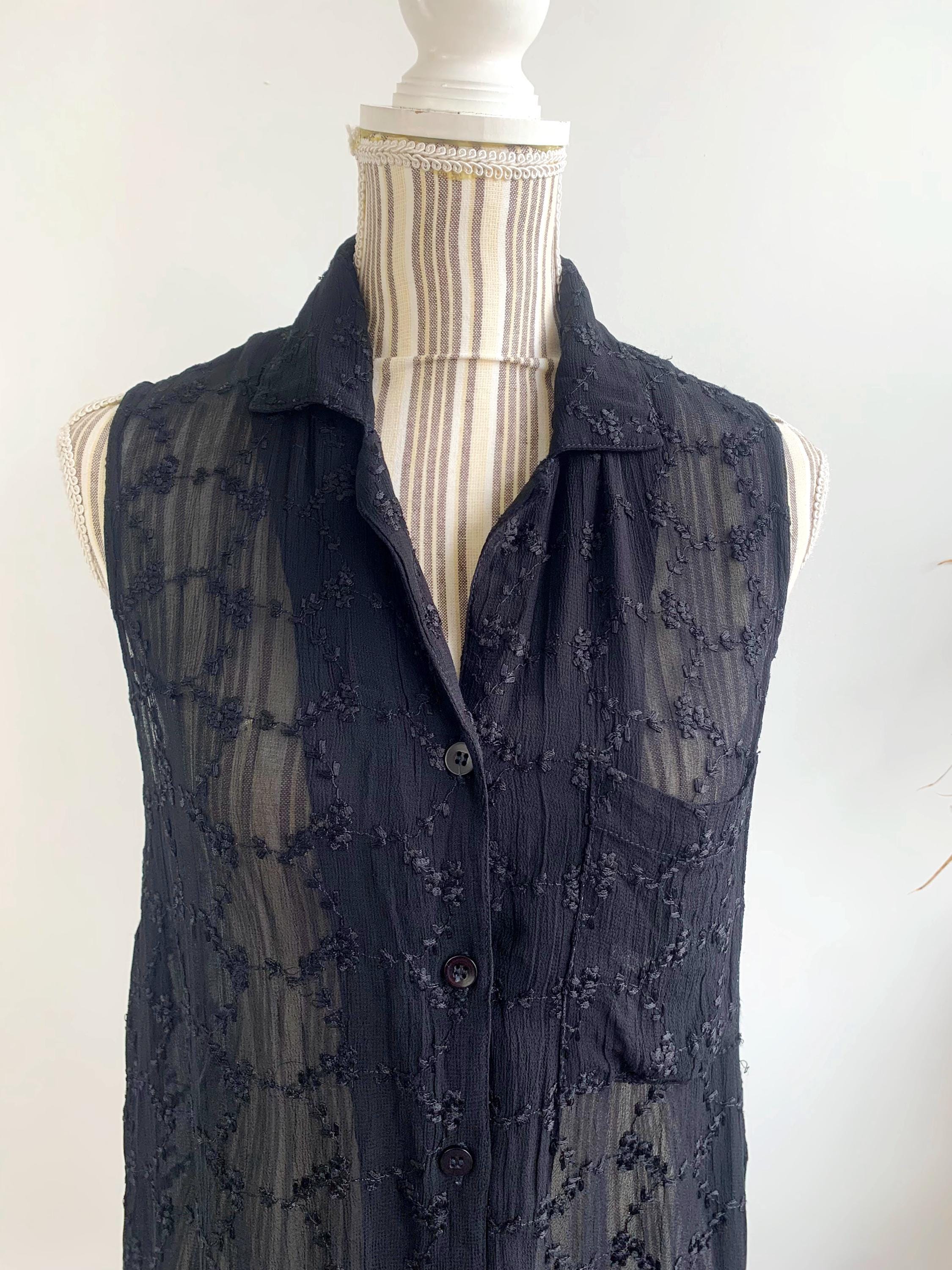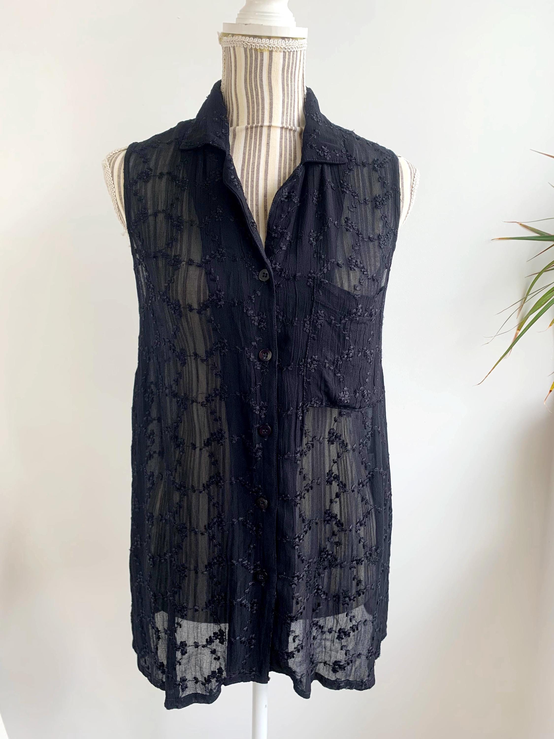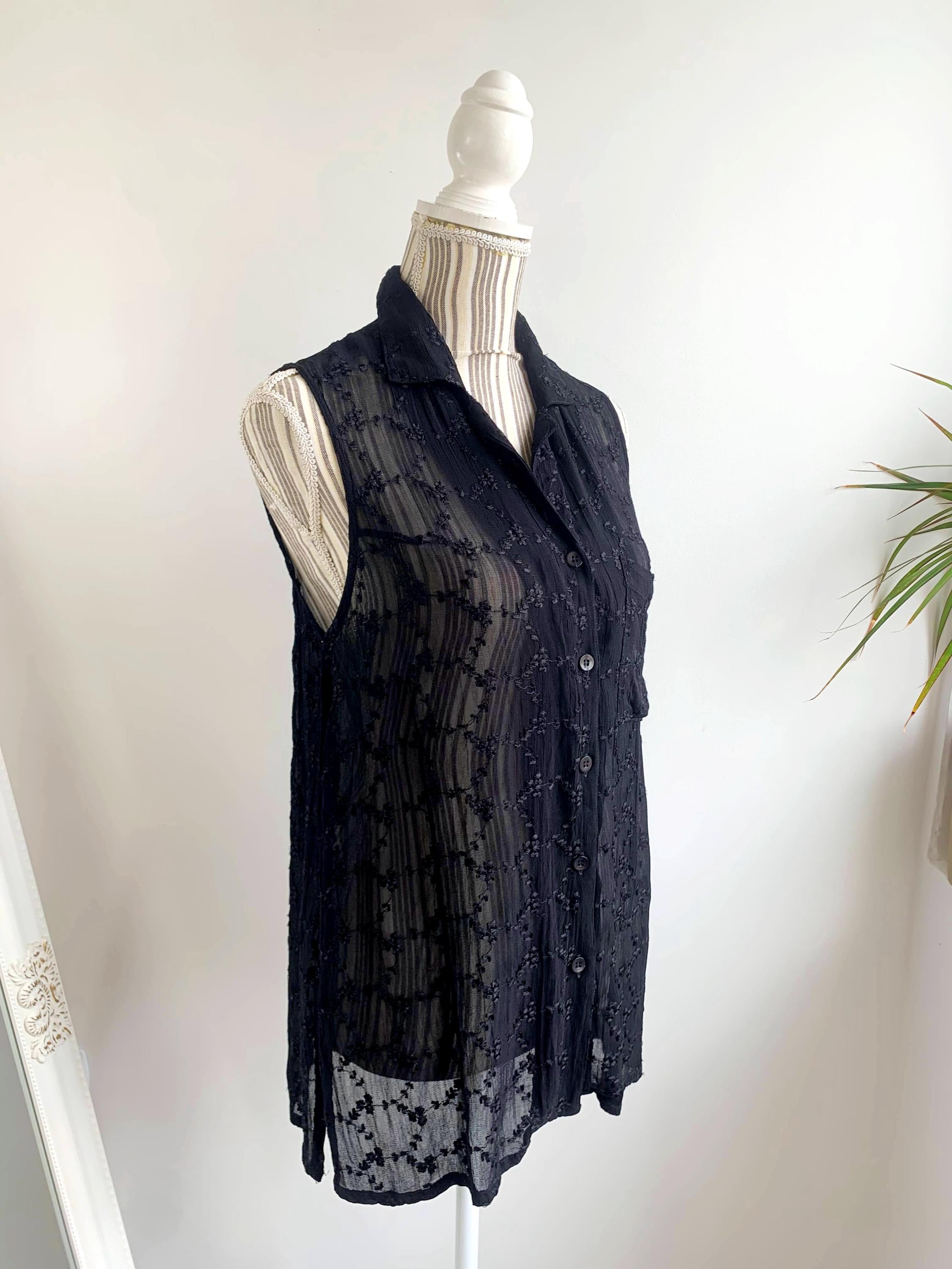 This is a vintage 90s black lace v neck collared sleeveless button up top made of black lace see through fabric made of 100% viscose. This black embroidery shirt has a longline relaxed silhouette with side slits. This sheer mesh button front top is size S. Please check the measurements below.