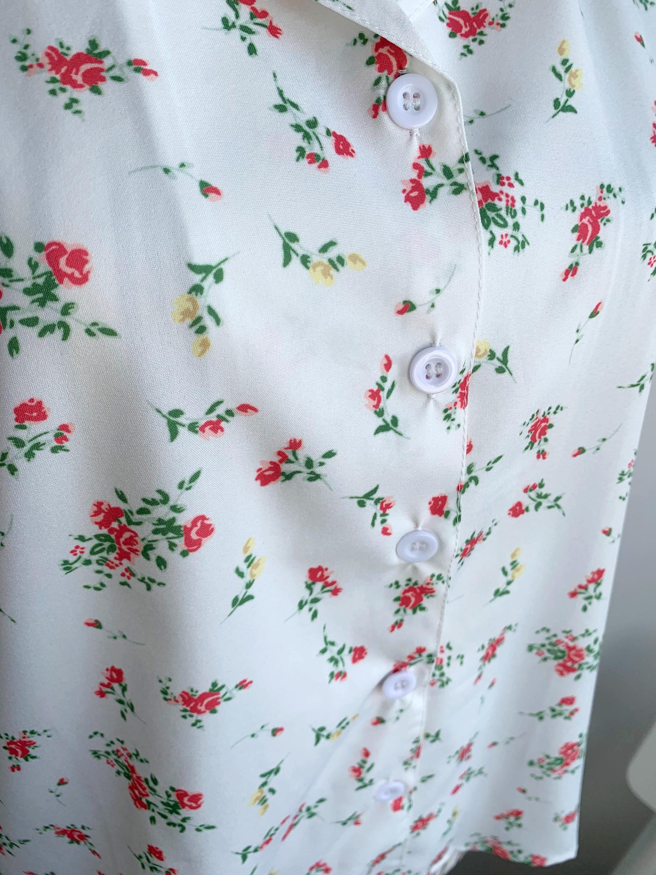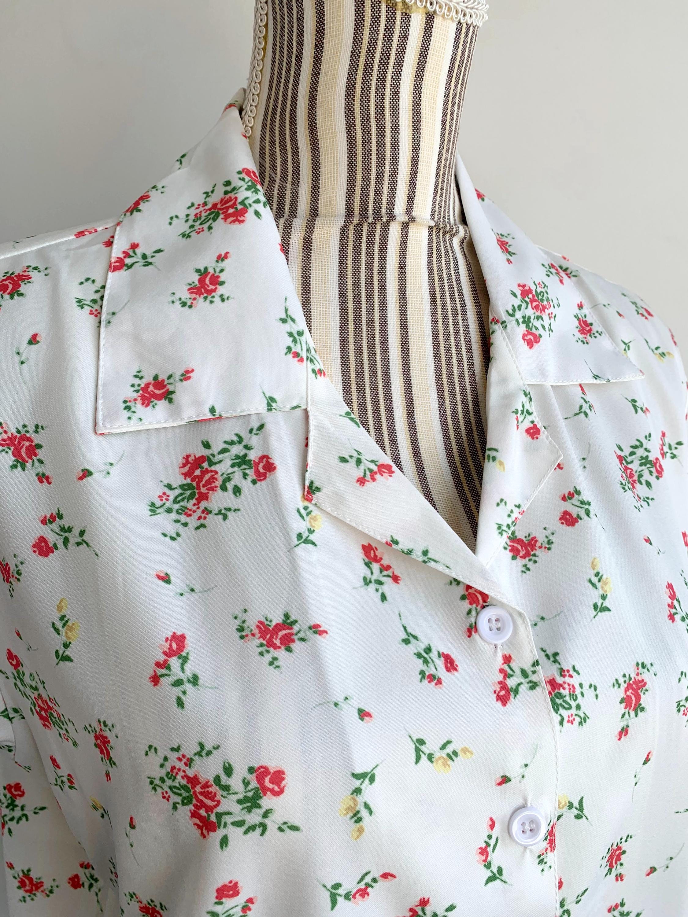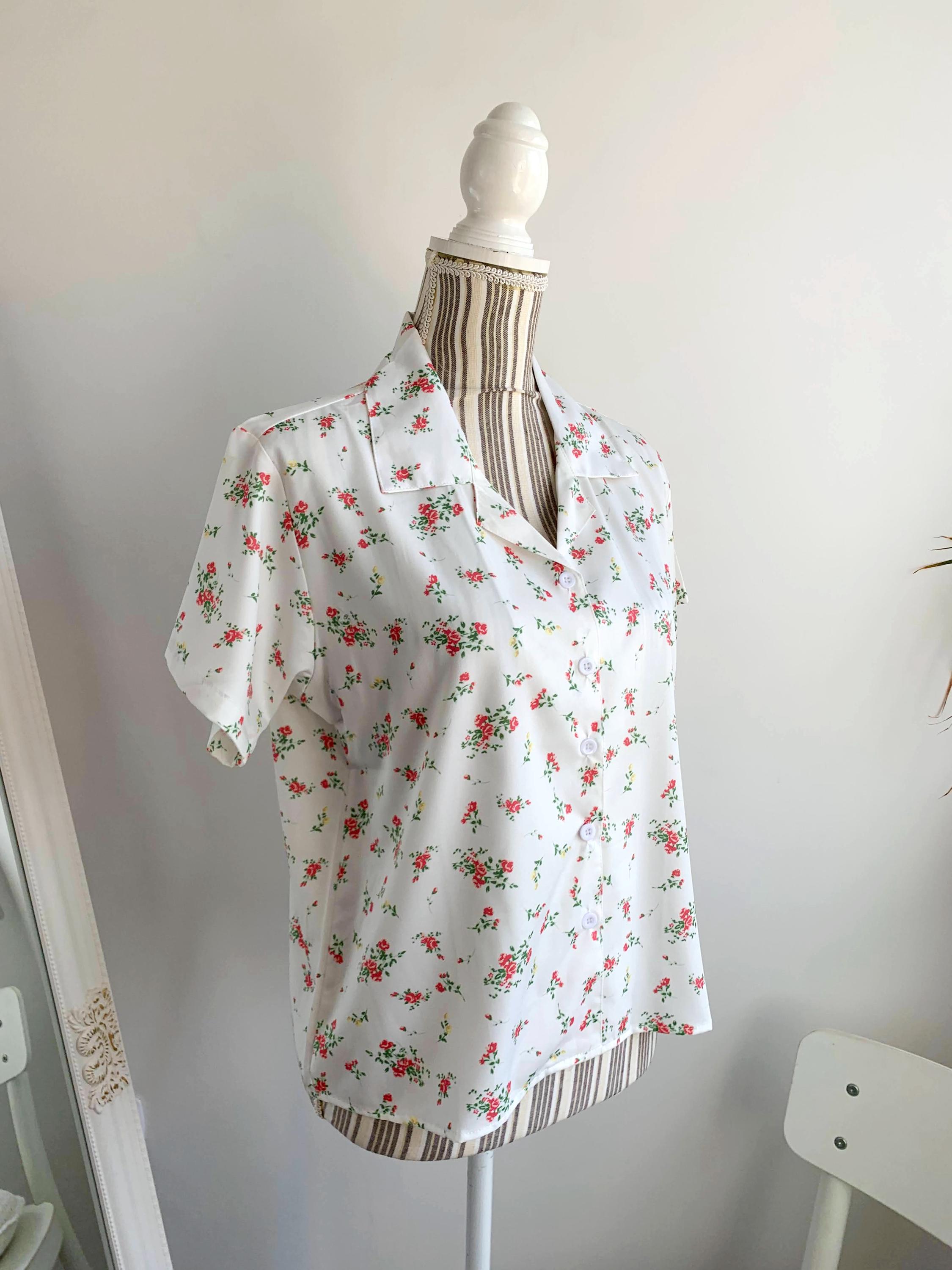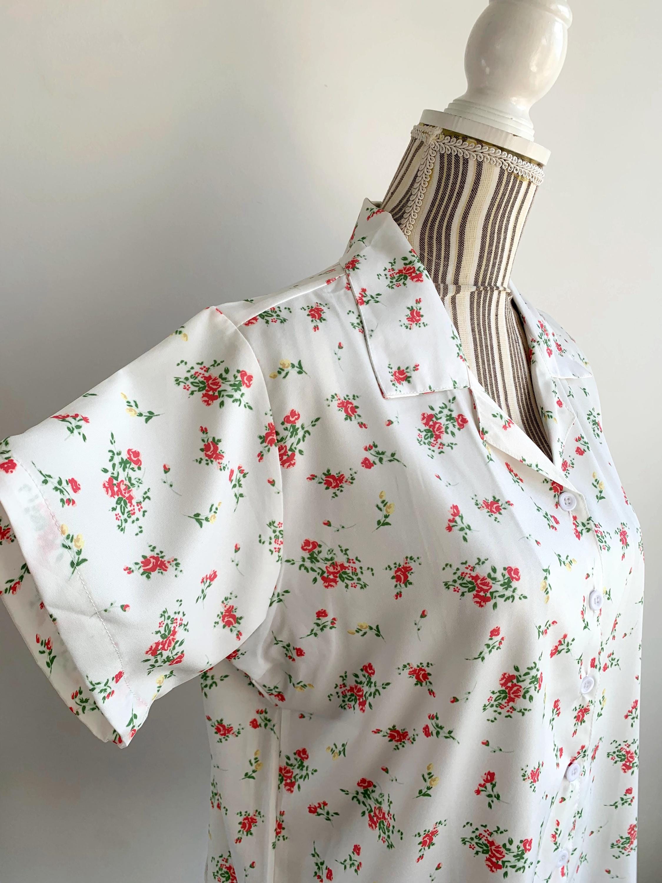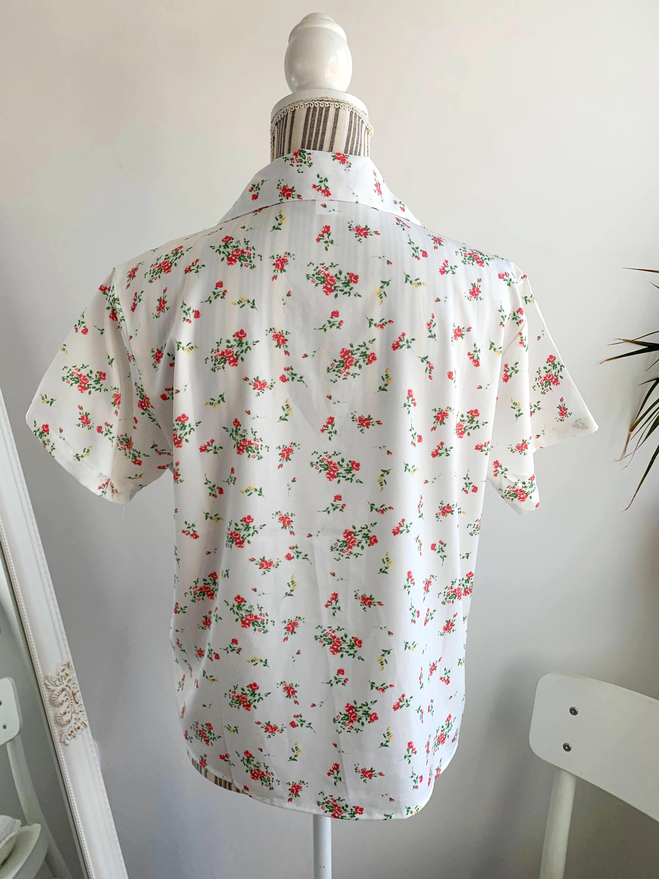 This is a vintage 90s white ditsy floral collared button up shirt for women with cute cuttaway collar and short sleeves. This spring summer boho floral button up top is size S, fits oversized. The fabric feels like polyester. Amazing vintage fashion gift for your wife or girlfriend.