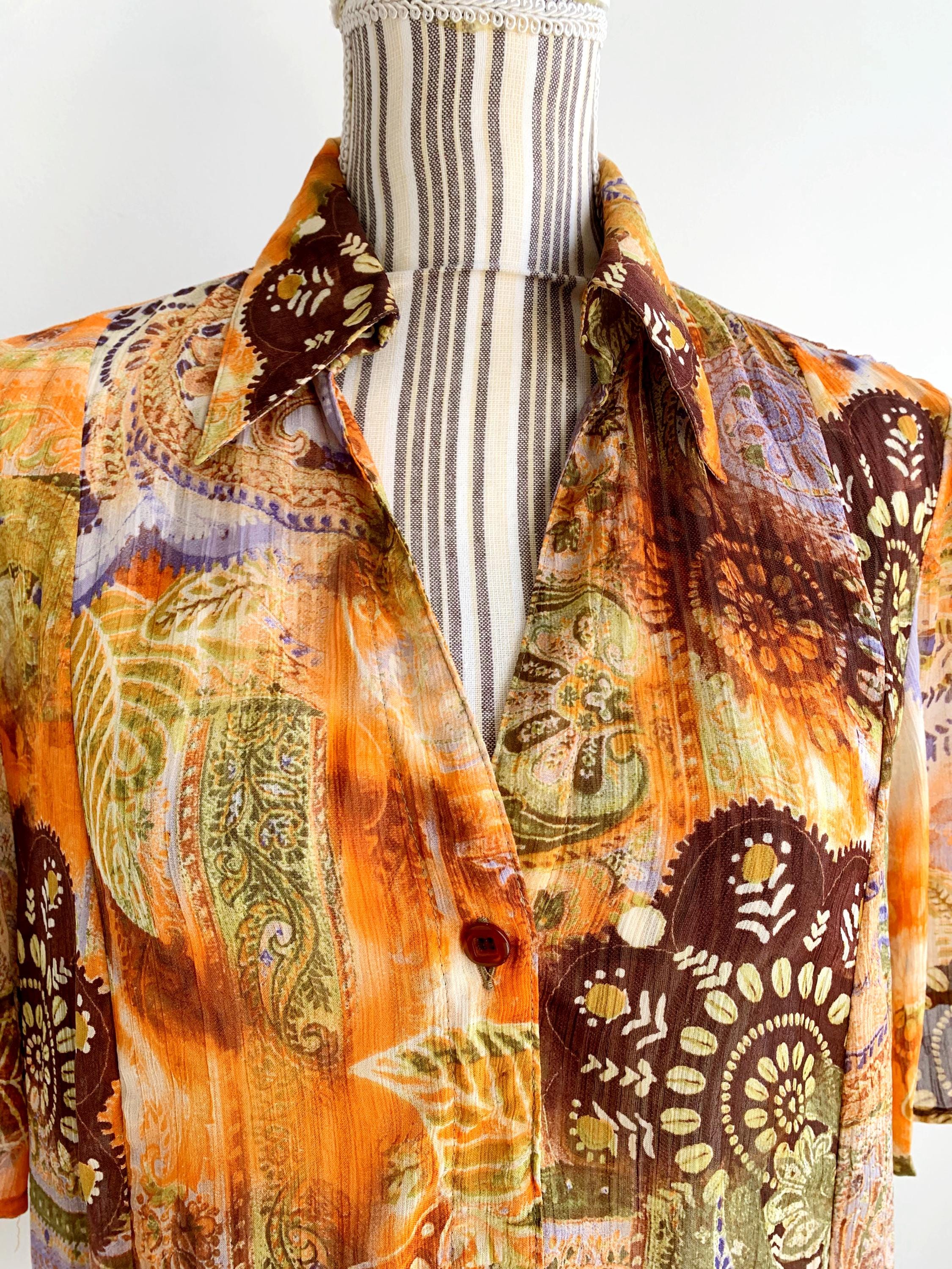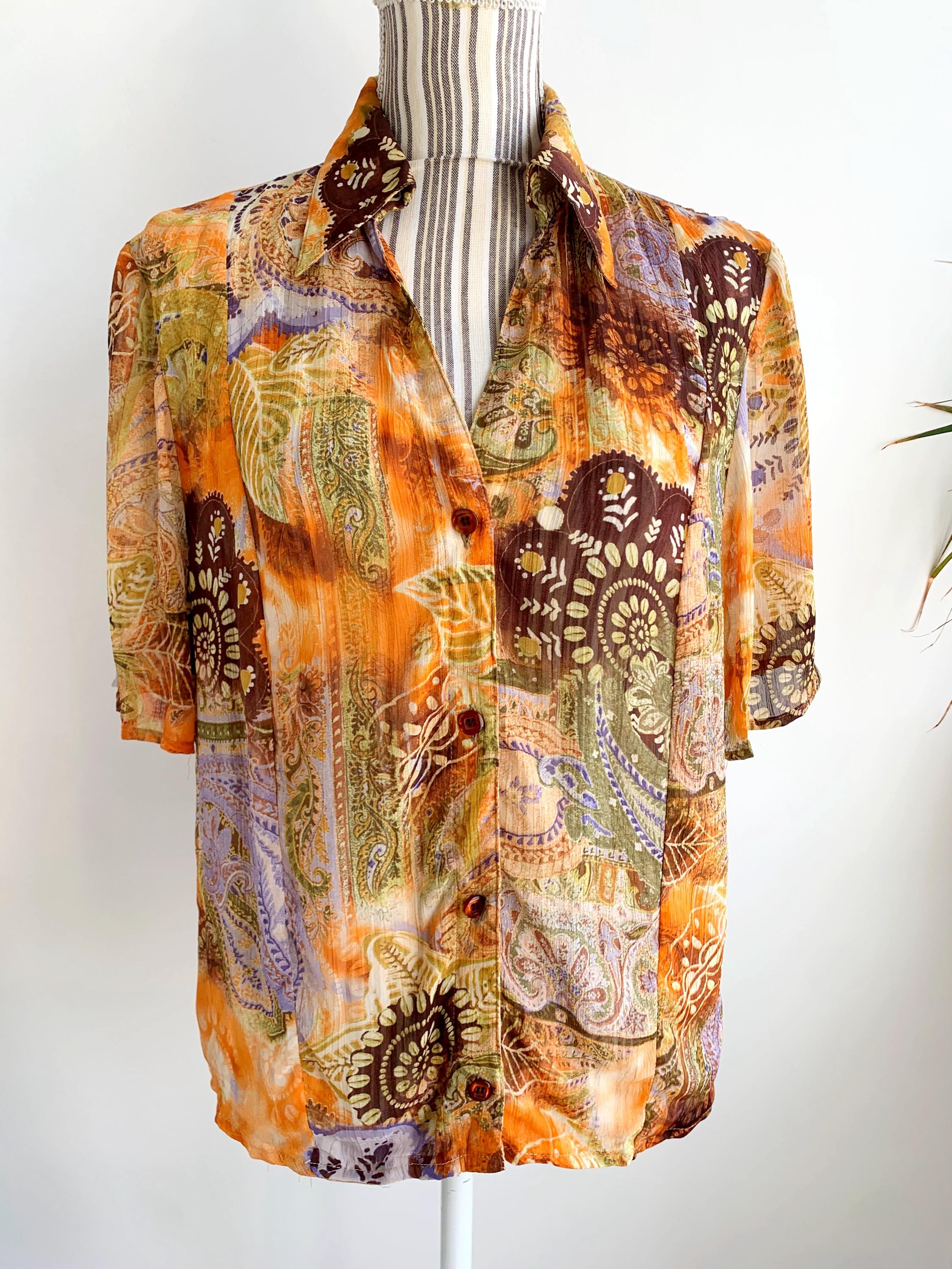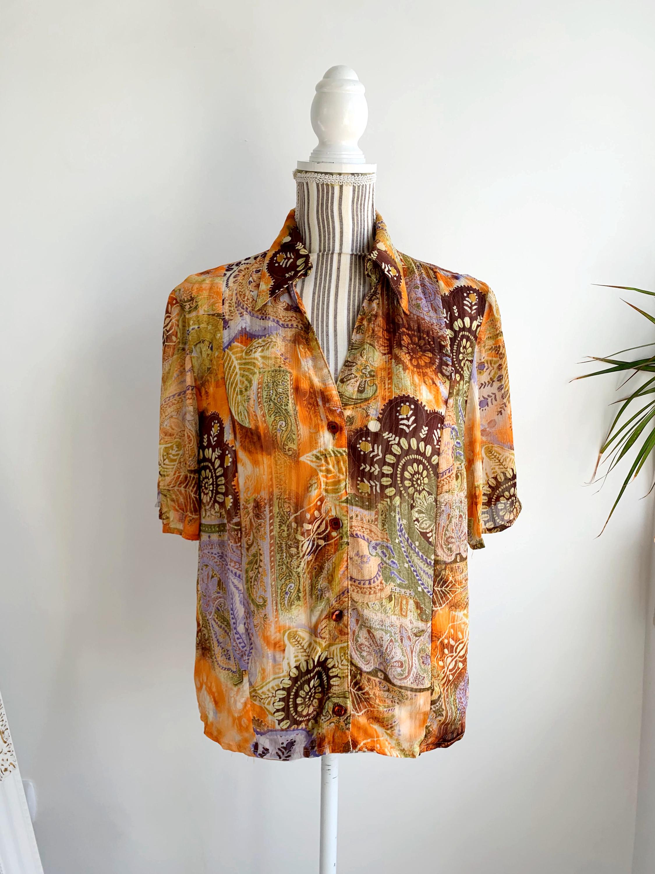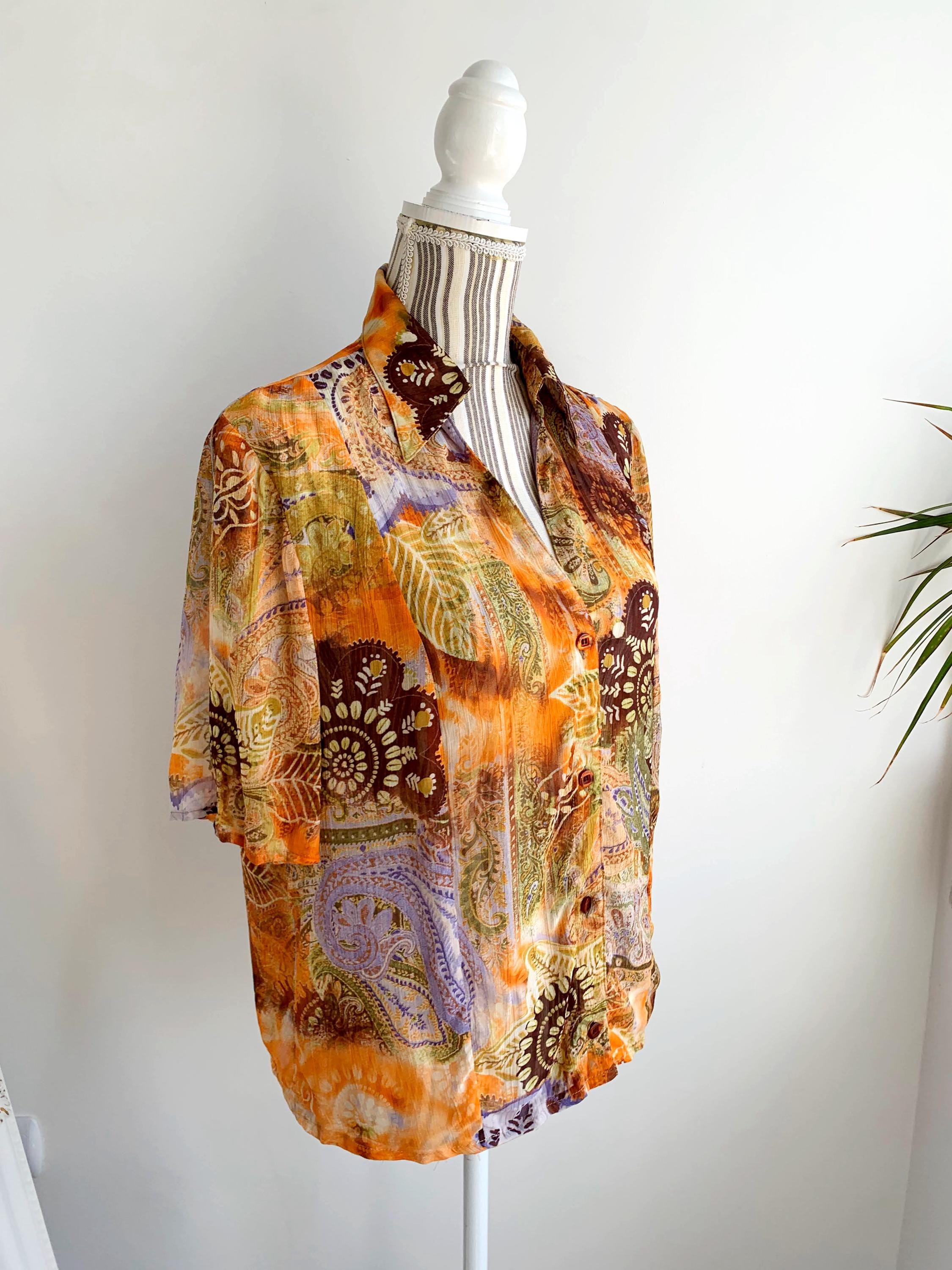 Lovely vintage 90s abstract floral paisley print sheer button down shirt for women in shades of orange, brown and khaki green with button front closure and collar. This short sleeve transparent shirt has short sleeves and relaxed fit silhouette. This see through collared blouse is made of delicate lightweight polyester fabric with abstact floral paisley print. Perfect gift for your 90s fashion lover girlfriend.