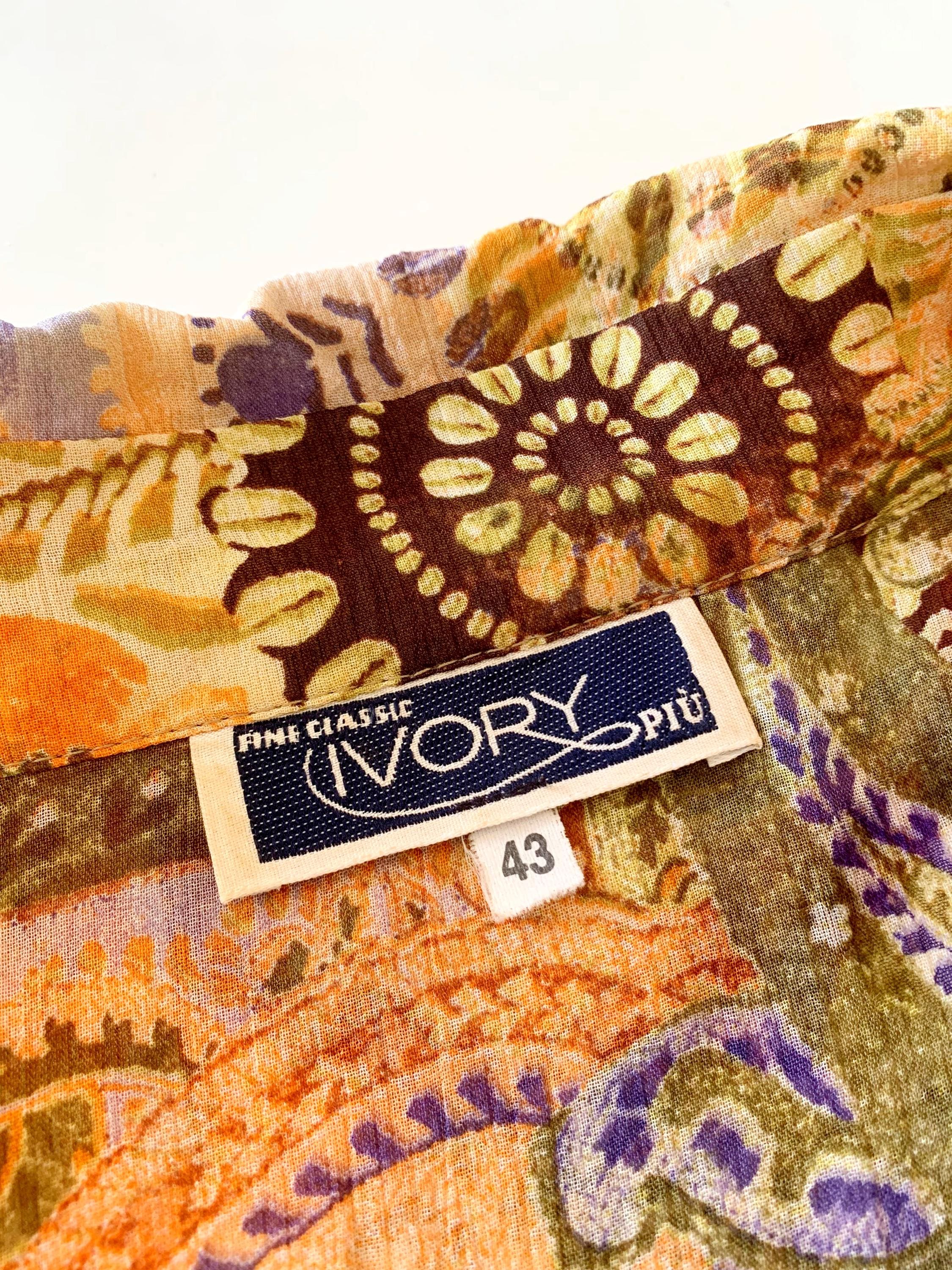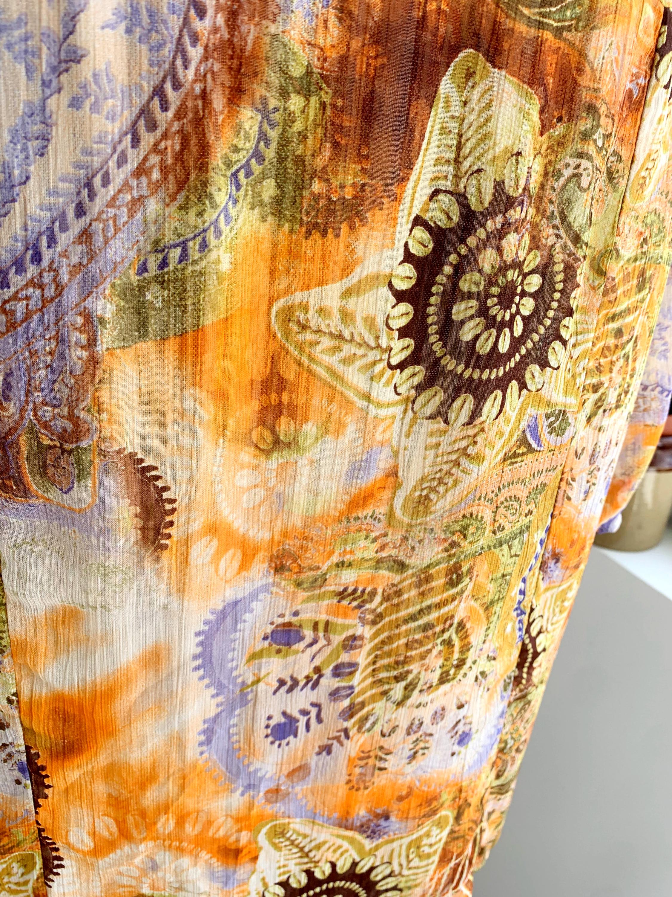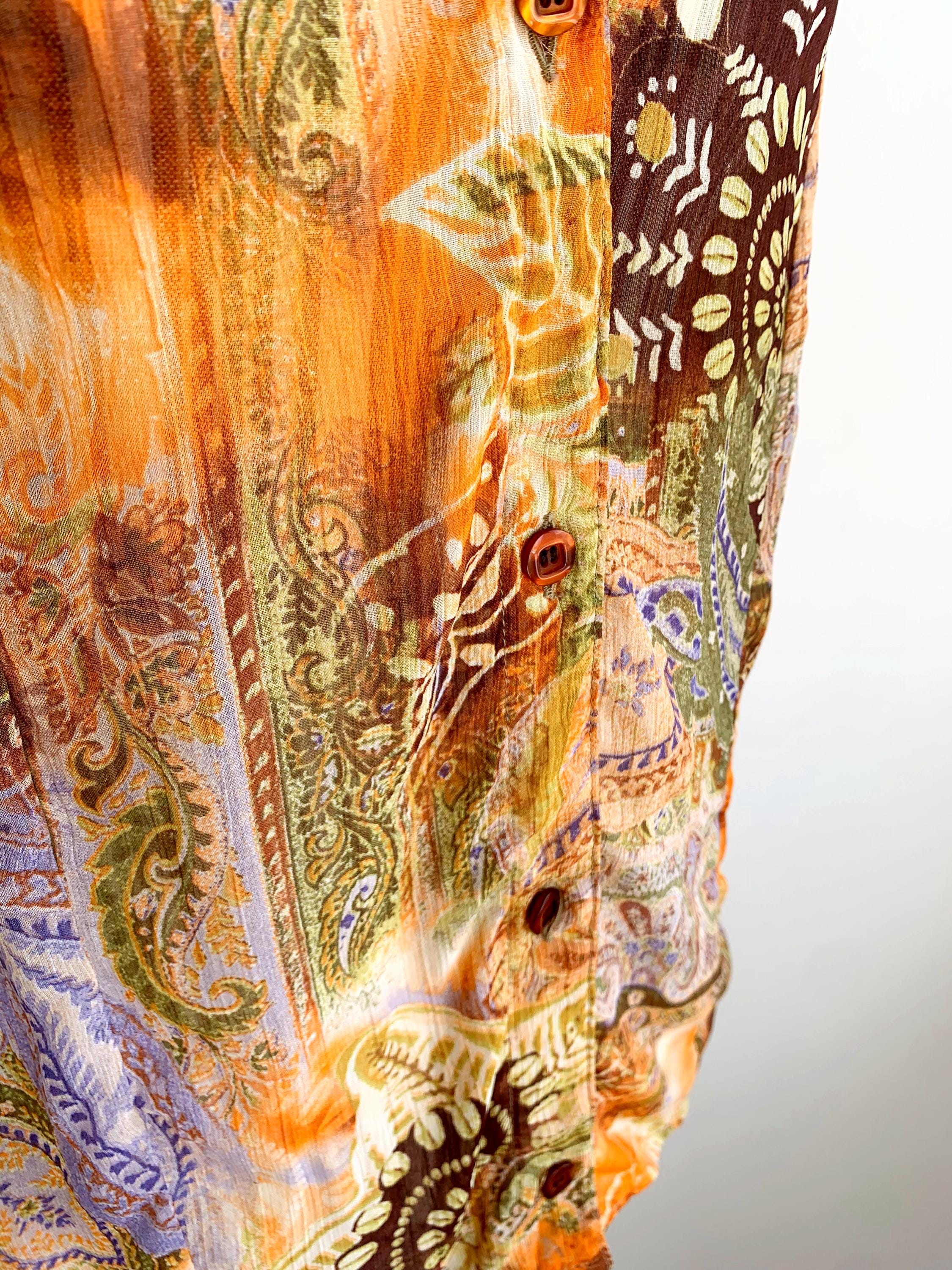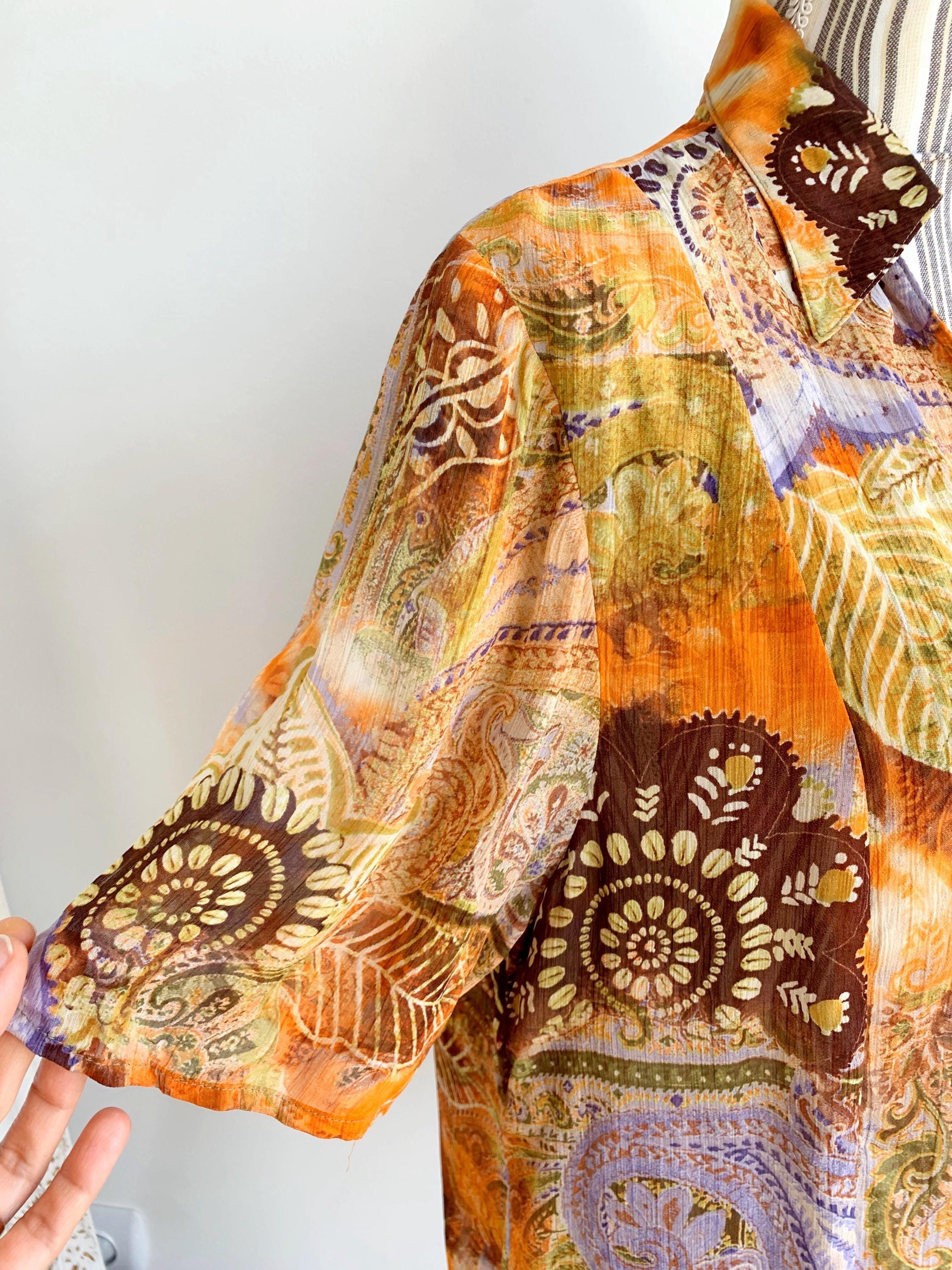 Lovely vintage 90s abstract floral paisley print sheer button down shirt for women in shades of orange, brown and khaki green with button front closure and collar. This short sleeve transparent shirt has short sleeves and relaxed fit silhouette. This see through collared blouse is made of delicate lightweight polyester fabric with abstact floral paisley print. Perfect gift for your 90s fashion lover girlfriend.