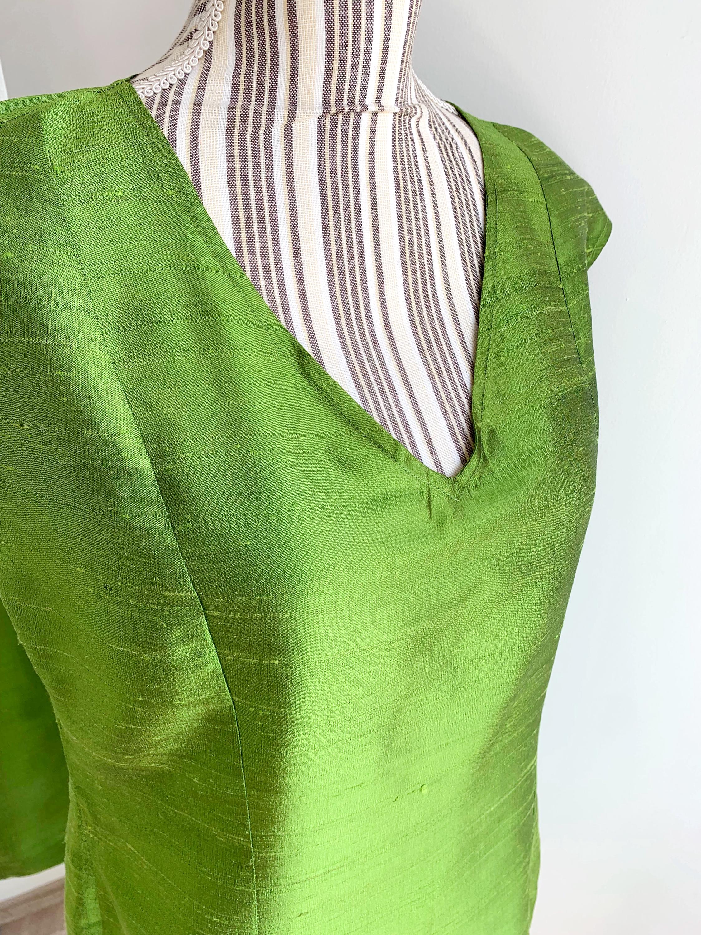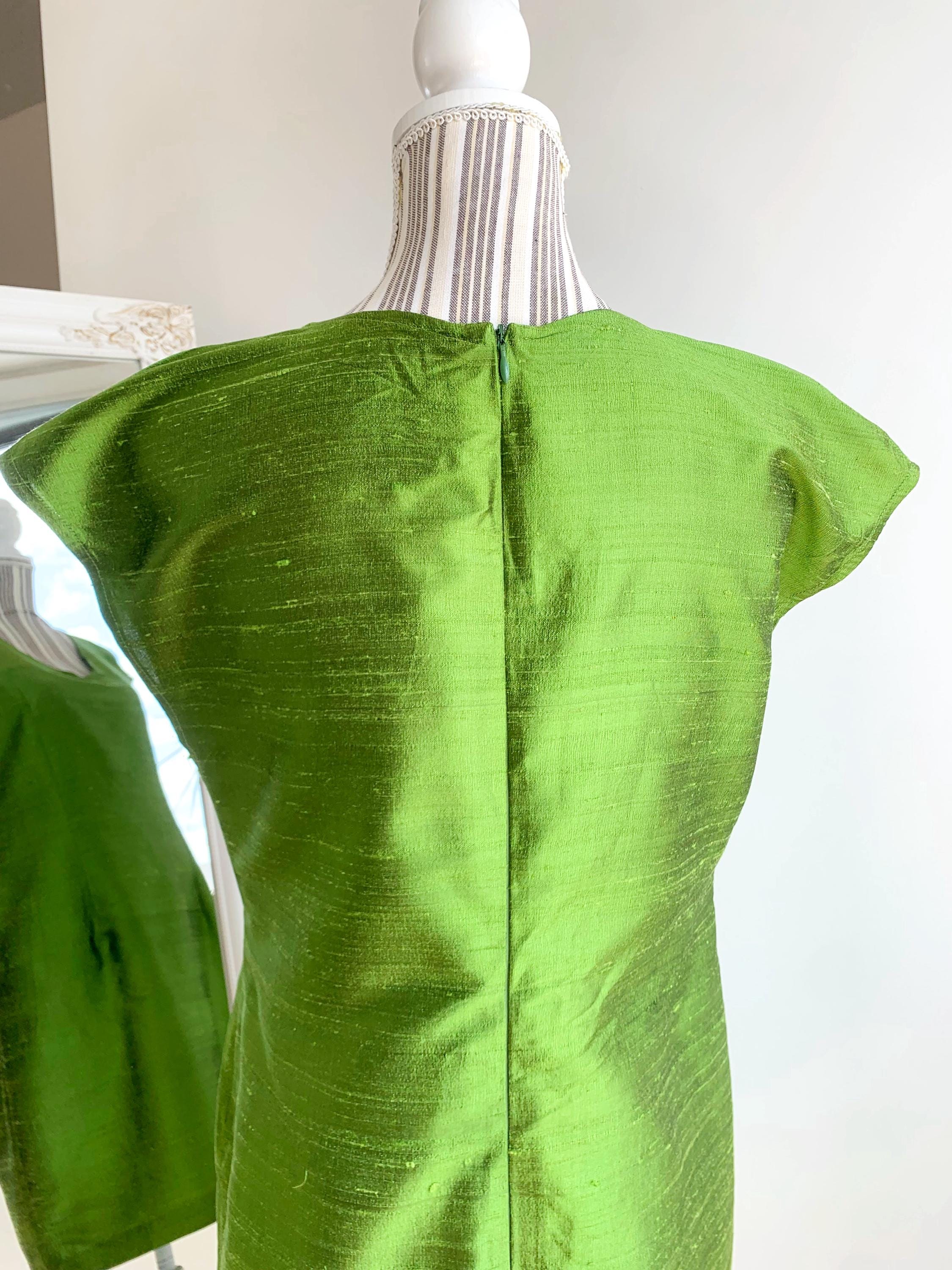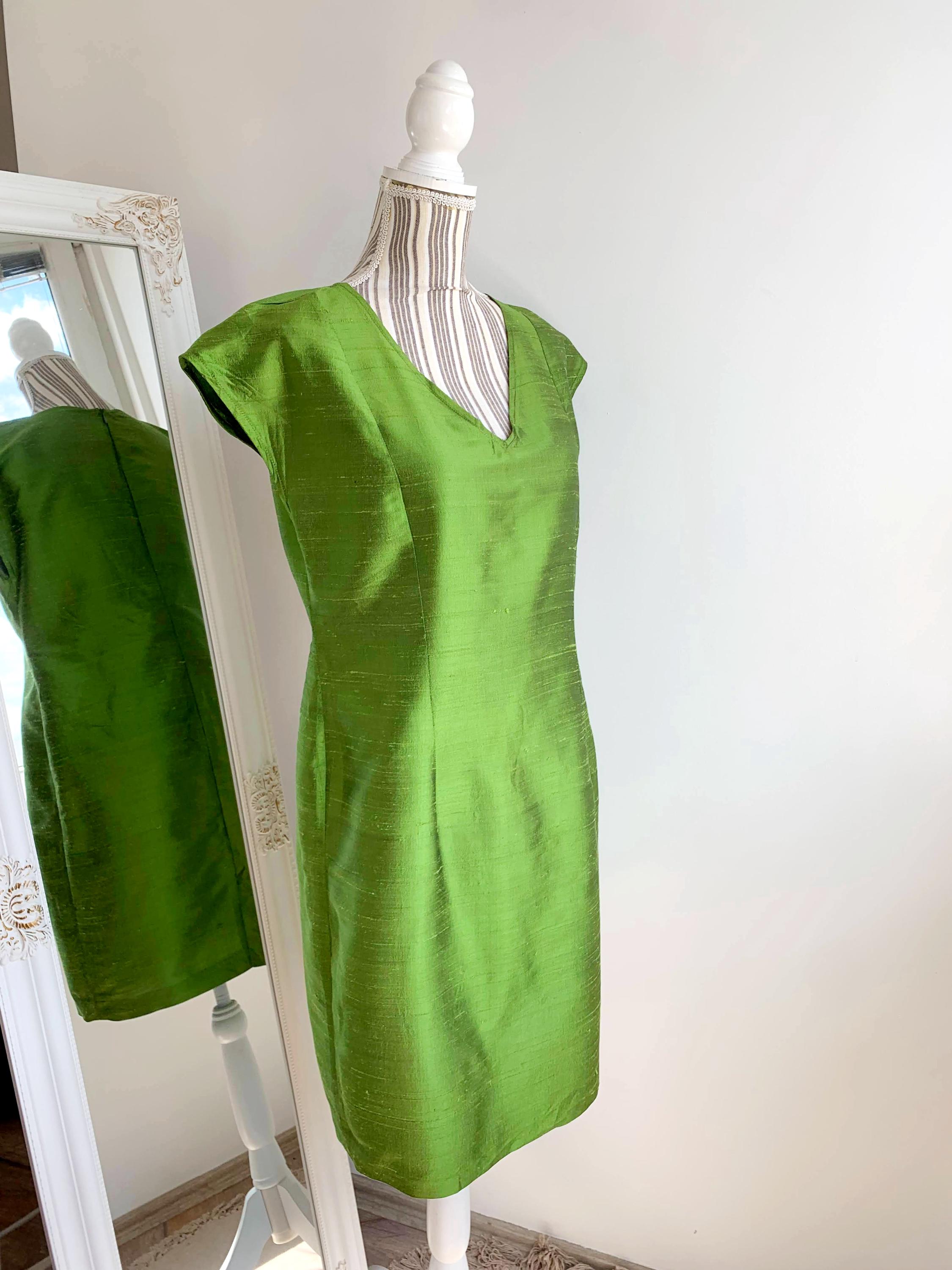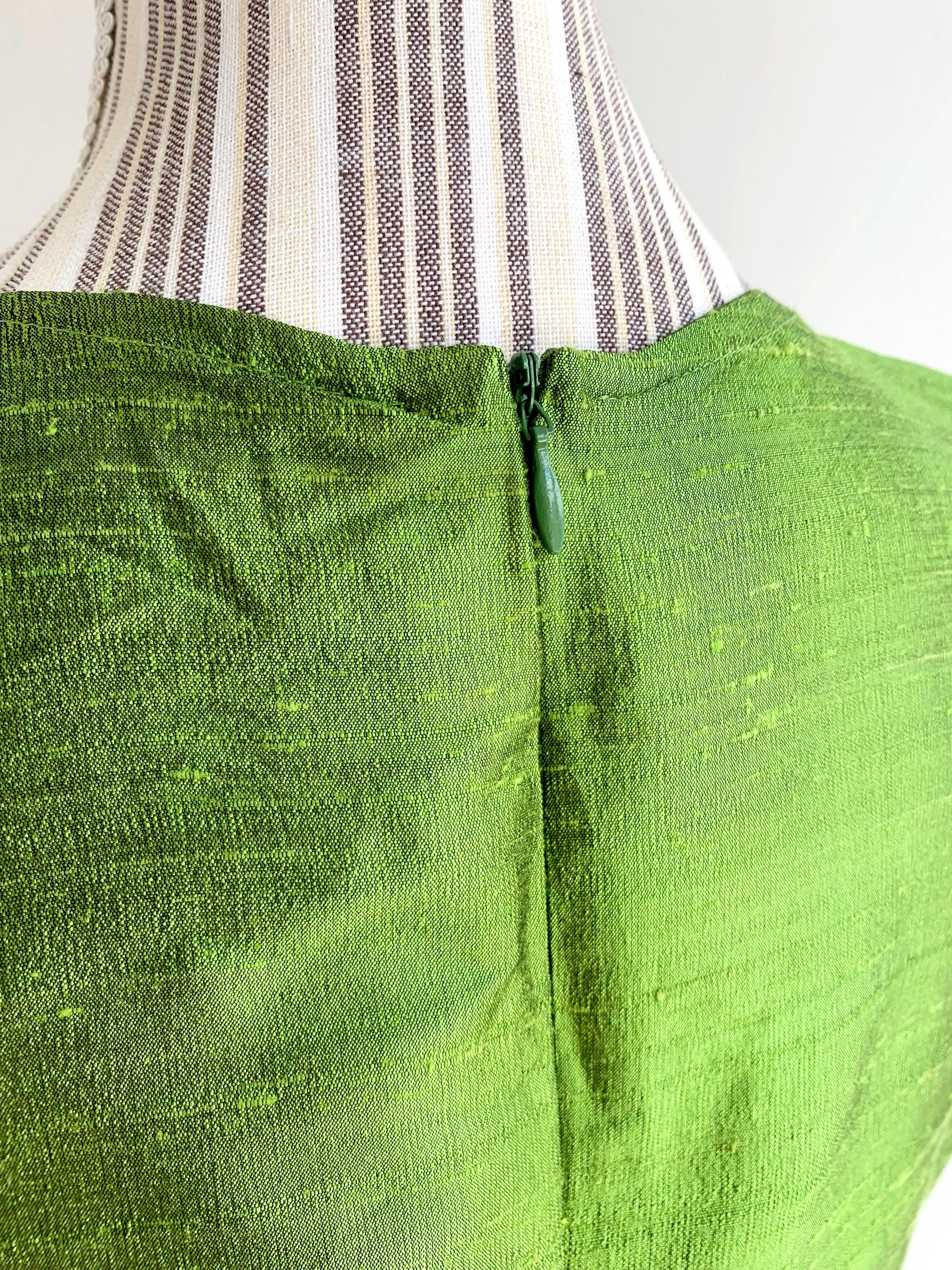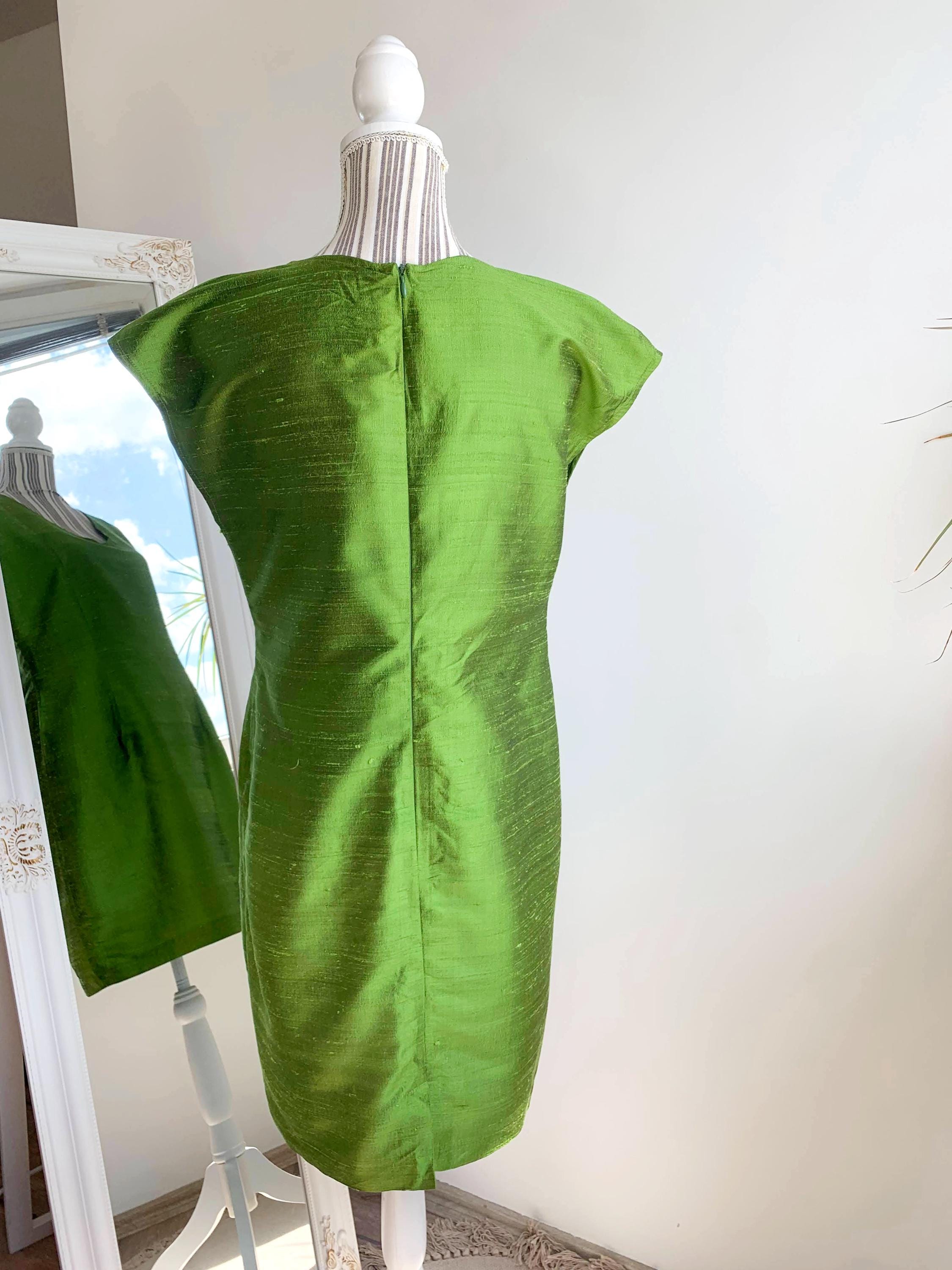 This is a beautiful vintage handmade raw silk short cocktail dress with slim fit seath silhouette and back zip closure. This classic green silk dress was handmade, it has no lining underneath. The natural silk fabric has texture and shines beautifully when exposed to light. As this silk cocktail dress was handmade it has no tags or labels. It fits like size L. Pelase check the measurements below.