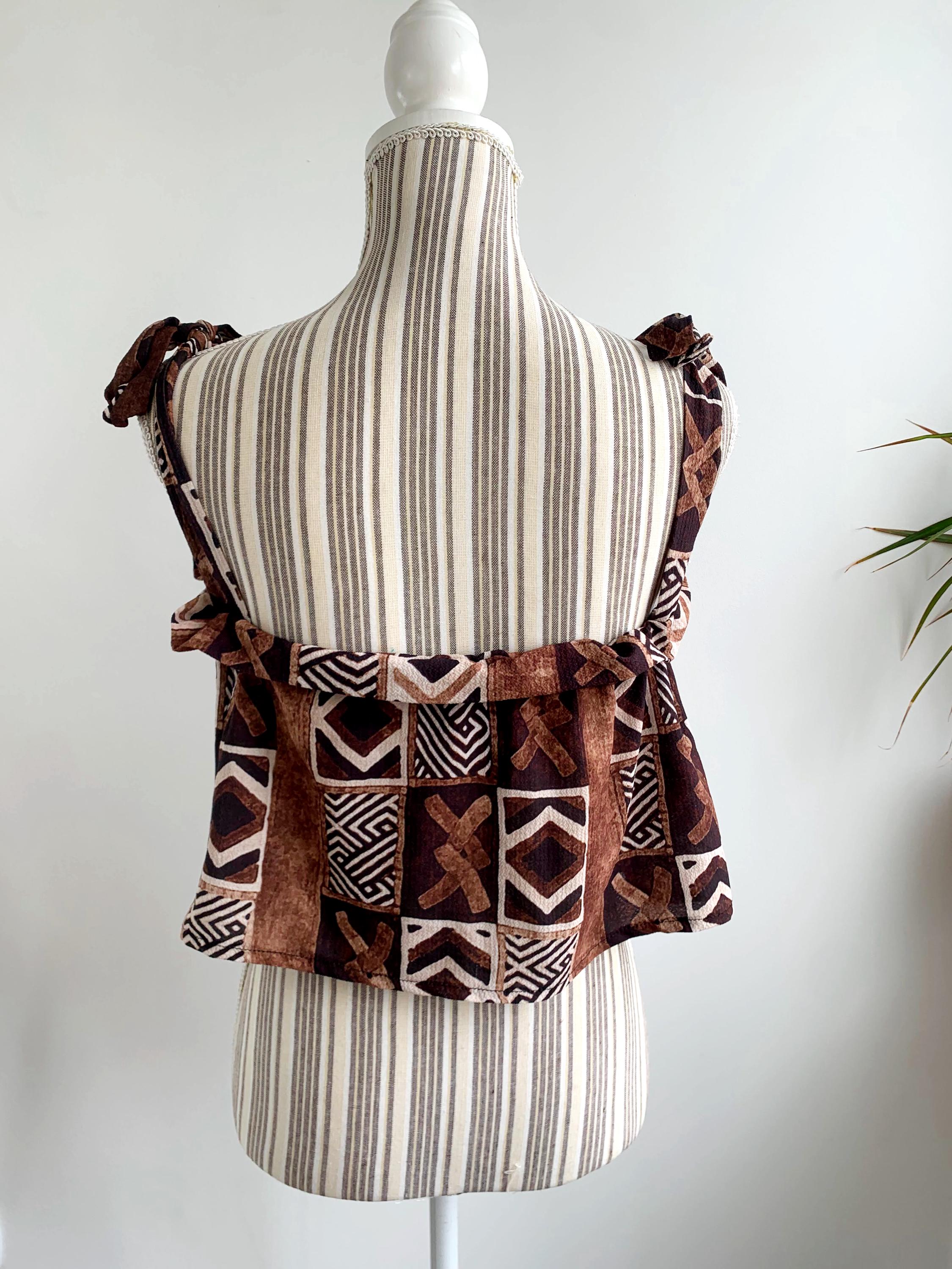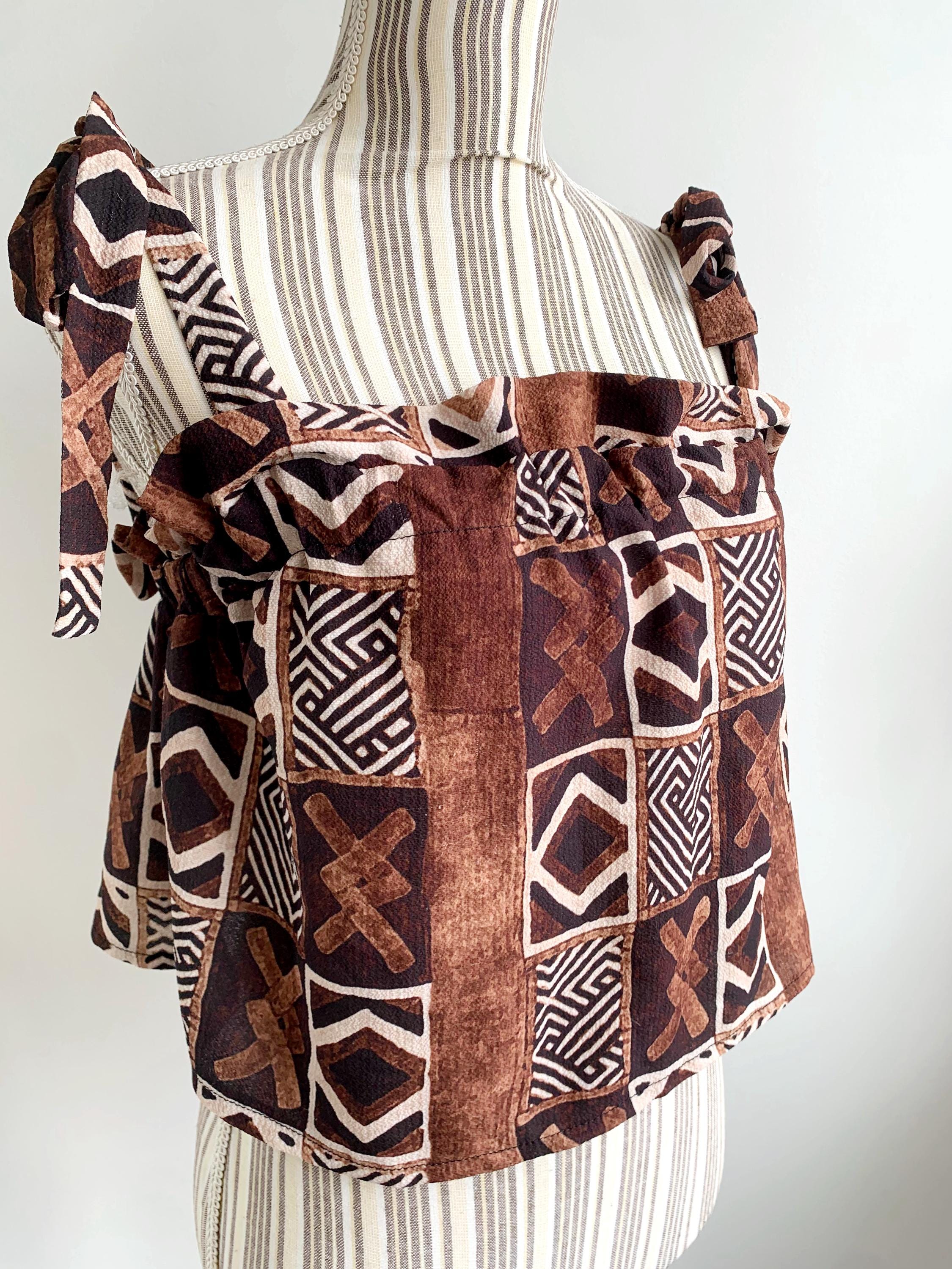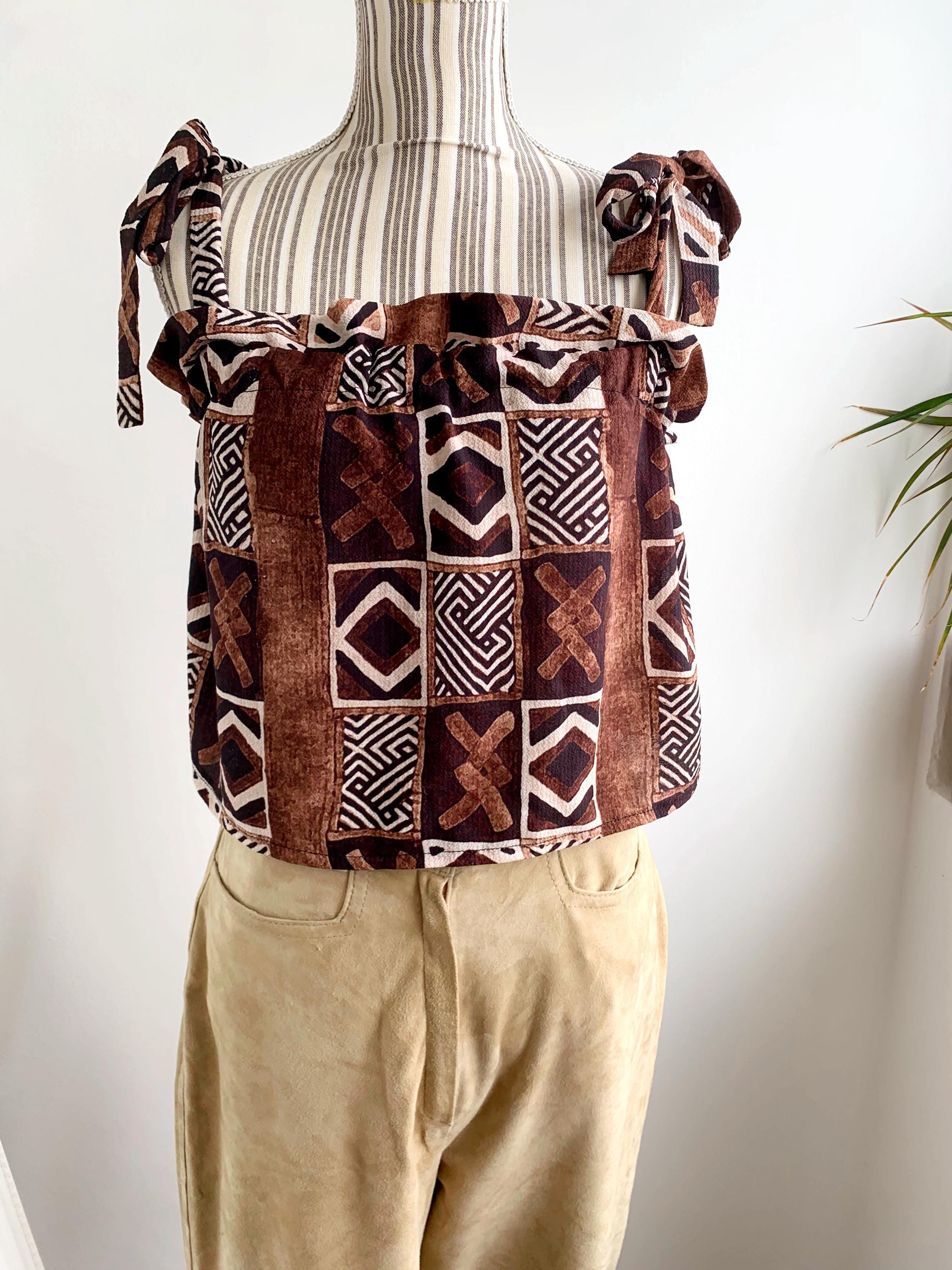 Vintage Y2K Italian boho tribal tank top with bowtie spaghetti straps in shades of brown and beige. This tie knot strap crop top has a relaxed silhouette with square neckline. This beach cami top is made of 95% polyester and 5% elastane. Gorgeous vacation top for your summer holiday. There is no size marked, would fit best sizes S to M. Please check the measurements below.