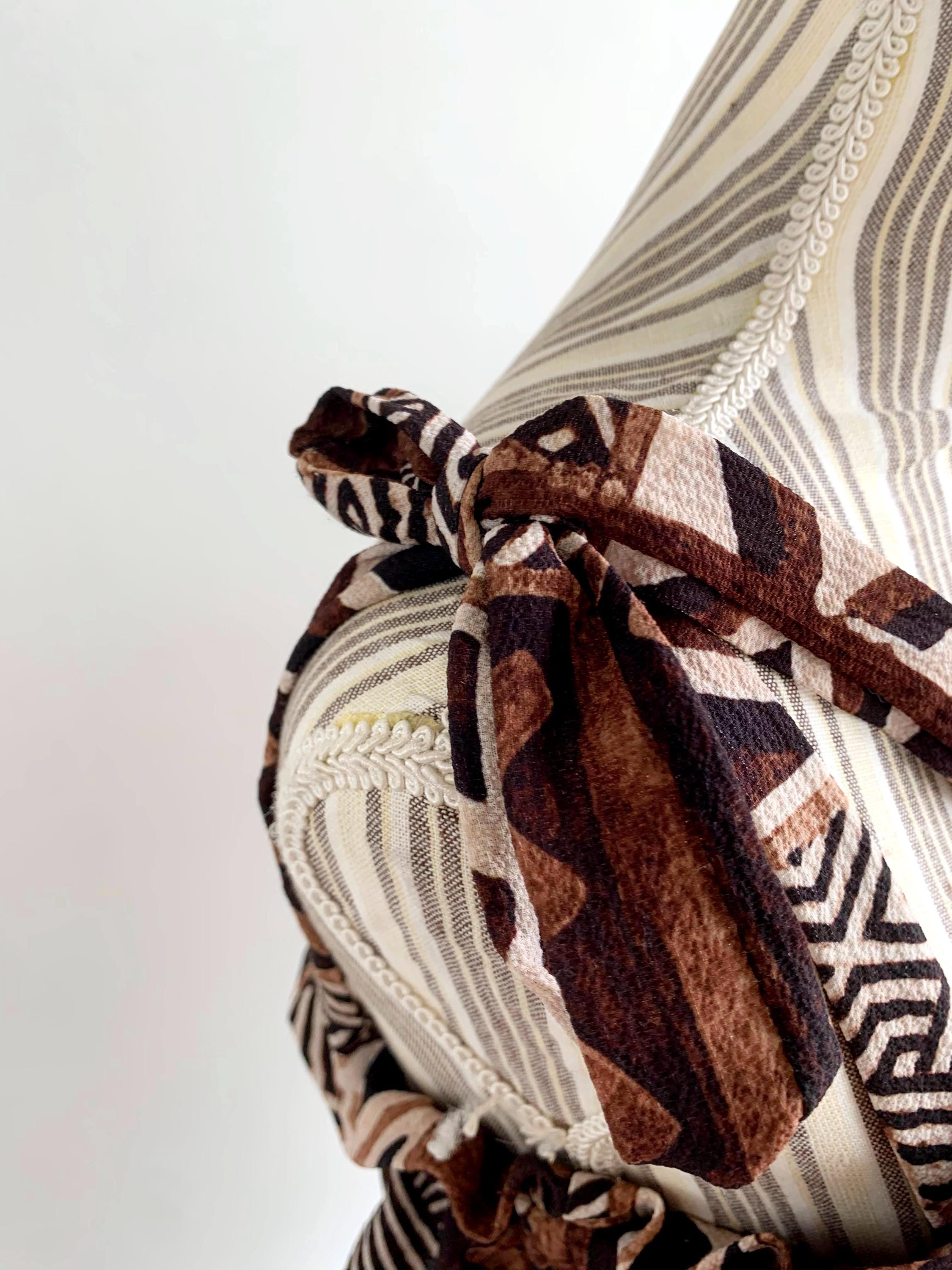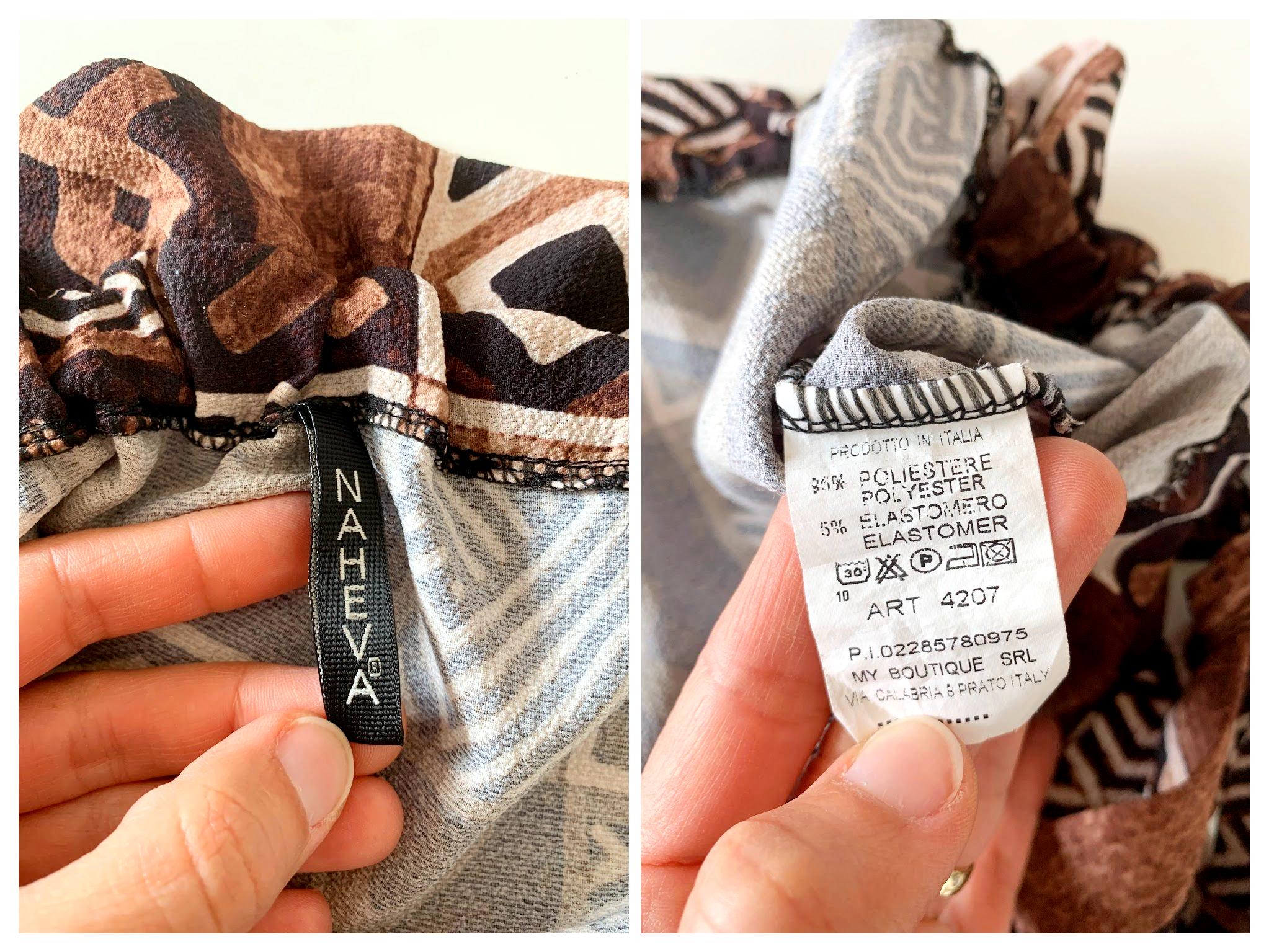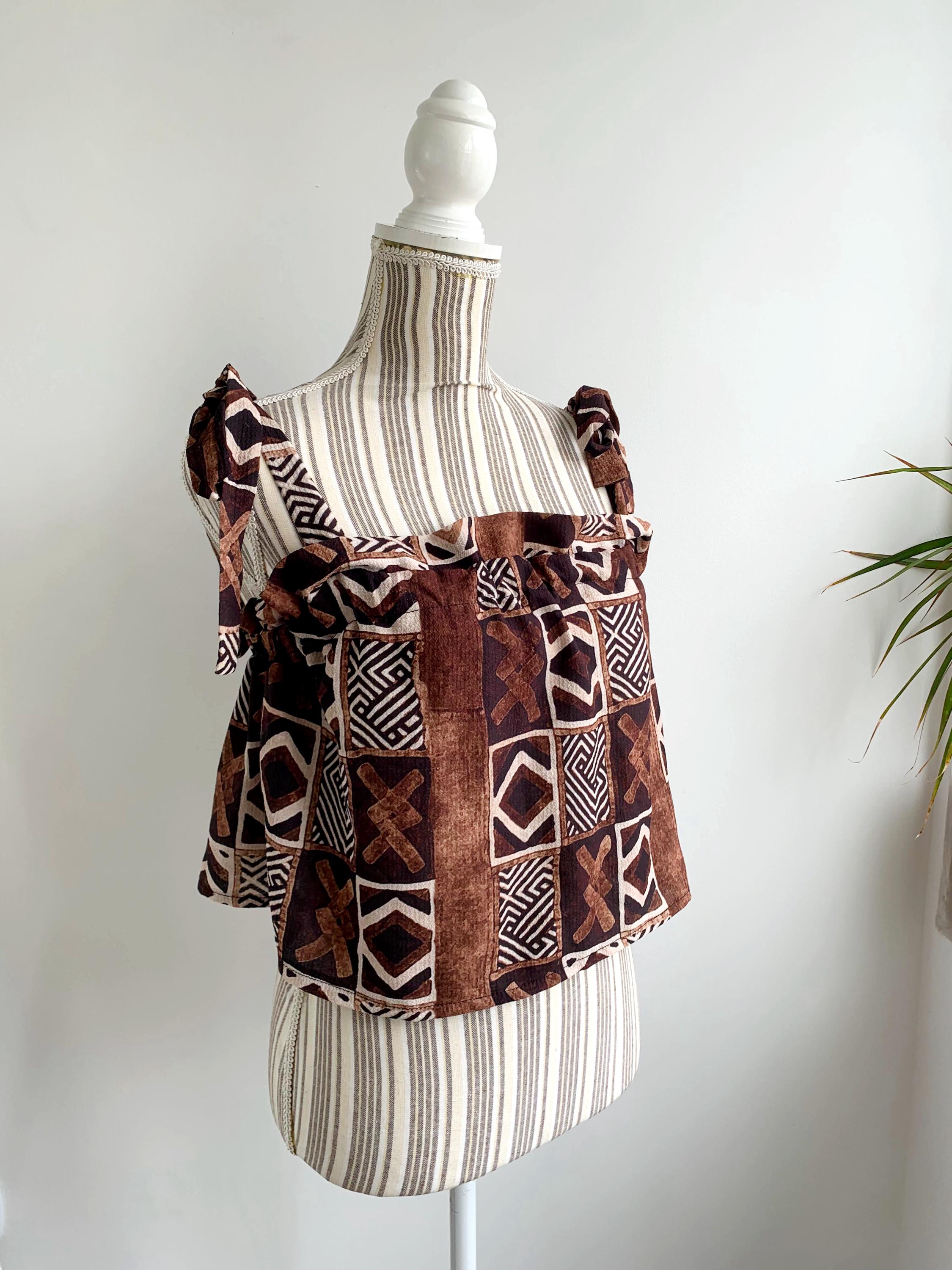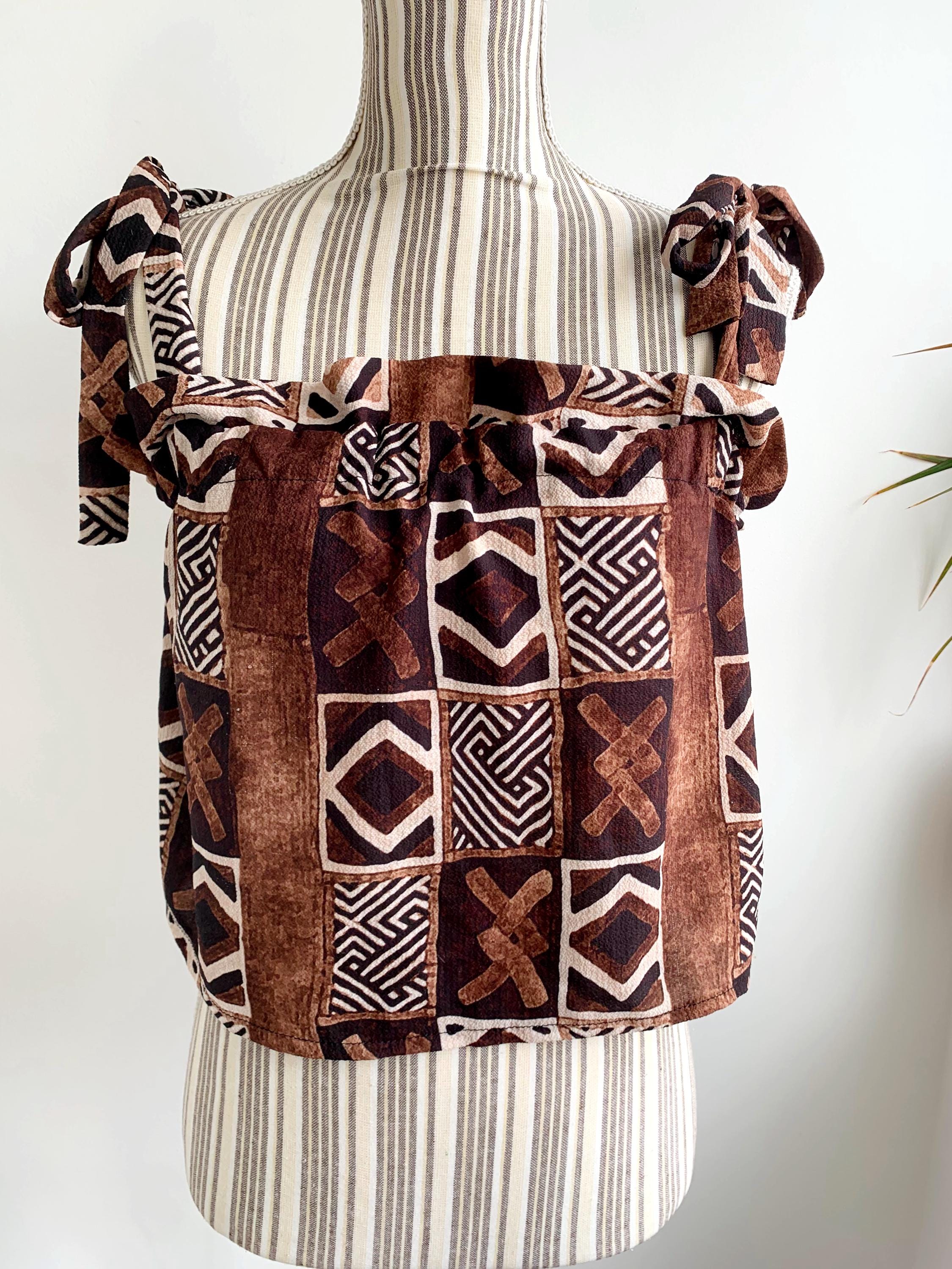 Vintage Y2K Italian boho tribal tank top with bowtie spaghetti straps in shades of brown and beige. This tie knot strap crop top has a relaxed silhouette with square neckline. This beach cami top is made of 95% polyester and 5% elastane. Gorgeous vacation top for your summer holiday. There is no size marked, would fit best sizes S to M. Please check the measurements below.