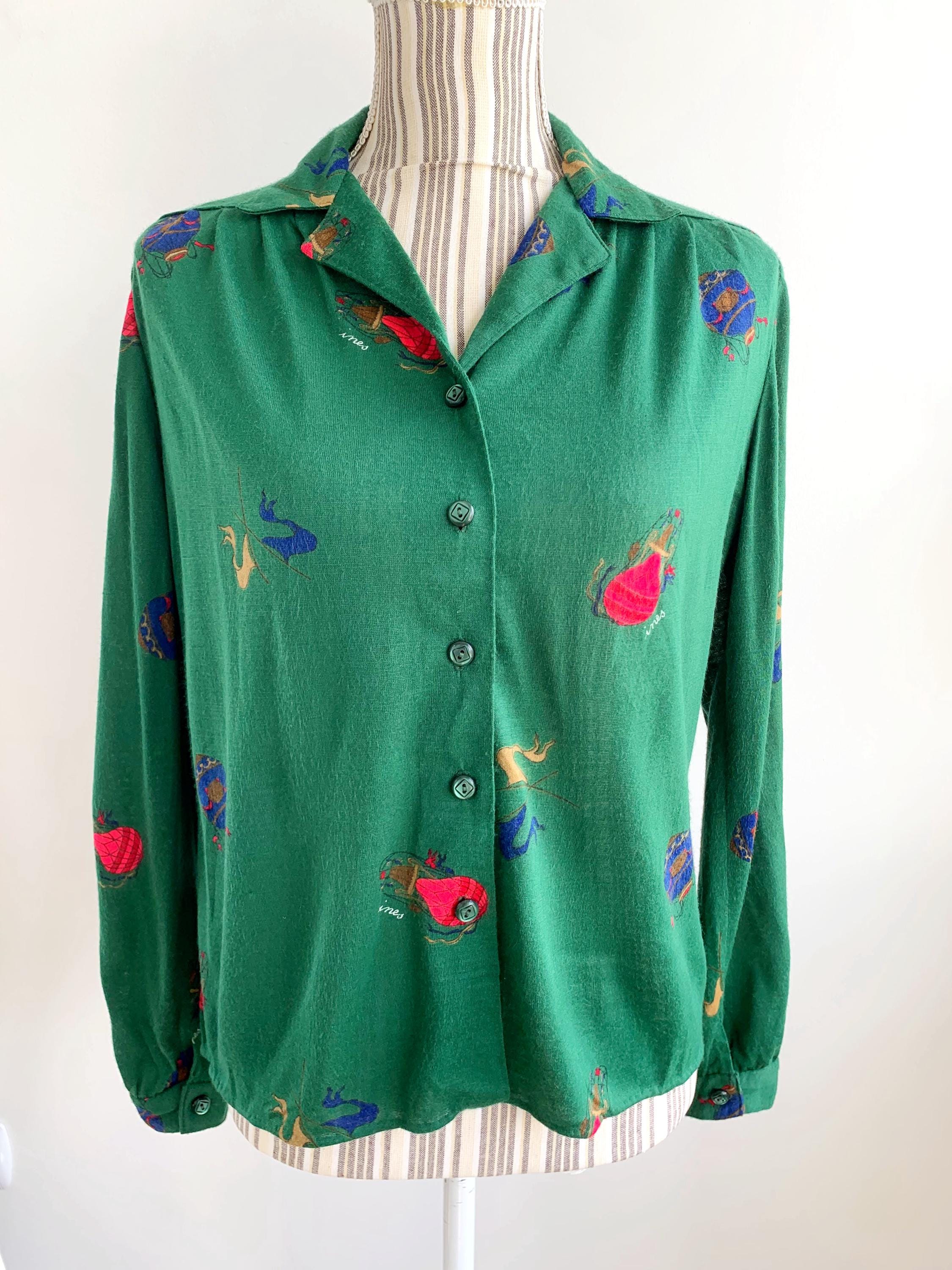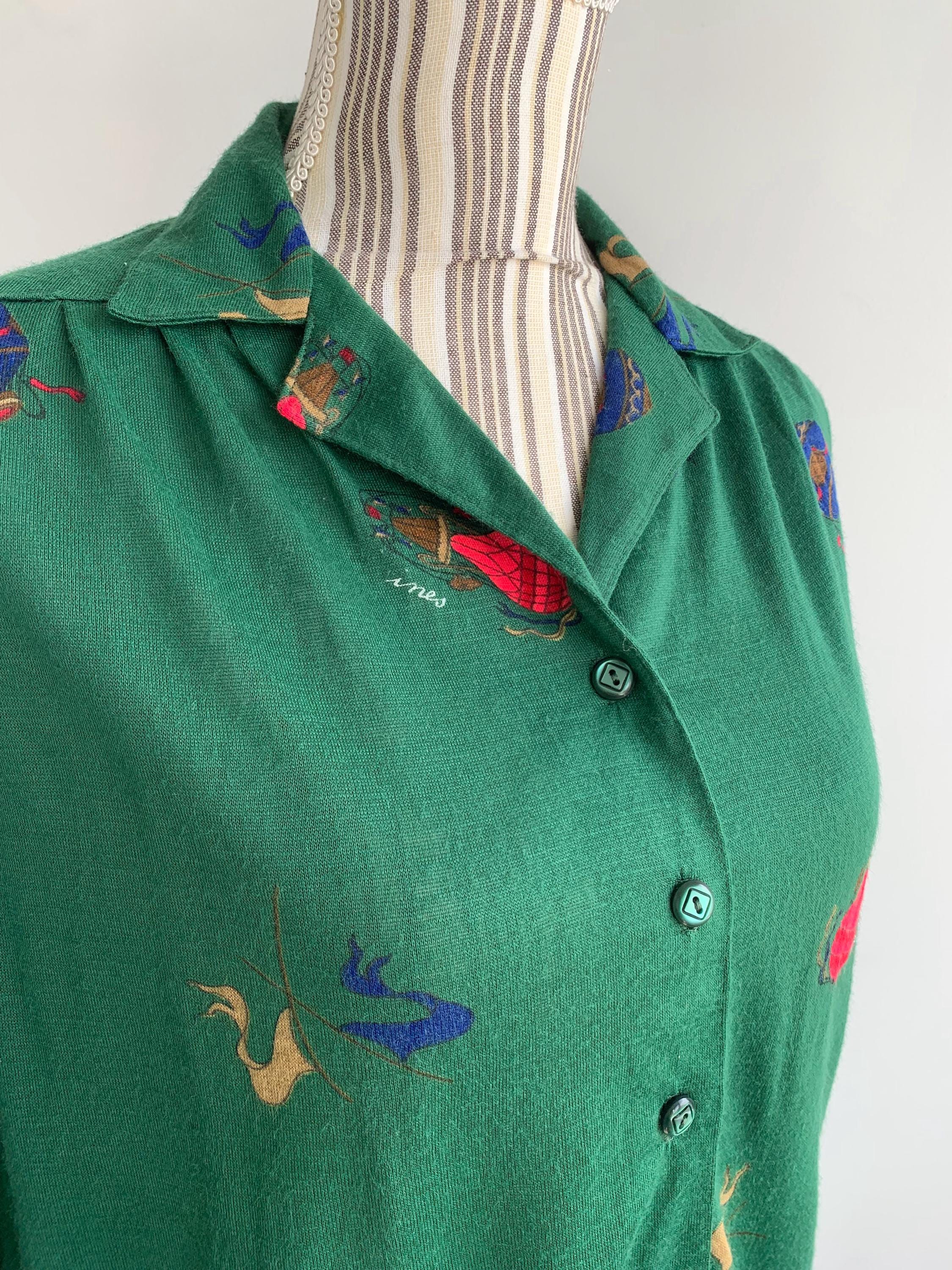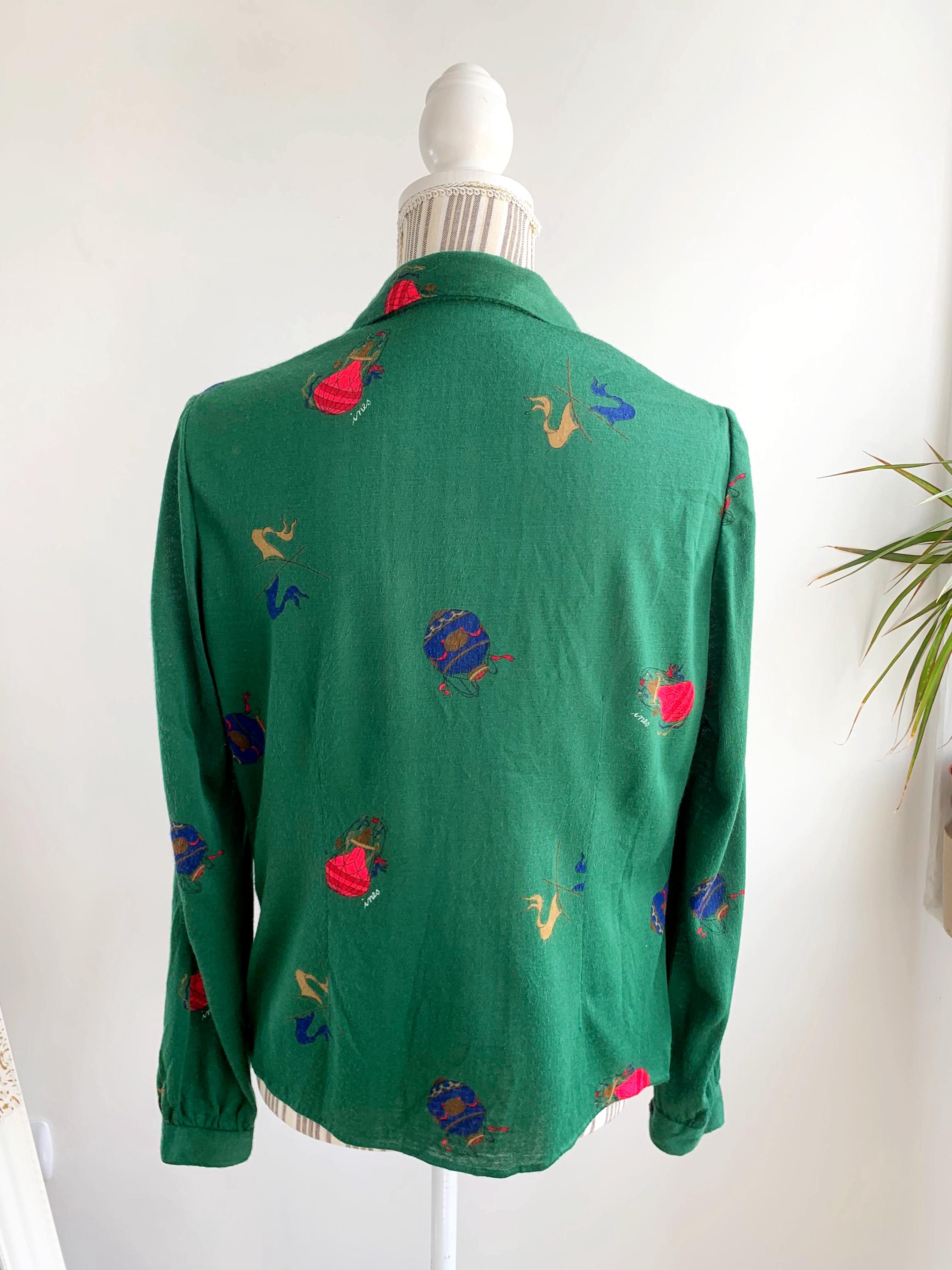 This is vintage 70s collared shirt for women with retro novelty print in red and blue with balloons and flags. This retro secretary shirt is made of stretchy jersey fabric, possibly poly cotton jersey. It fits like size M/L. As there are no tags or labels, please check the measurements below.