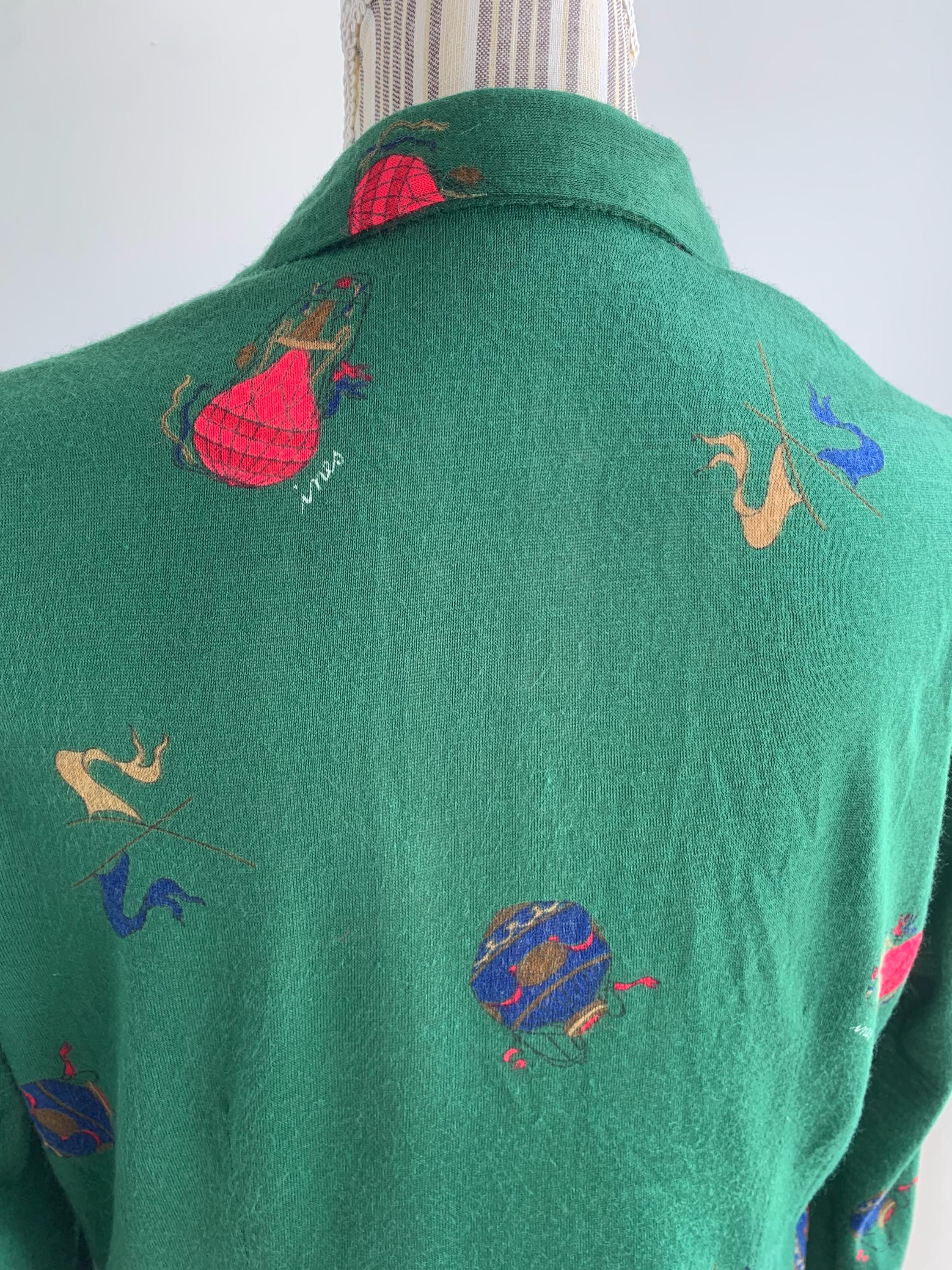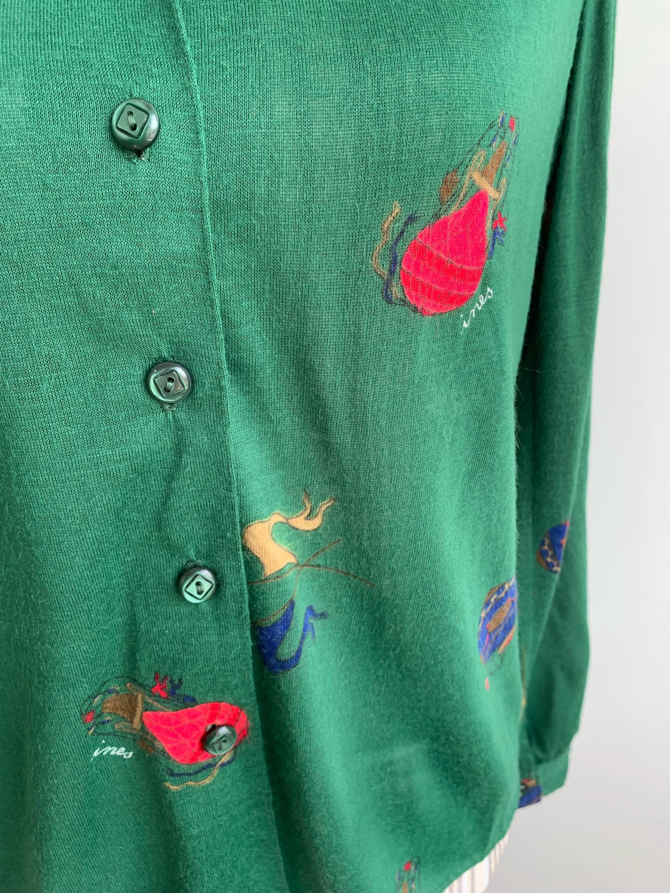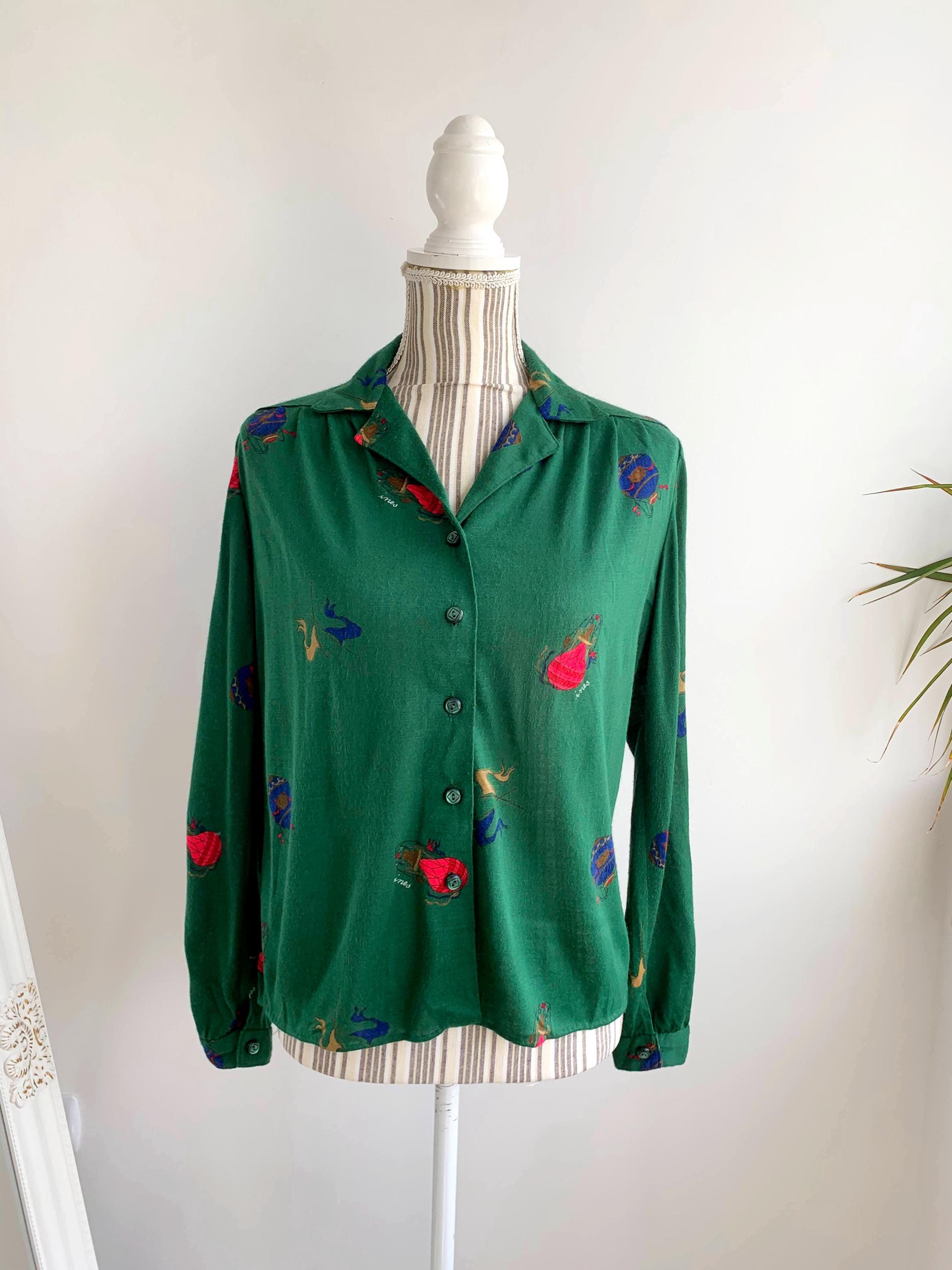 This is vintage 70s collared shirt for women with retro novelty print in red and blue with balloons and flags. This retro secretary shirt is made of stretchy jersey fabric, possibly poly cotton jersey. It fits like size M/L. As there are no tags or labels, please check the measurements below.