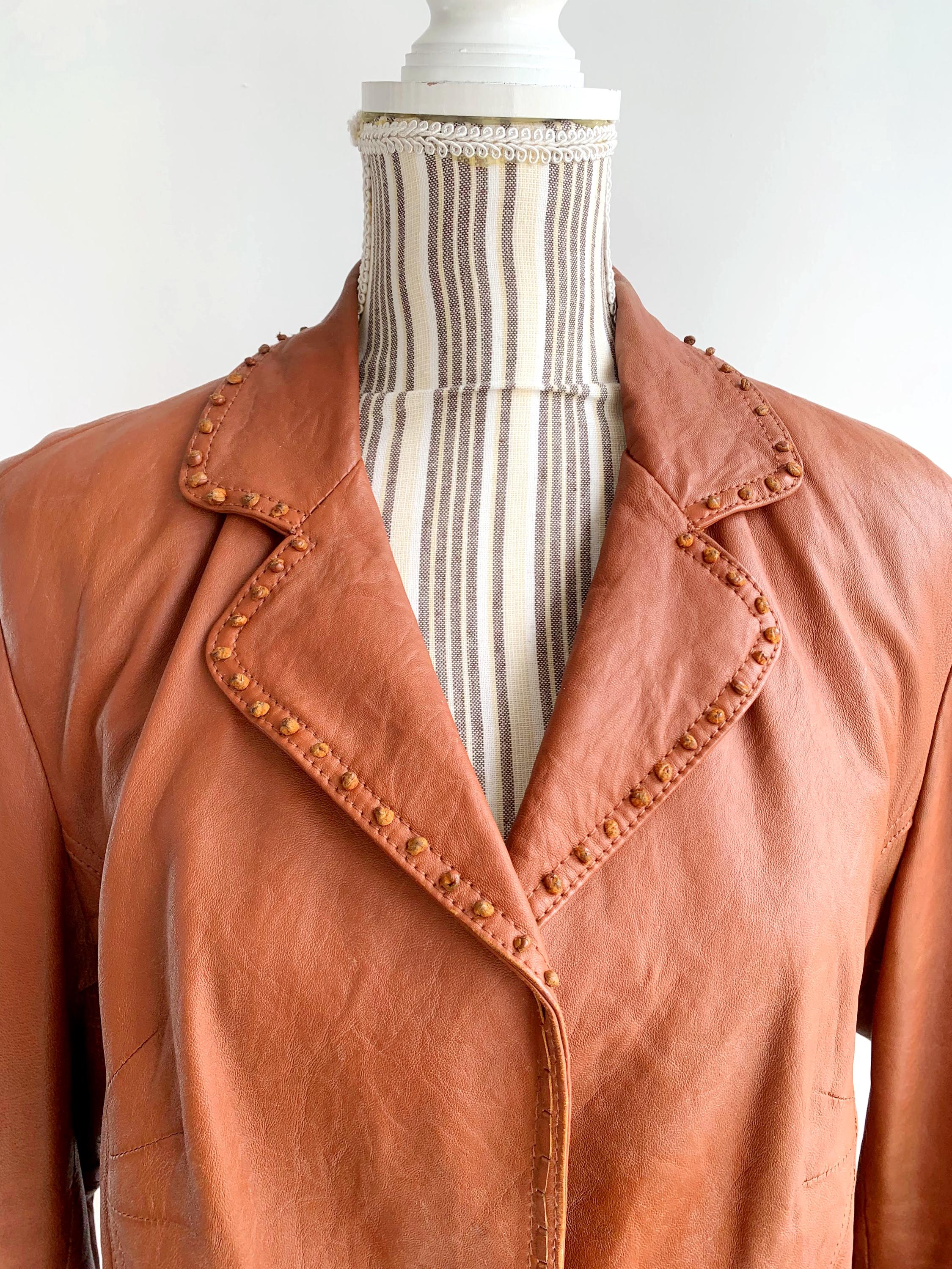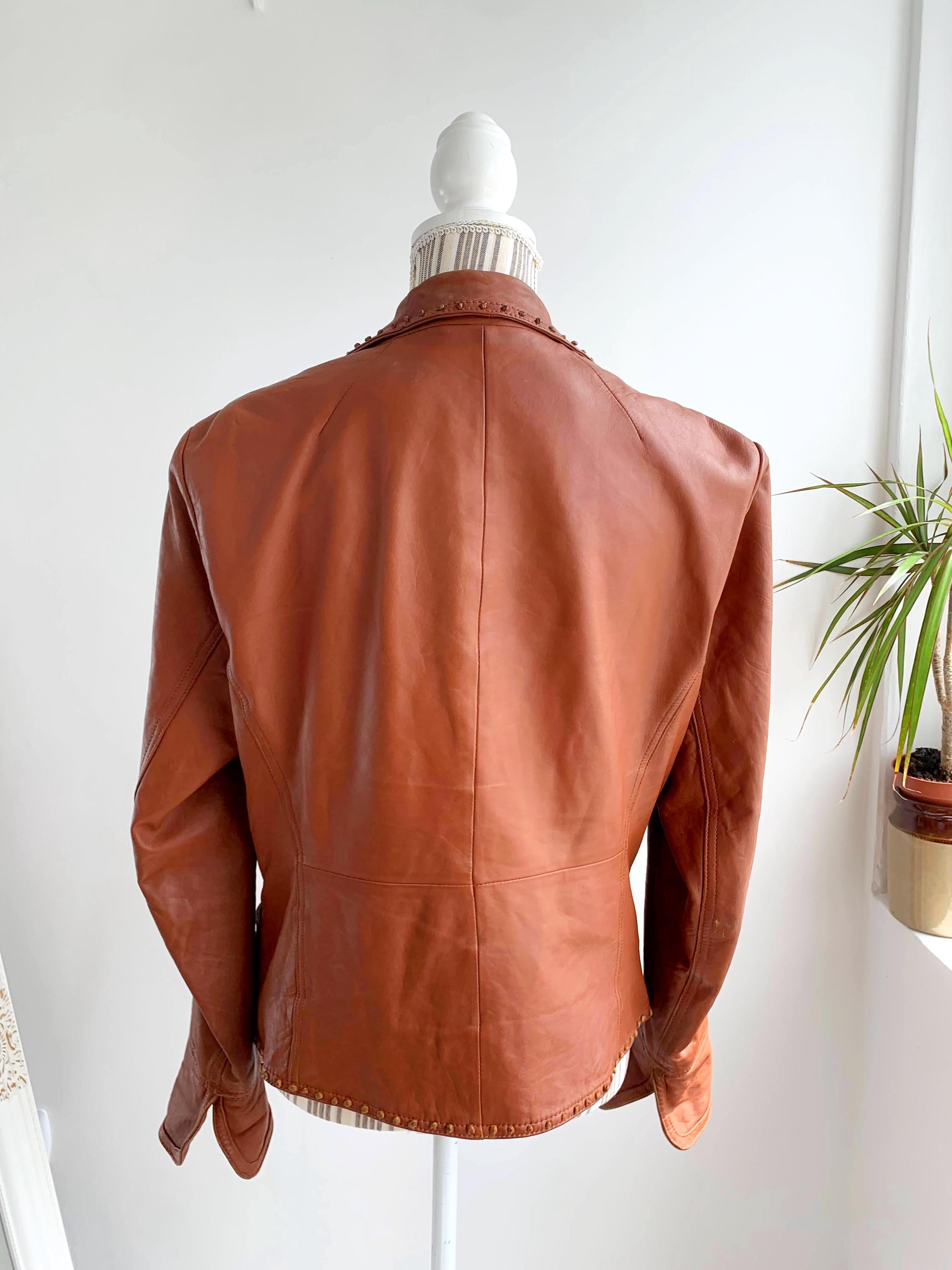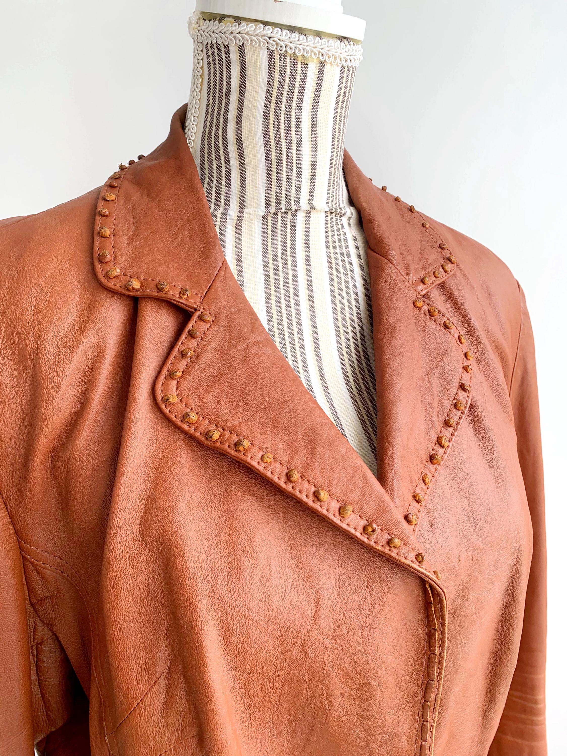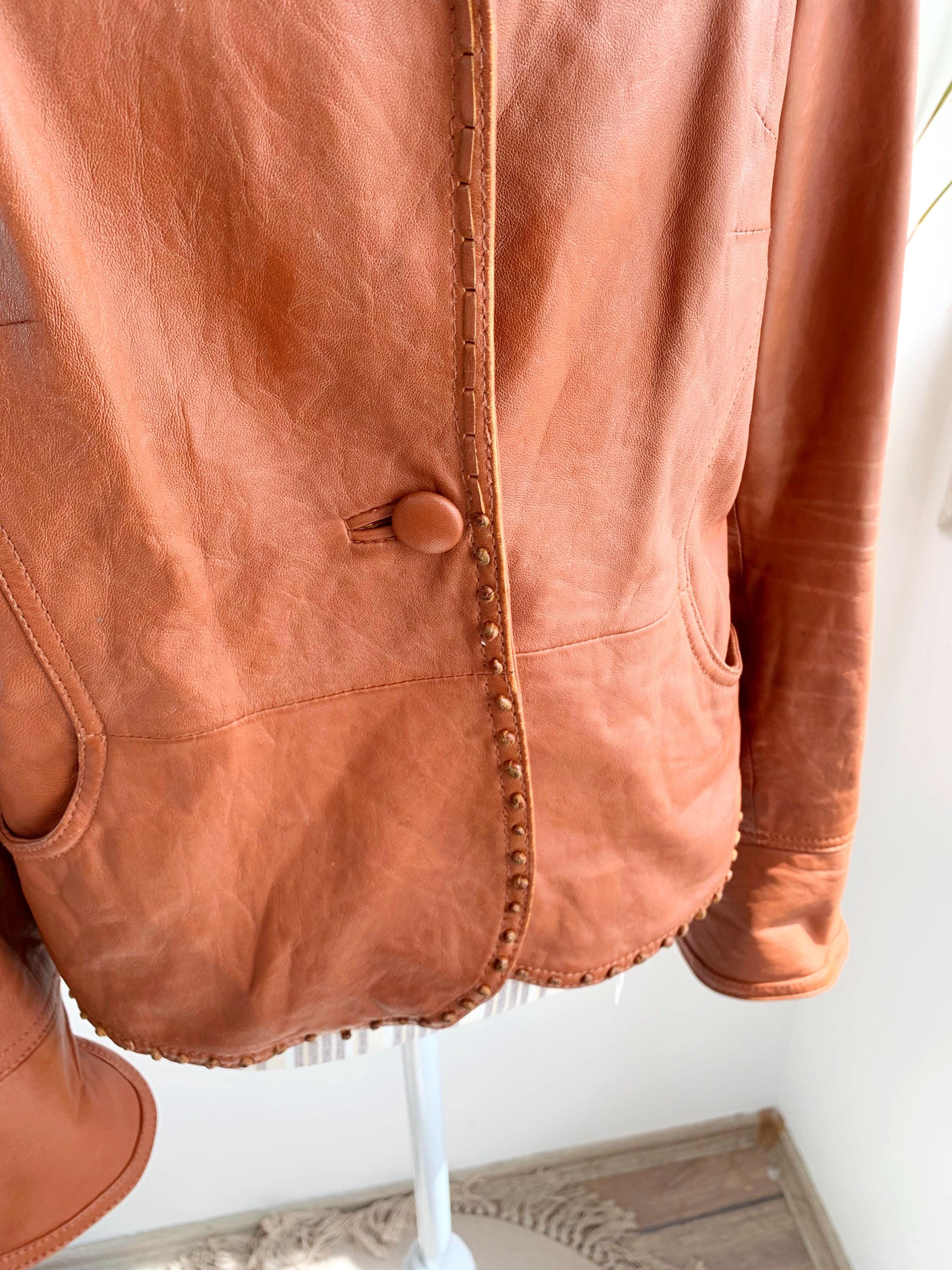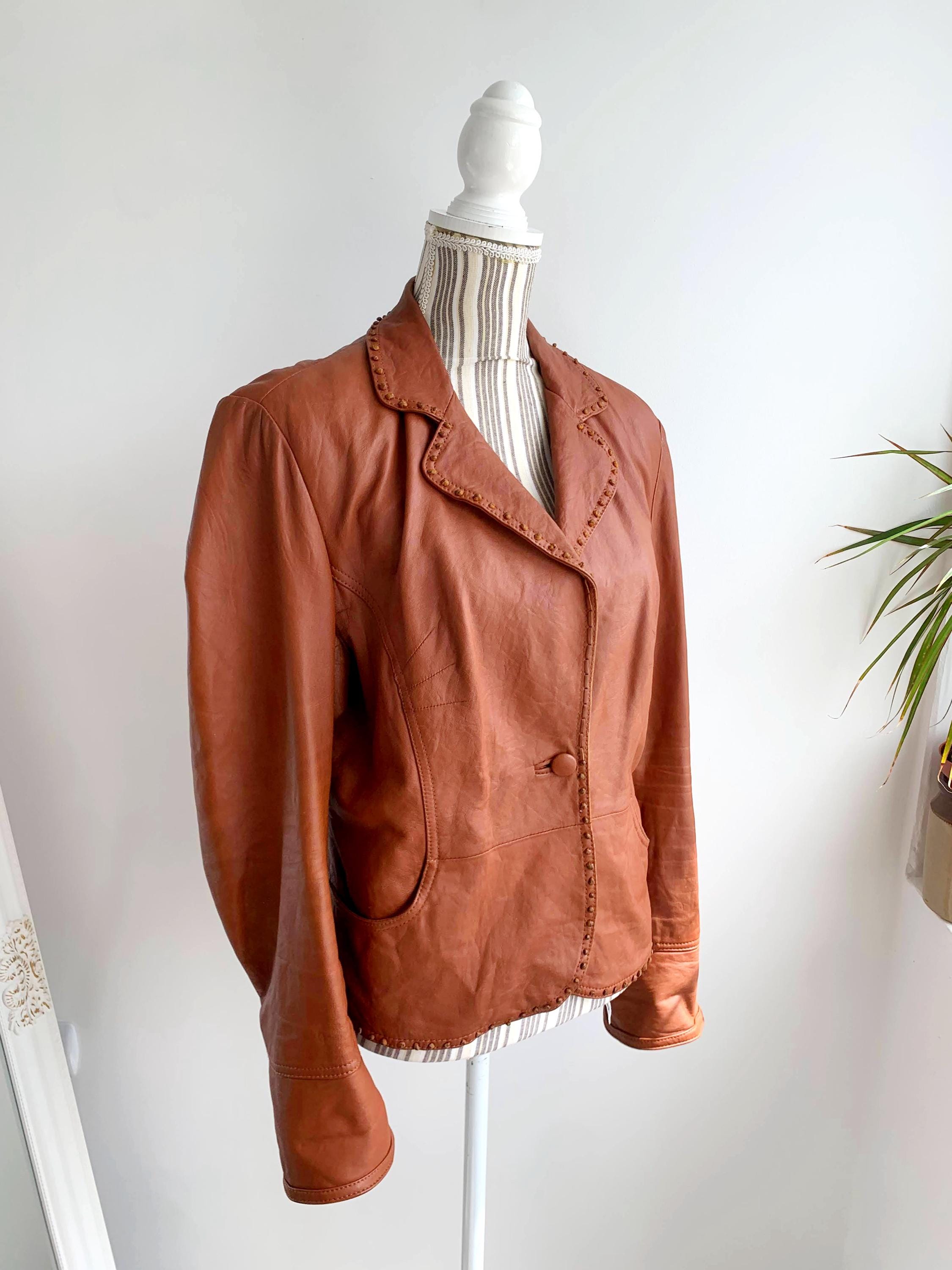 This is a vintage 90s distressed leather blazer jacket for women with single button closure and two side pockets with satin lining underneath. This toffee brown leather blazer is made of soft genuine leather which has an aged look due to the marks and scratches on the leather surface. This slim fit leather blazer for women no size marked, it fits like L or XL. Please check the measurements below.