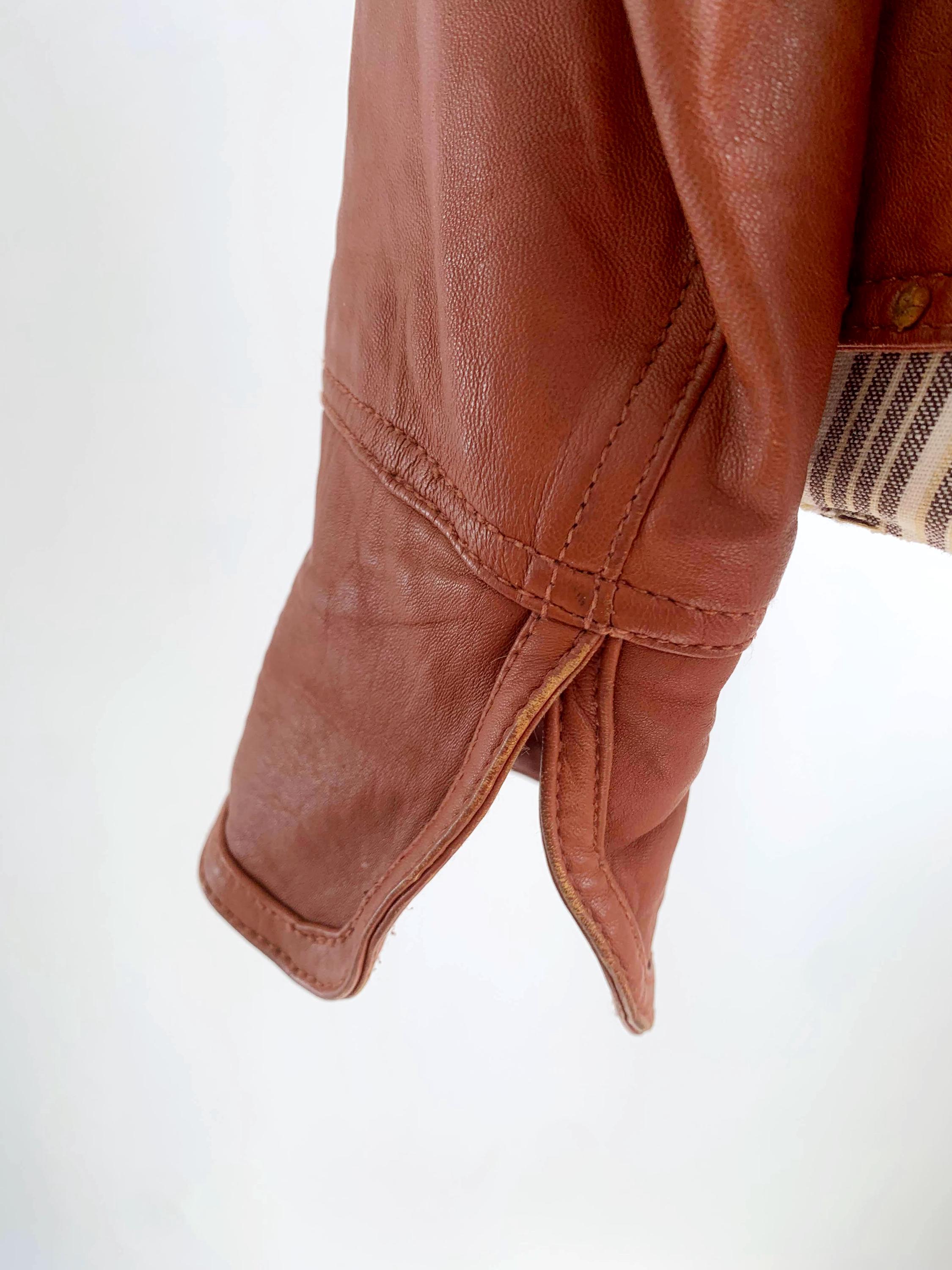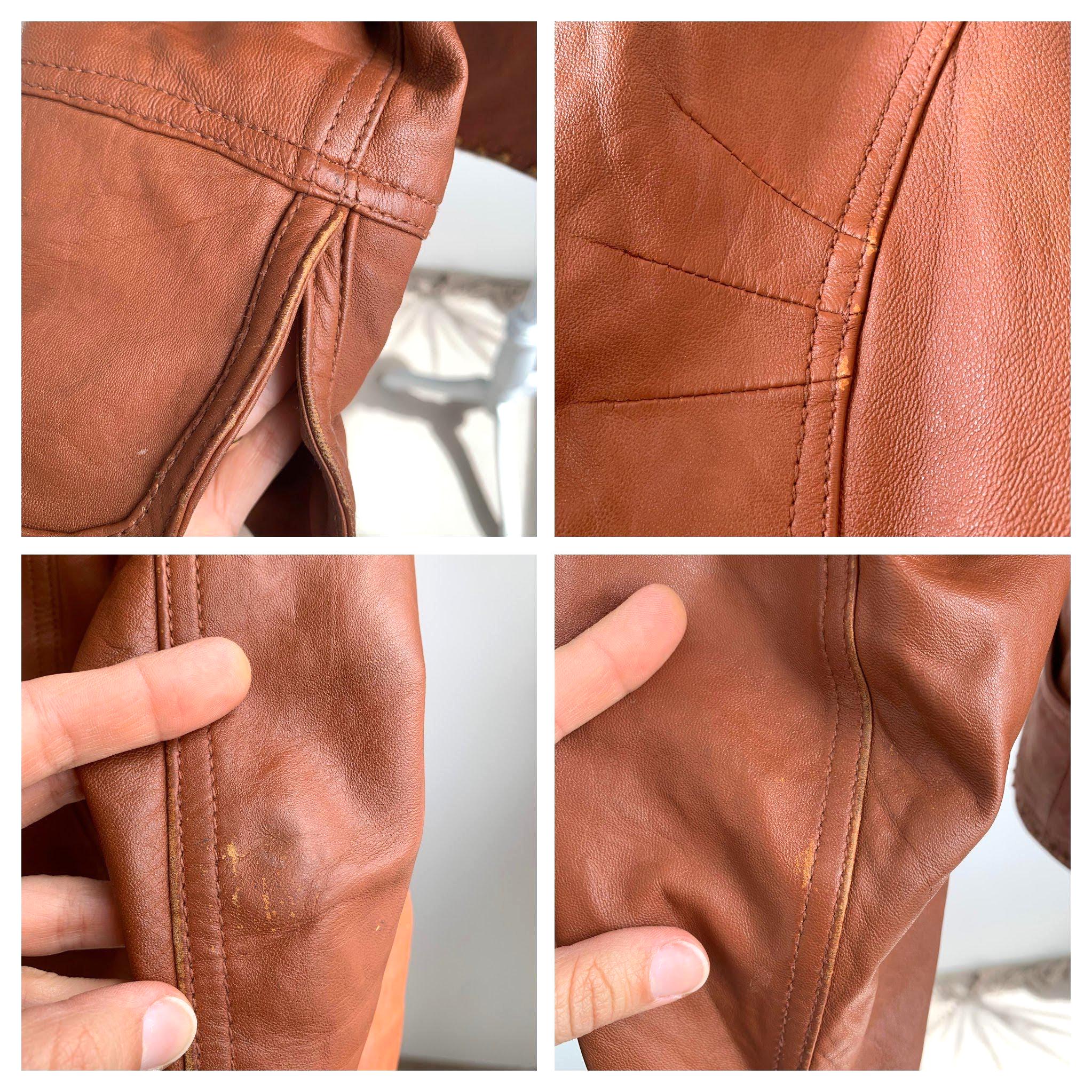 Condition: there are some signs of wear around the elbows and cuffs. The leather shows some scratches and fading, captured in the close ups