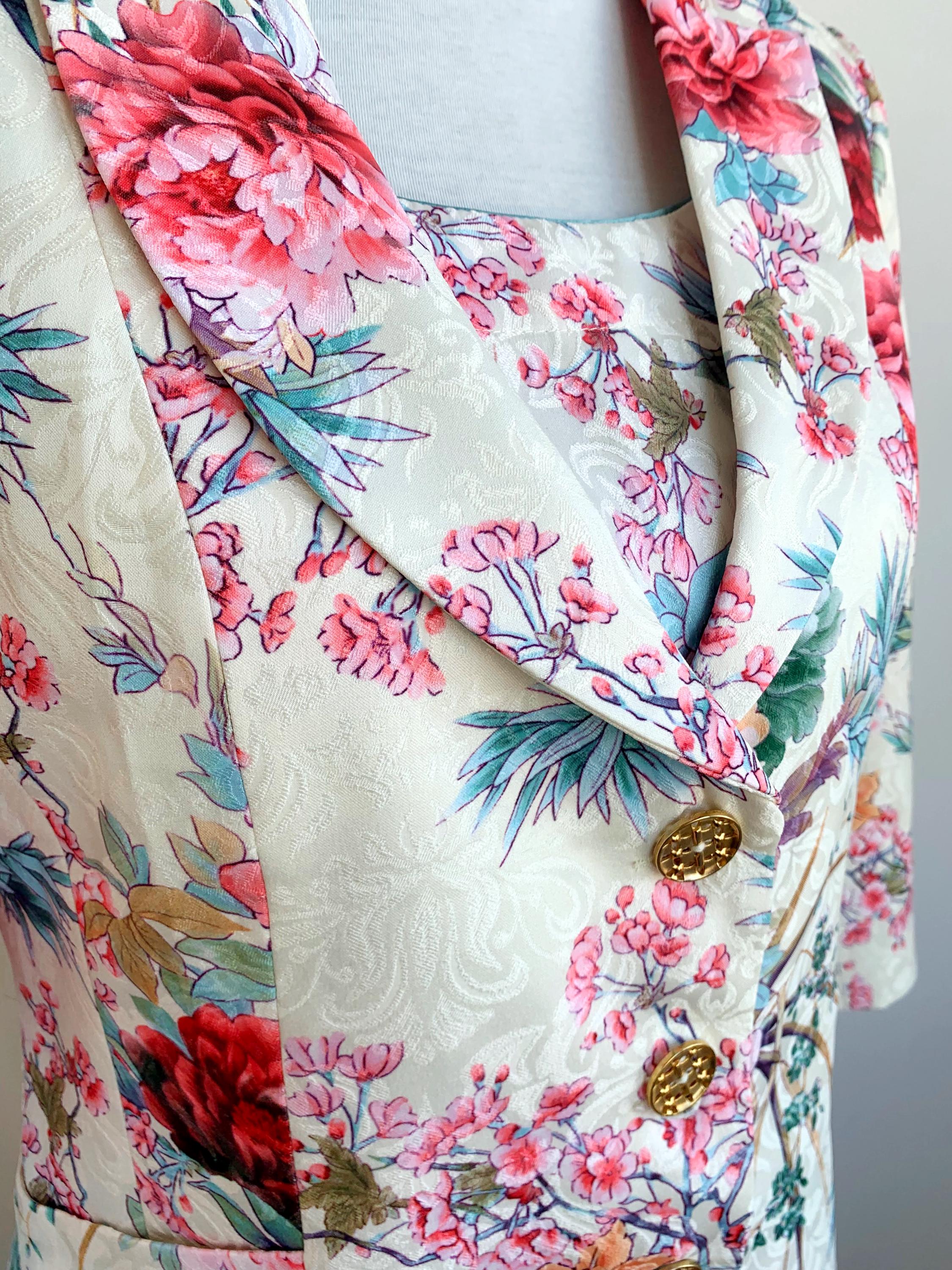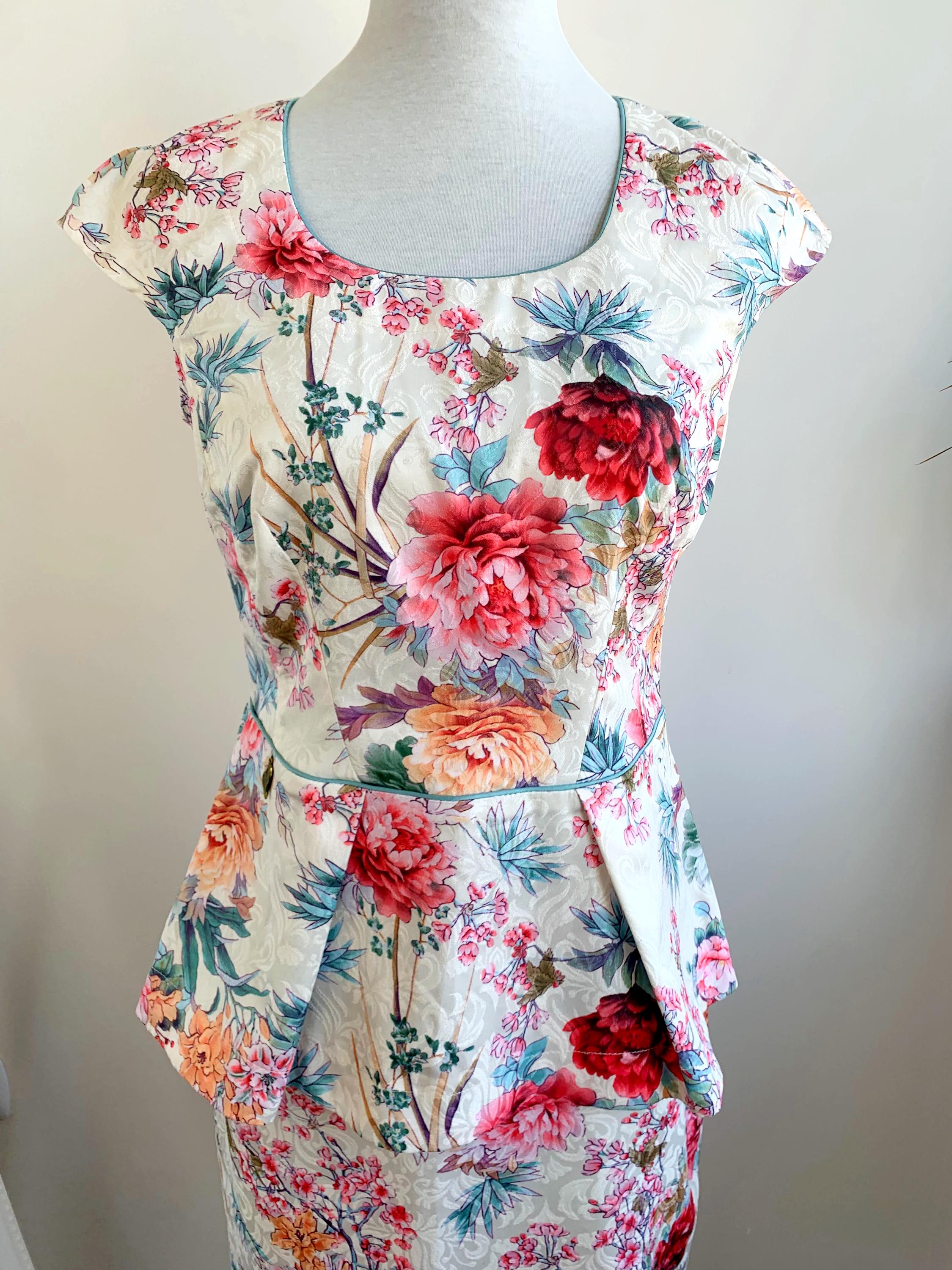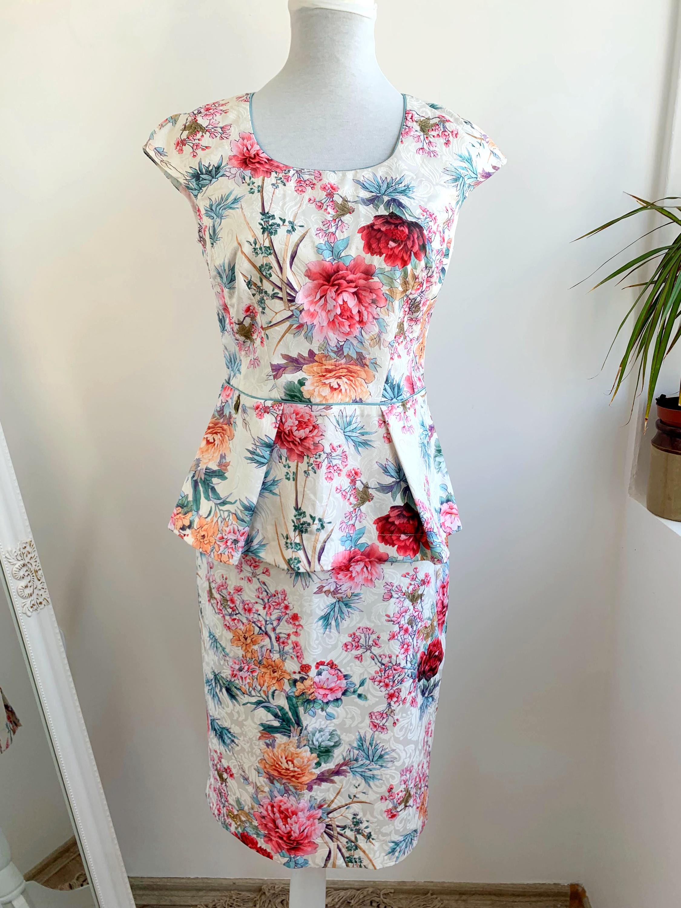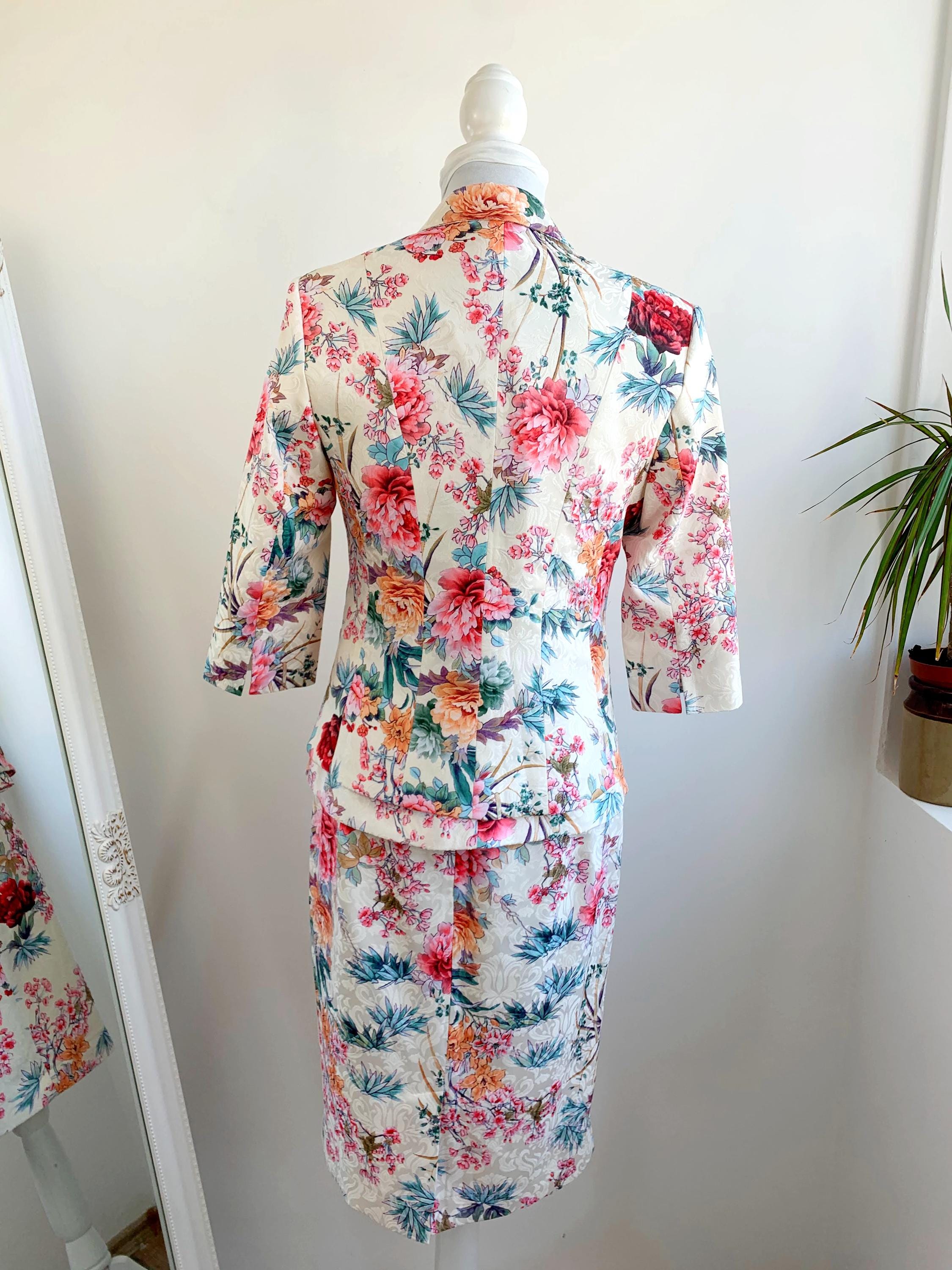This is a wonderful Y2K half sleeve blazer, pencil mini skirt and short sleeve peplum top matching 3 piece suit set for women. This skirt suit set is made of gorgeous floral jacquard fabric in cream off white color with red and pink flowers made of cotton, polyester and elastane. This women suit set fits like size S. Please check the measurements below.