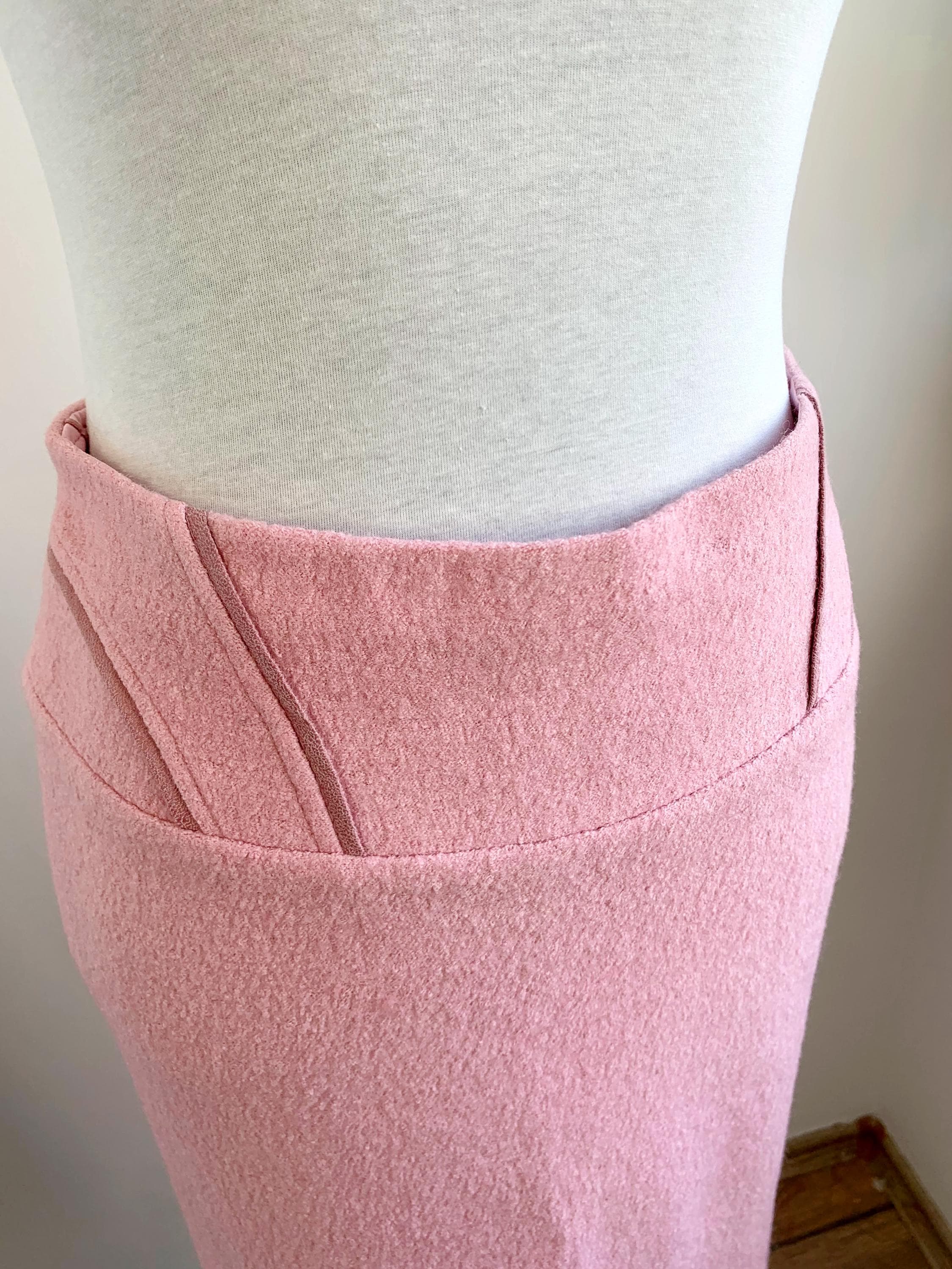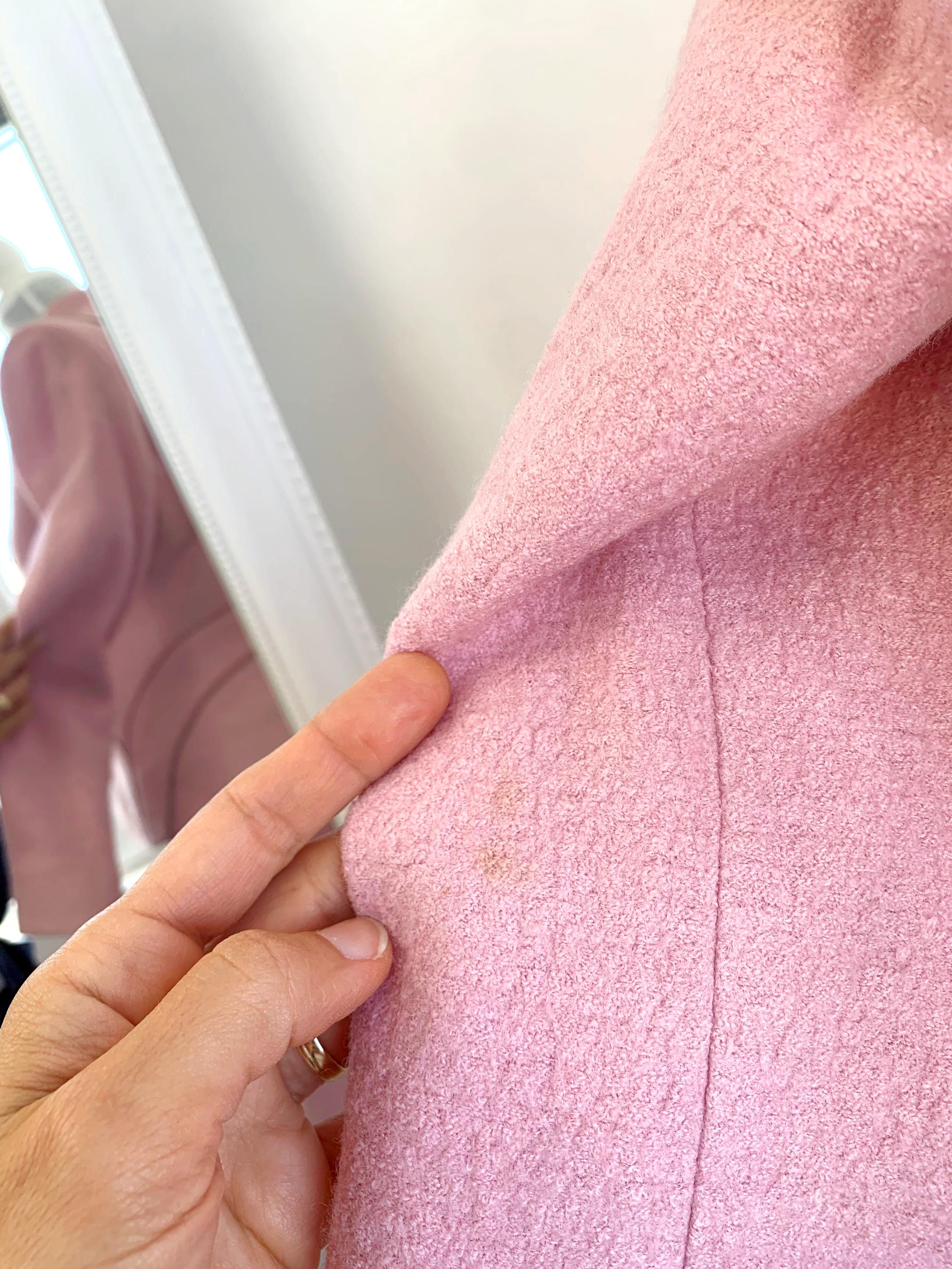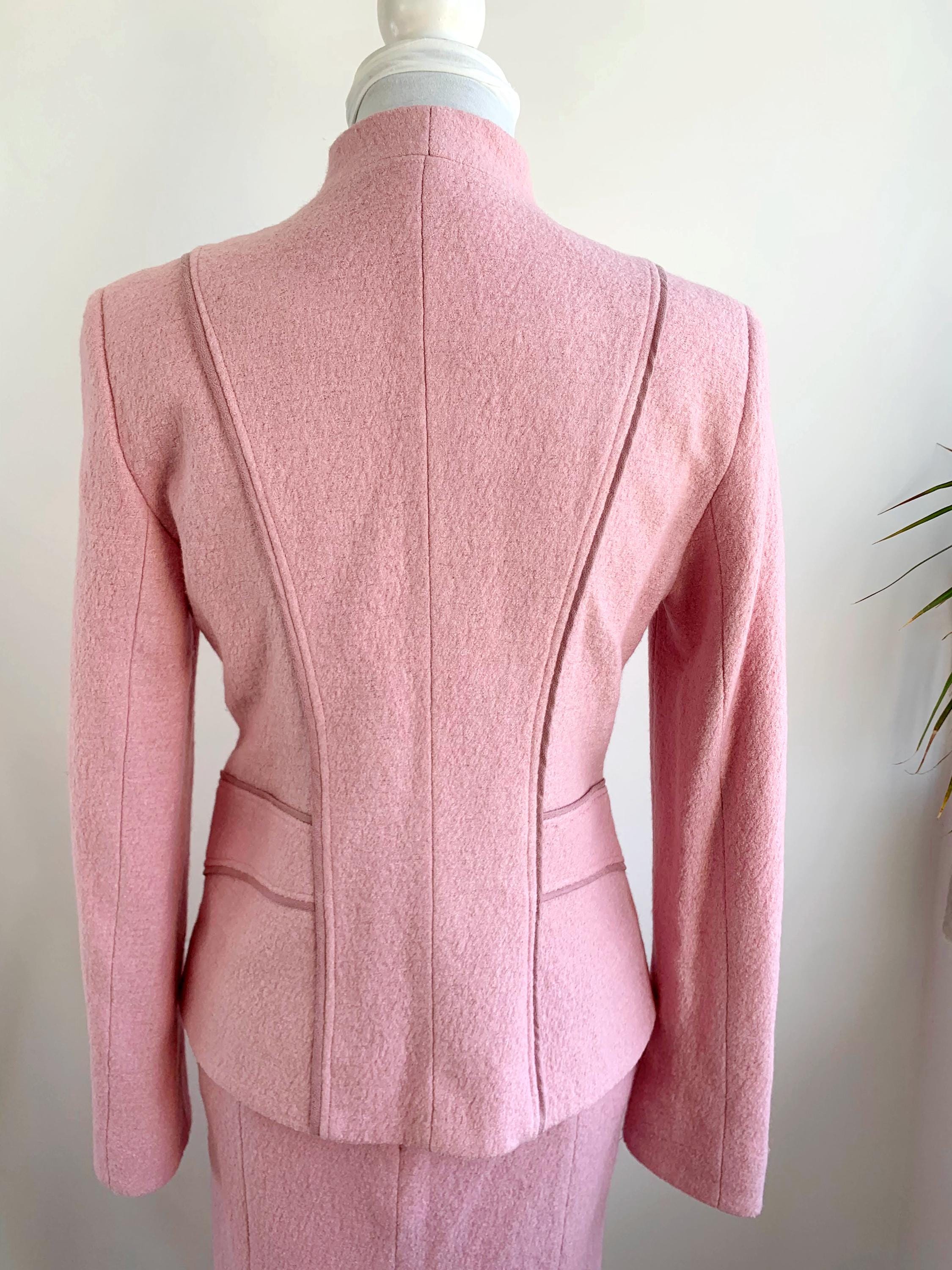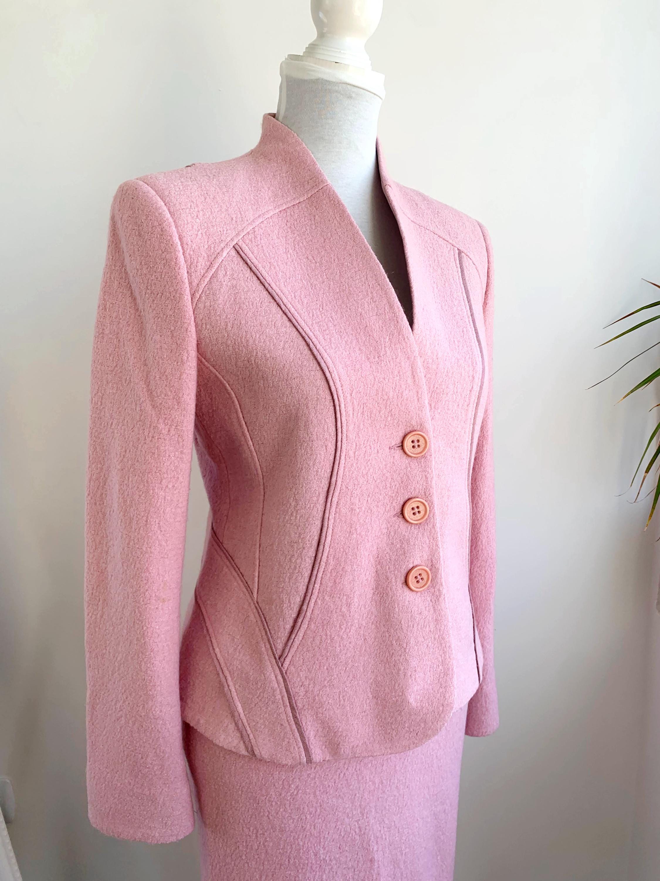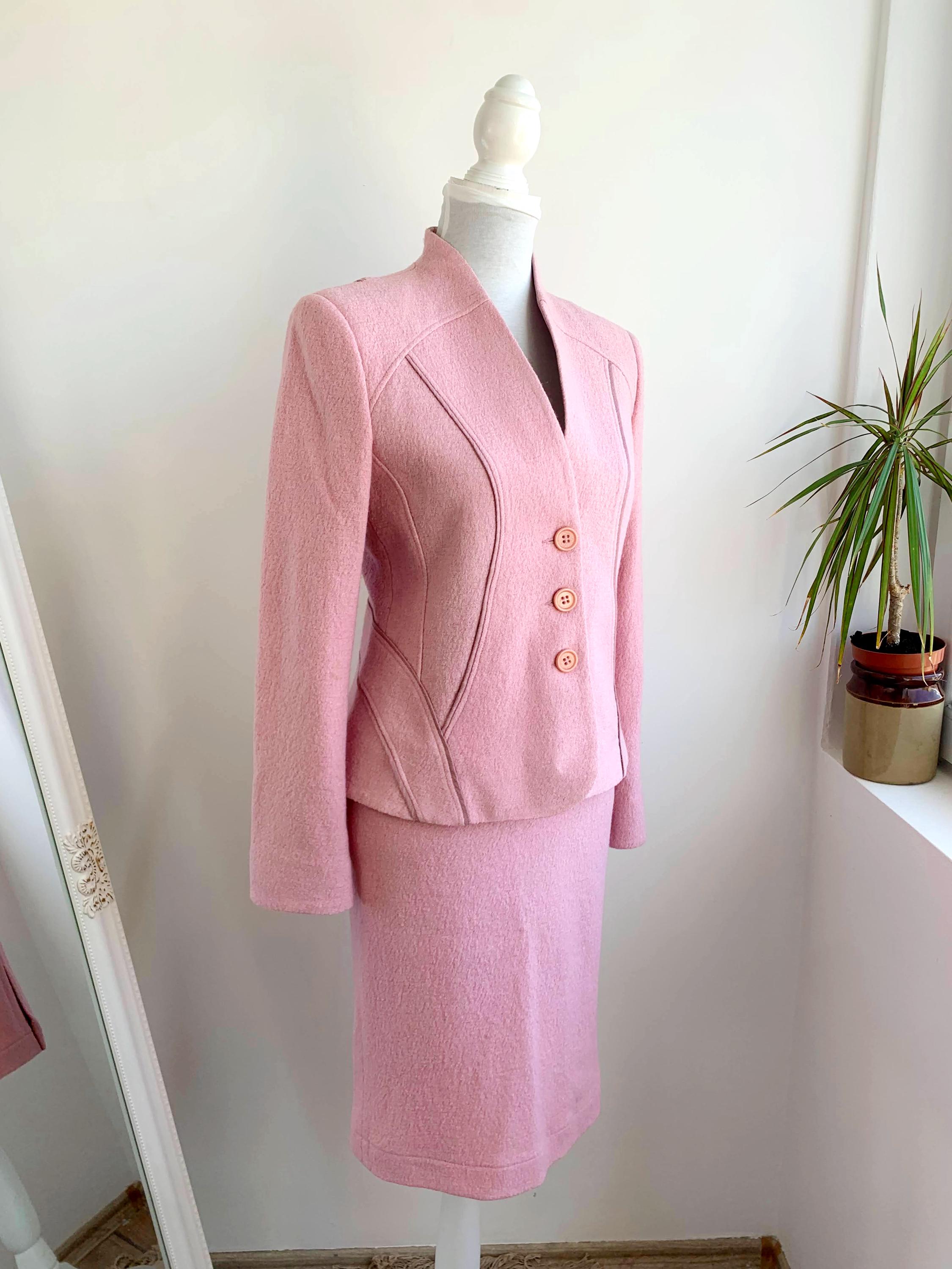 This is a wonderful Y2K blazer and skirt matching 2 piece set with pencil midi skirt and a blazer jacket in pink color made of soft tweed wool blend fabric. This women suit set fits like size S. Please check the measurements below.