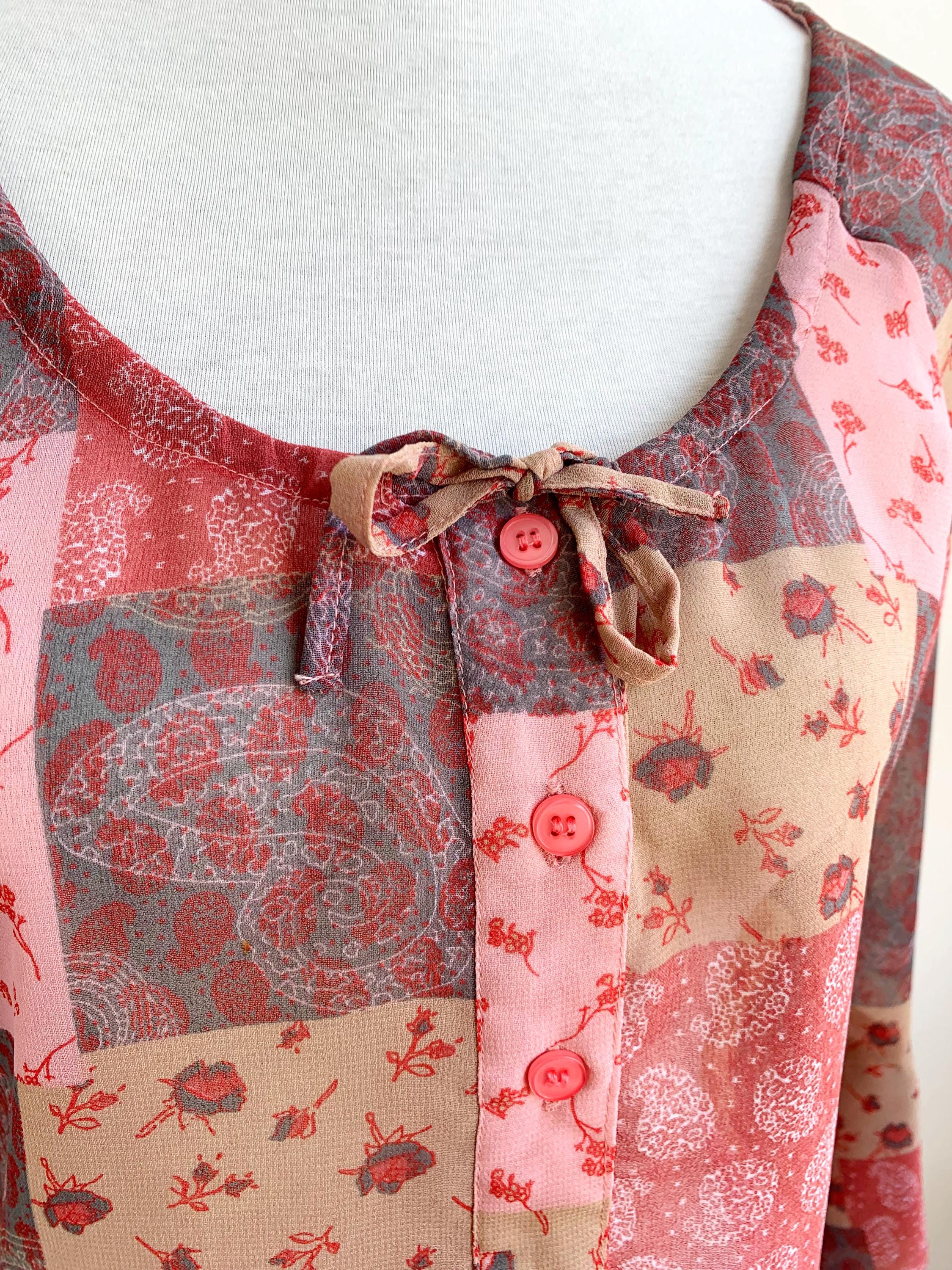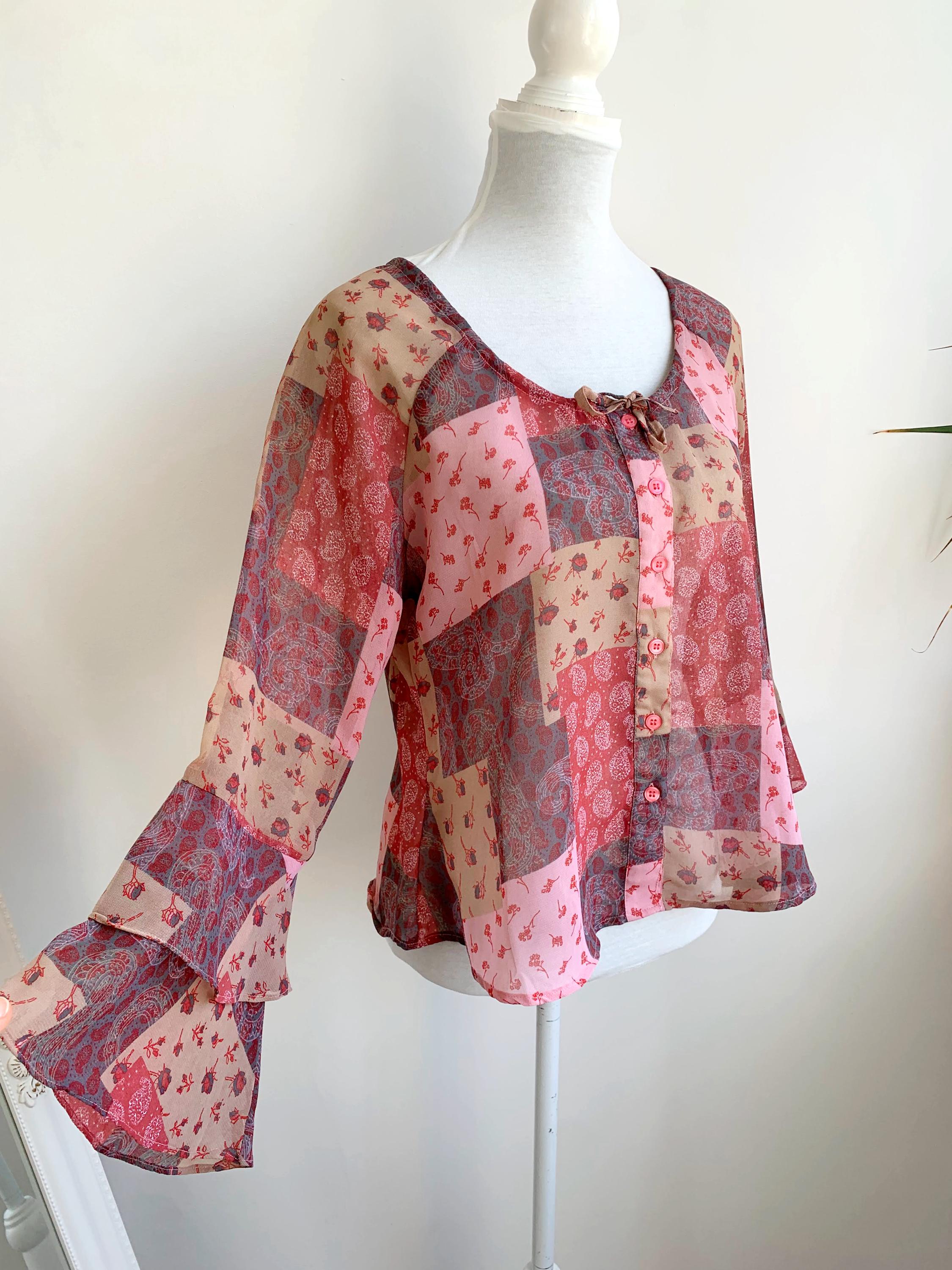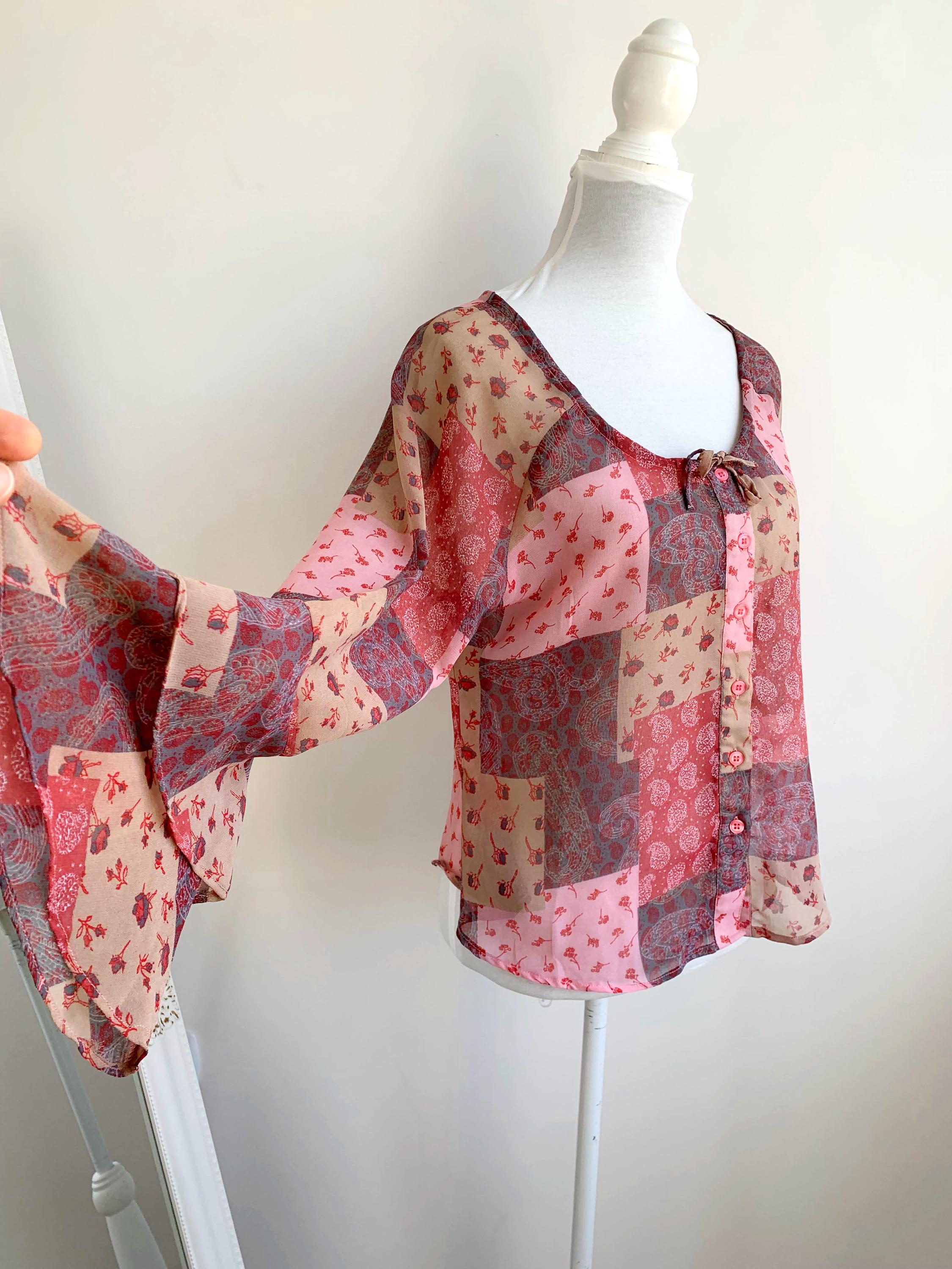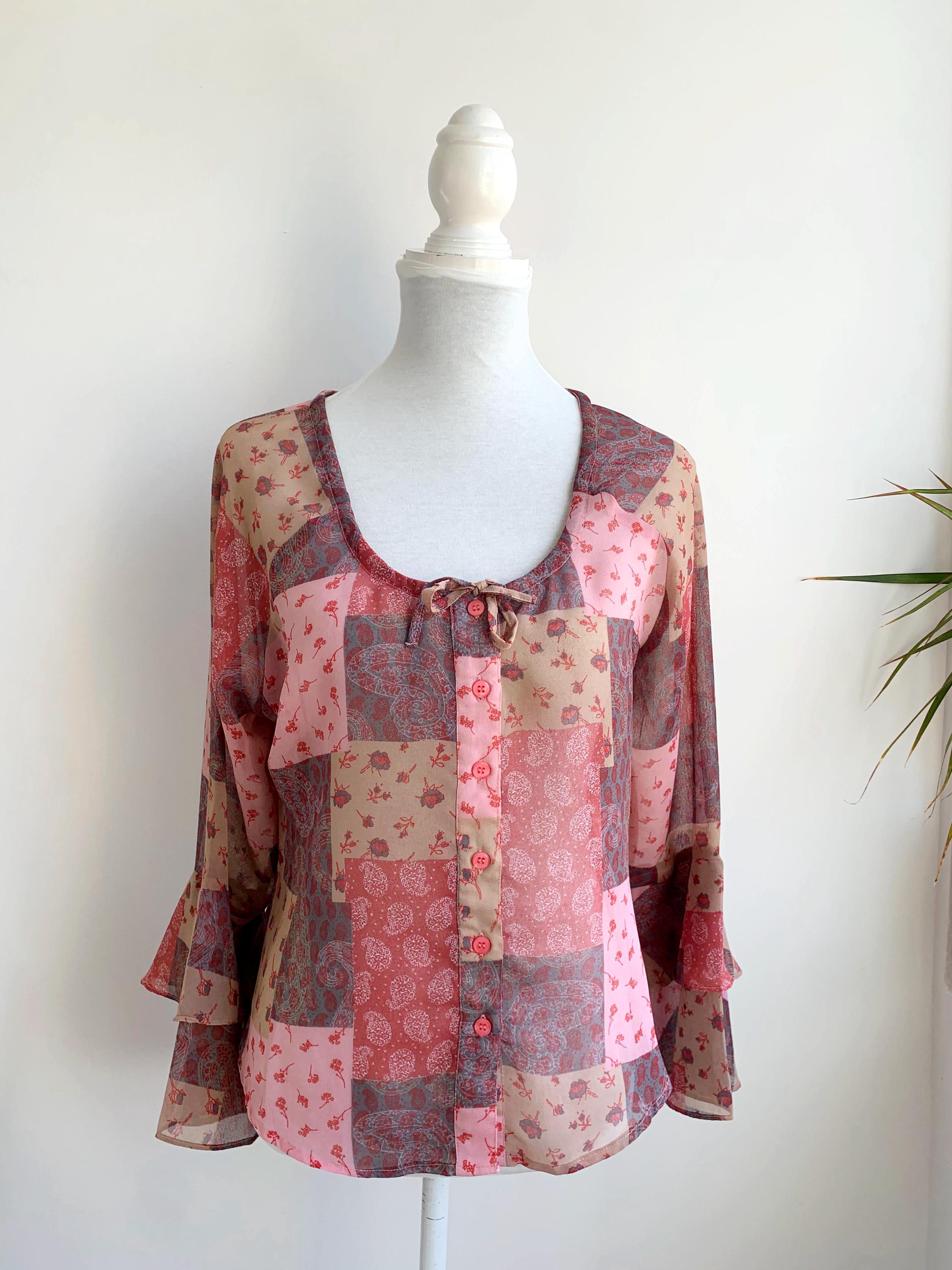 This is a lovely vintage 90s Y2K pink grey camel beige sheer top for women with paisley floral print. It is made of lightweight transparent 100% polyester fabric. This mesh top can be worn as a beach cover up or as a stylish shirt with a cami underneath. This see through top has bell flare sleeves. This patchwork print mesh top fits like size L. Please check the measurements below.