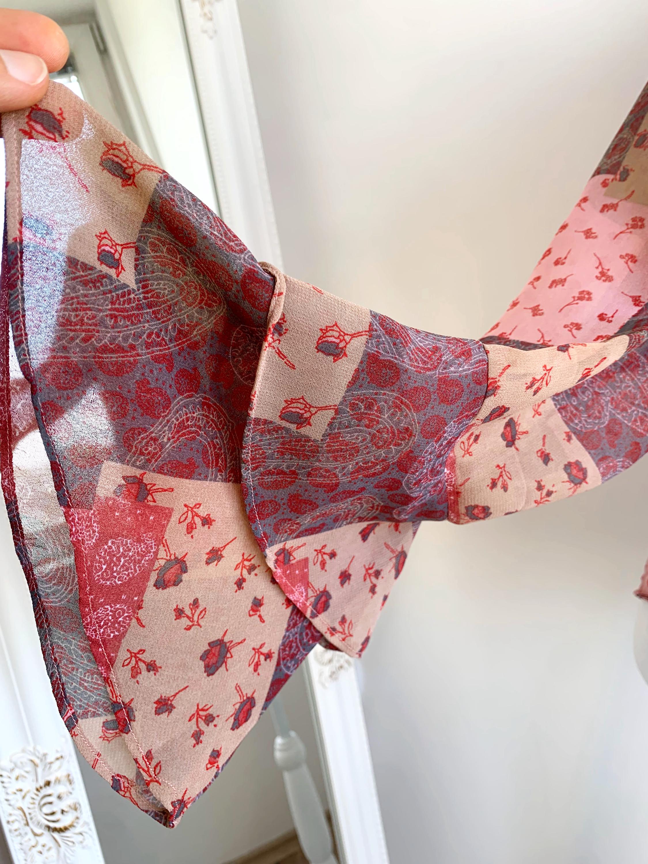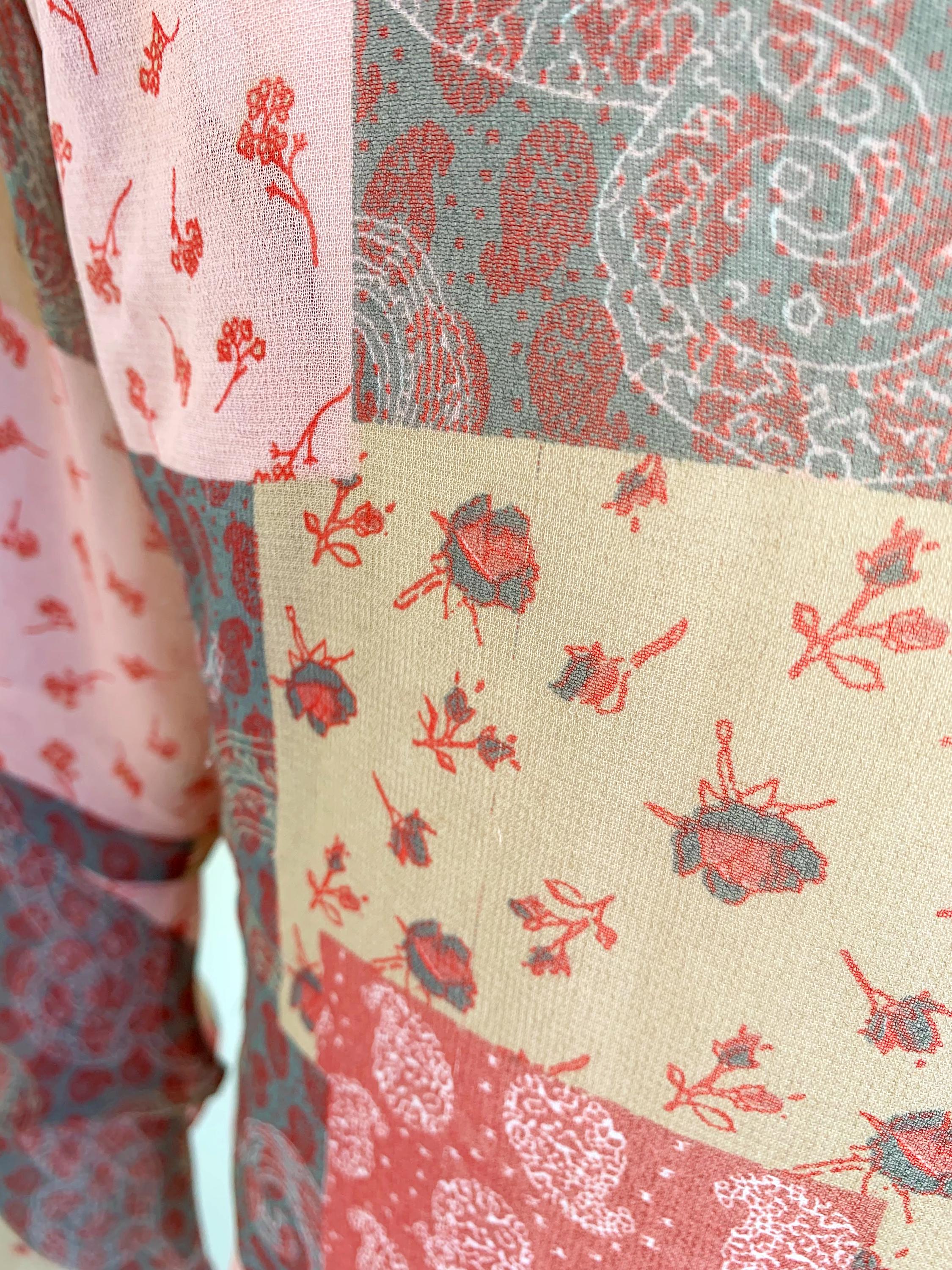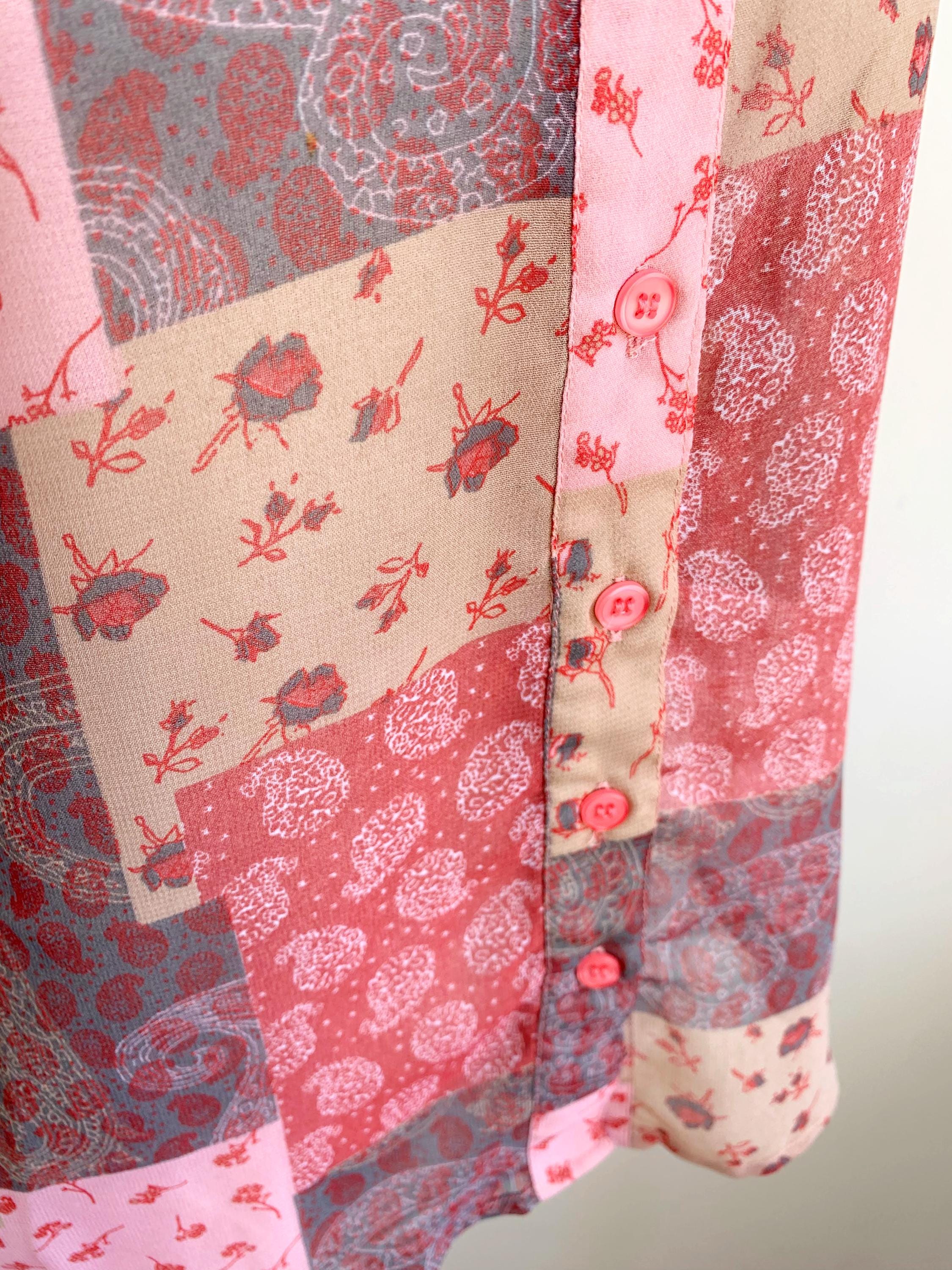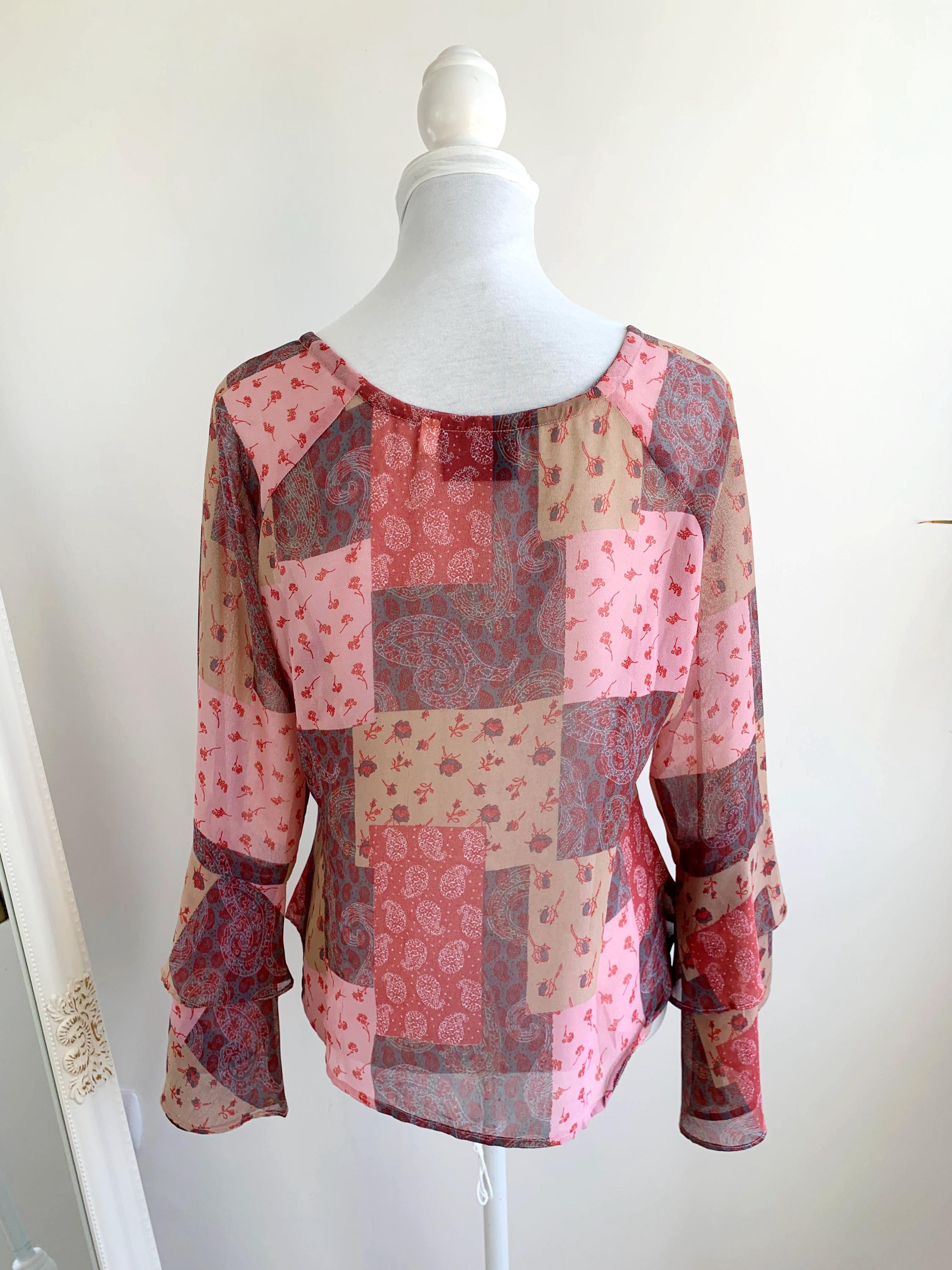 This is a lovely vintage 90s Y2K pink grey camel beige sheer top for women with paisley floral print. It is made of lightweight transparent 100% polyester fabric. This mesh top can be worn as a beach cover up or as a stylish shirt with a cami underneath. This see through top has bell flare sleeves. This patchwork print mesh top fits like size L. Please check the measurements below.