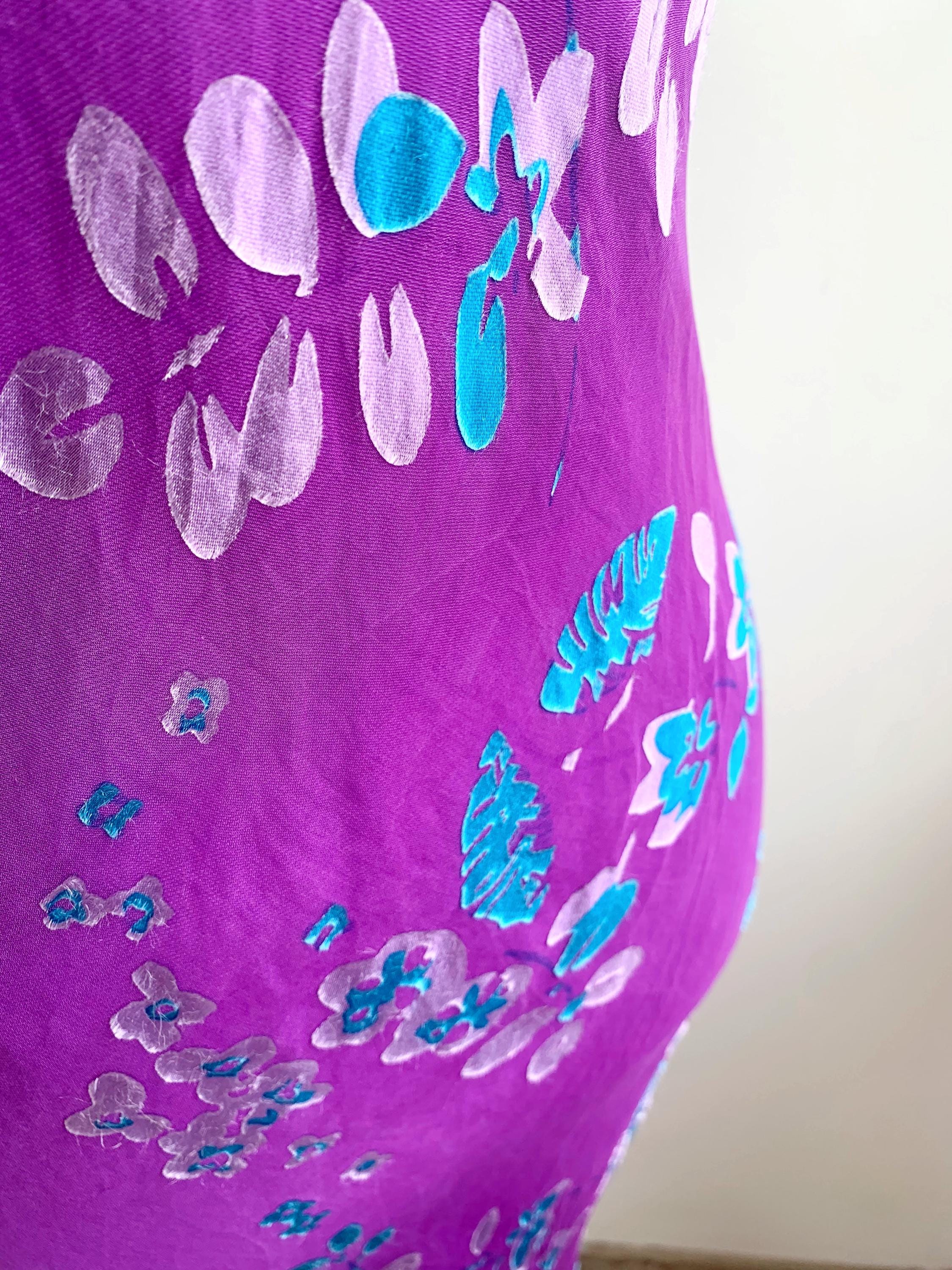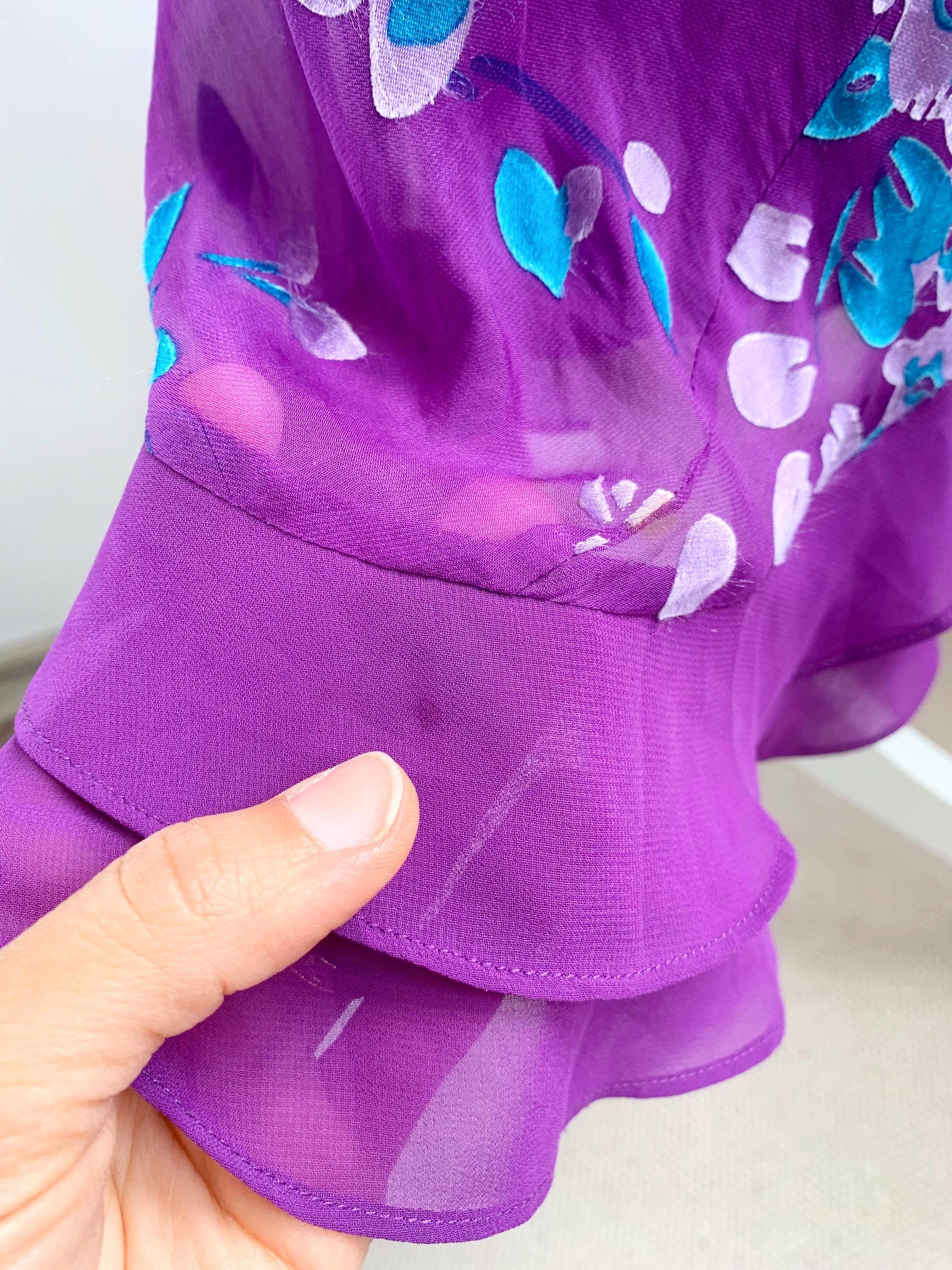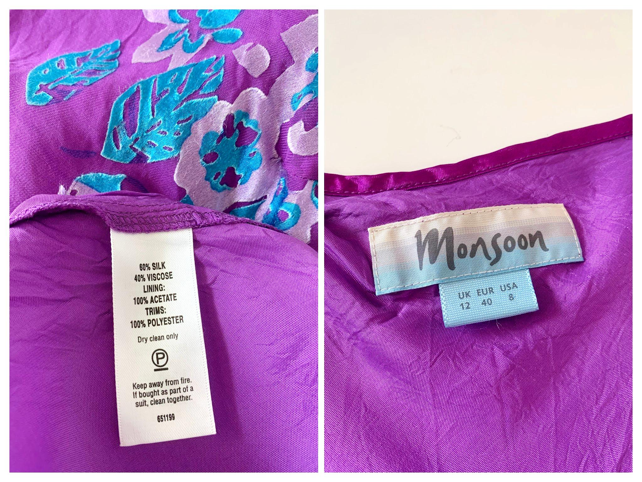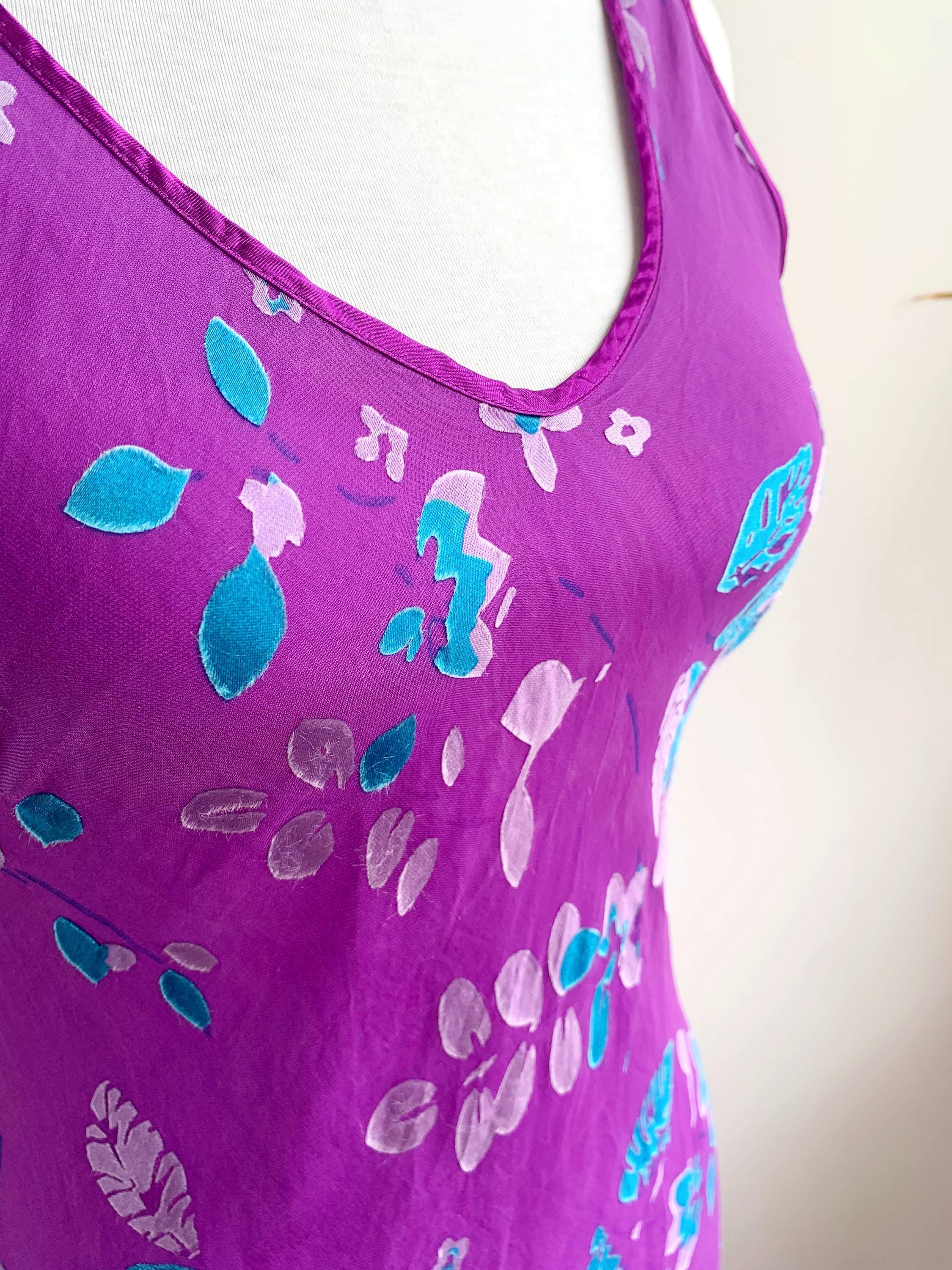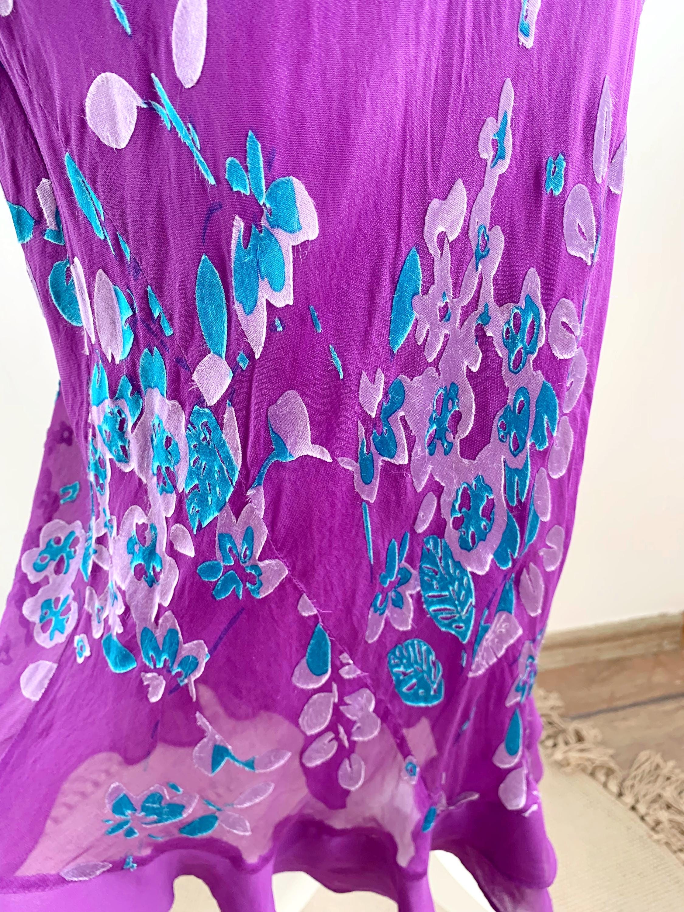 This is a beautiful vintage Monsoon bias cut purple silk blend maxi dress made of 60% silk and 40% viscose with acetate lining. This long silk dress has lovely slim fit silhouette with v neckline which follows your curves and shows off your figure. This silk slip dress has gorgeous cyan blue and lilac floral print. This long silk dress falls the the ankles and has a slight flare at the bottom. The size marked is UK 12/ EUR 40 / US 8, it fits like size S/M. Please check the measurements below.