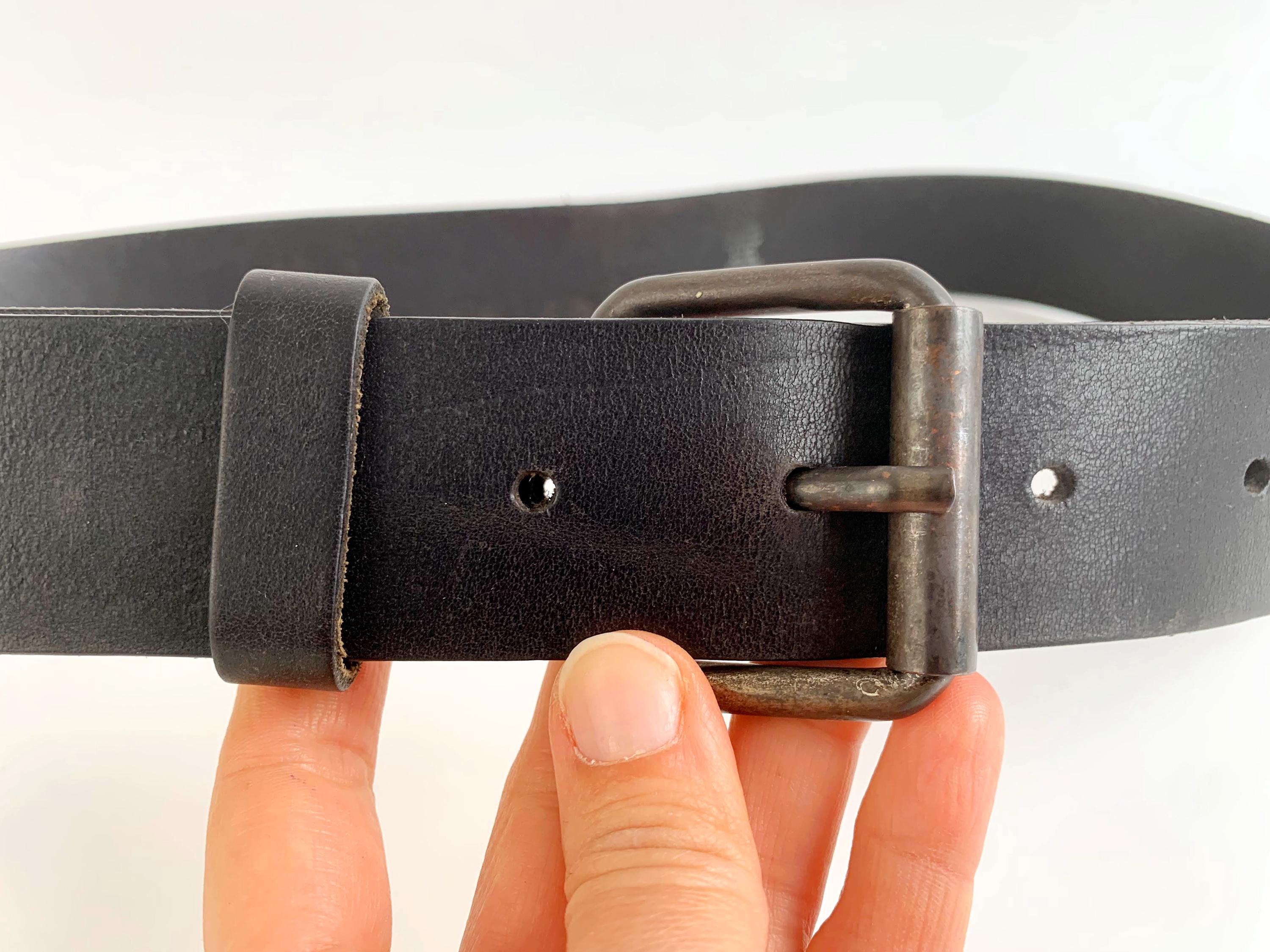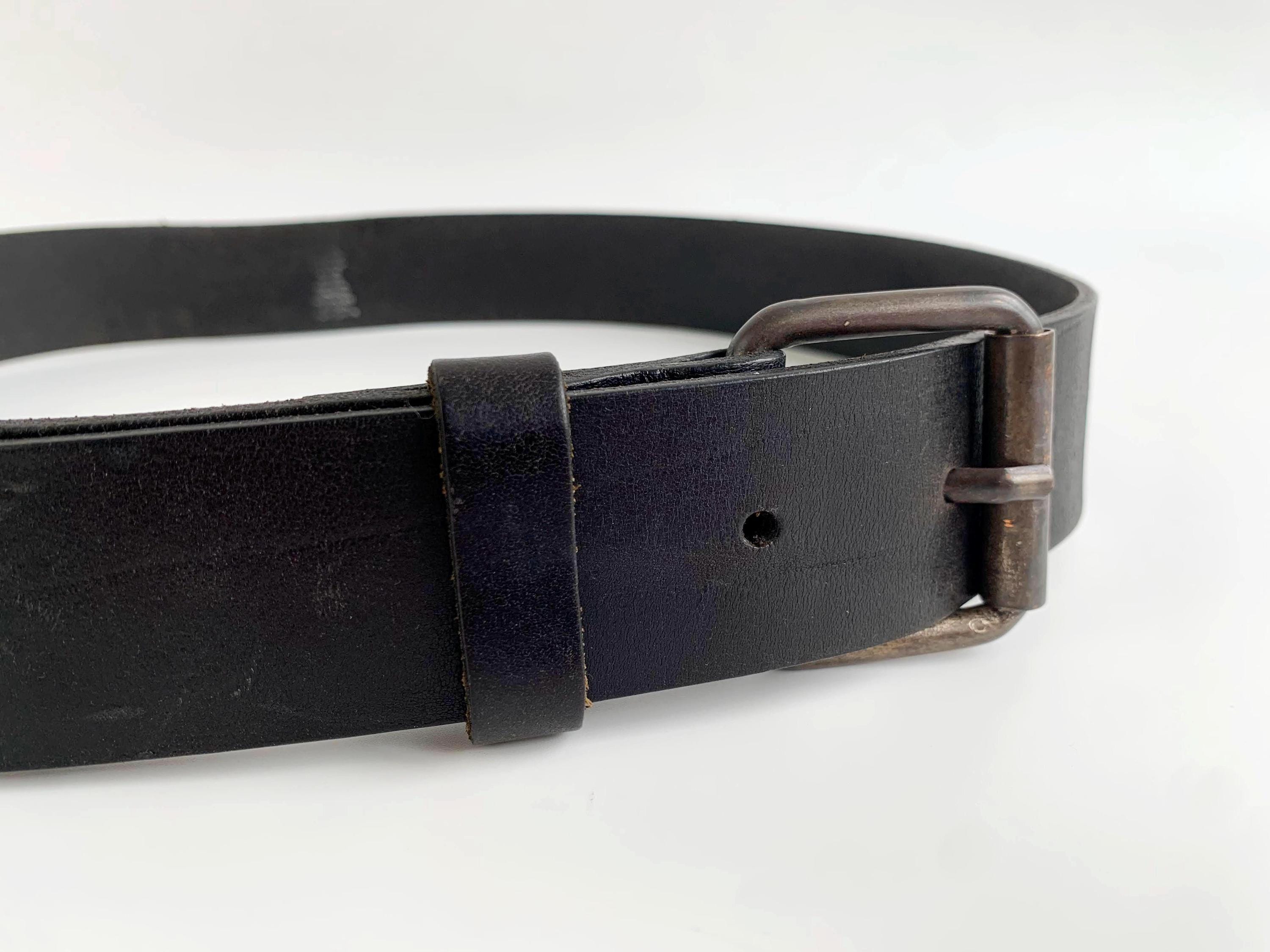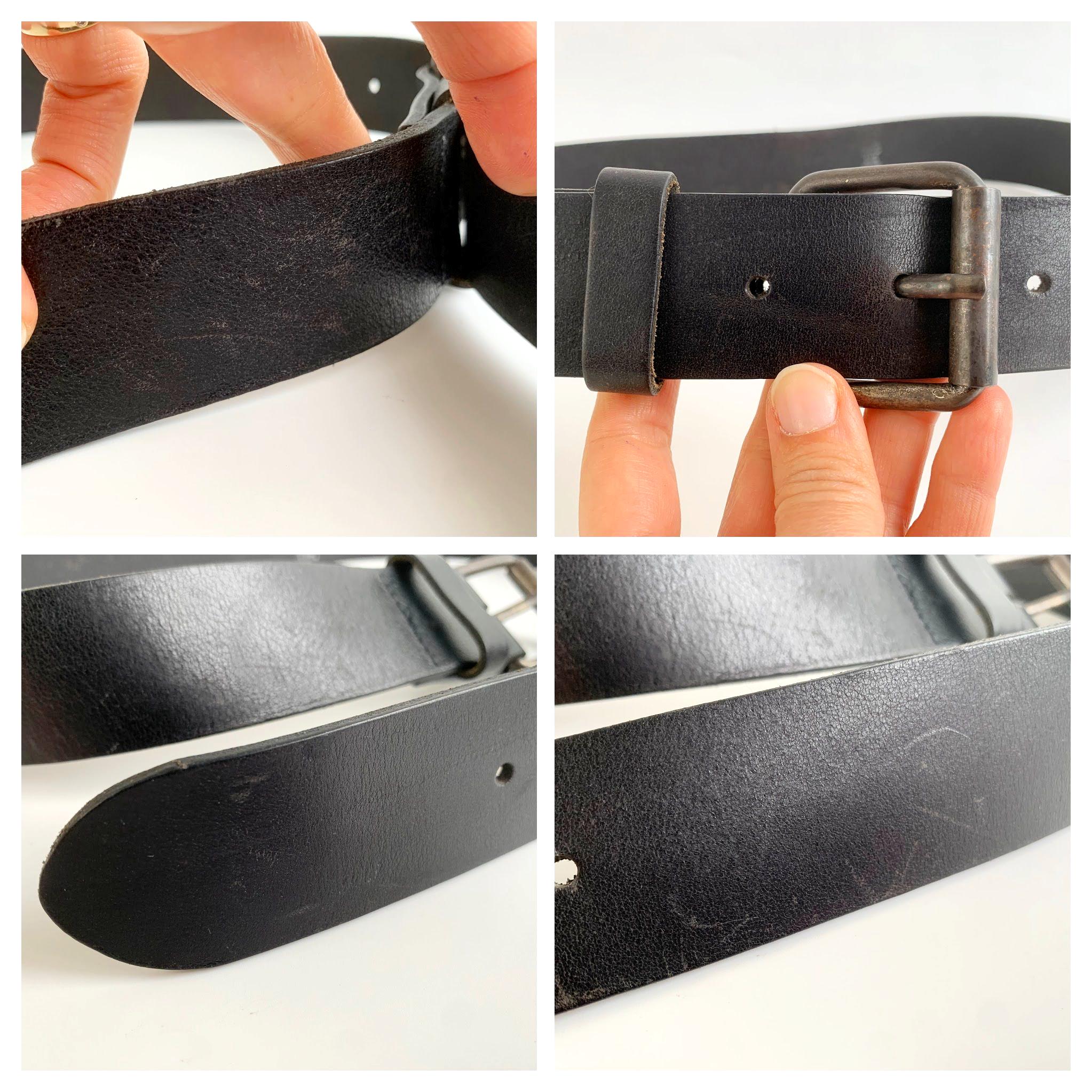 Condition: This simple leather belt has a distressed look, it shows some marks and scratches on the leather surface and on the buckle camptured in the close up photos