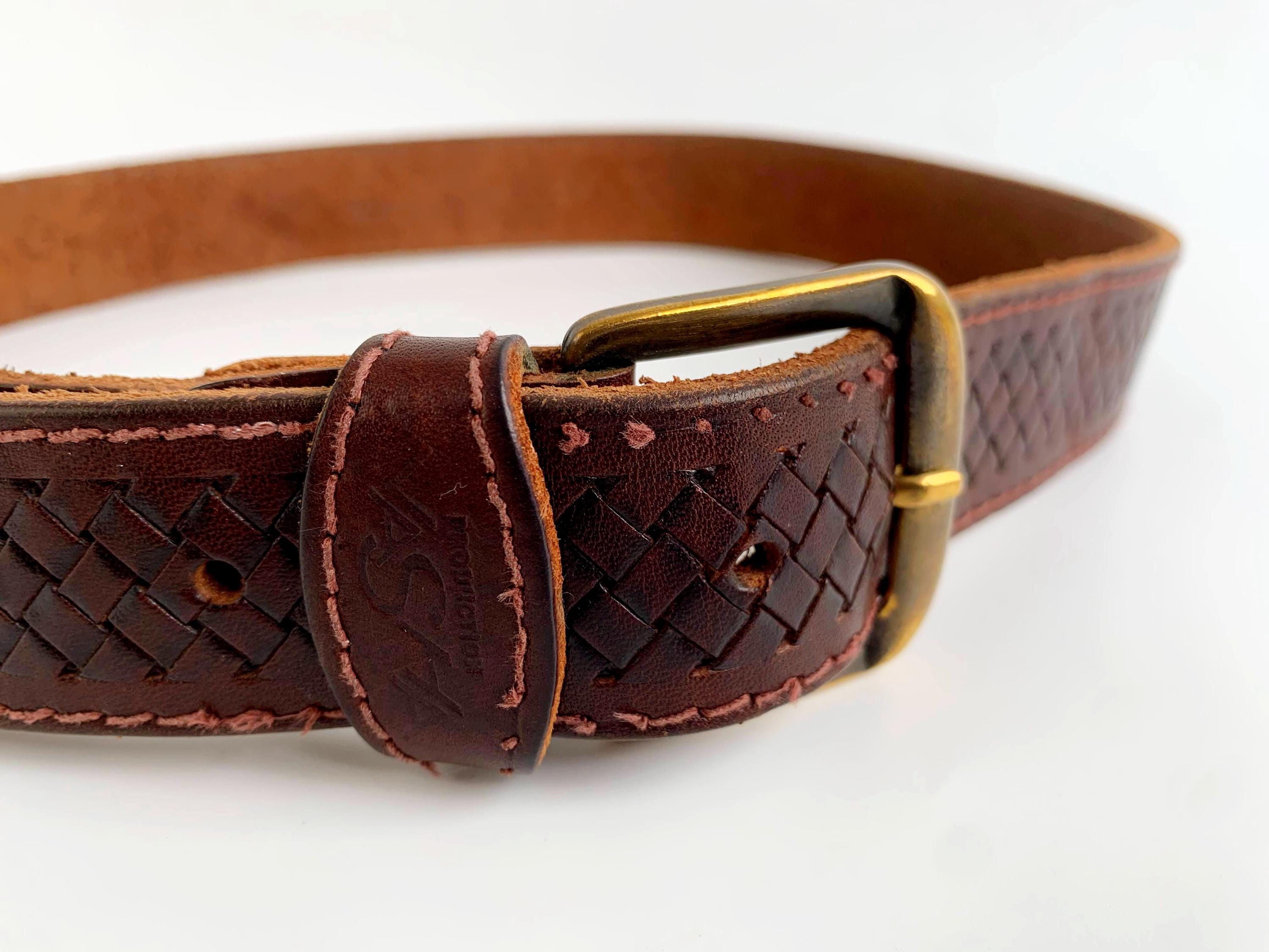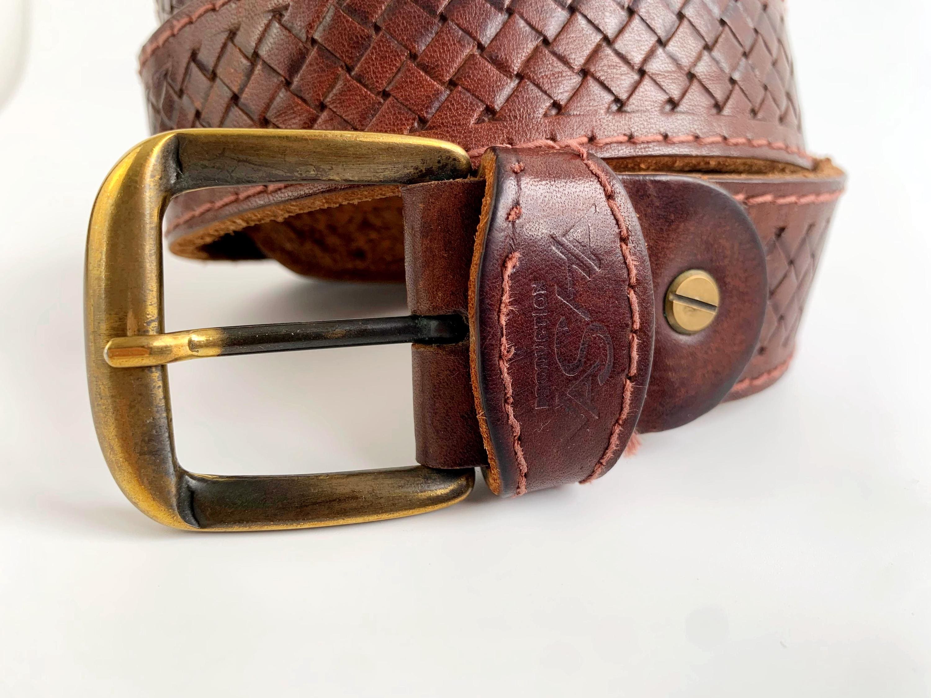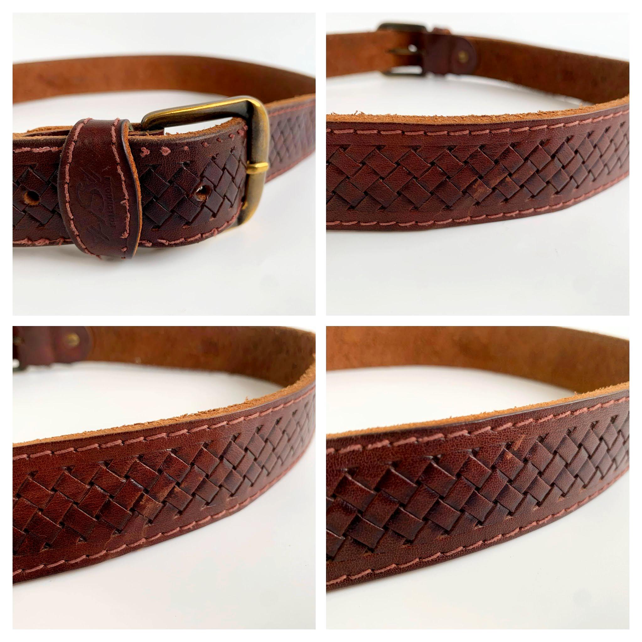 Condition: The leather of this brown waist belt has a distressed look with scratches and marks on the leather surface and some loose stitches, shown in the close up photos.