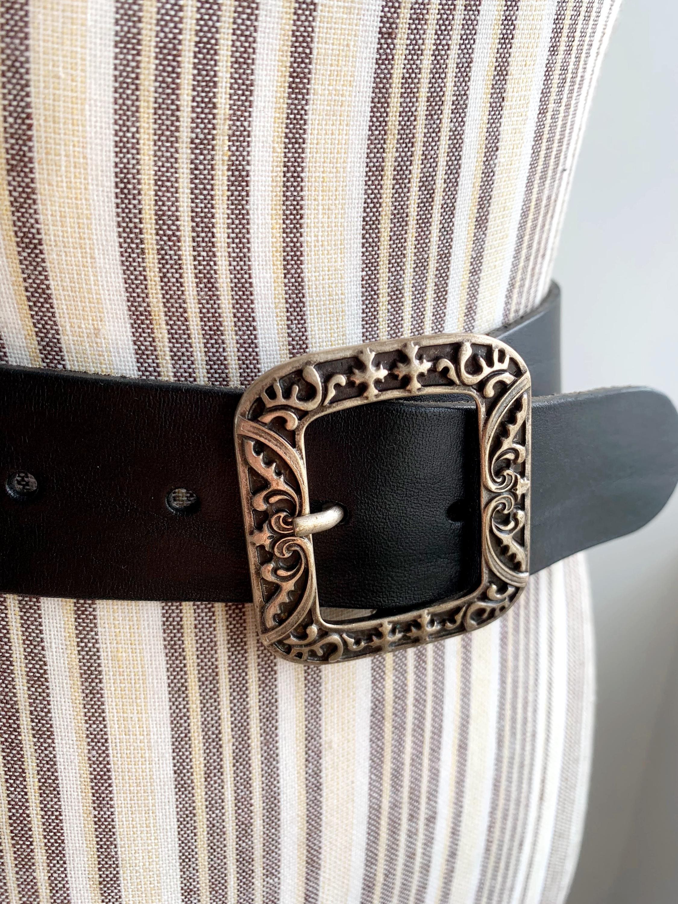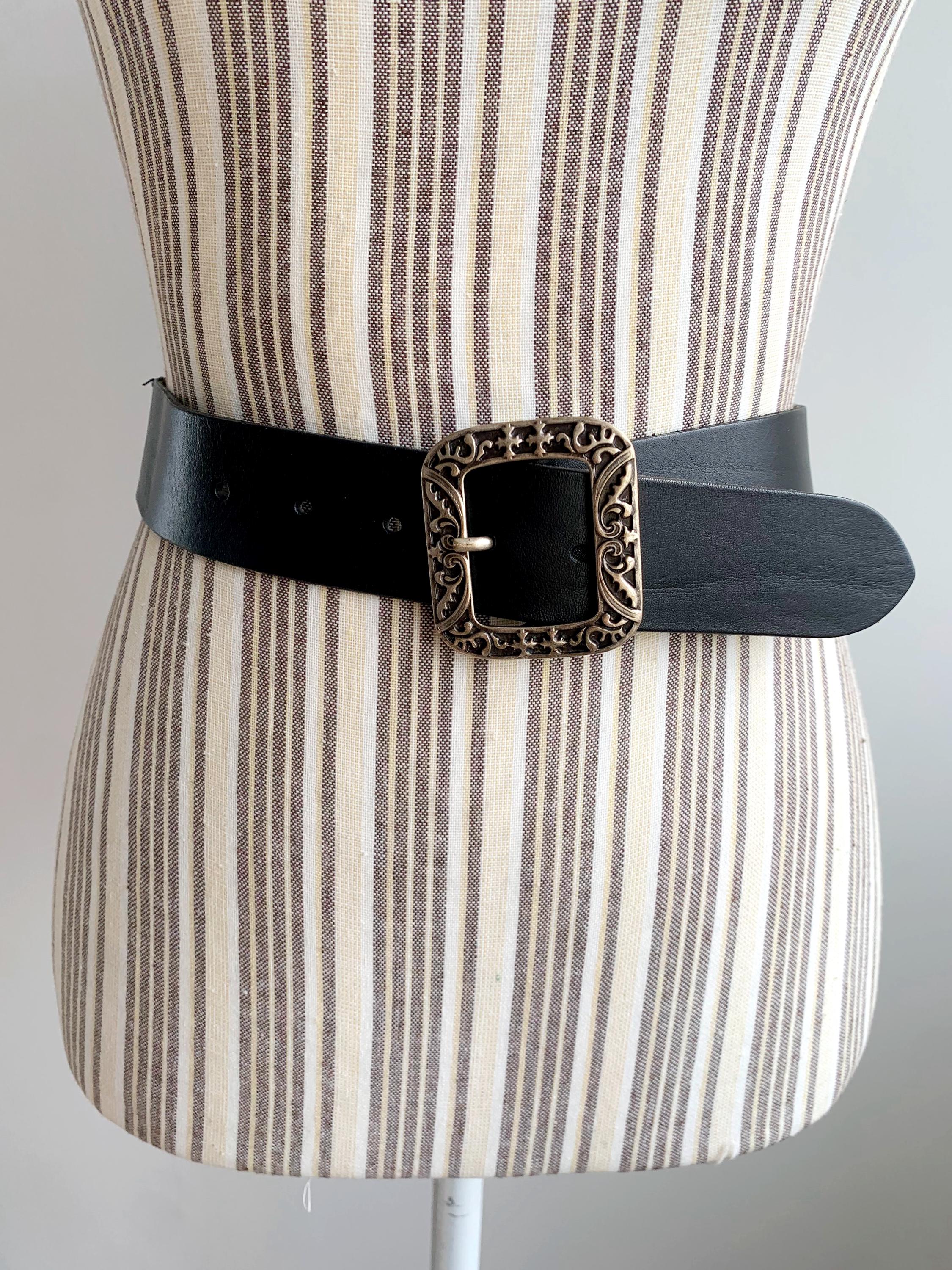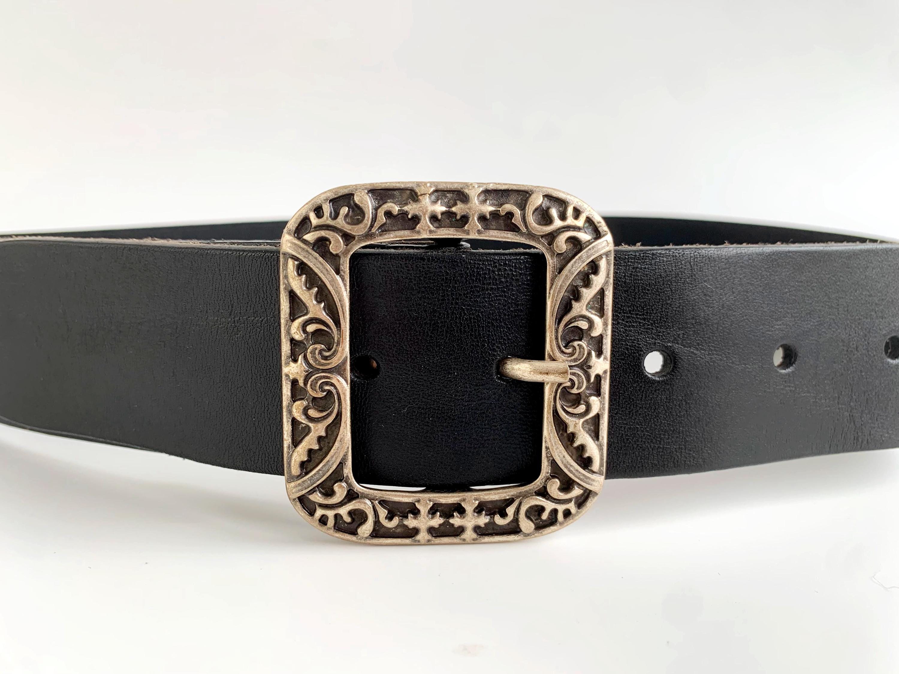 This is a vintage 90s beautiful black leather belt with silver tone engraved buckle and elastic back. This slim waist belt is made of real leather, silver tone buckle and elasticated back part.