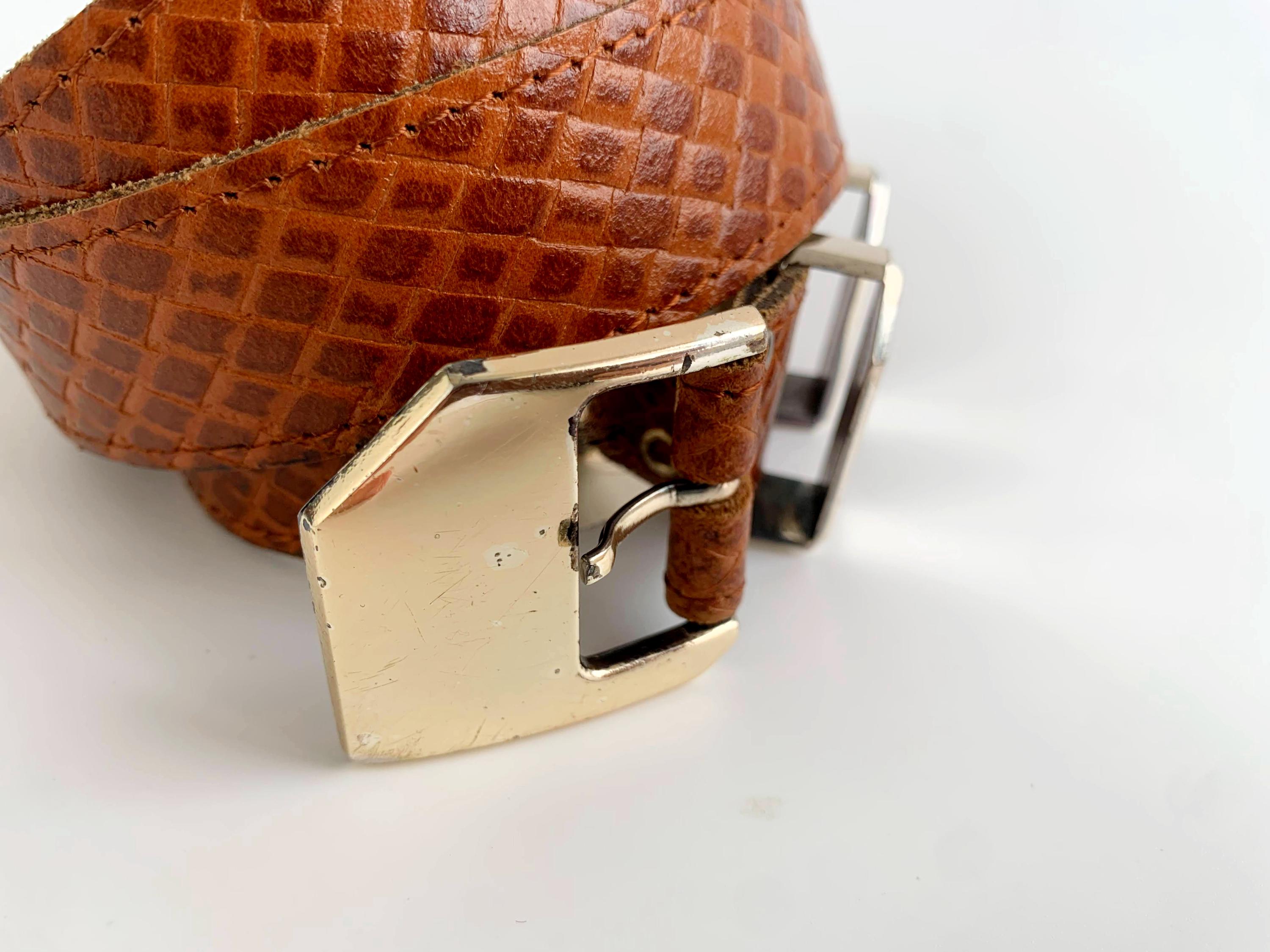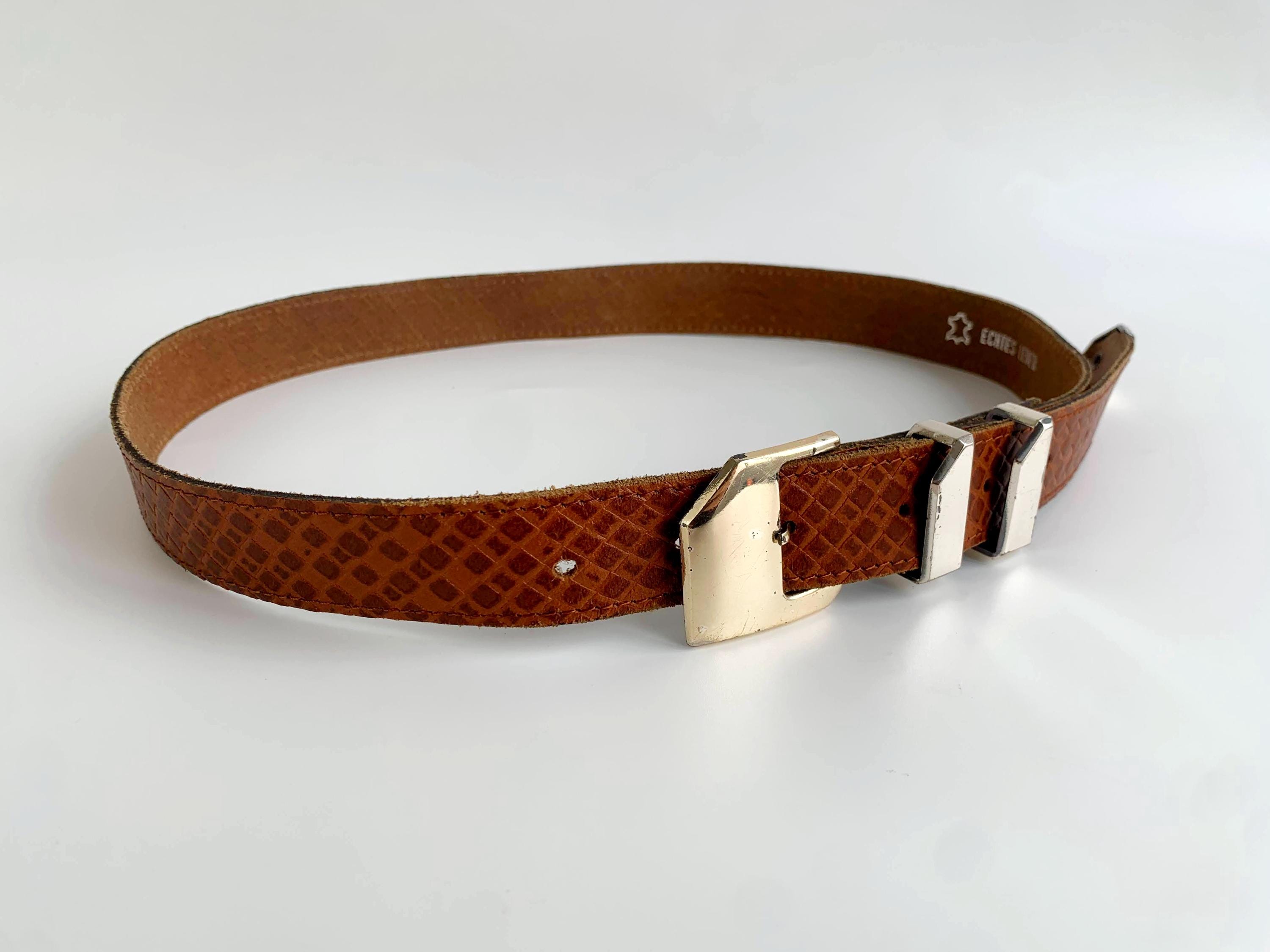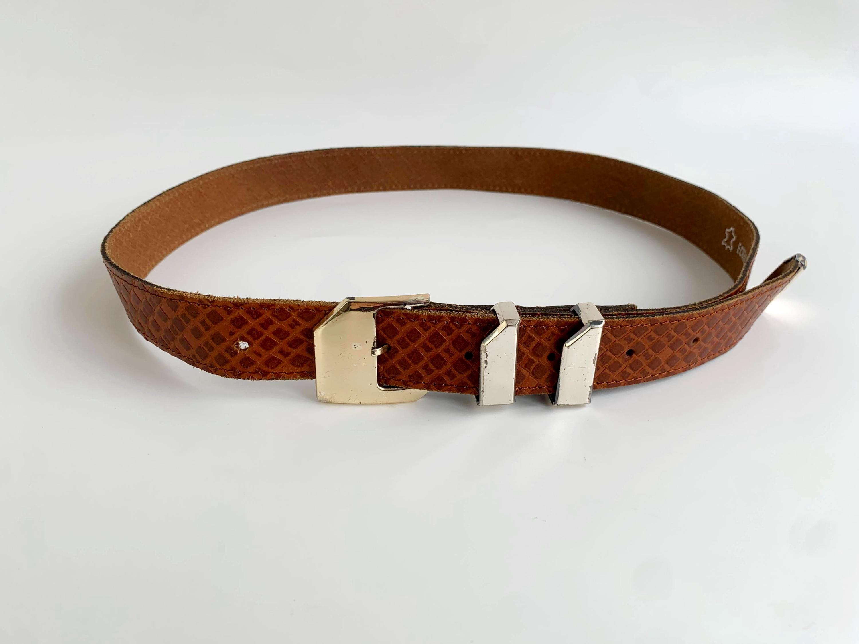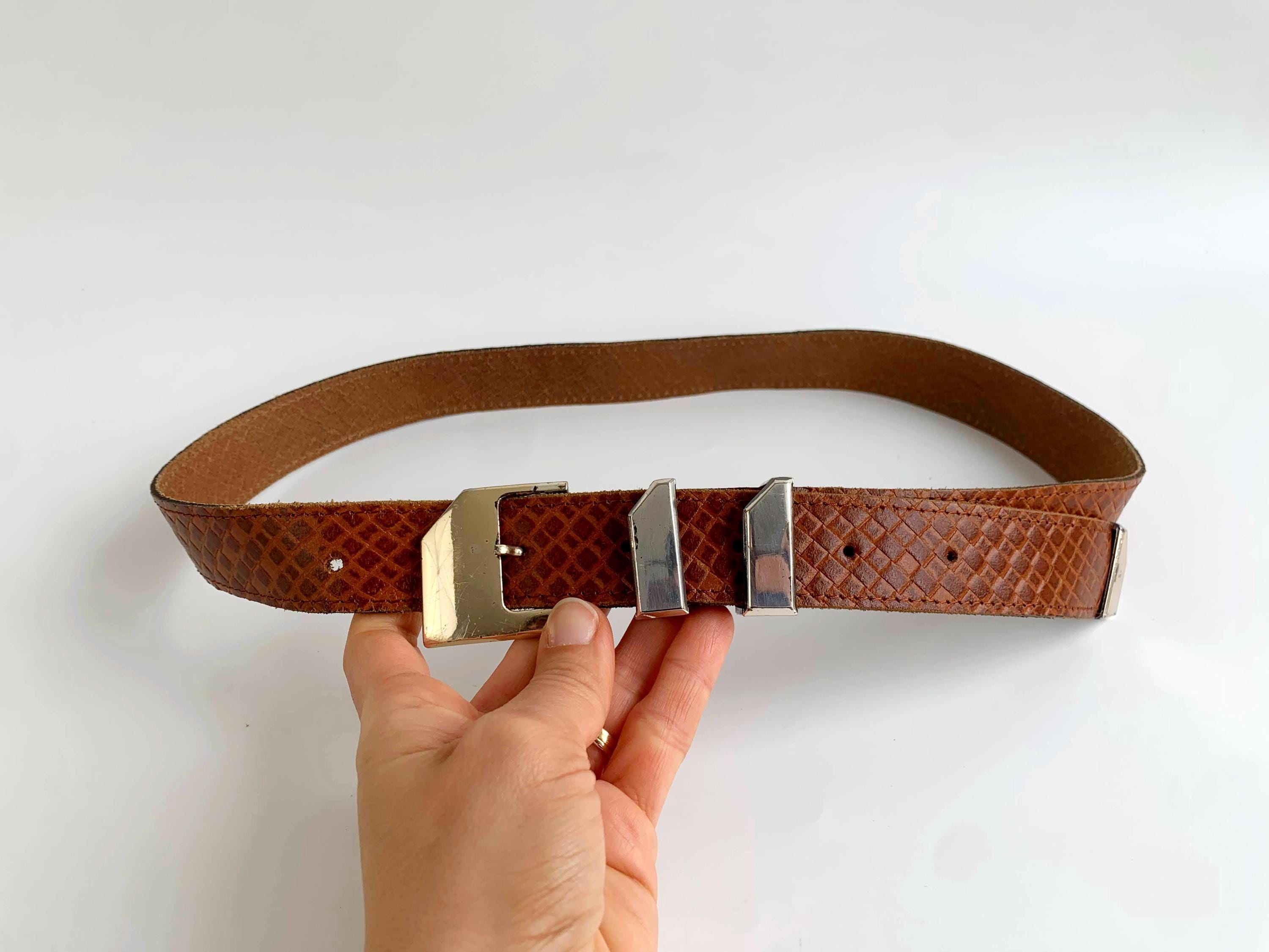 This is a vintage women's brown leather belt form the 80s . This skinny leather belt has a gold tone buckle. It is beautifully carved with beautiful woven checkered print. This thin belt has a distressed look due to the wear. This slim waist belt is perfect to wear with dresses or turtlenecks. The size marked is 80 cm/ 31.5".