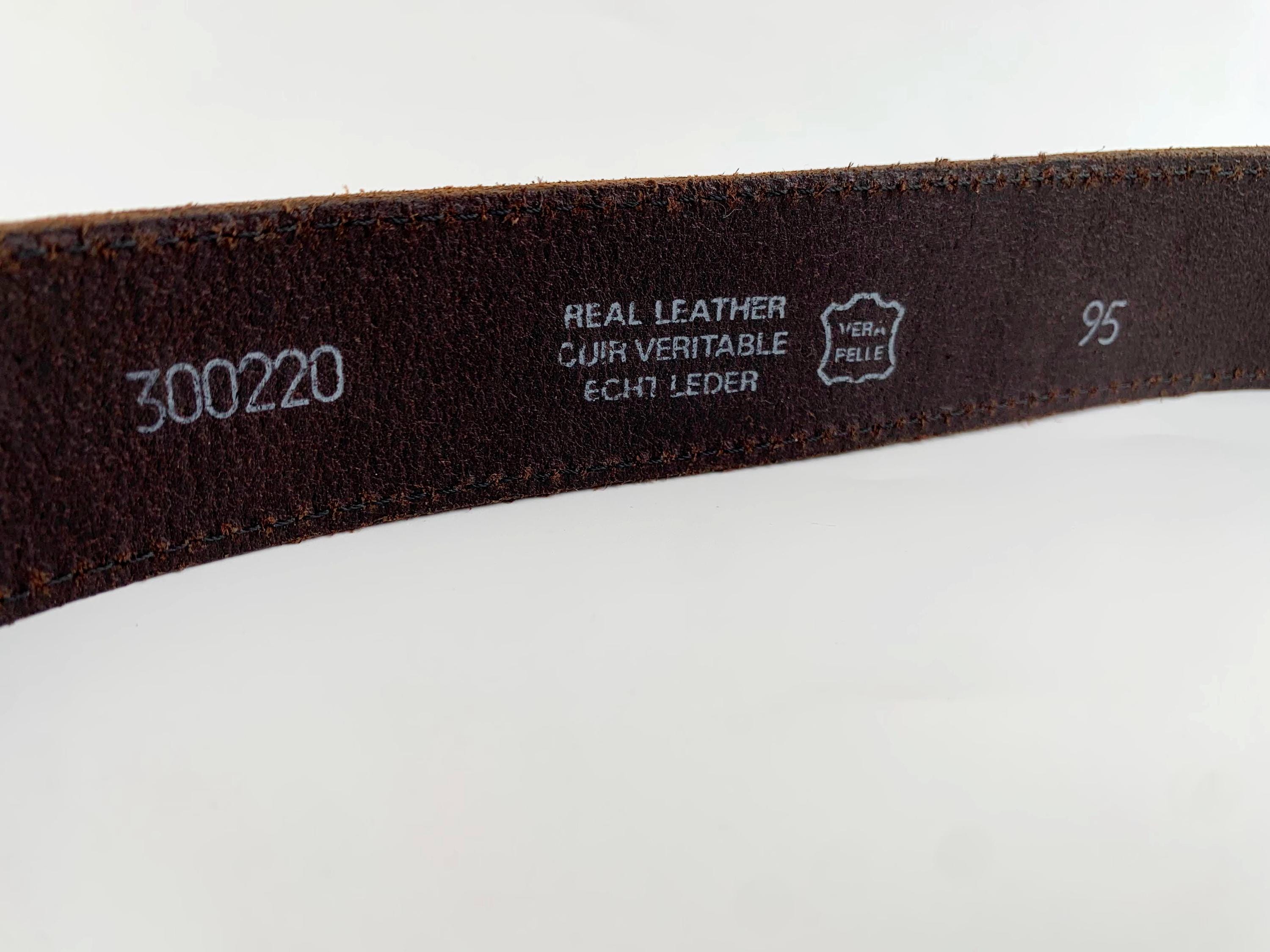 Condition: This asymmetrical leather belt has a distressed look due to the wear. The genuine leather shows some farind and some scratches on the leather surface and on the buckle