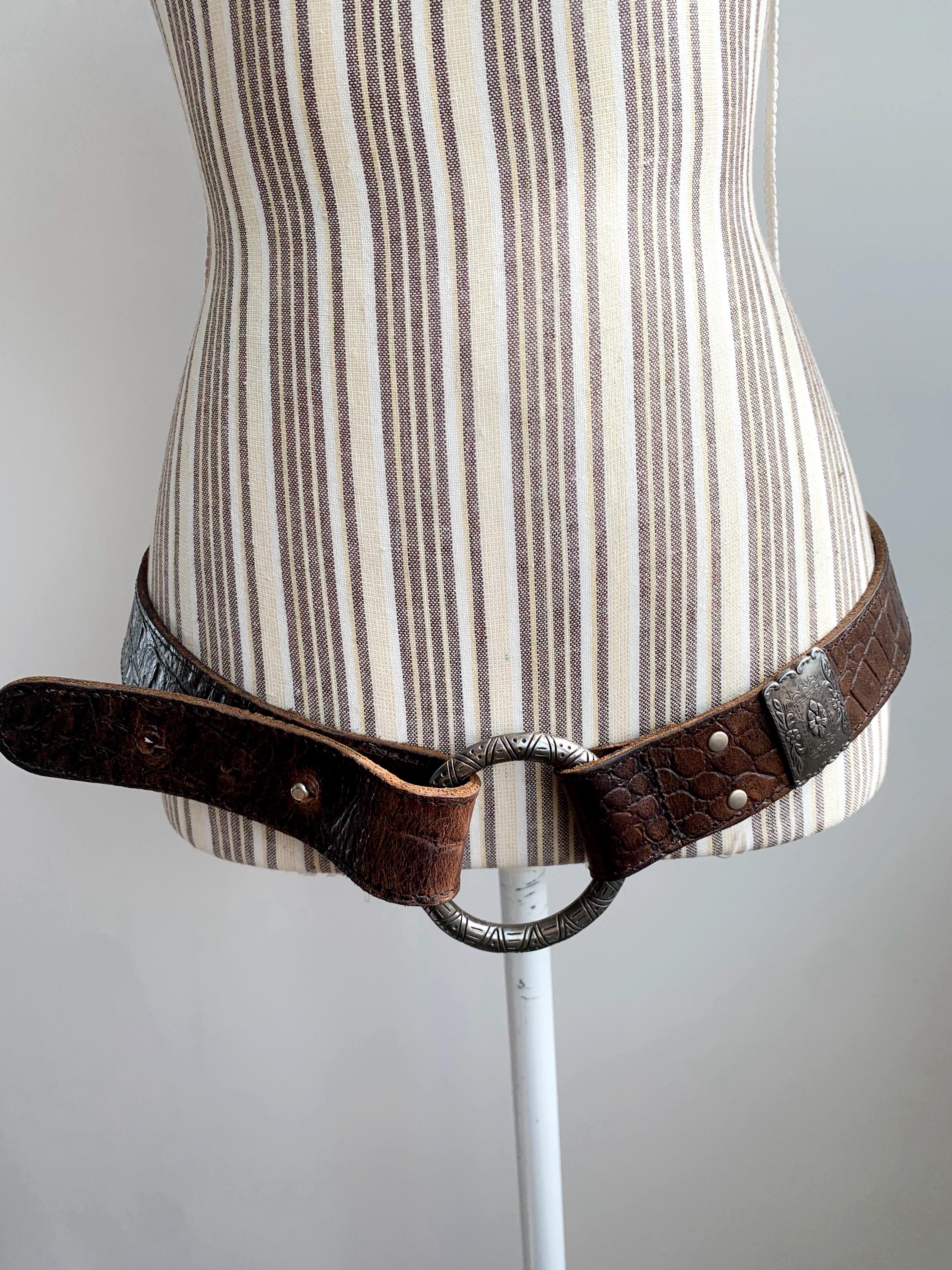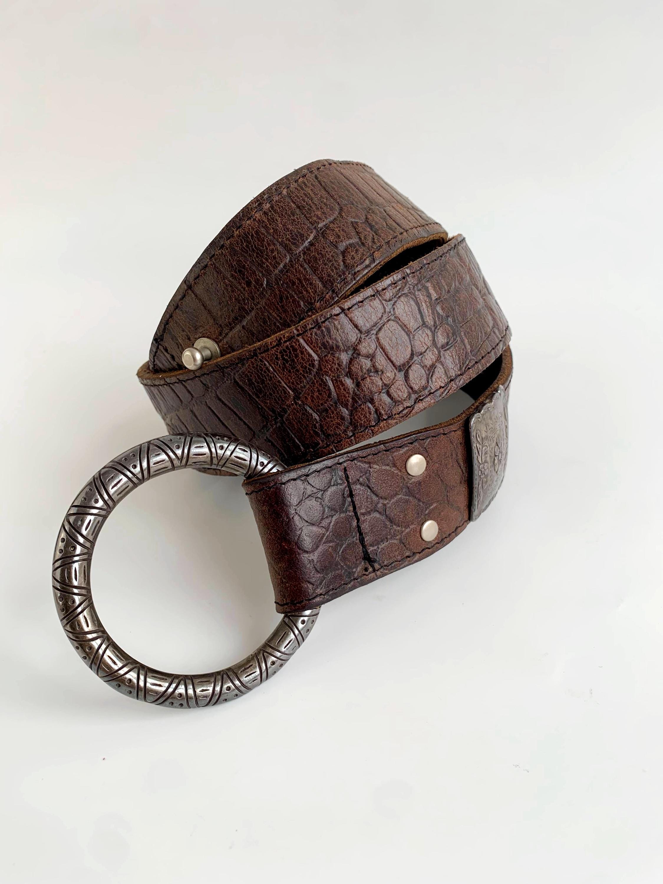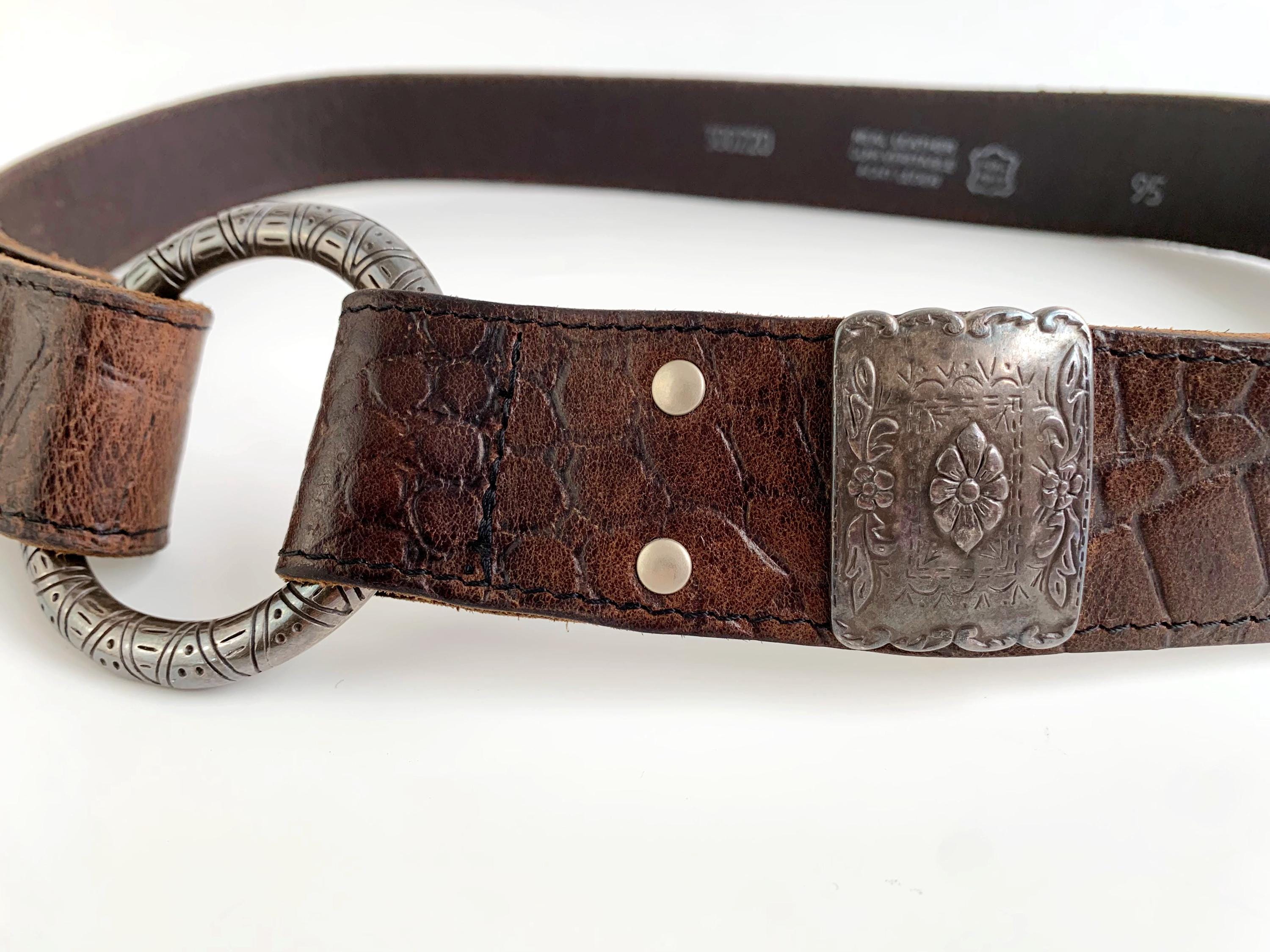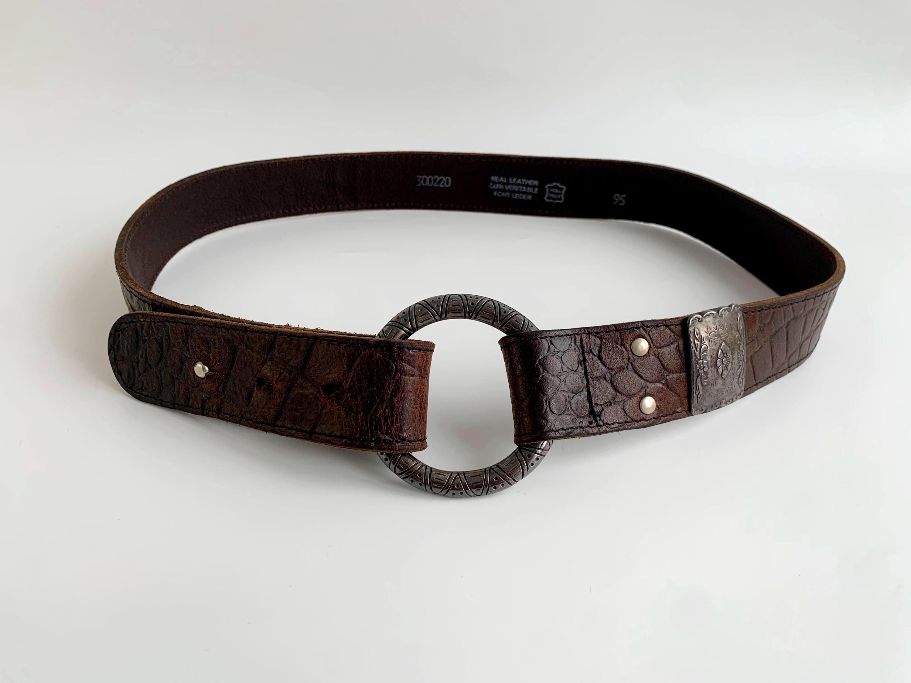 This is a beautiful wide leather belt which can be worn as a drop waist or hip belt. This brown leather belt is made of genuine leather which has crock embossed texture. This V-shaped belt has a silver tone round embossed buckle. This vintage asymmetrical belt will be the perfect statement to your outfit. The size marked on this textured leather belt is 95 cm / 37.4".