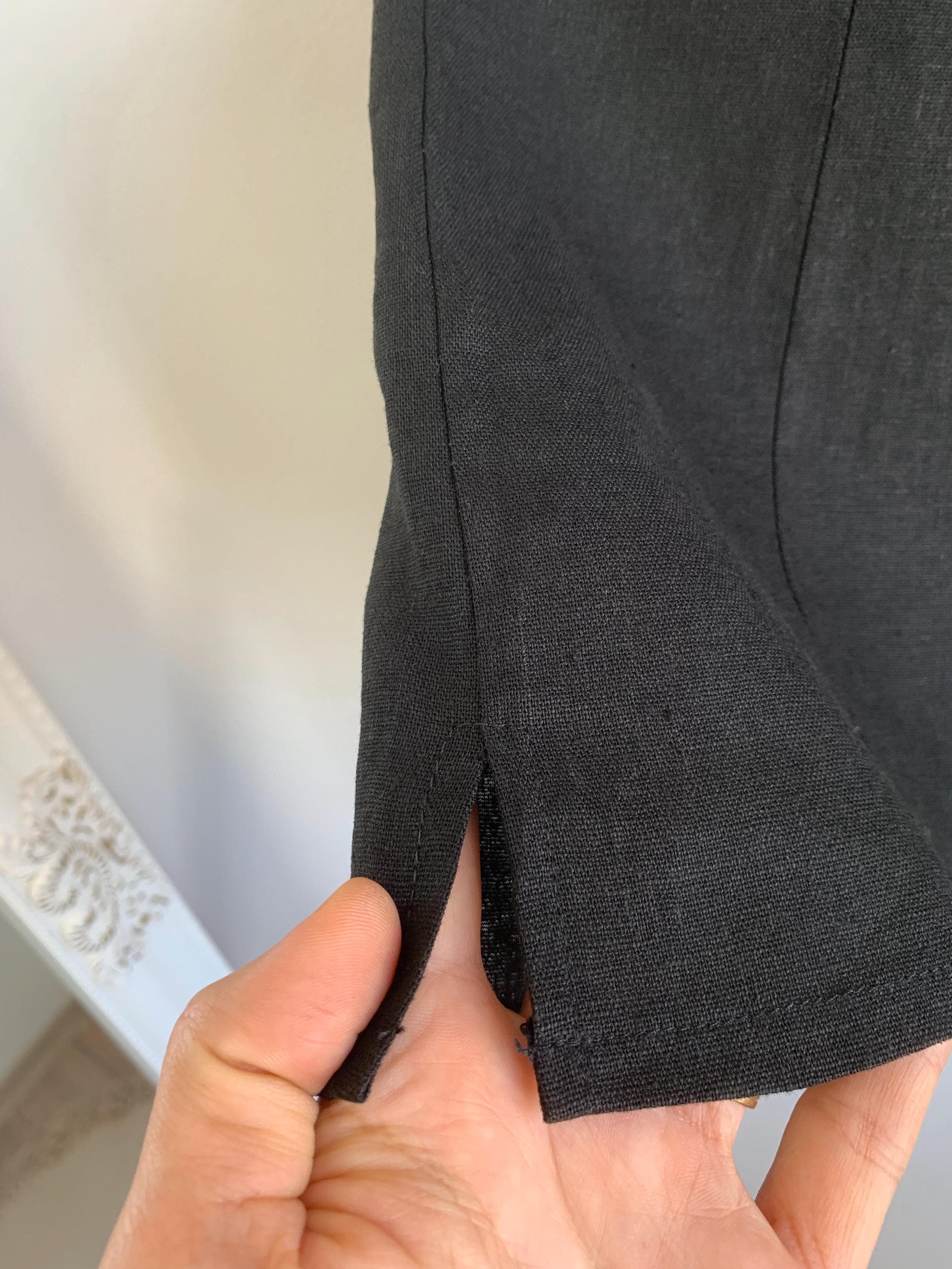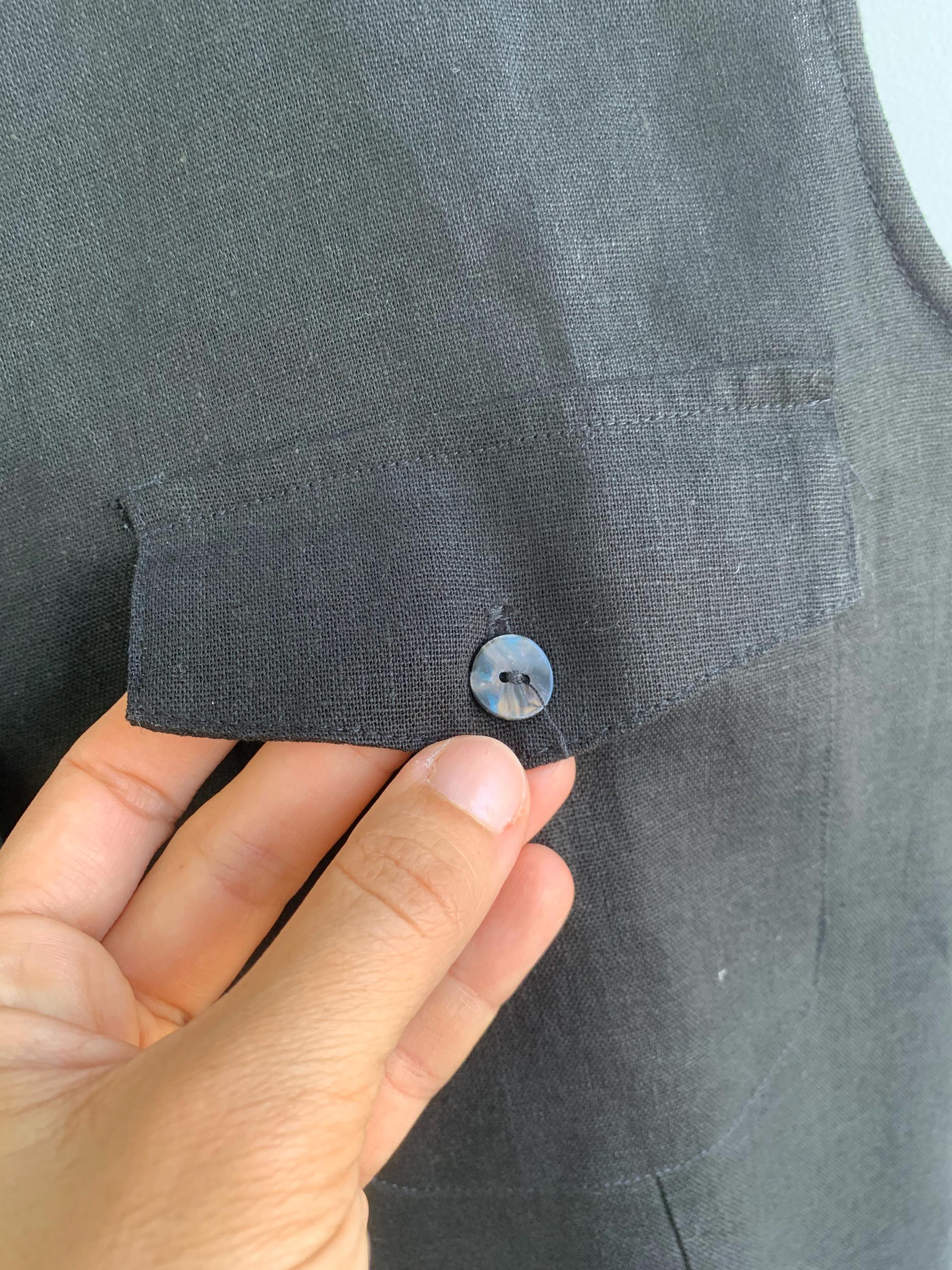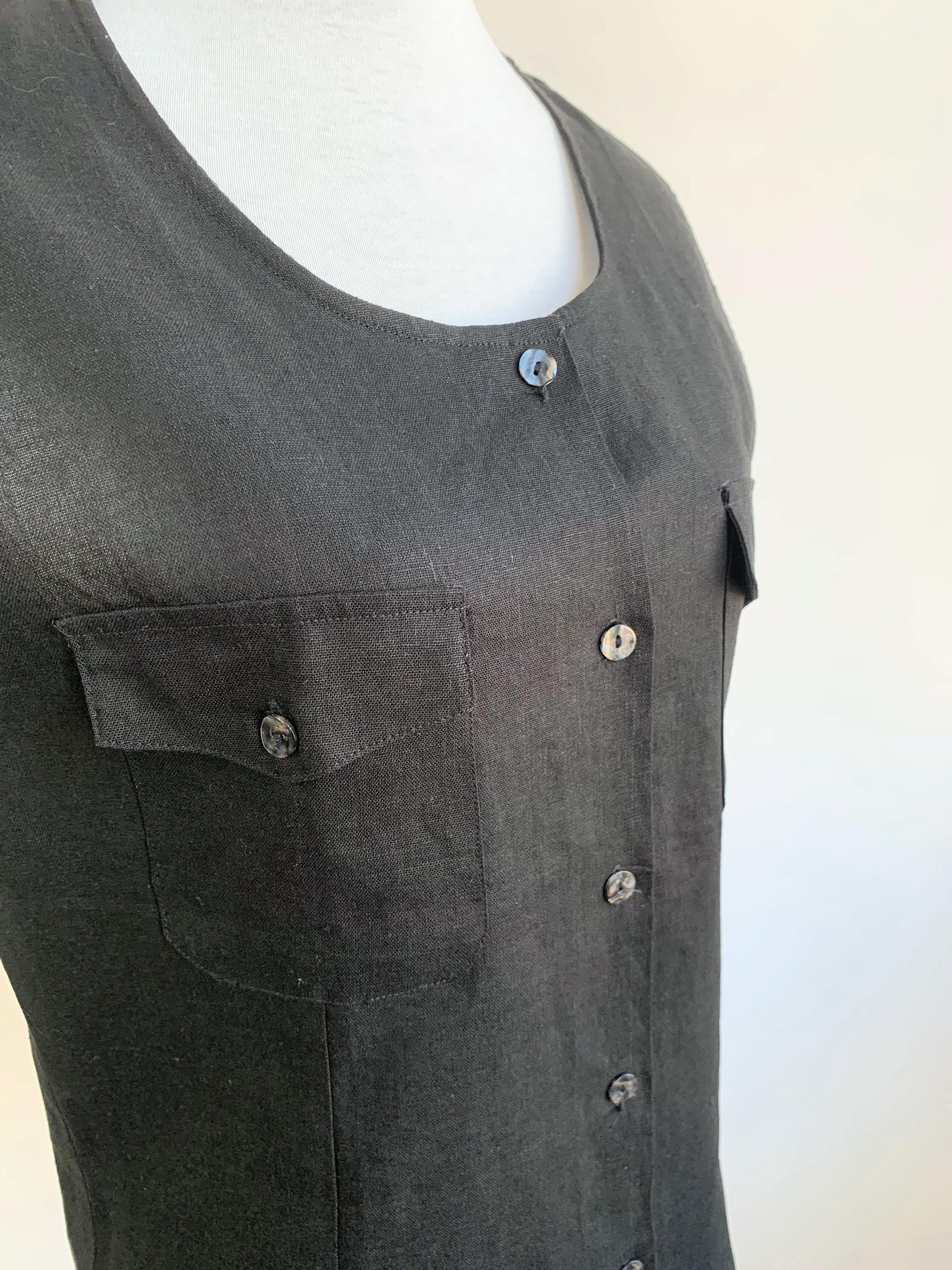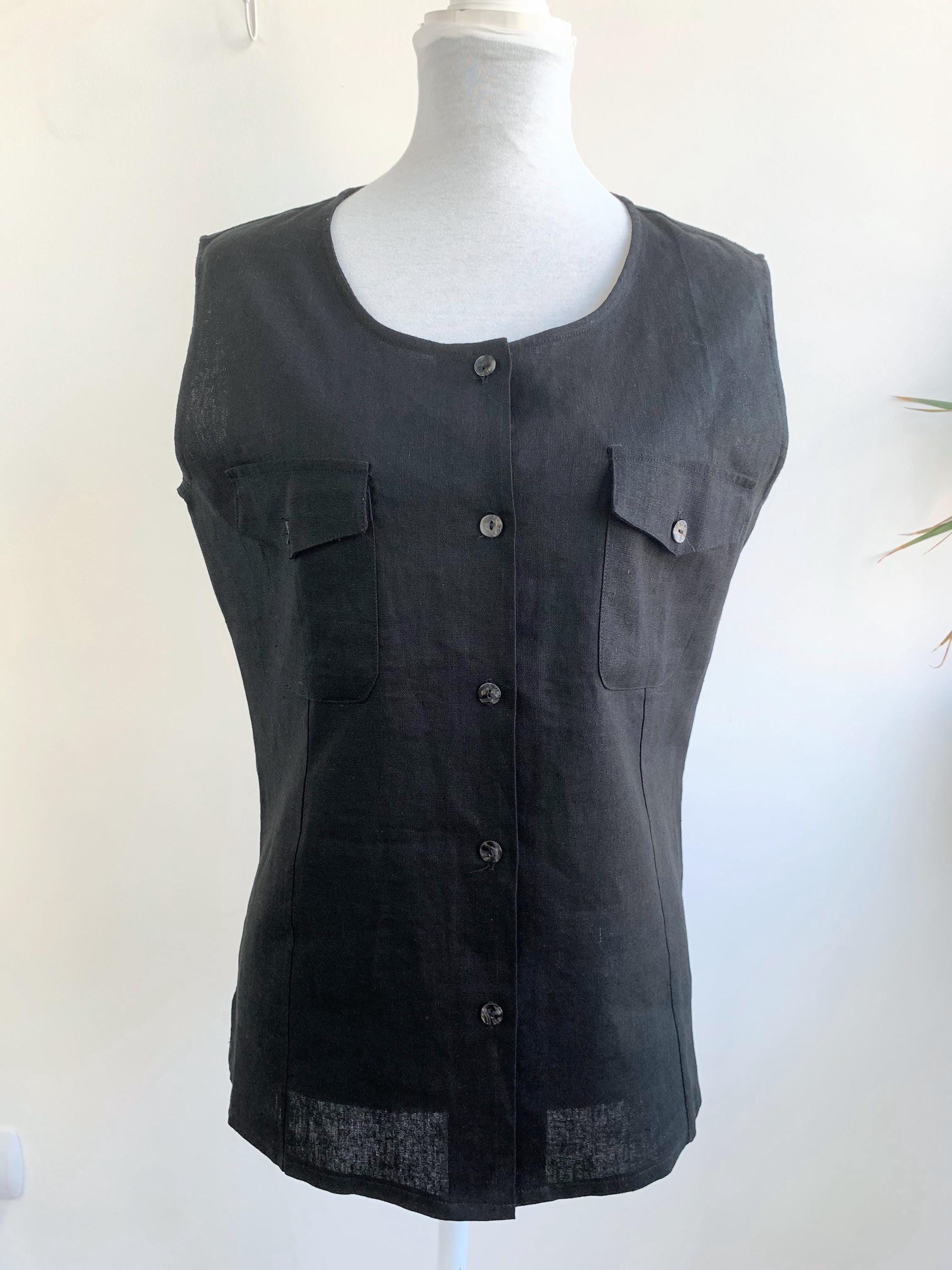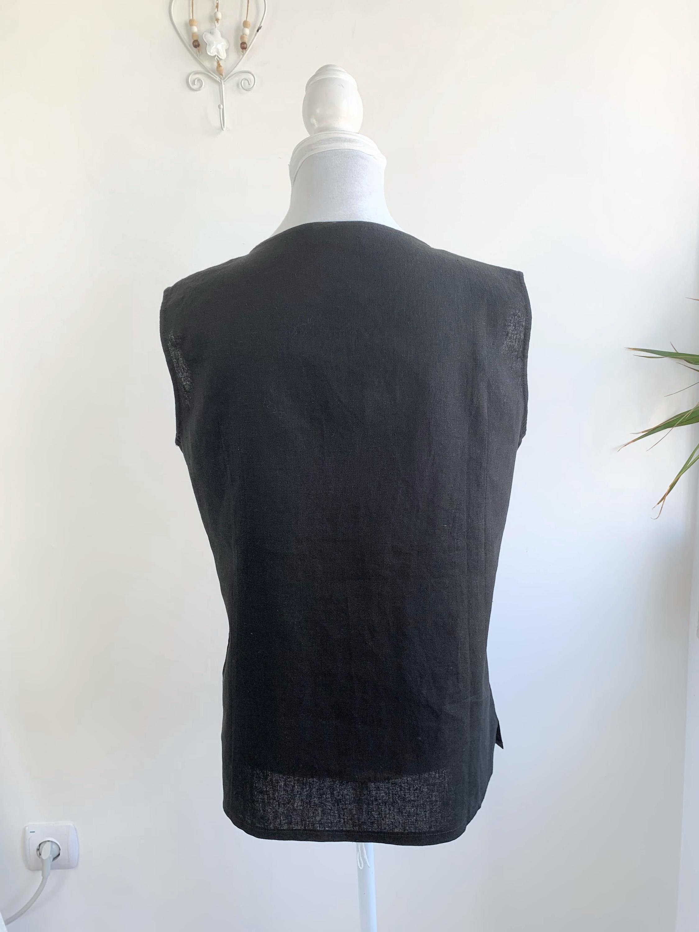 Vintage 90s black linen top for women with button down closure, scoop neck and chest pockets size M. This eco friendly sleeveless top is made of 70% linen, 20% cotton and 10% viscose fabric. It has simple loose fit silhouette. This sleeveless vest is size M, it fits oversized like size L. Please check the measurements below.