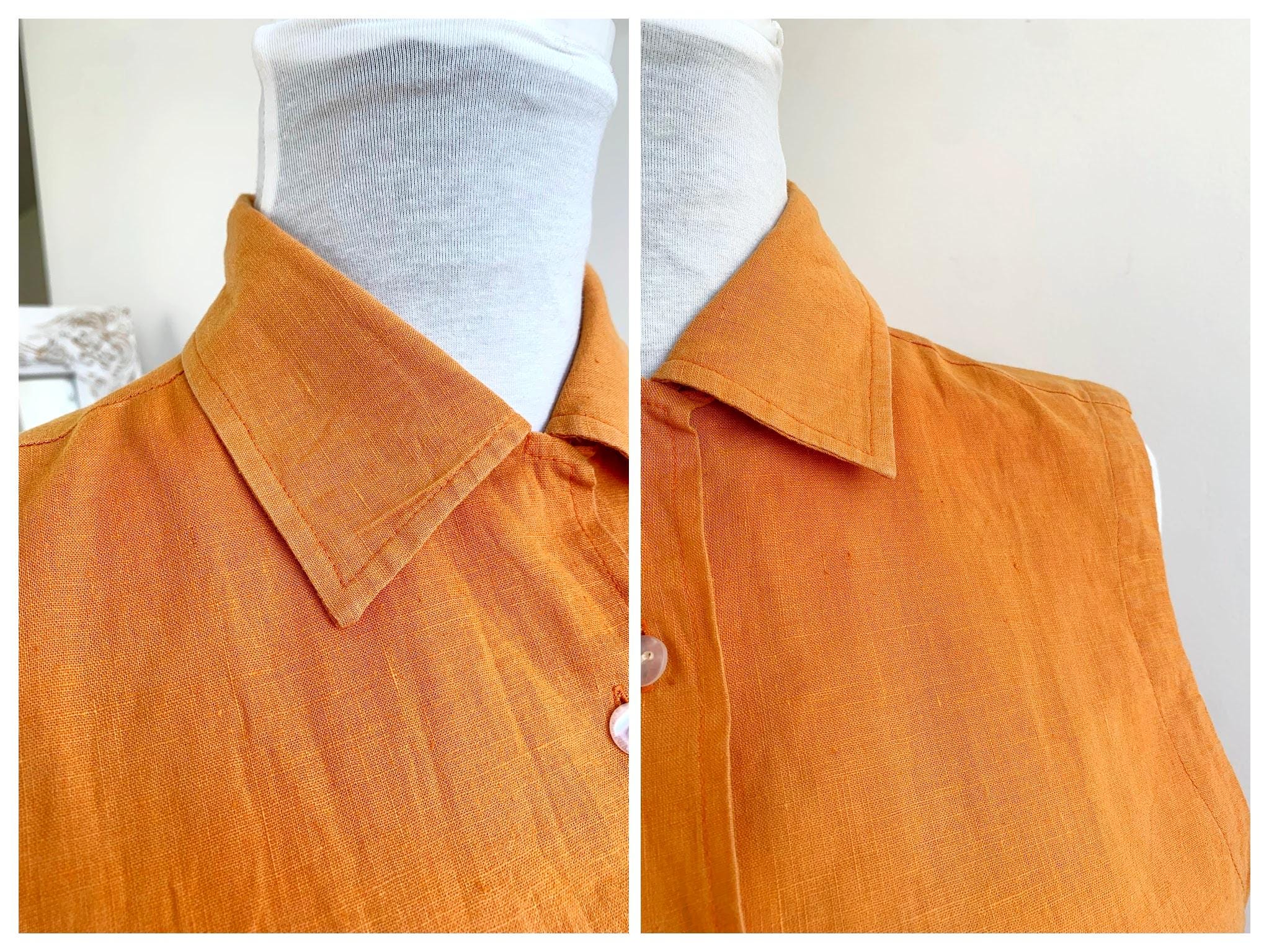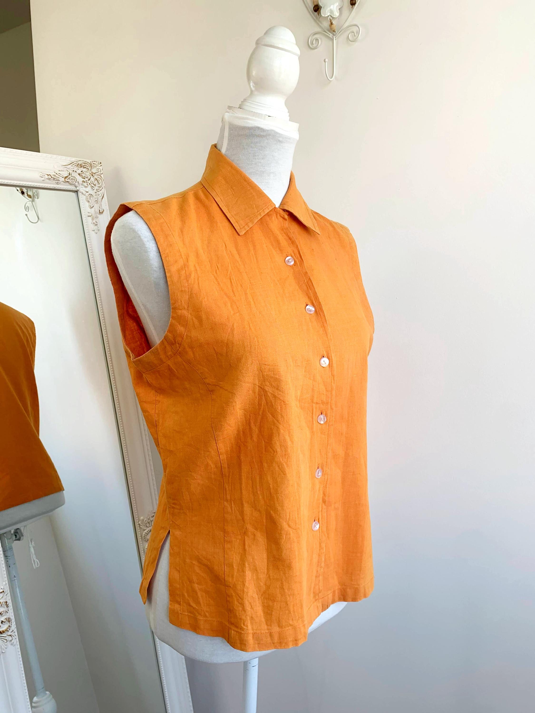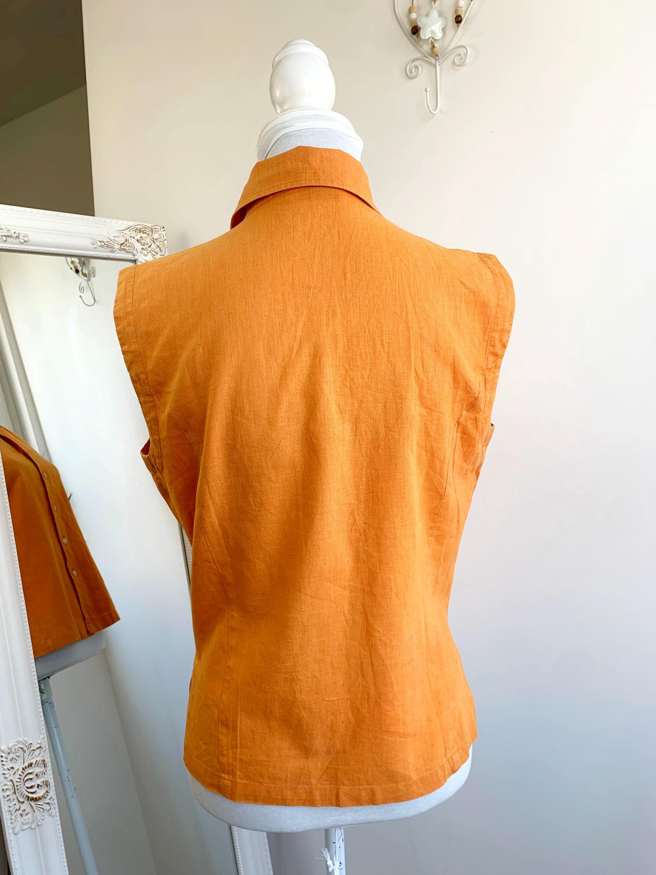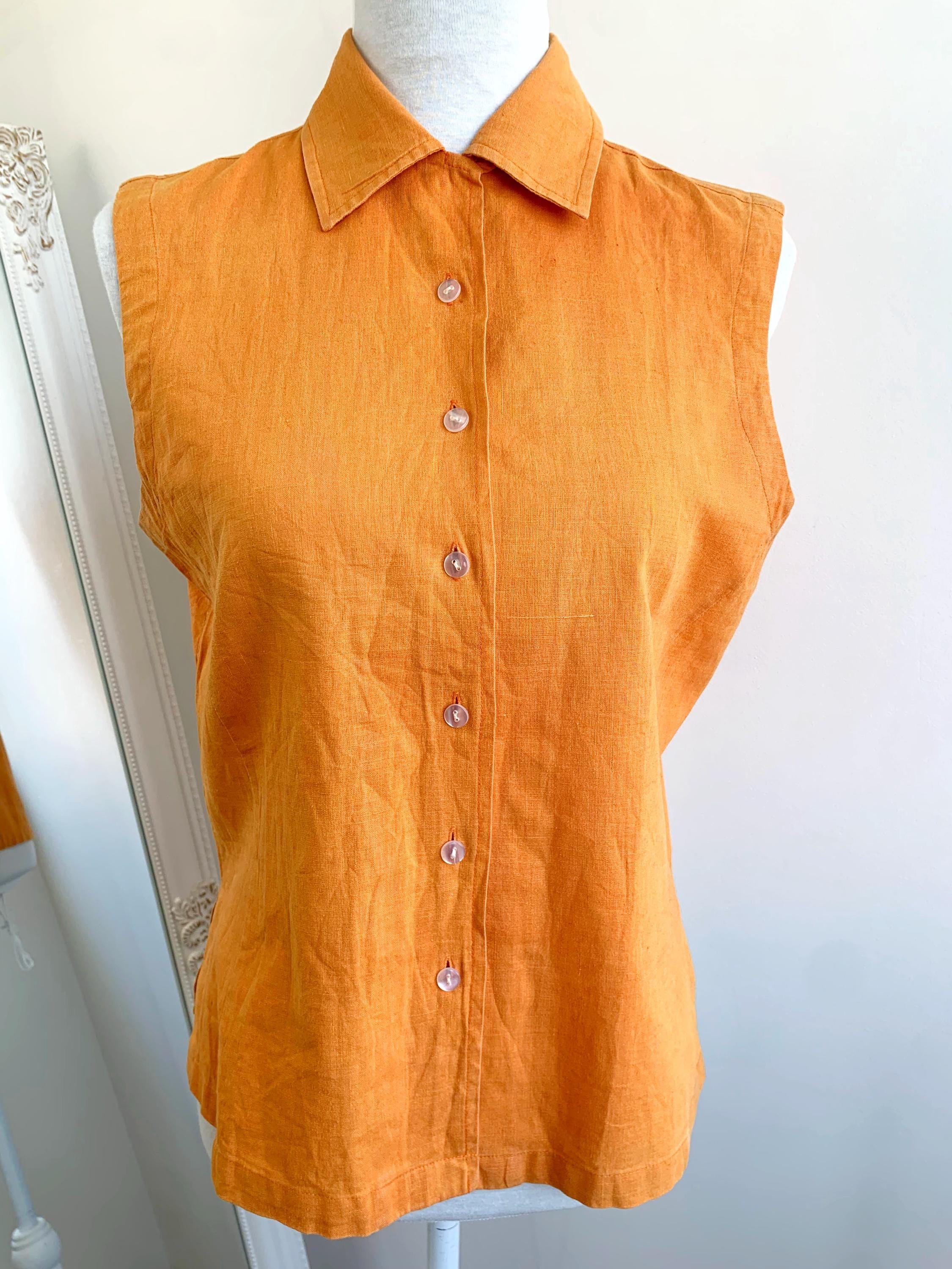 Vintage 90s pre-loved sustainable orange linen top for women with button down closure and collar in size M. This eco friendly sleeveless top is made of 55% linen and 45% cotton fabric. This linen blend button up shirt has simple loose fit silhouette. This sleeveless vest fits like size M. Please check the measurements below.