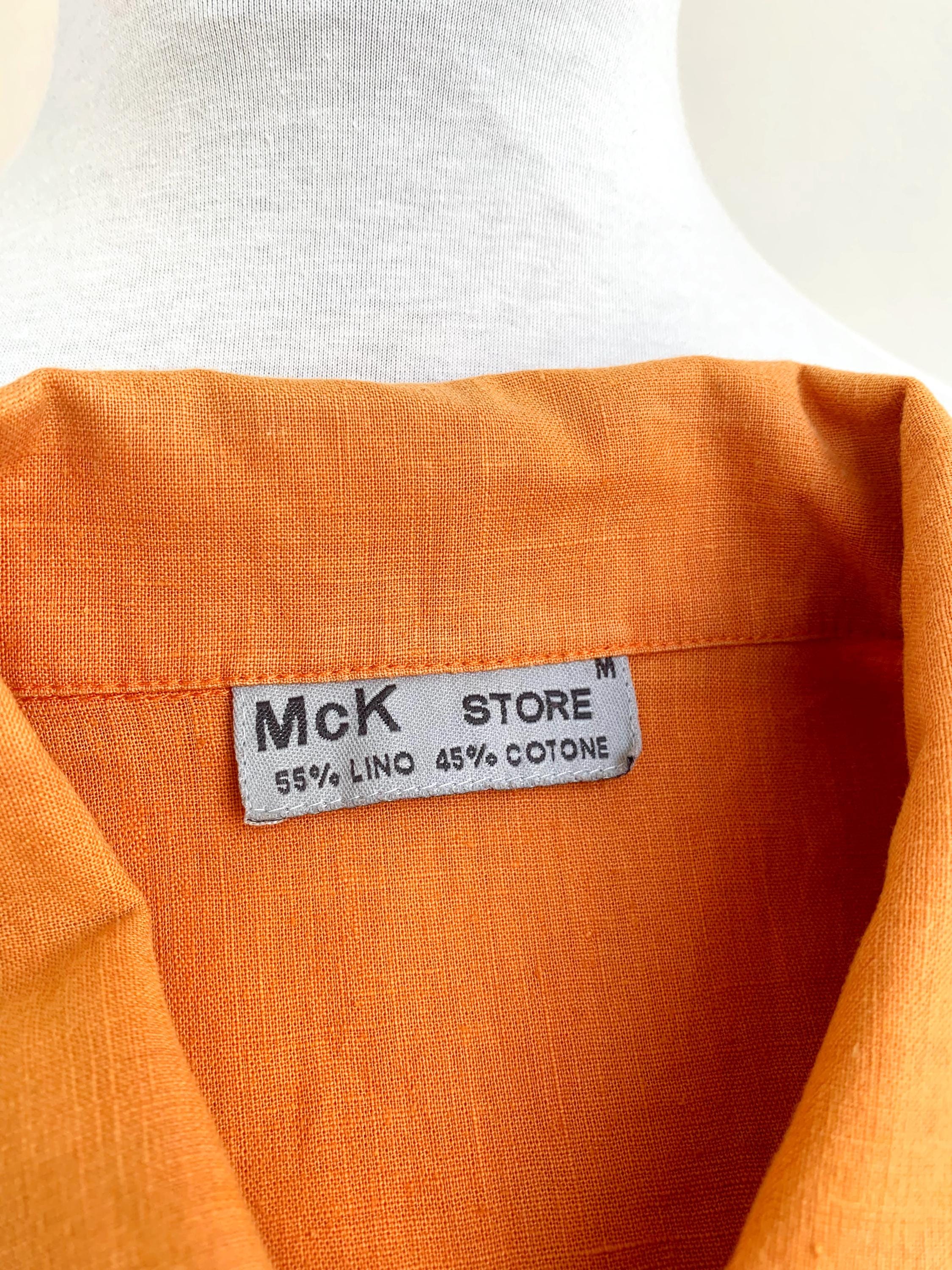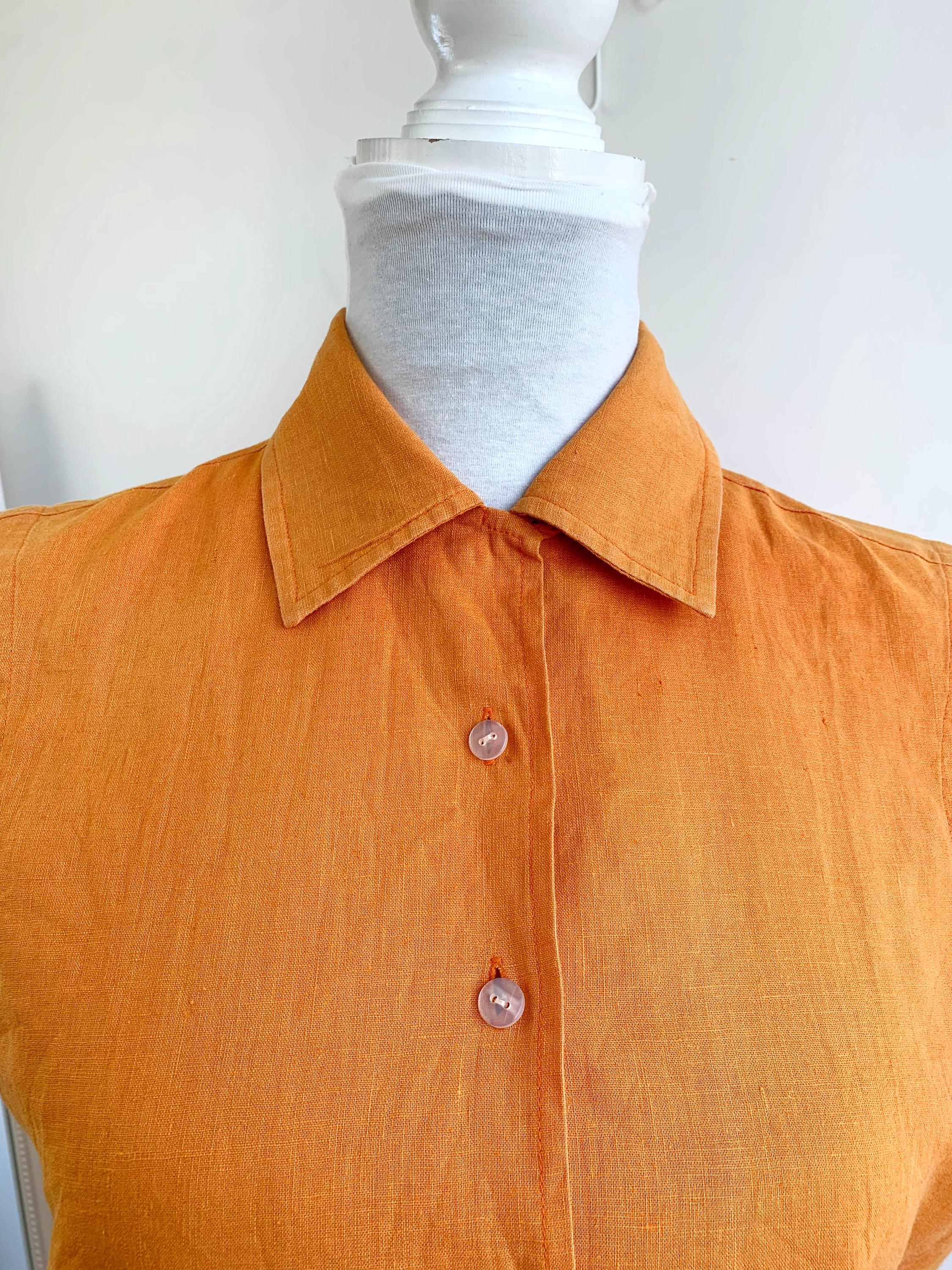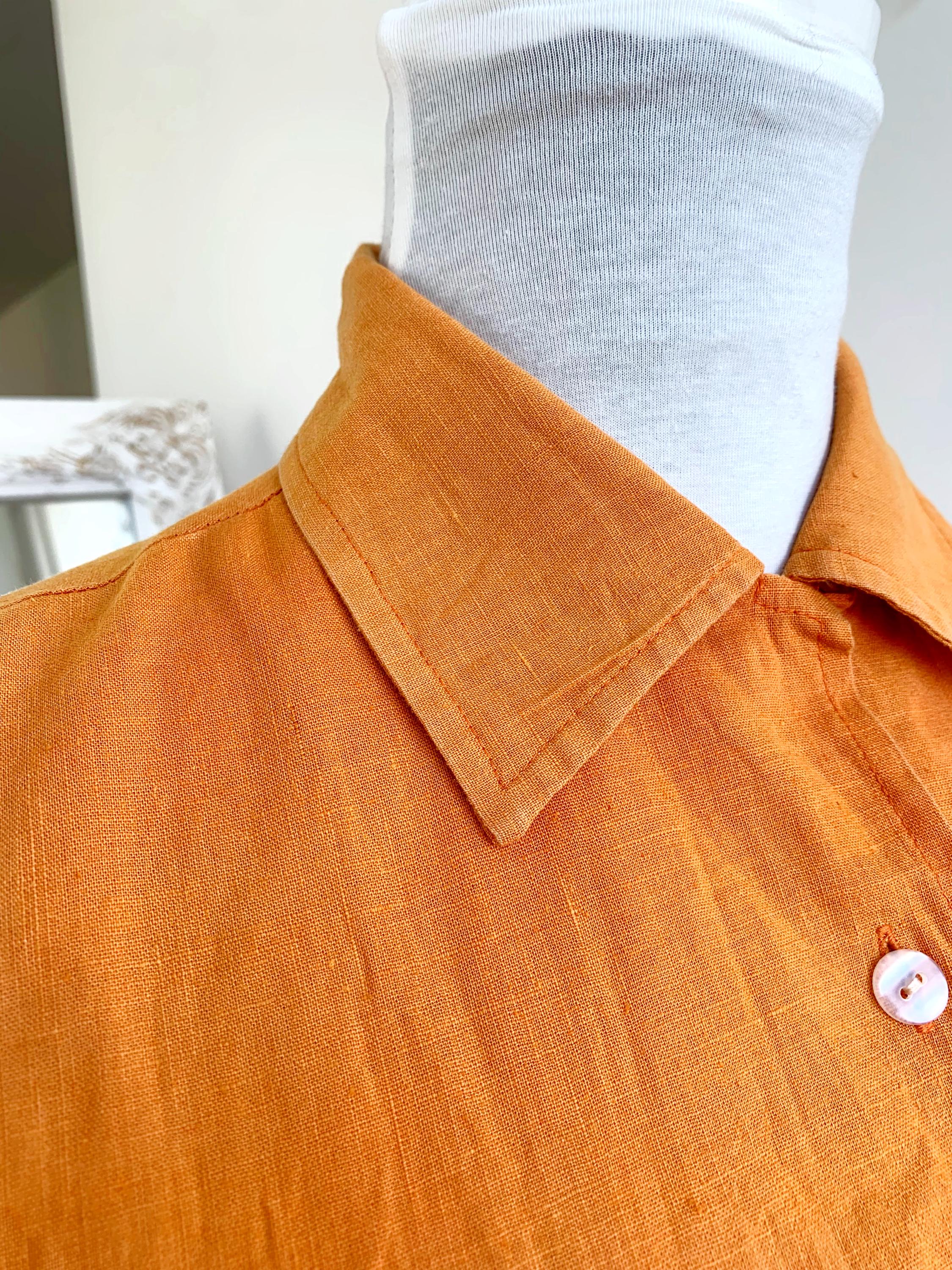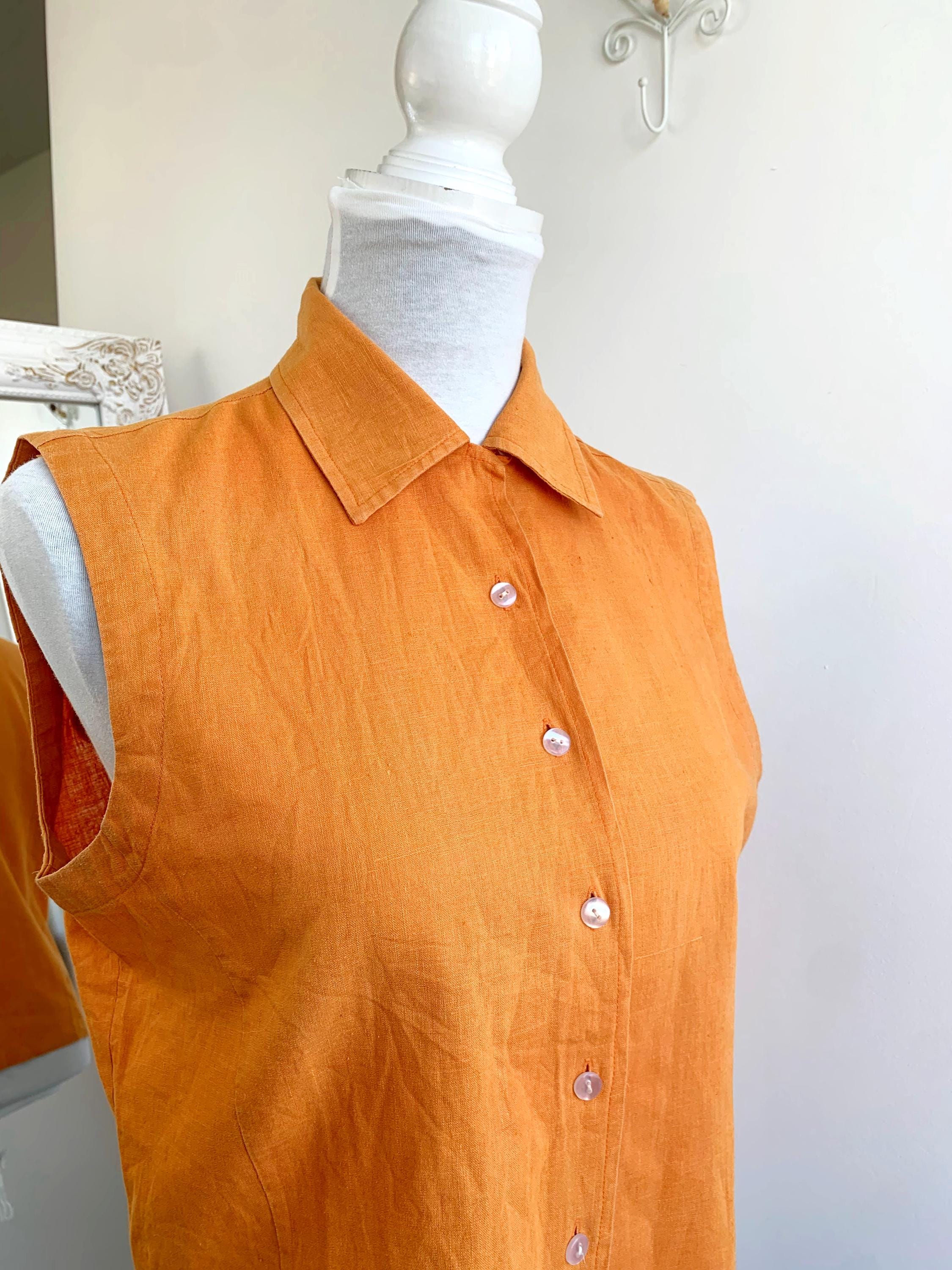 Vintage 90s pre-loved sustainable orange linen top for women with button down closure and collar in size M. This eco friendly sleeveless top is made of 55% linen and 45% cotton fabric. This linen blend button up shirt has simple loose fit silhouette. This sleeveless vest fits like size M. Please check the measurements below.