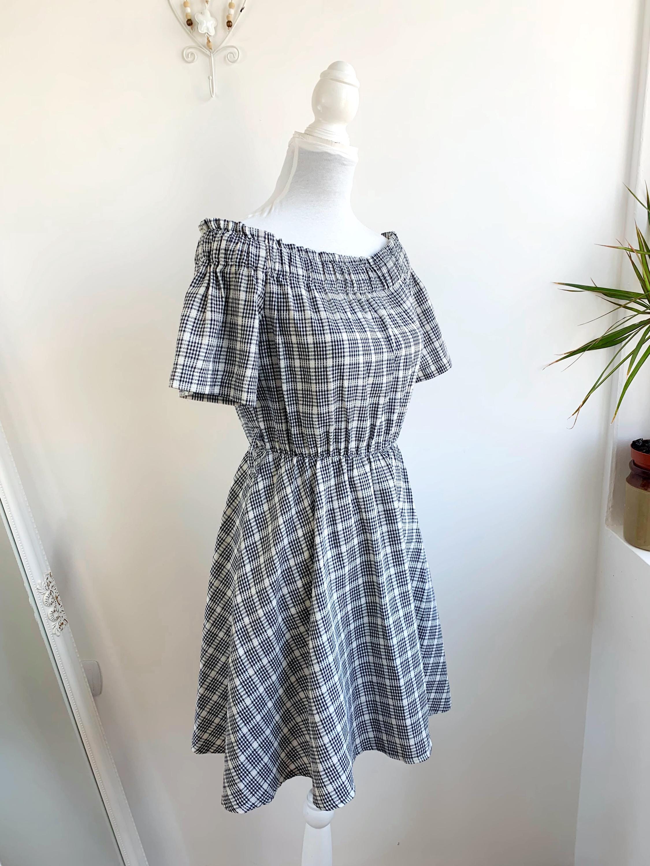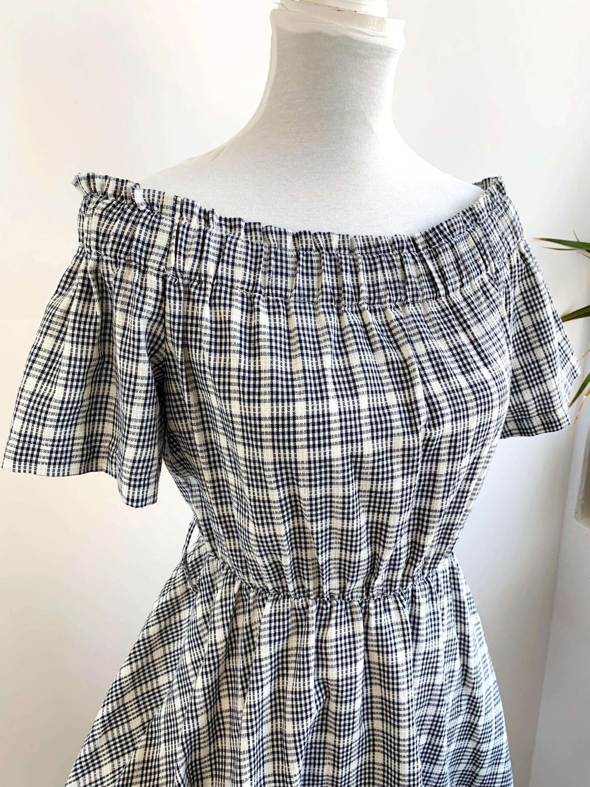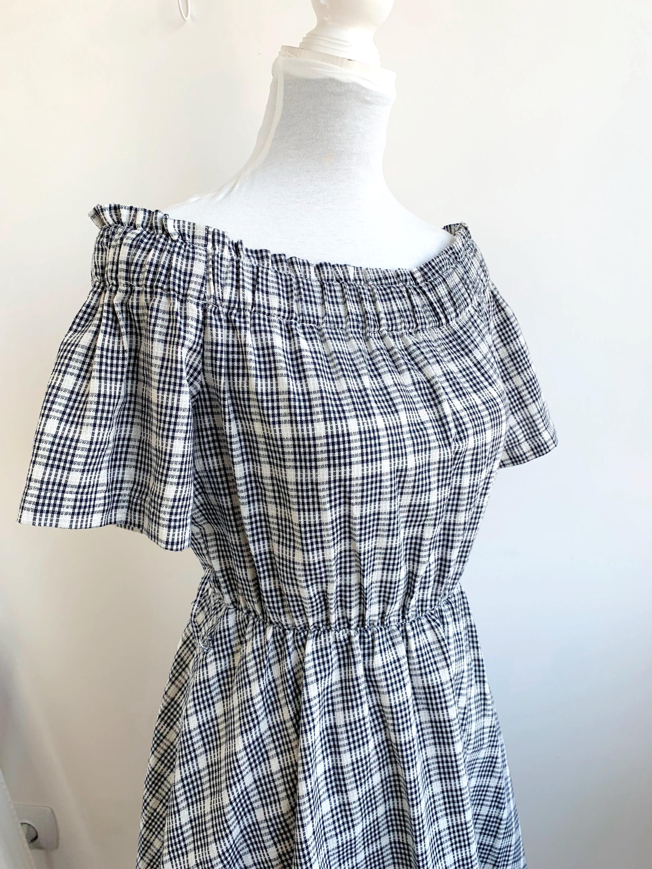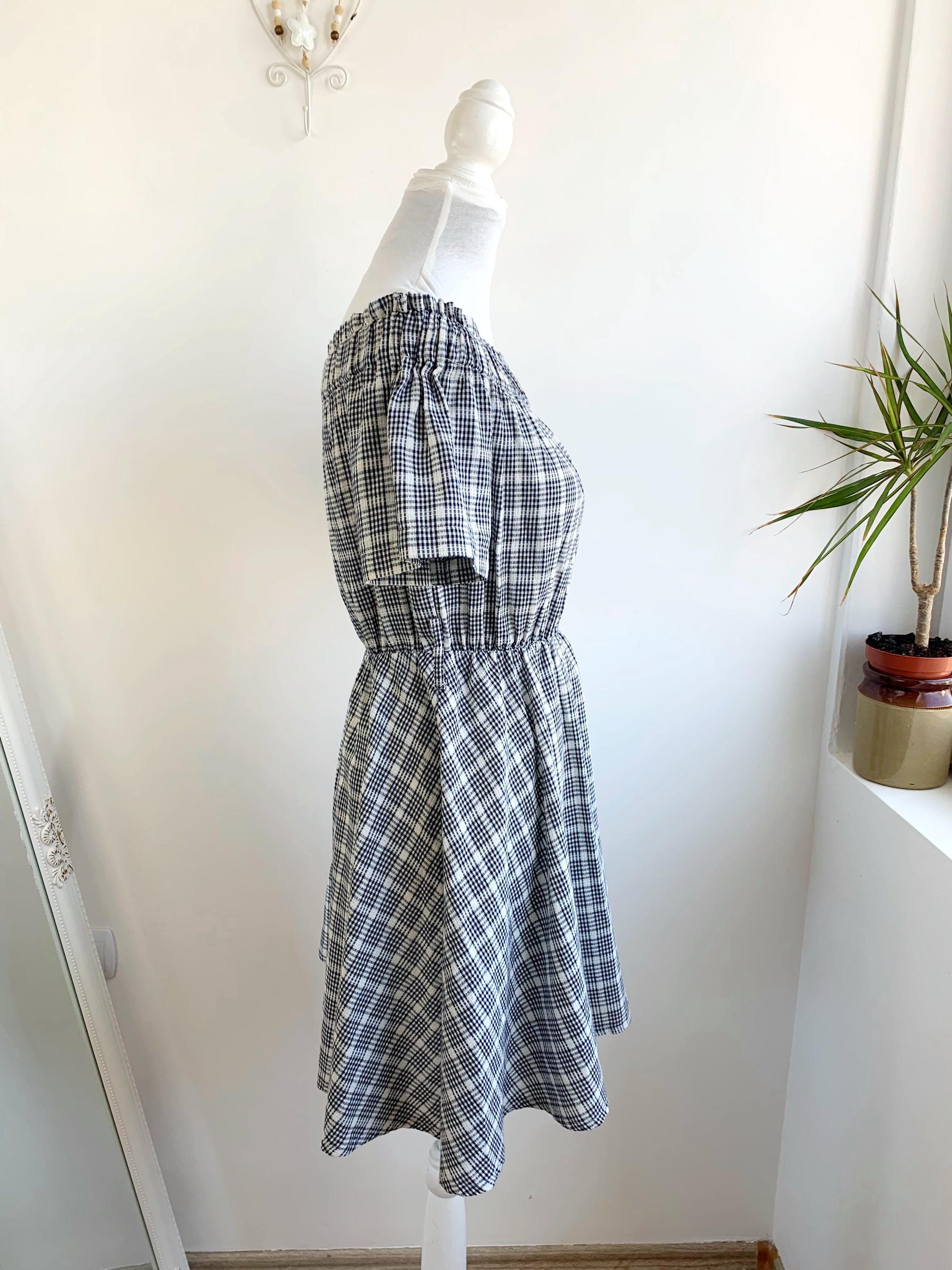This is a beautiful vintage cotton blend dark navy, almost black and white checkered dress with elastic off the shoulder neckline, short sleeves and elastic waistline with full skirt. This cottagecore midi dress is made of lovely check print cotton blend fabric which is perfect for the summer season. This retro mini dress is size S.