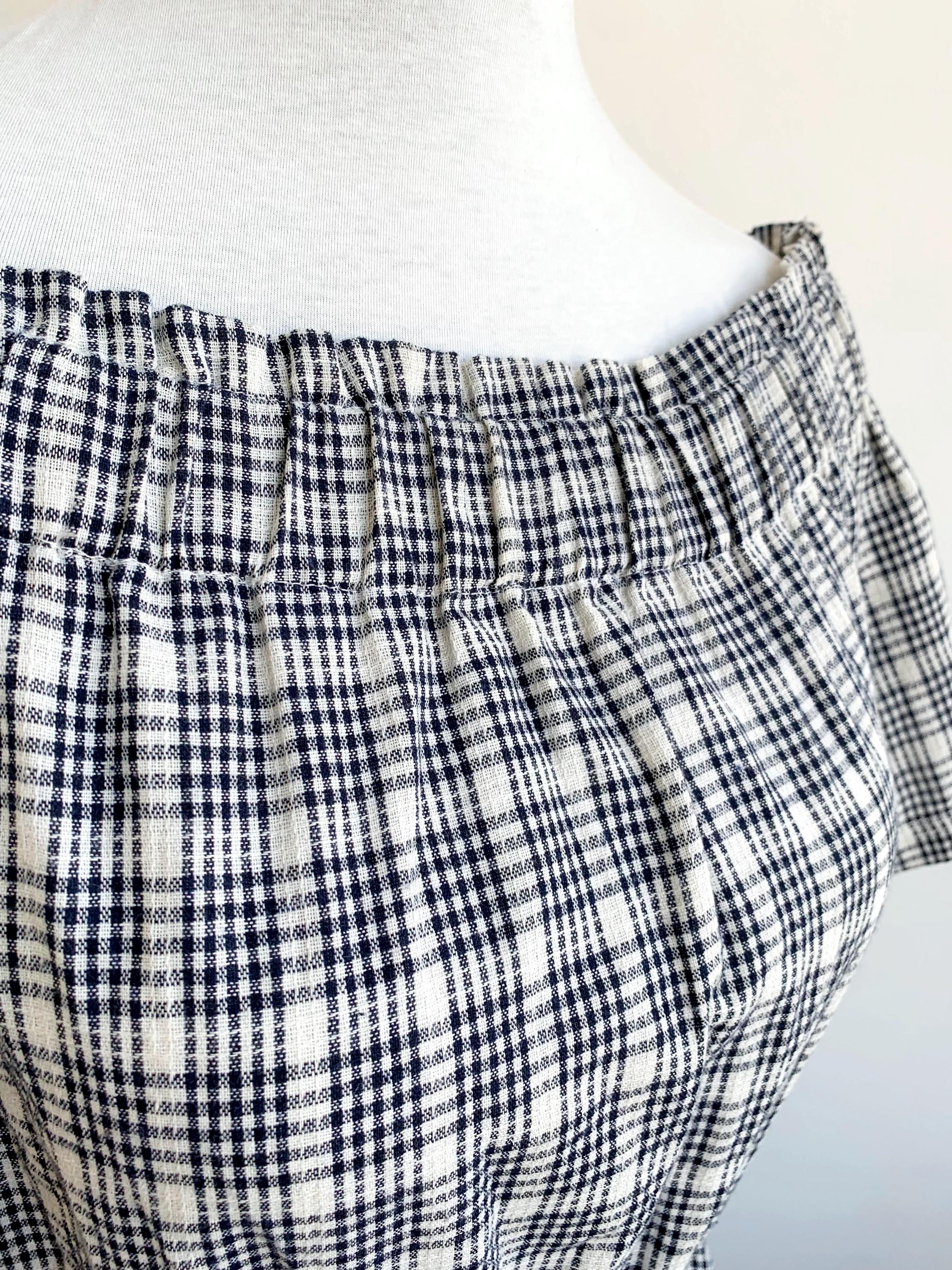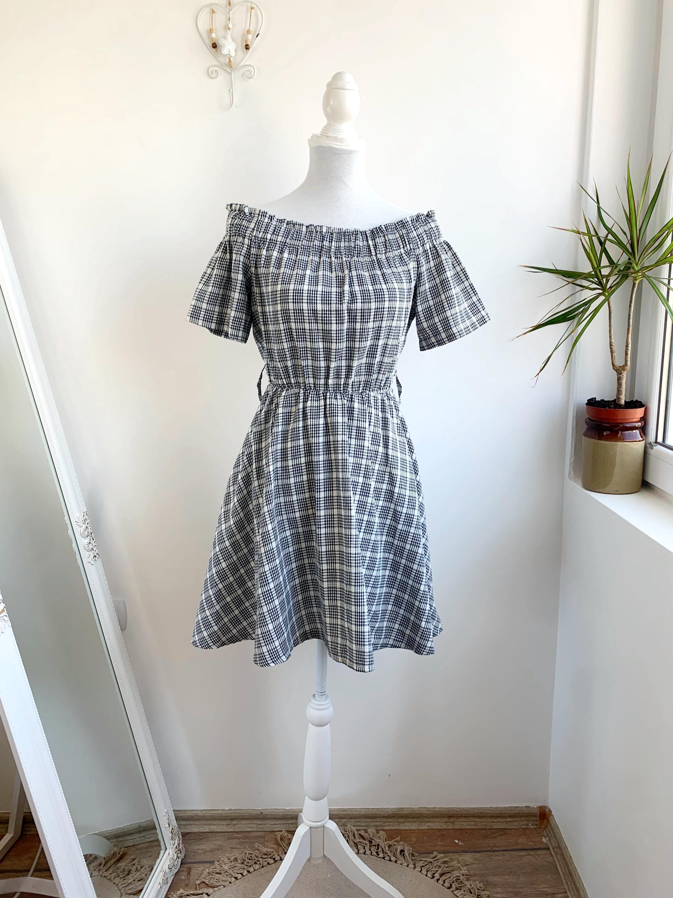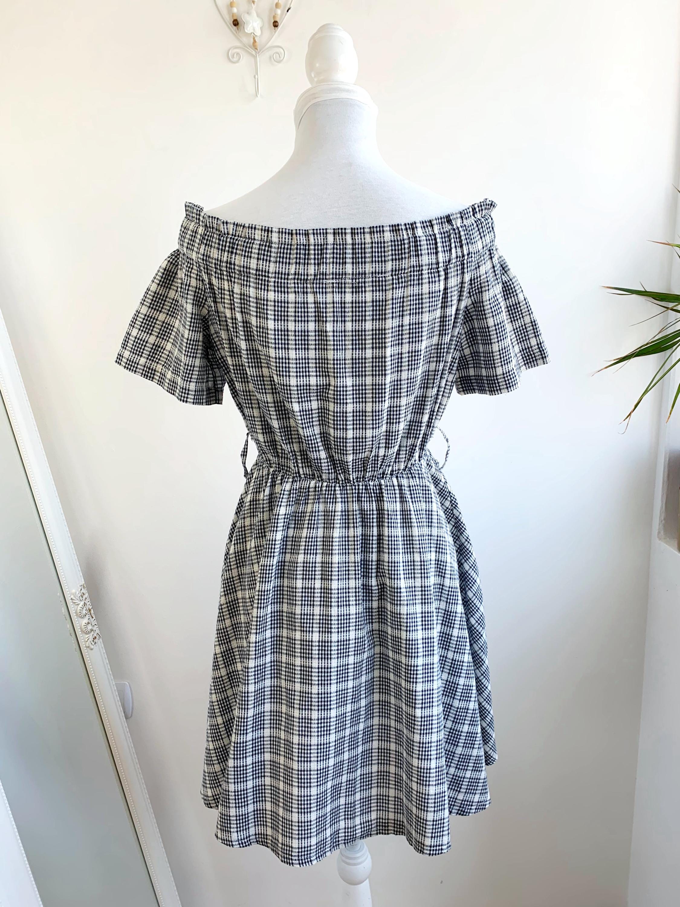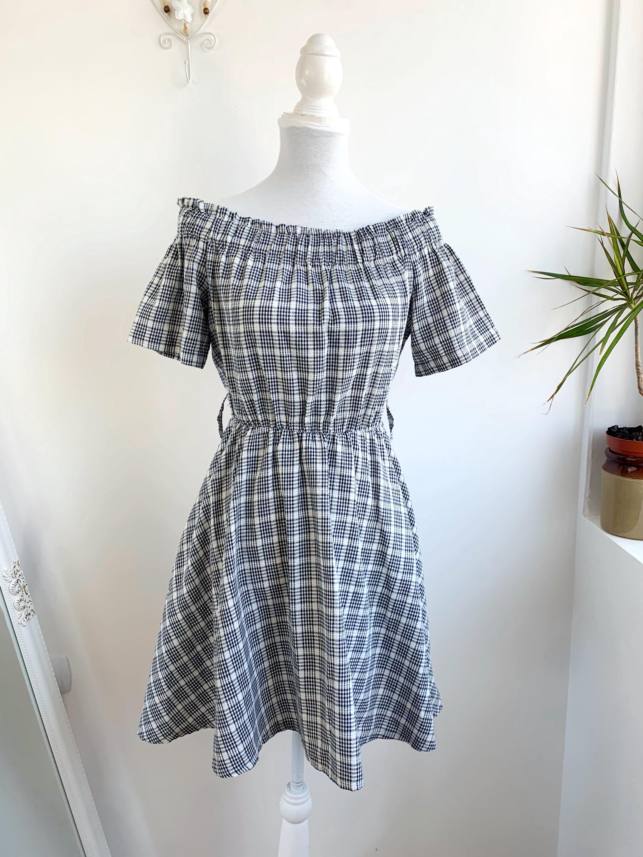 This is a beautiful vintage cotton blend dark navy, almost black and white checkered dress with elastic off the shoulder neckline, short sleeves and elastic waistline with full skirt. This cottagecore midi dress is made of lovely check print cotton blend fabric which is perfect for the summer season. This retro mini dress is size S.