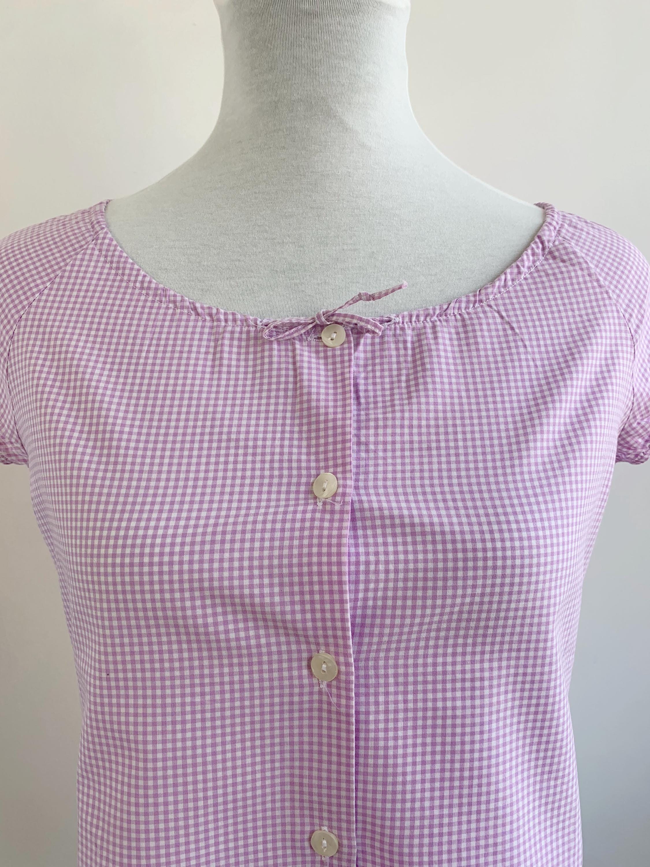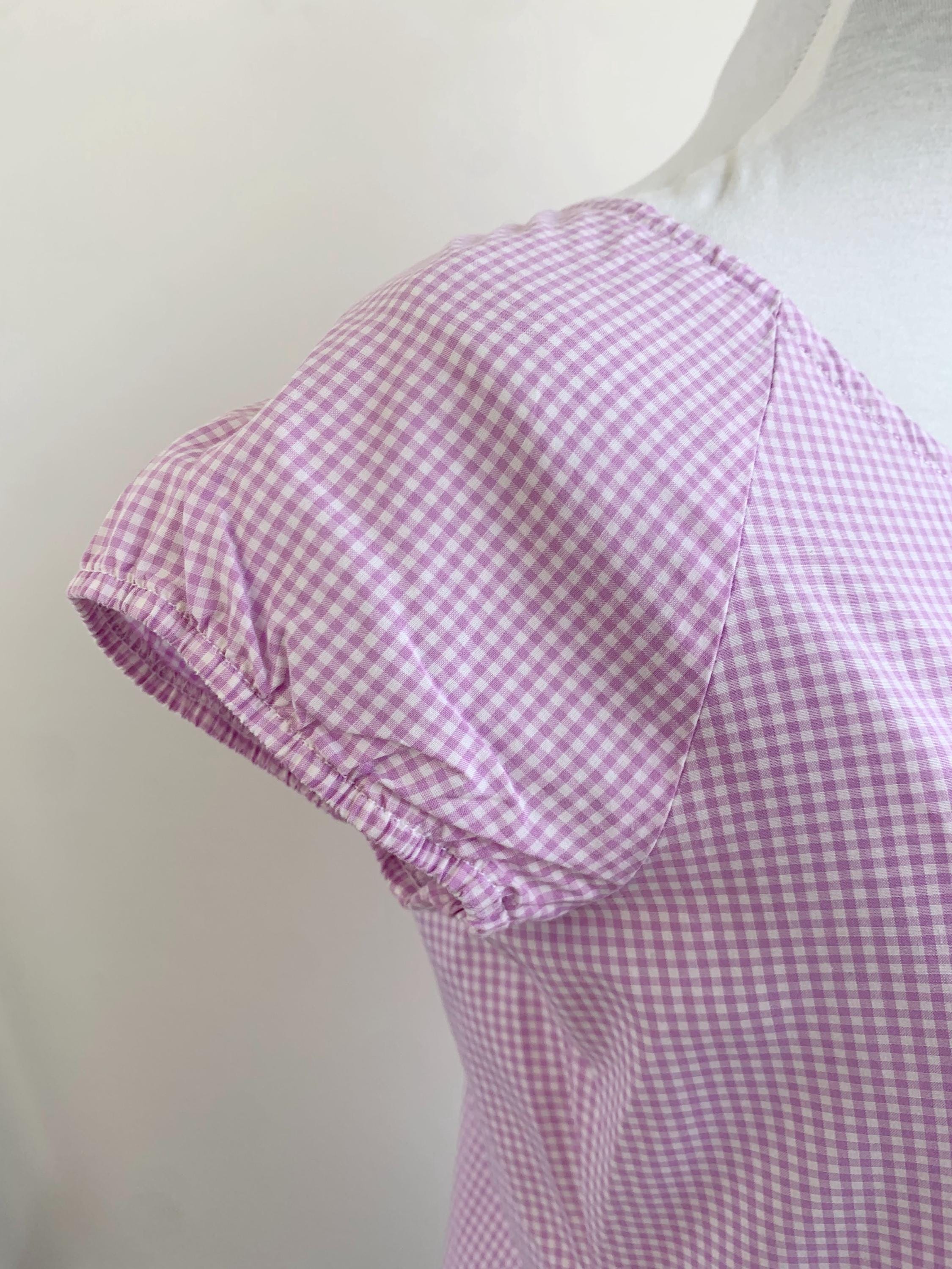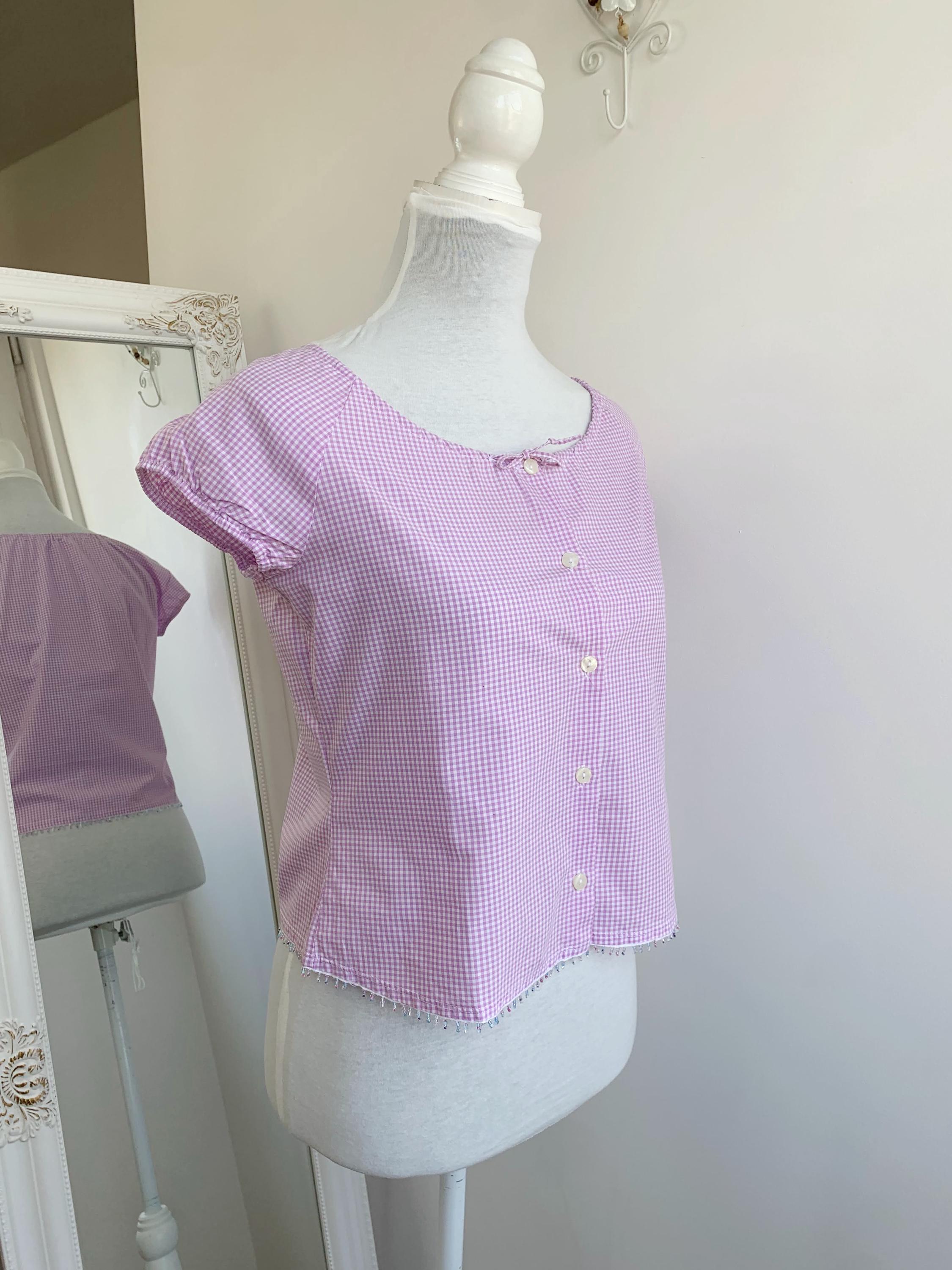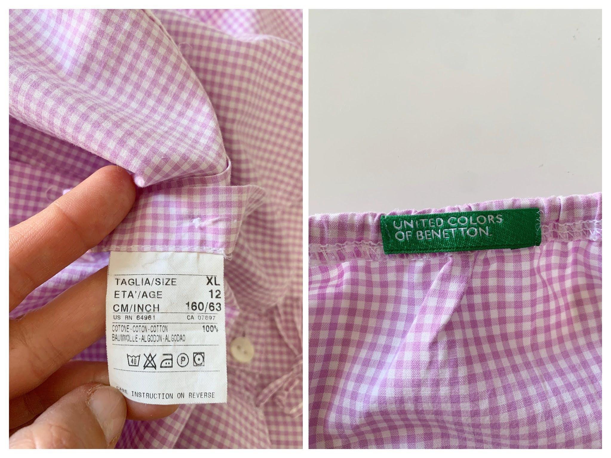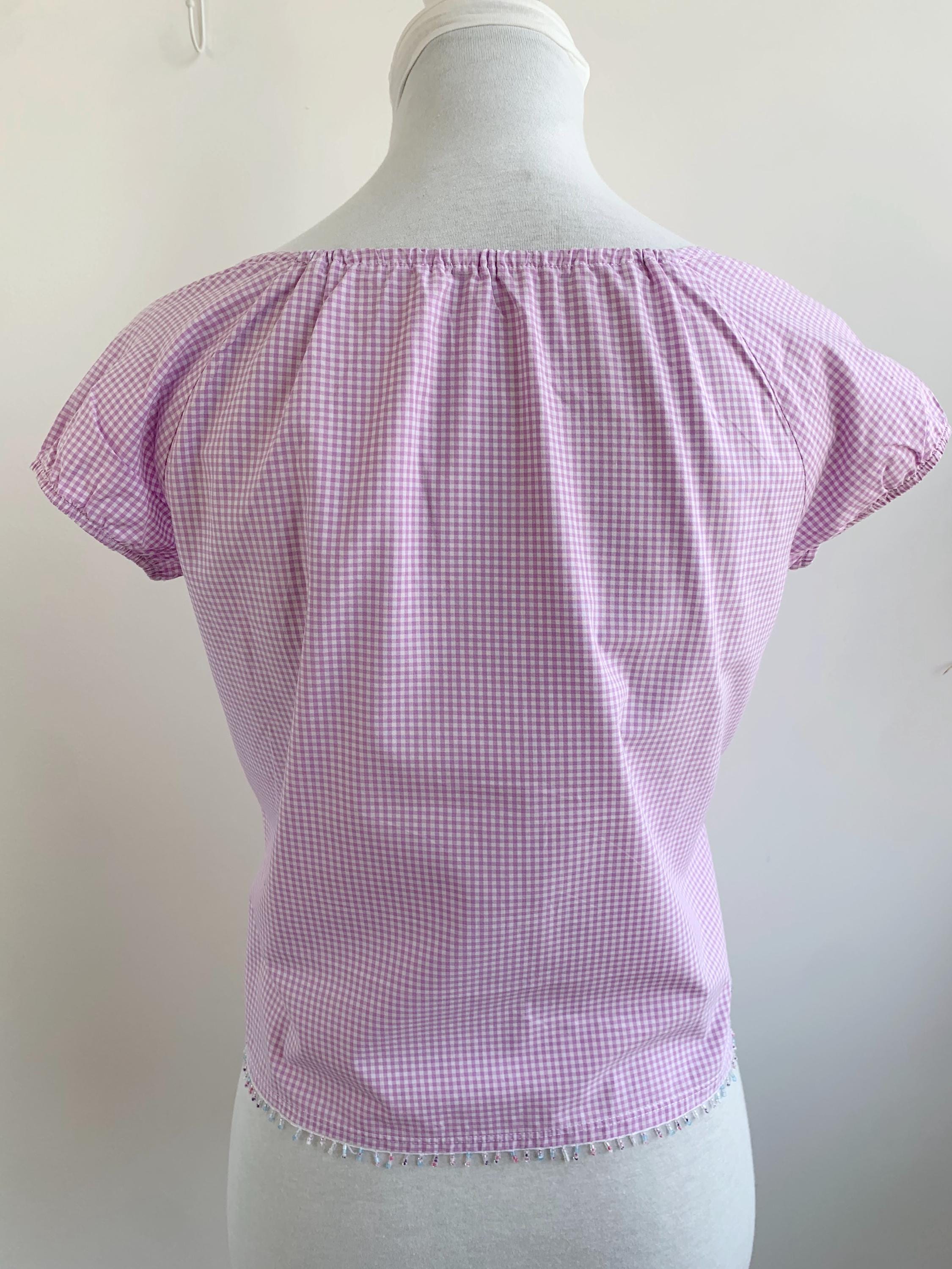 This is a vintage 90s United Colors of Benetton pure cotton short sleeve summer blouse for women in lilac pink and white check gingham print with delicate lace up neckline and short cap sleeves. This boho chic gingham button up shirt for women has scoop neck with tie front accent. This cotton plaid shirt has amazing beadwork detailing at the bottom hemline. It fits like size S, plese check the measurements below.