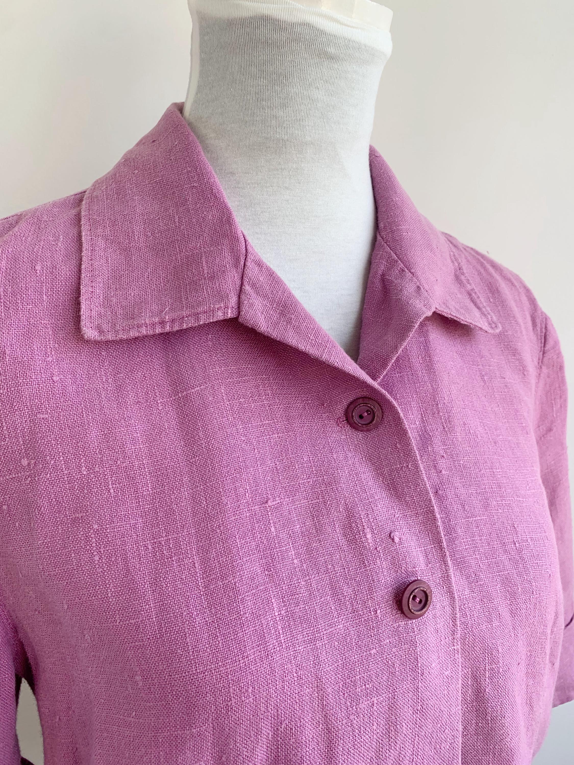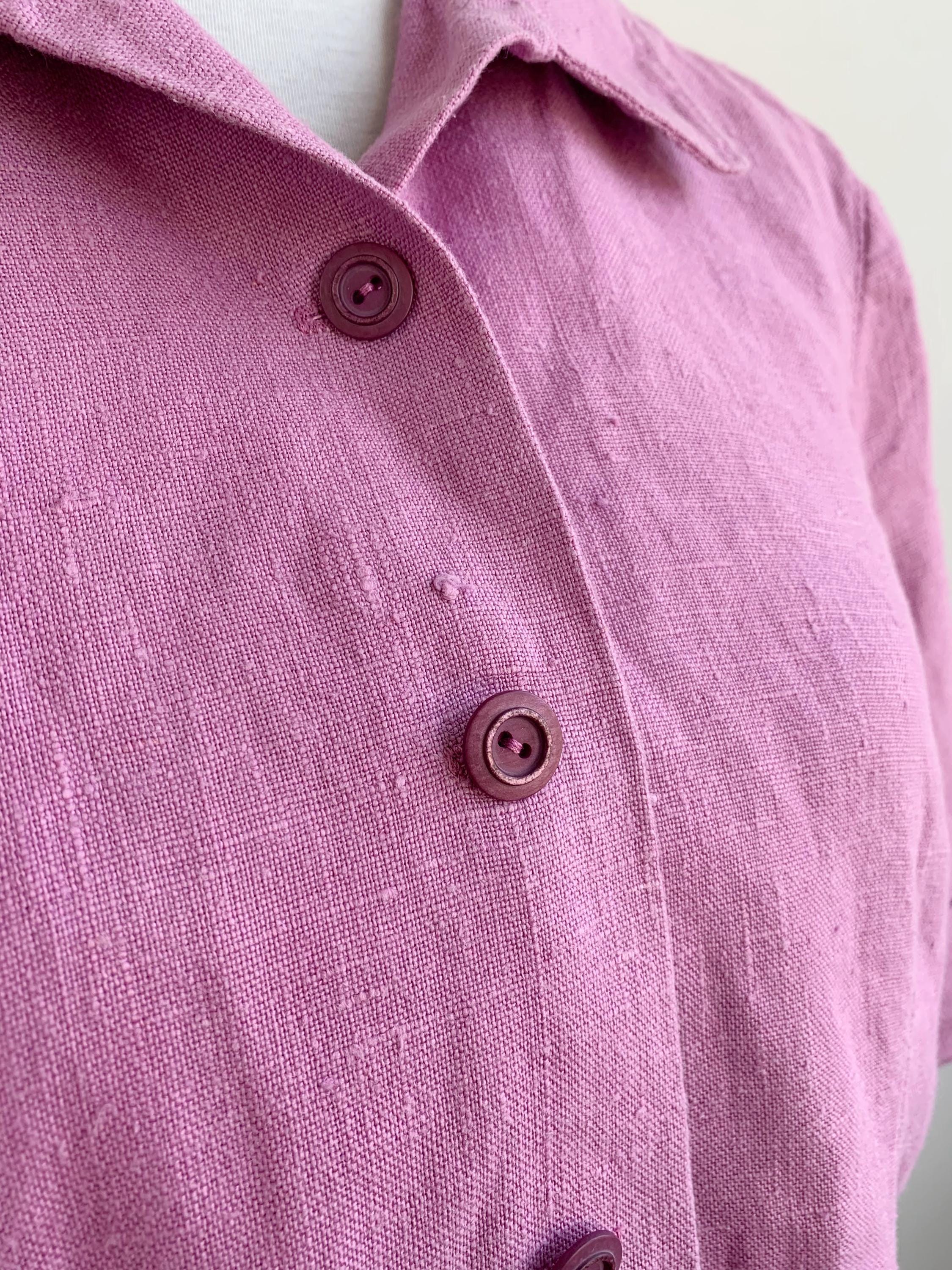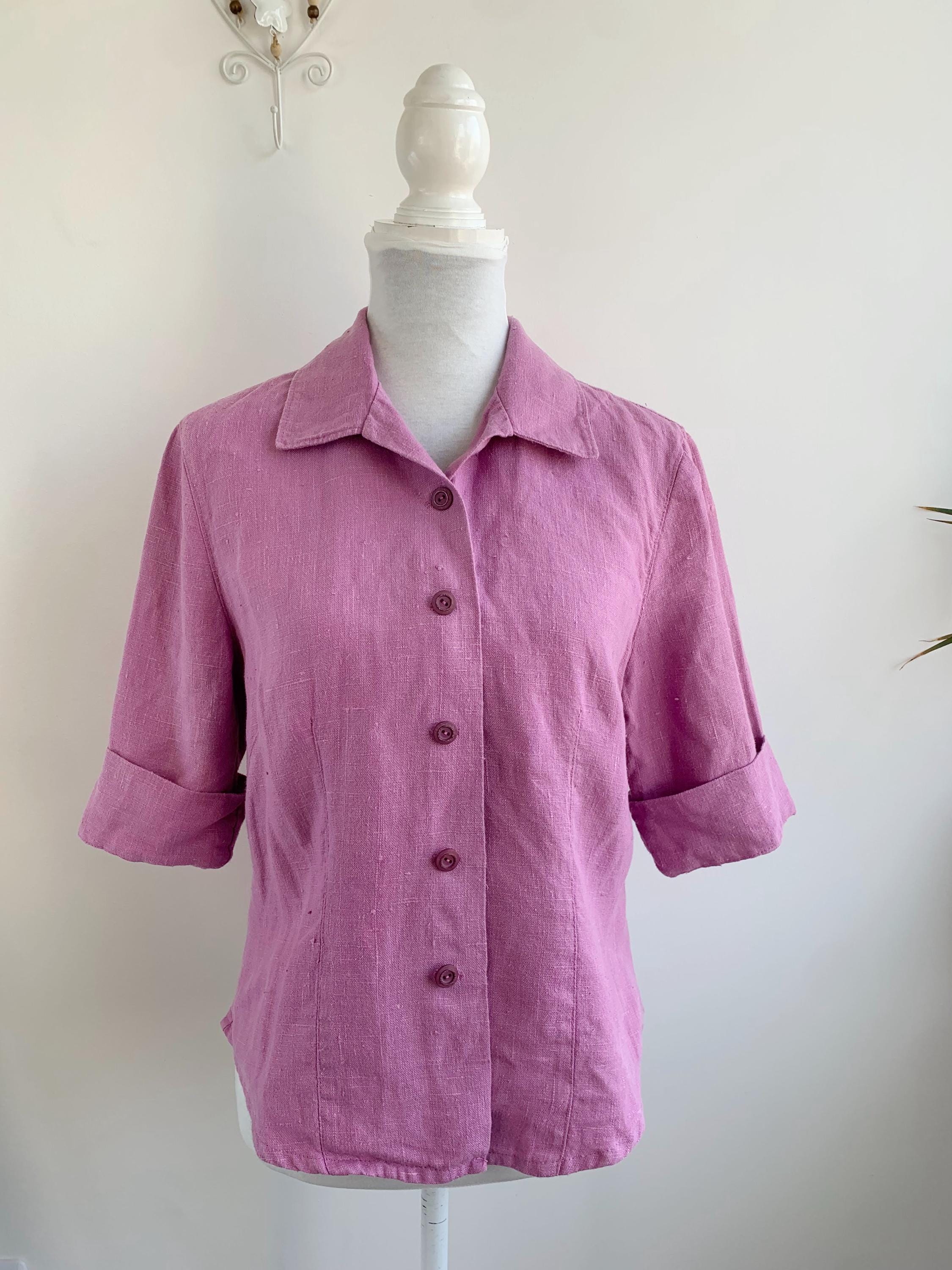 This is a vintage lilac pink natural heavy linen button up shirt for women with short sleeves, button up closure and collar. This vintage button up shirt was handmade, there are no tags or labels. The fabric feels like heavy hemp or flax linen with natural texture. This linen button up blouse combines effortless-looking style with comfortable wear. This button up top is crafted from beautiful breathable, natural fabric with a loose fit cut that flatters the figure and wrinkles beautifully every time it’s worn due to the natural texture of the flax fabric. This flax linen blouse is designed to take you from a day at the office to night out with friends, achieving timeless elegance without compromising comfort. The flattering shape and ruffled collar adds a pop of effortless elegance! Complete the classic look with capri pants or a minimalist summer skirt and you are ready to rock.