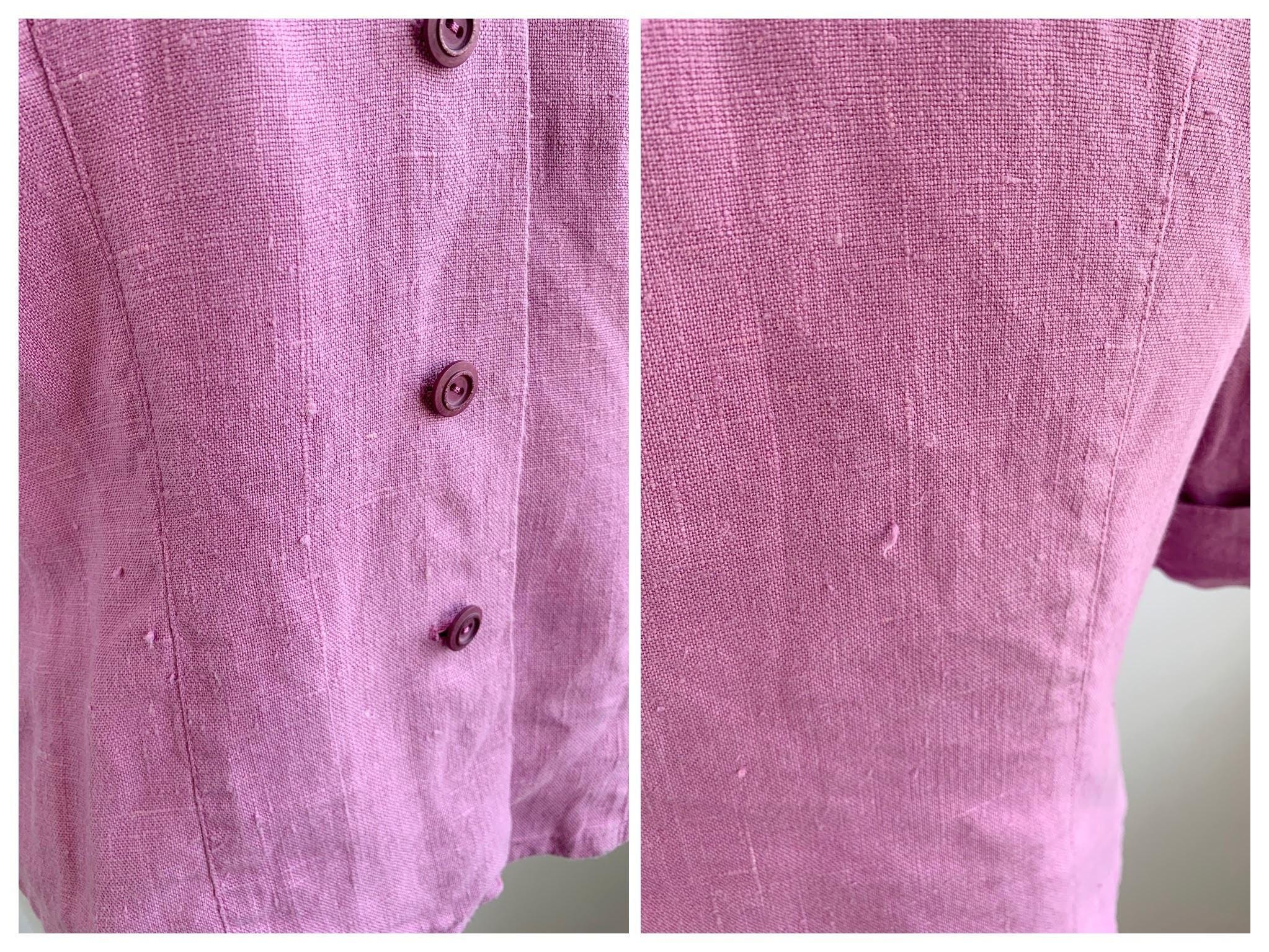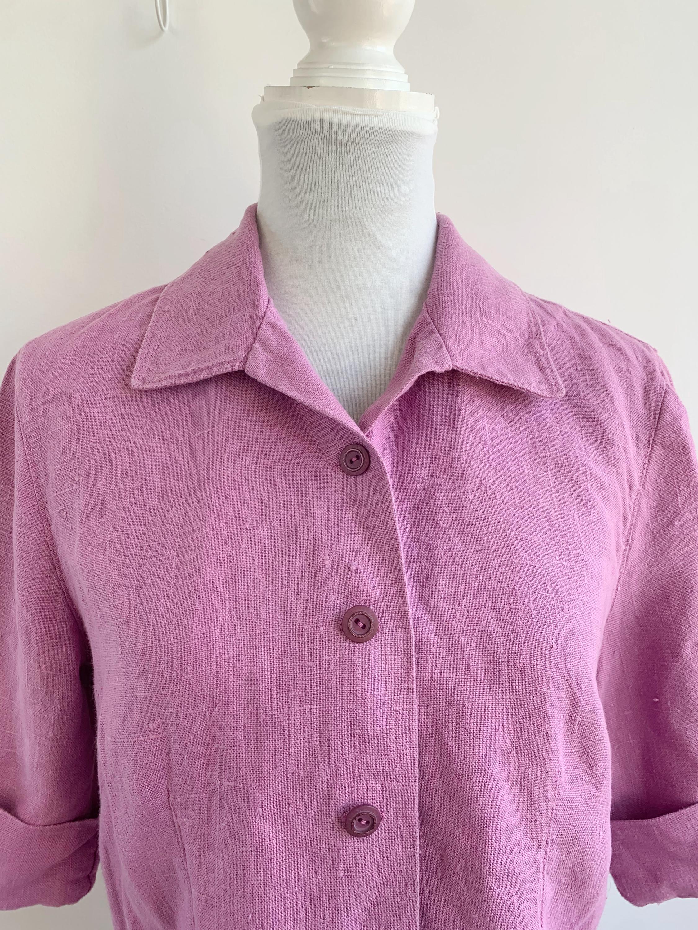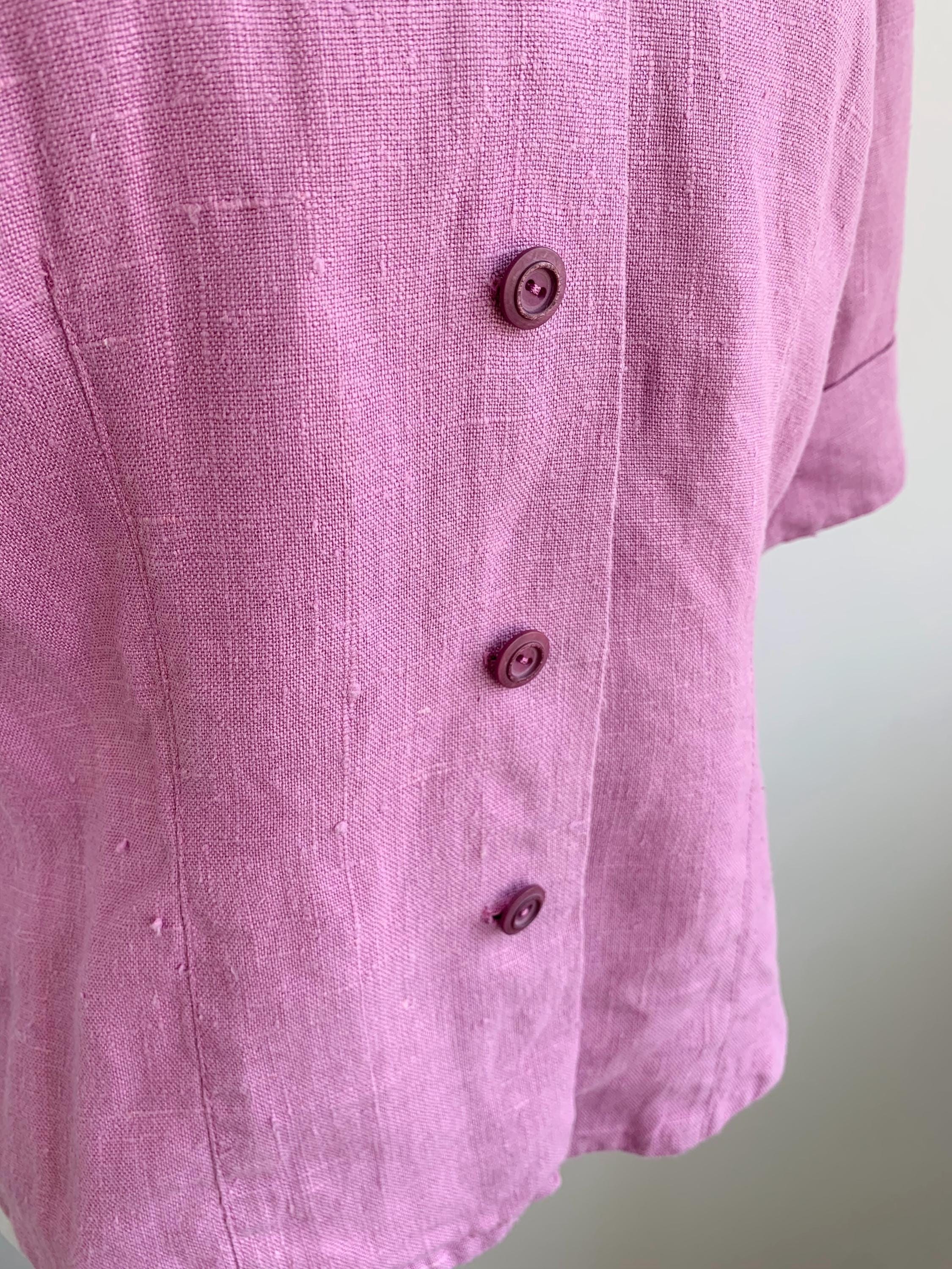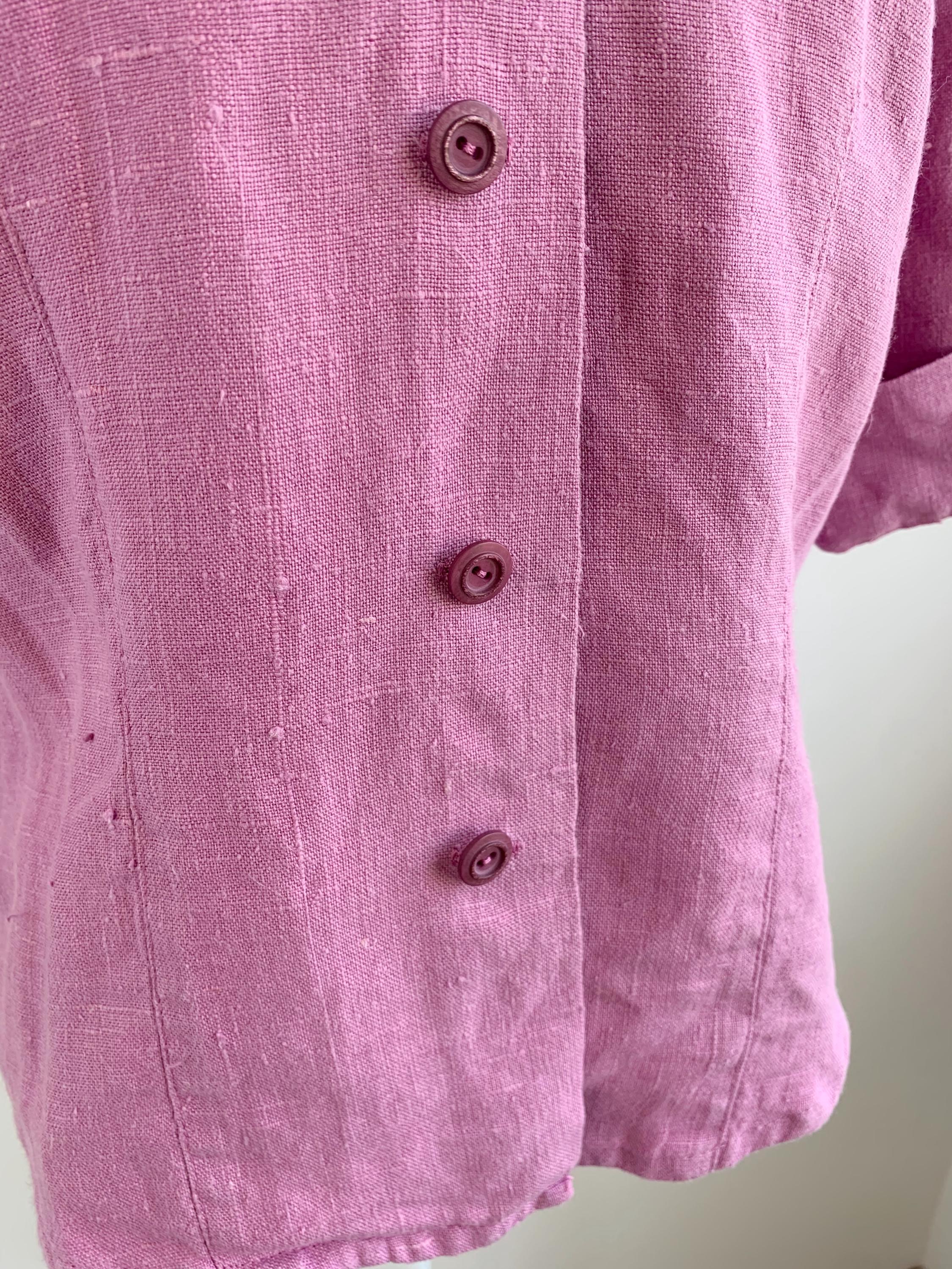 This is a vintage lilac pink natural heavy linen button up shirt for women with short sleeves, button up closure and collar. This vintage button up shirt was handmade, there are no tags or labels. The fabric feels like heavy hemp or flax linen with natural texture. This linen button up blouse combines effortless-looking style with comfortable wear. This button up top is crafted from beautiful breathable, natural fabric with a loose fit cut that flatters the figure and wrinkles beautifully every time it’s worn due to the natural texture of the flax fabric. This flax linen blouse is designed to take you from a day at the office to night out with friends, achieving timeless elegance without compromising comfort. The flattering shape and ruffled collar adds a pop of effortless elegance! Complete the classic look with capri pants or a minimalist summer skirt and you are ready to rock.
