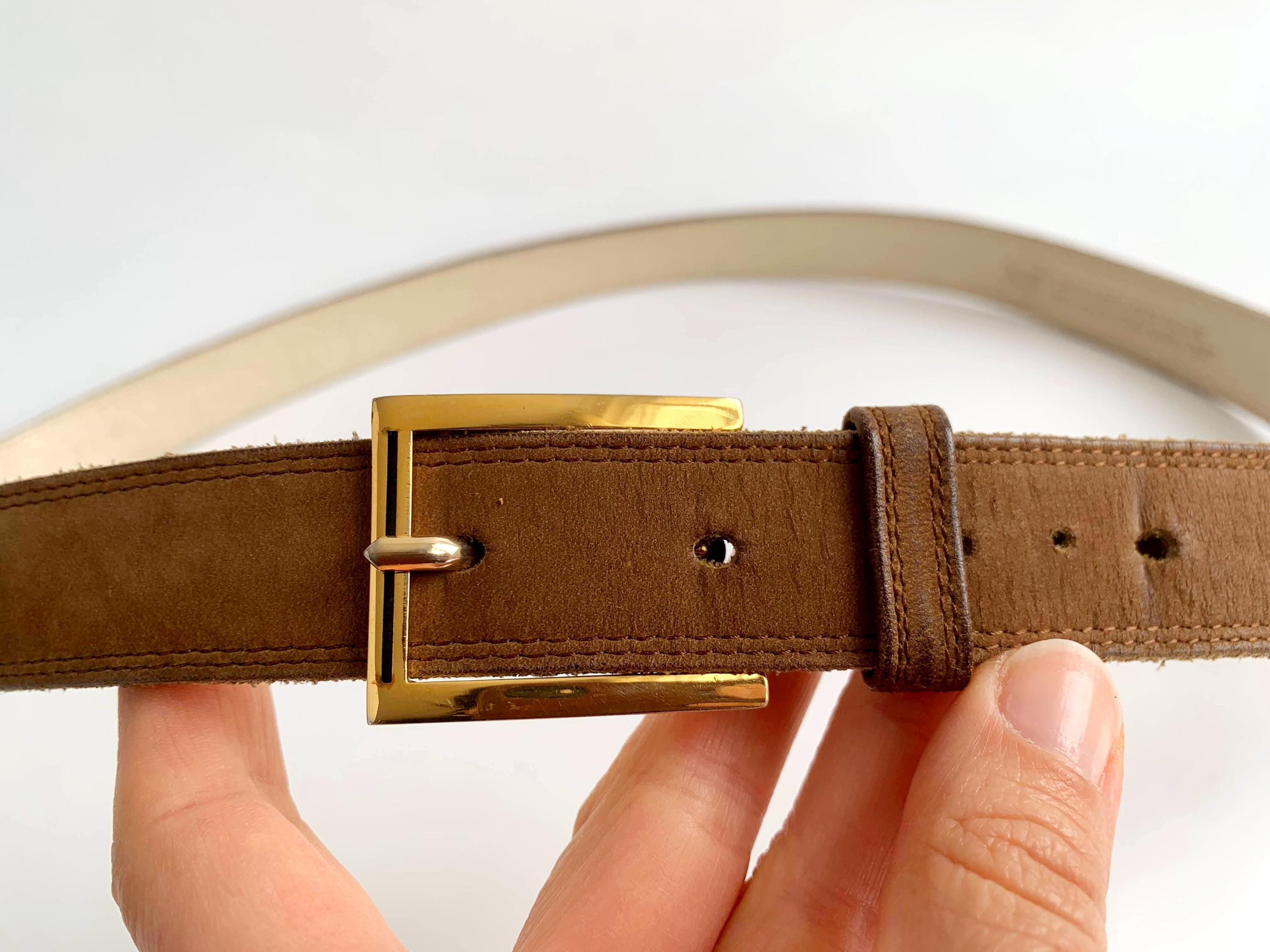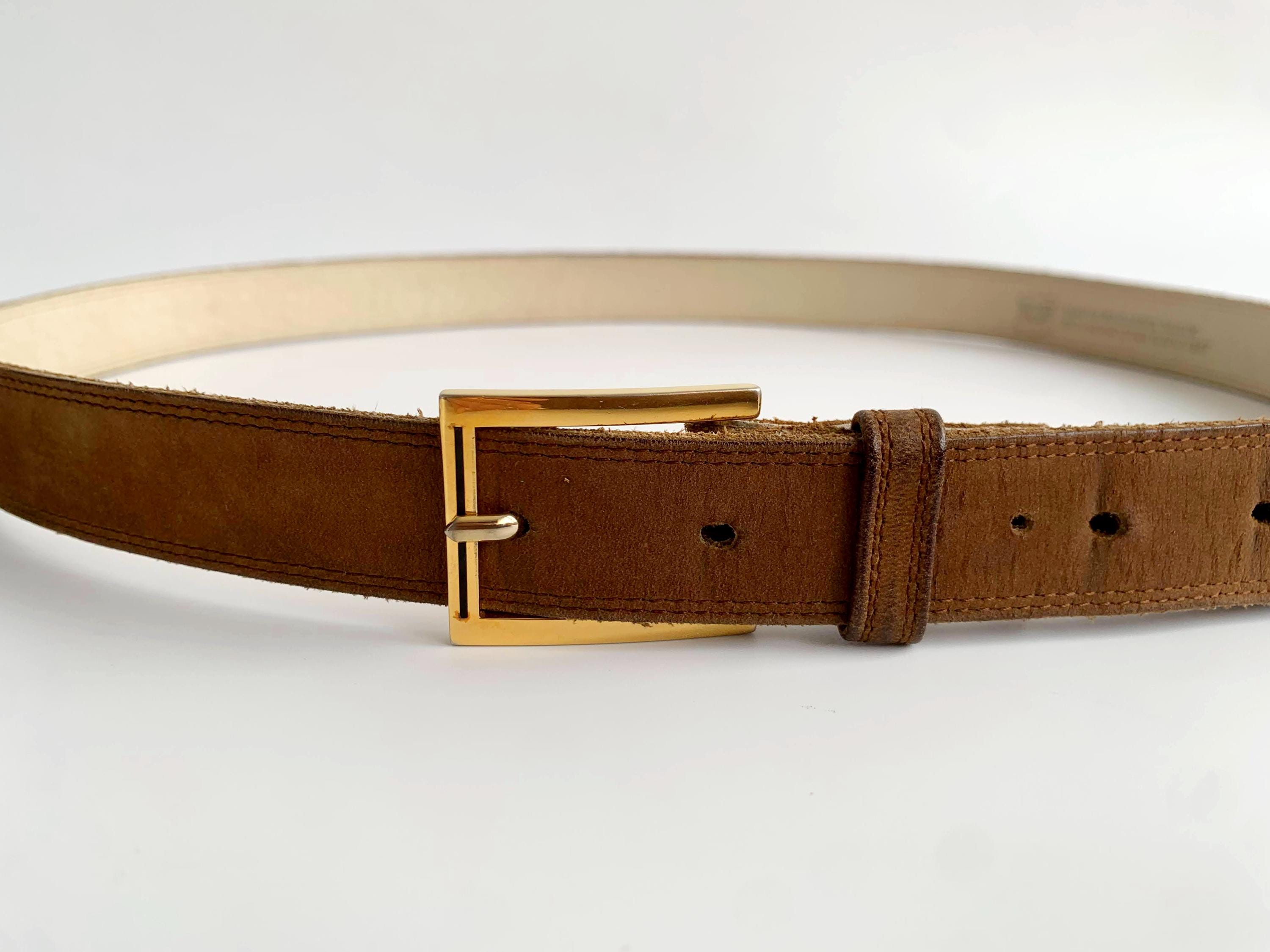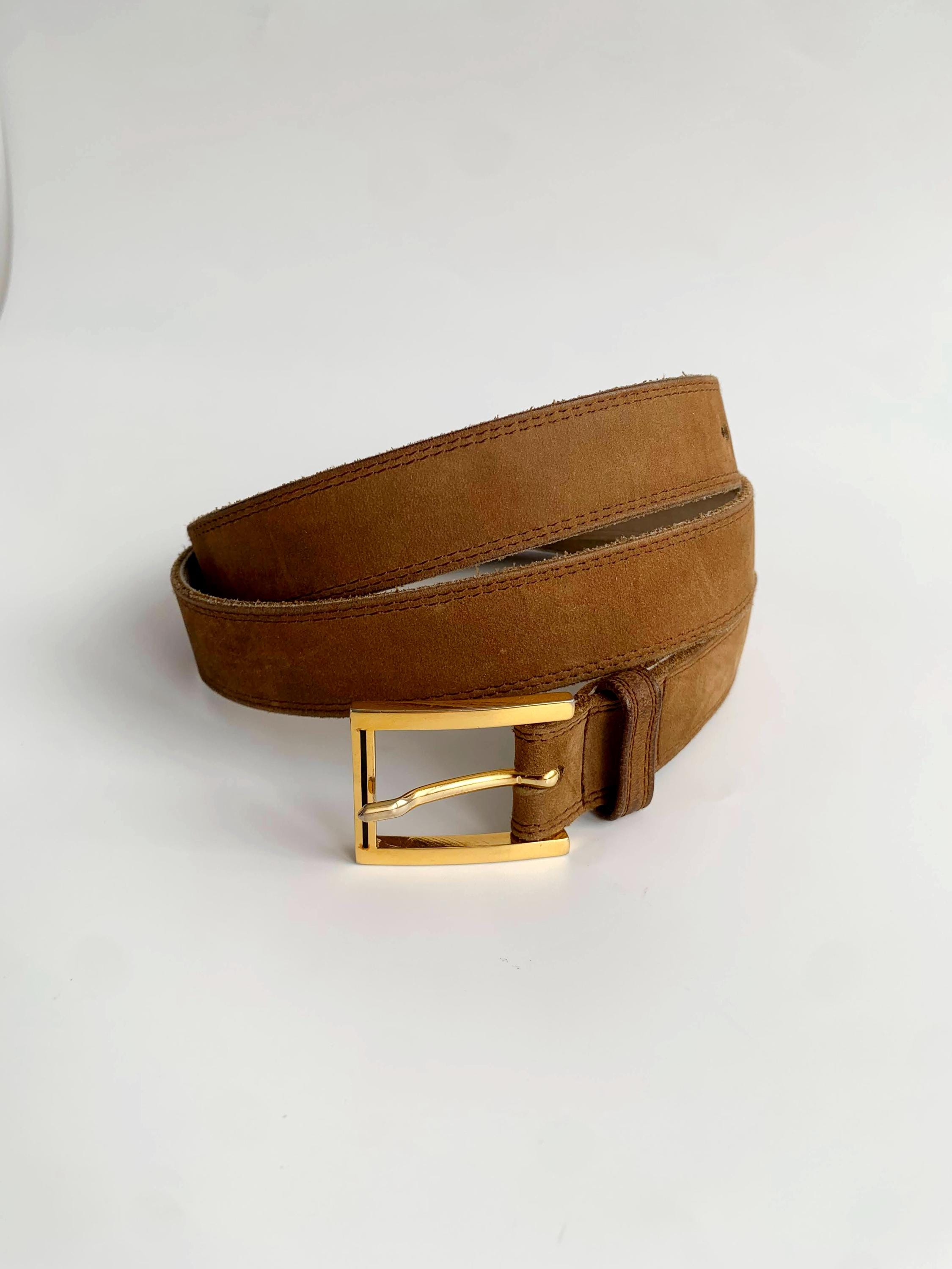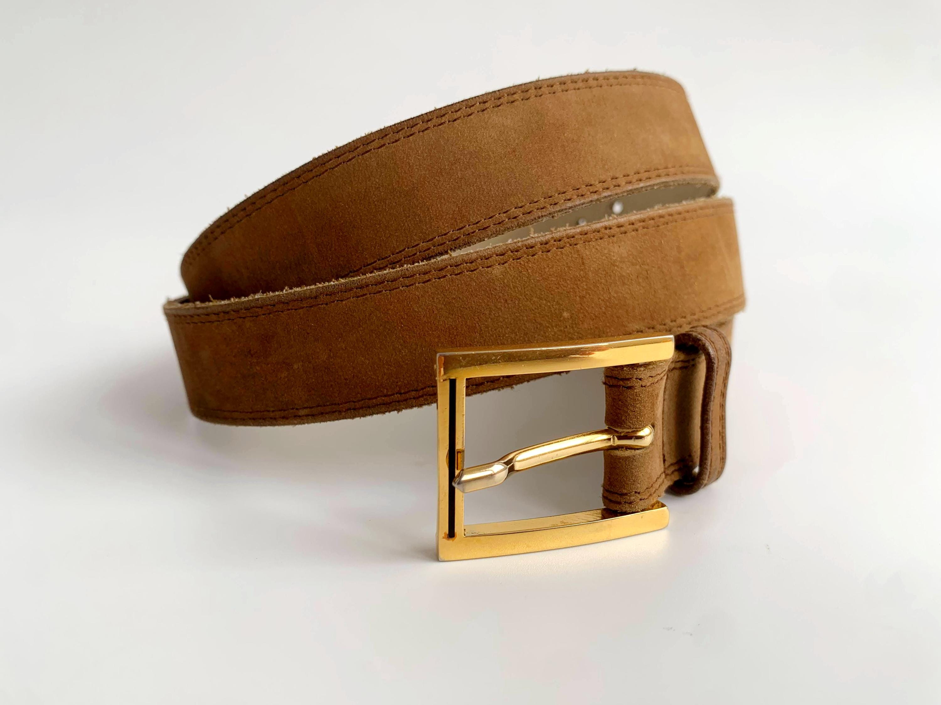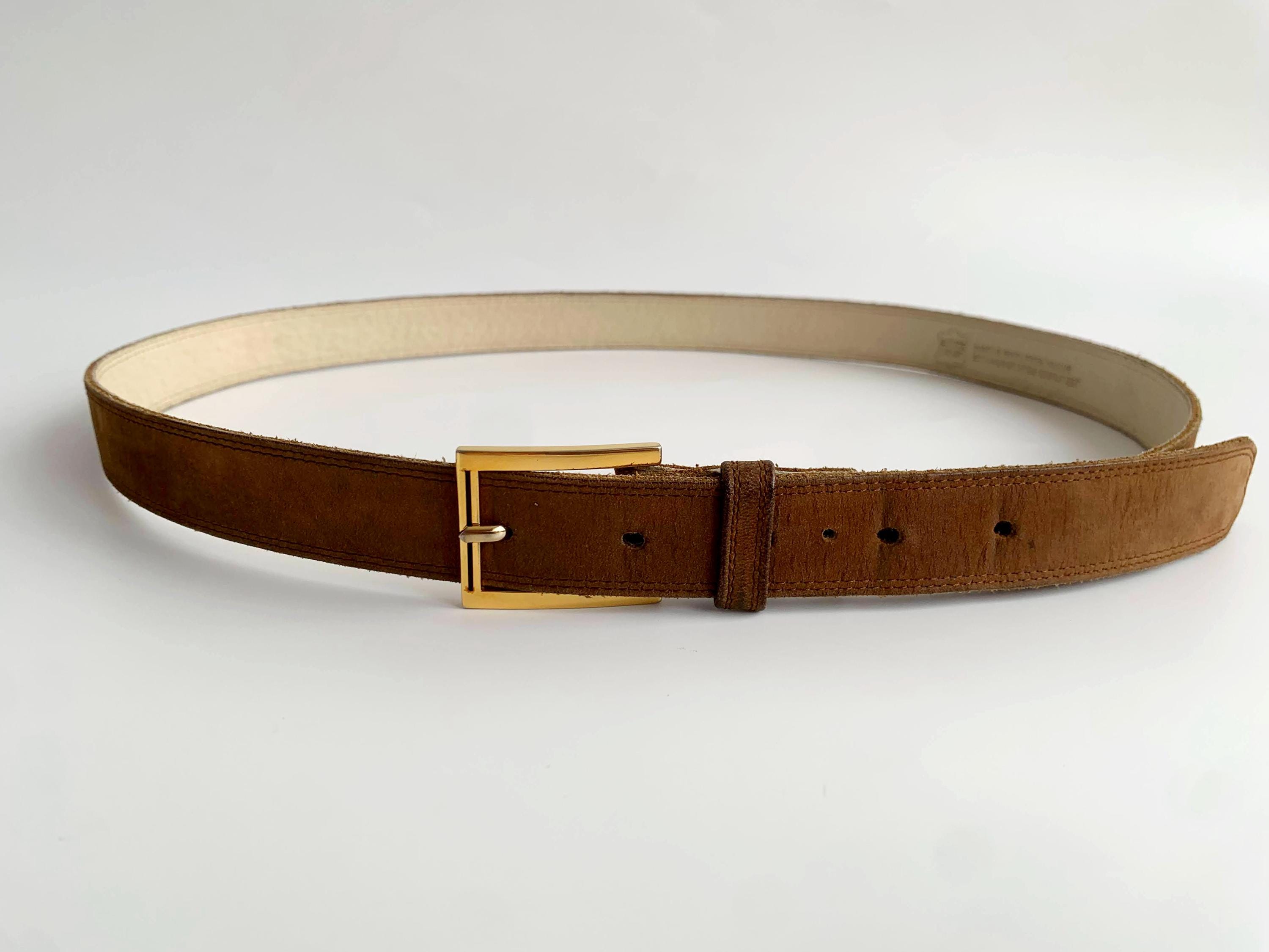 This is a vintage 90s beautiful skinny camel brown/ khaki suede leather belt with gold tone rectangular buckle. This slim waist belt is made of real suede leather.
