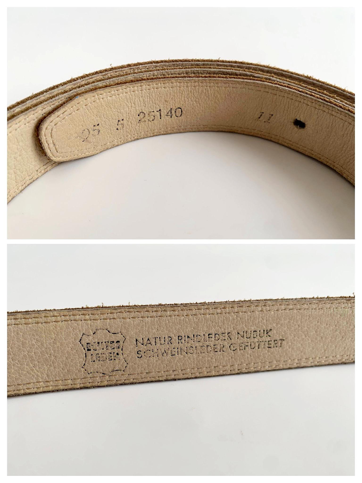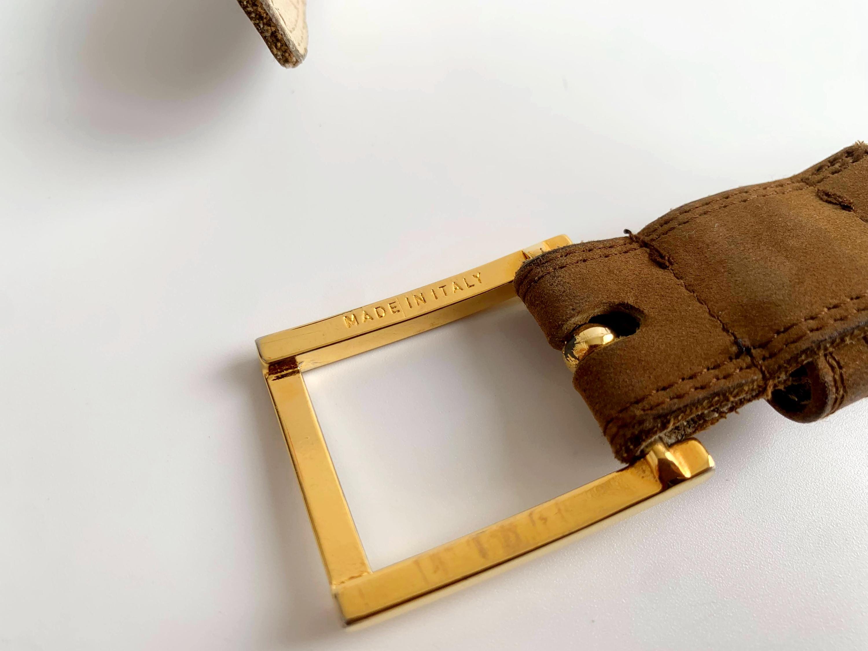 Condition: Beautiful pre-loved vintage condition with some signs of wear. There are some fine scratches on the gold tone buckle and some marks on the nubuck leather surface, but overall beautiful condition