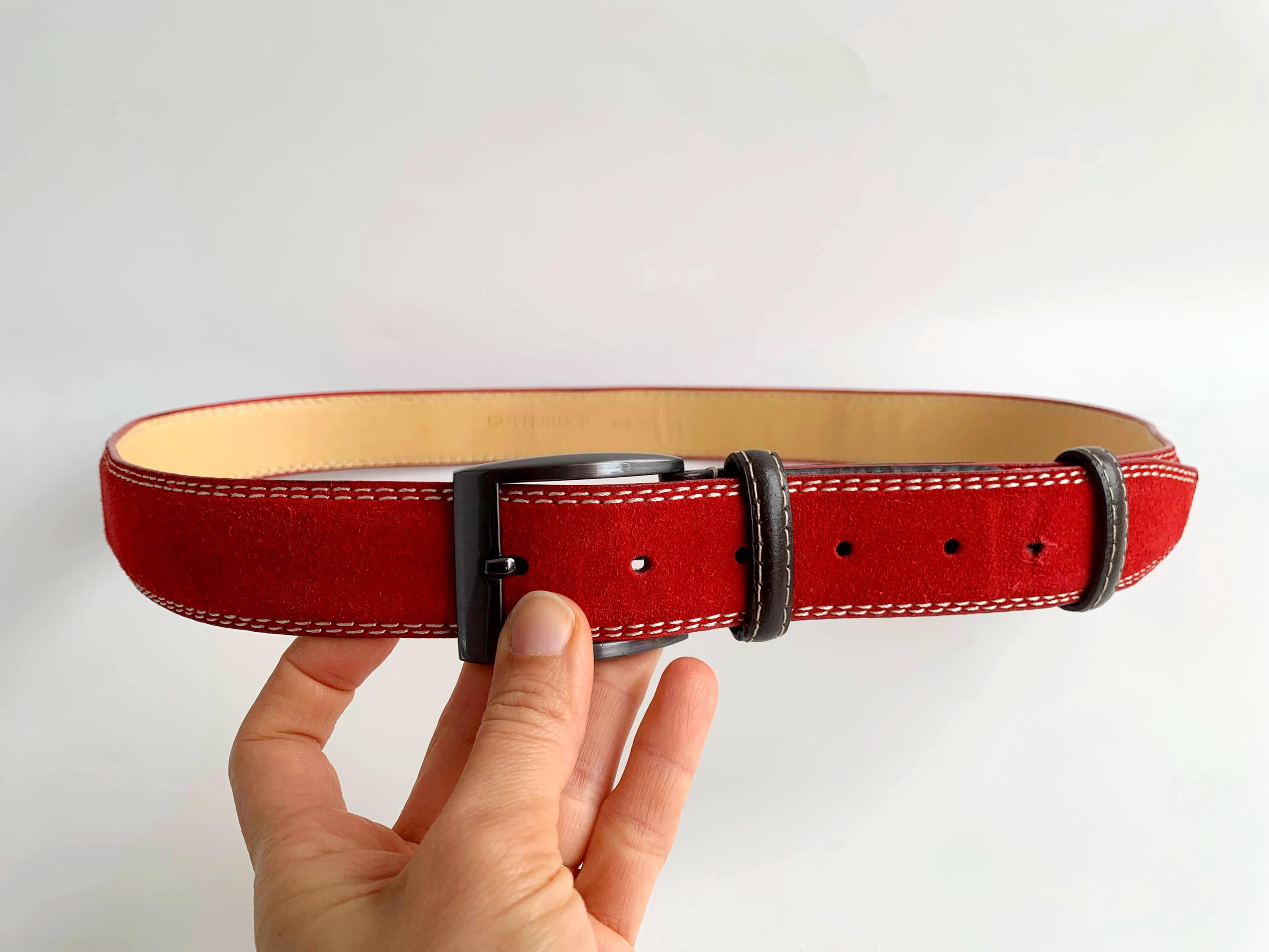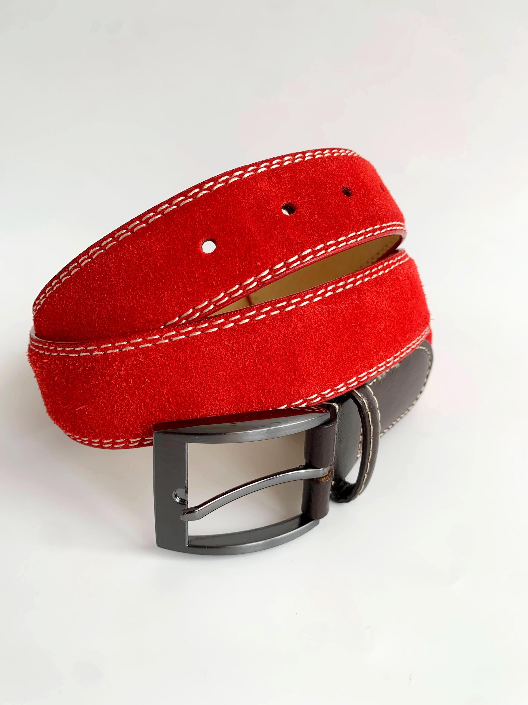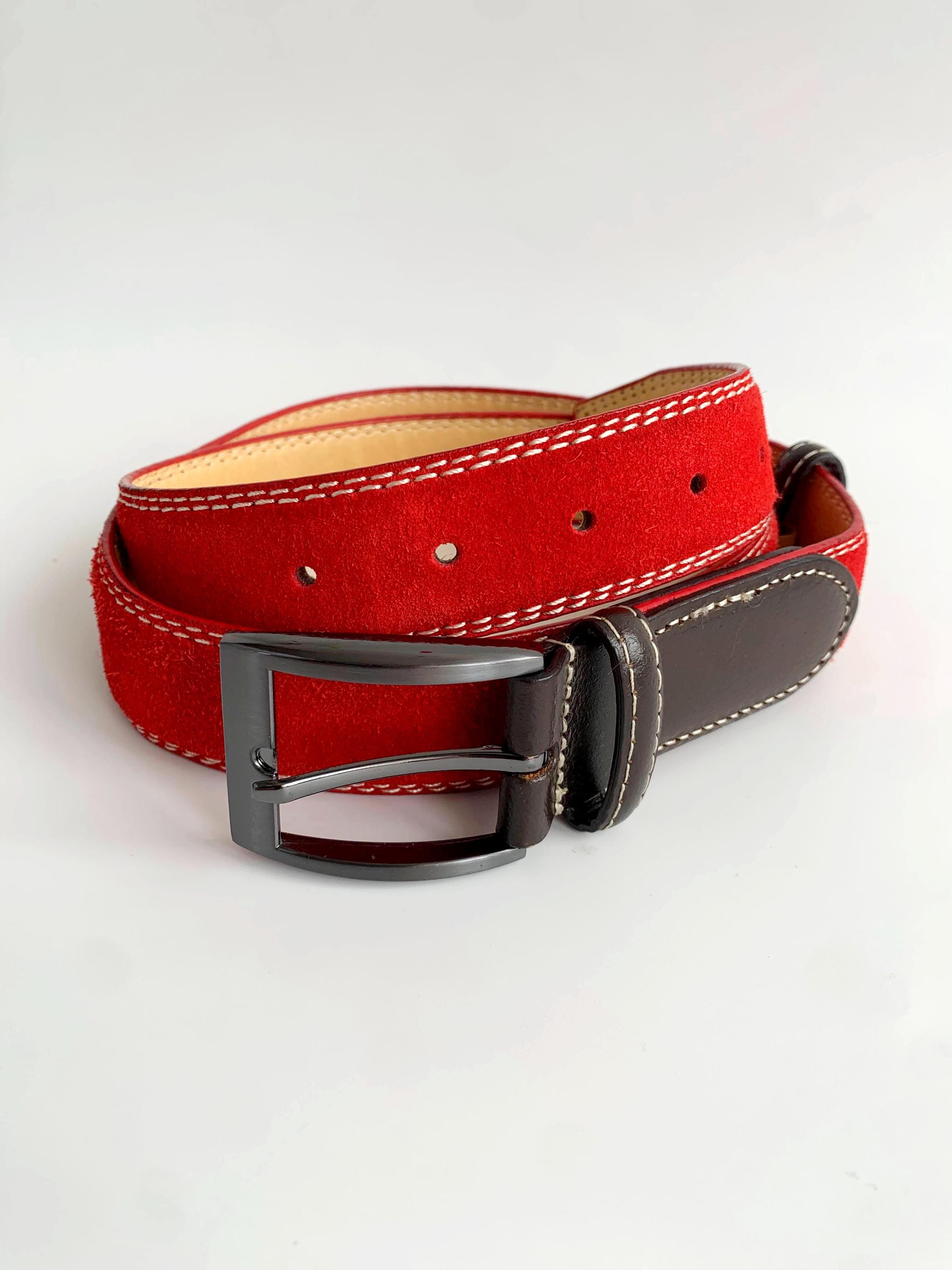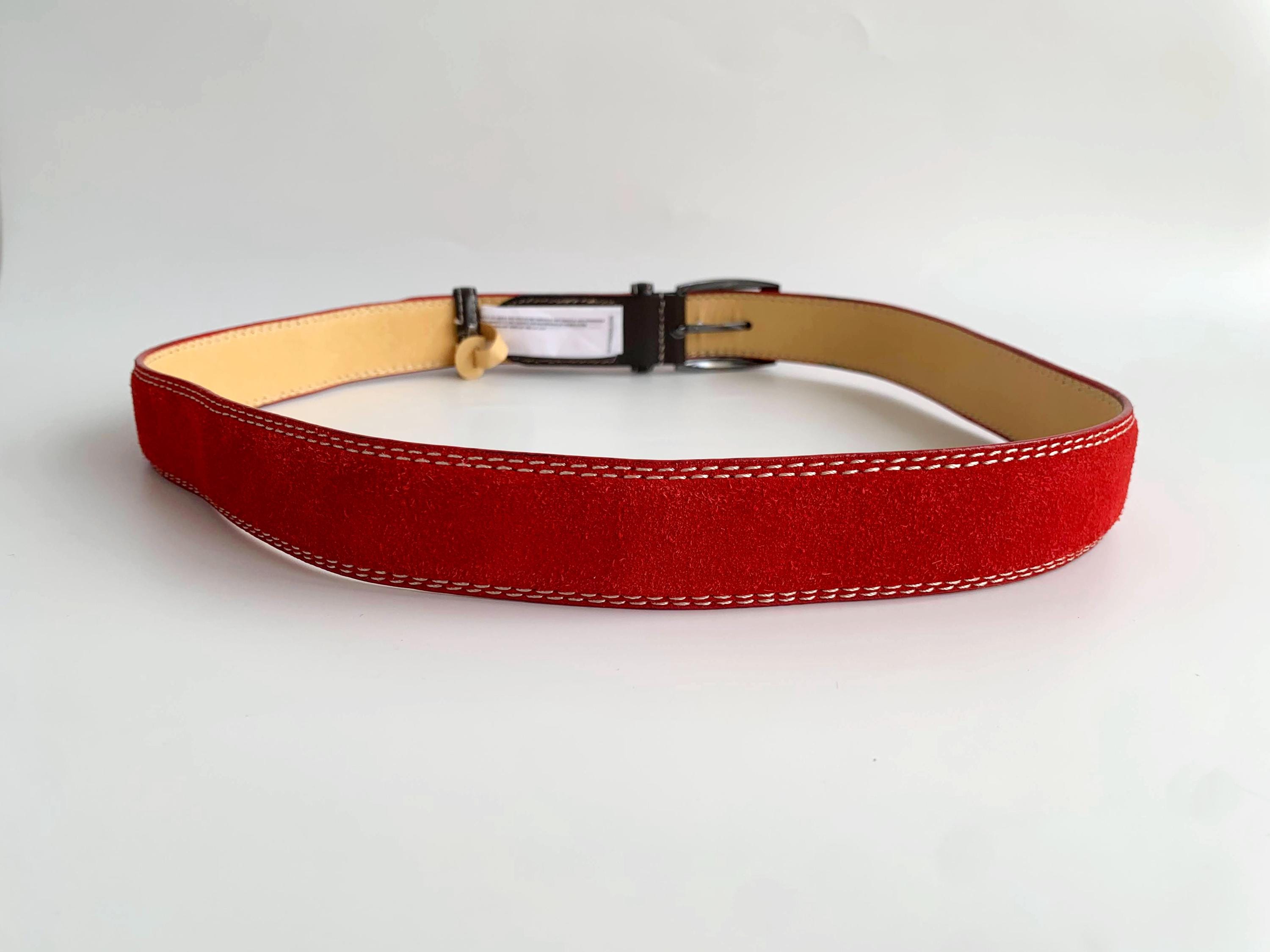 This is a beautiful vintage Y2K red suede leather belt made of real suede leather with oxidized silver tone buckle and brown leather detailing. The size marked is 110 cm / 43.4".