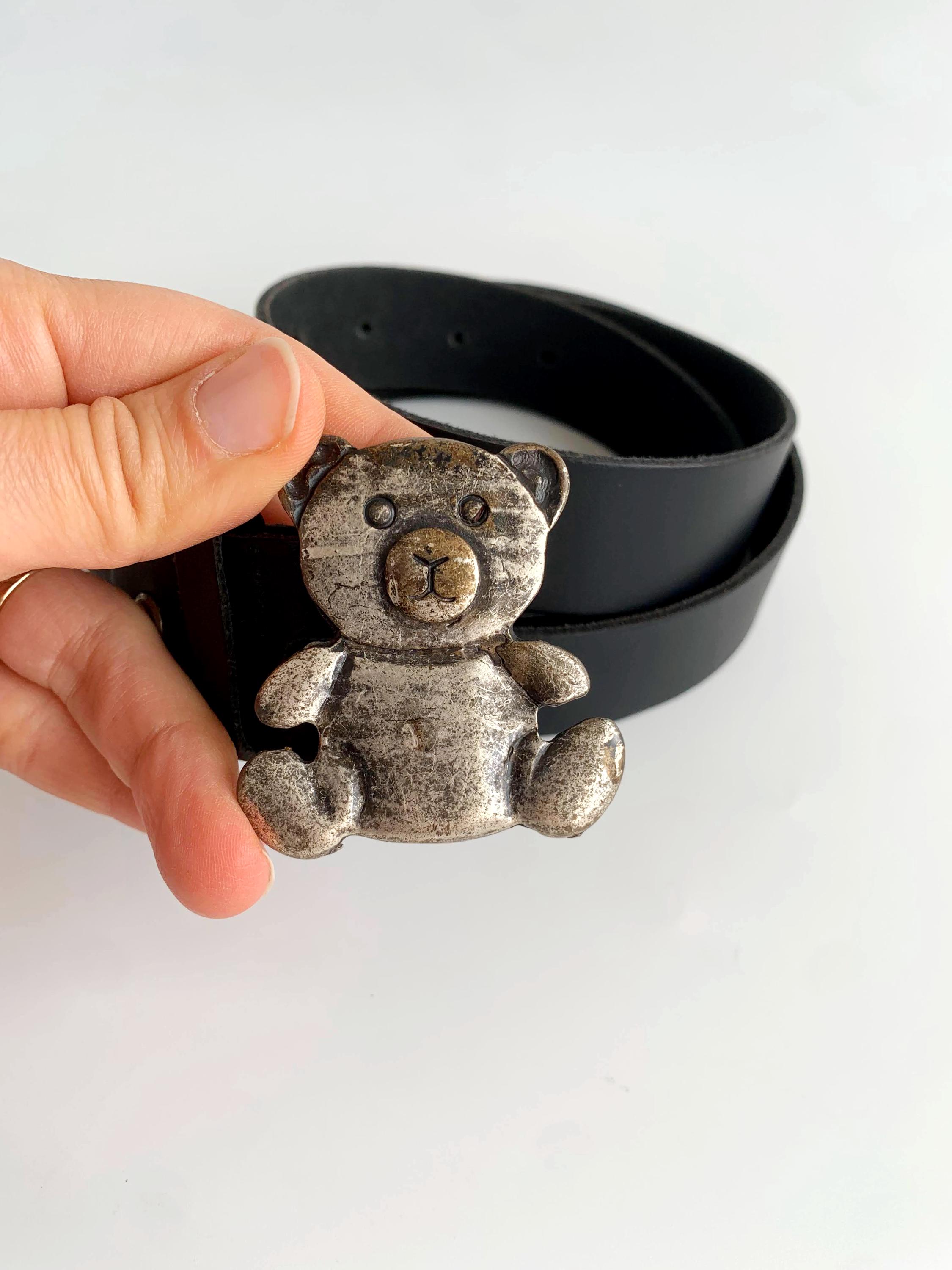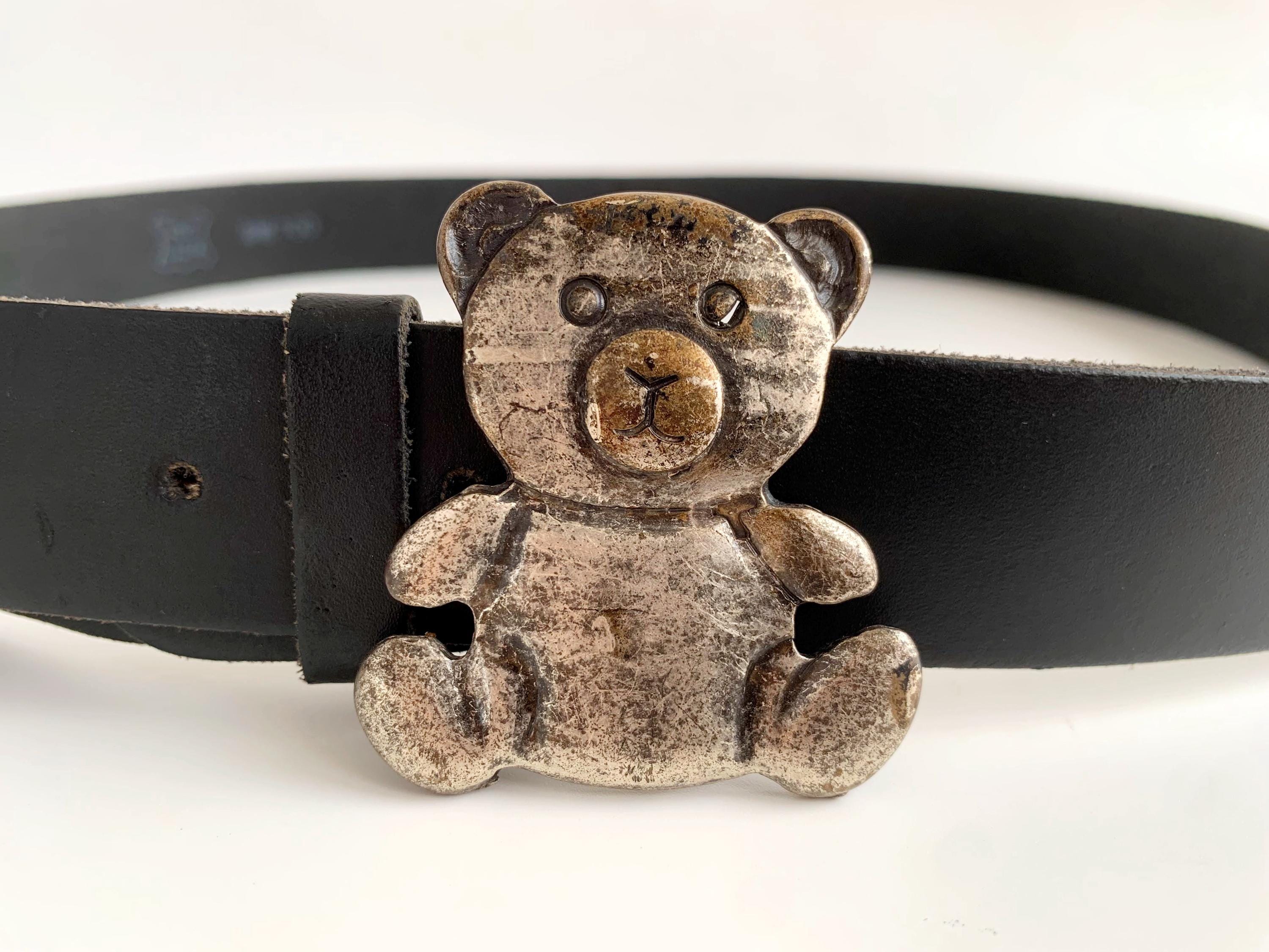 This is a simple black leather jeans belt for women from the 90s with cute silver tone bear buckle. This simple black belt is made of genuine leather in jet black color with unique statement Teddy Bead silver tone buckle. The size marked is 100 cm / 39.4" .Perfect modest belt that you can wear with jeans, dresses or coats.