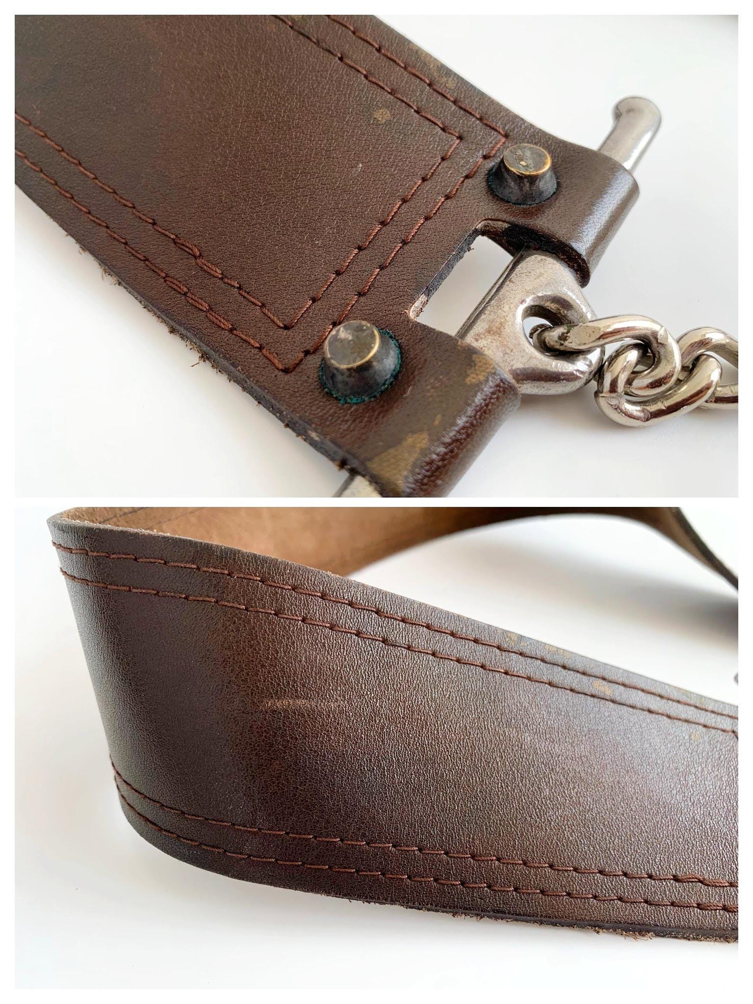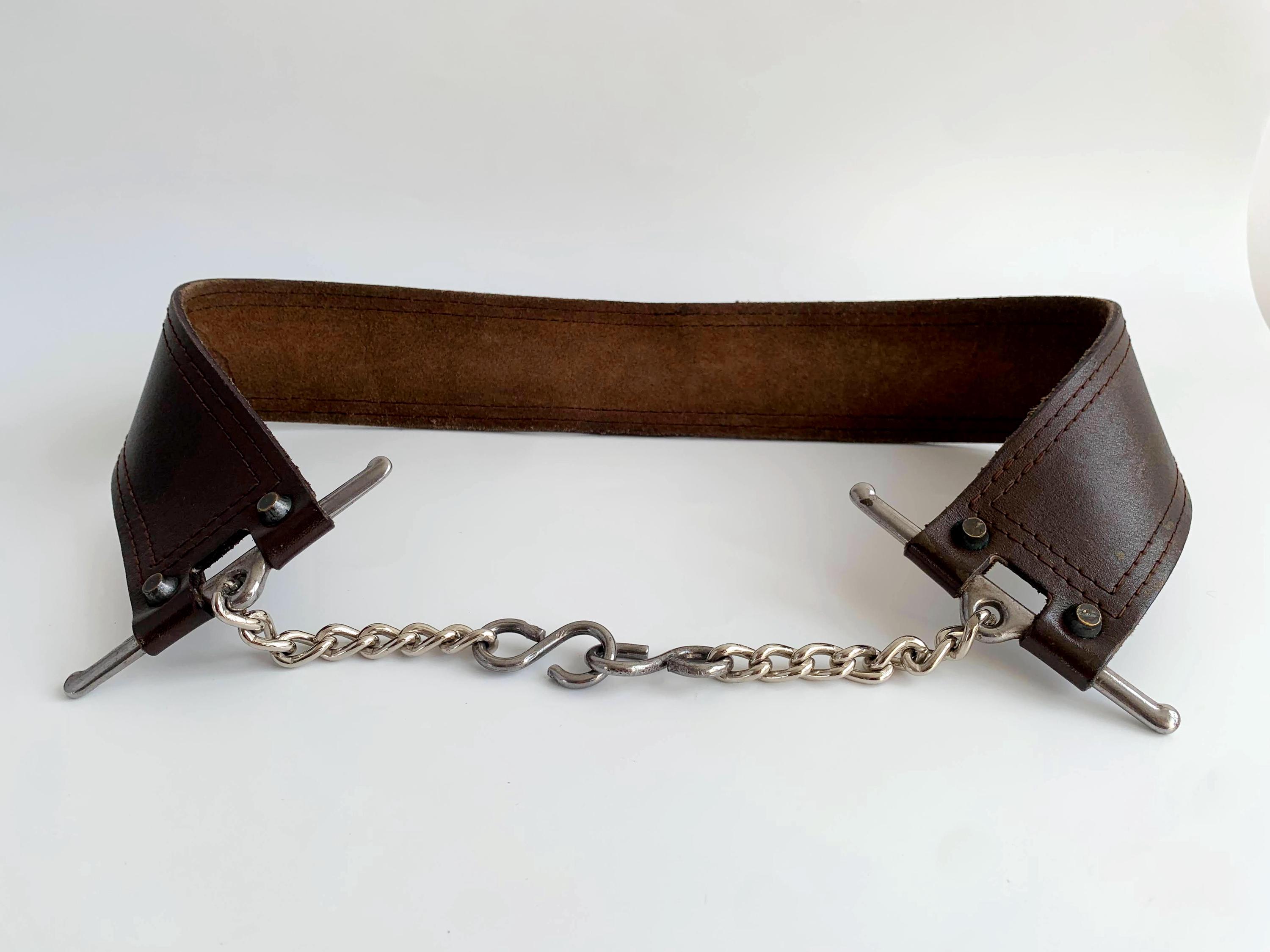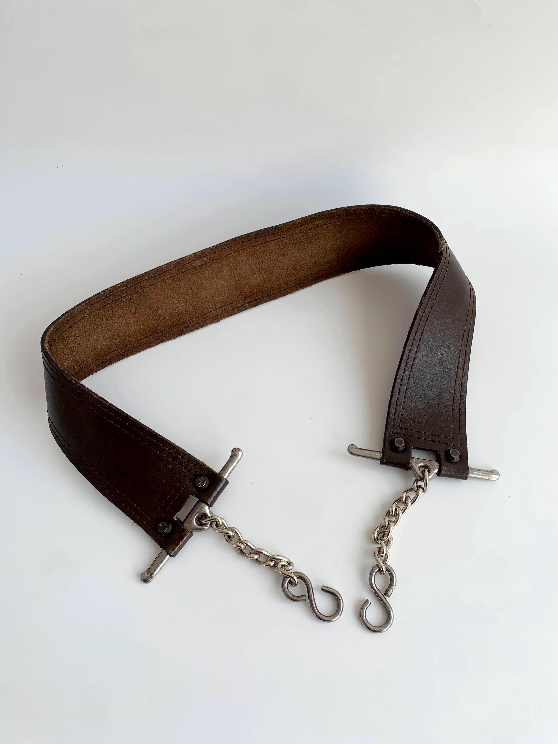 This is a vintage wxtra wide brown leather belt with silver tone interlocking chain clasp.