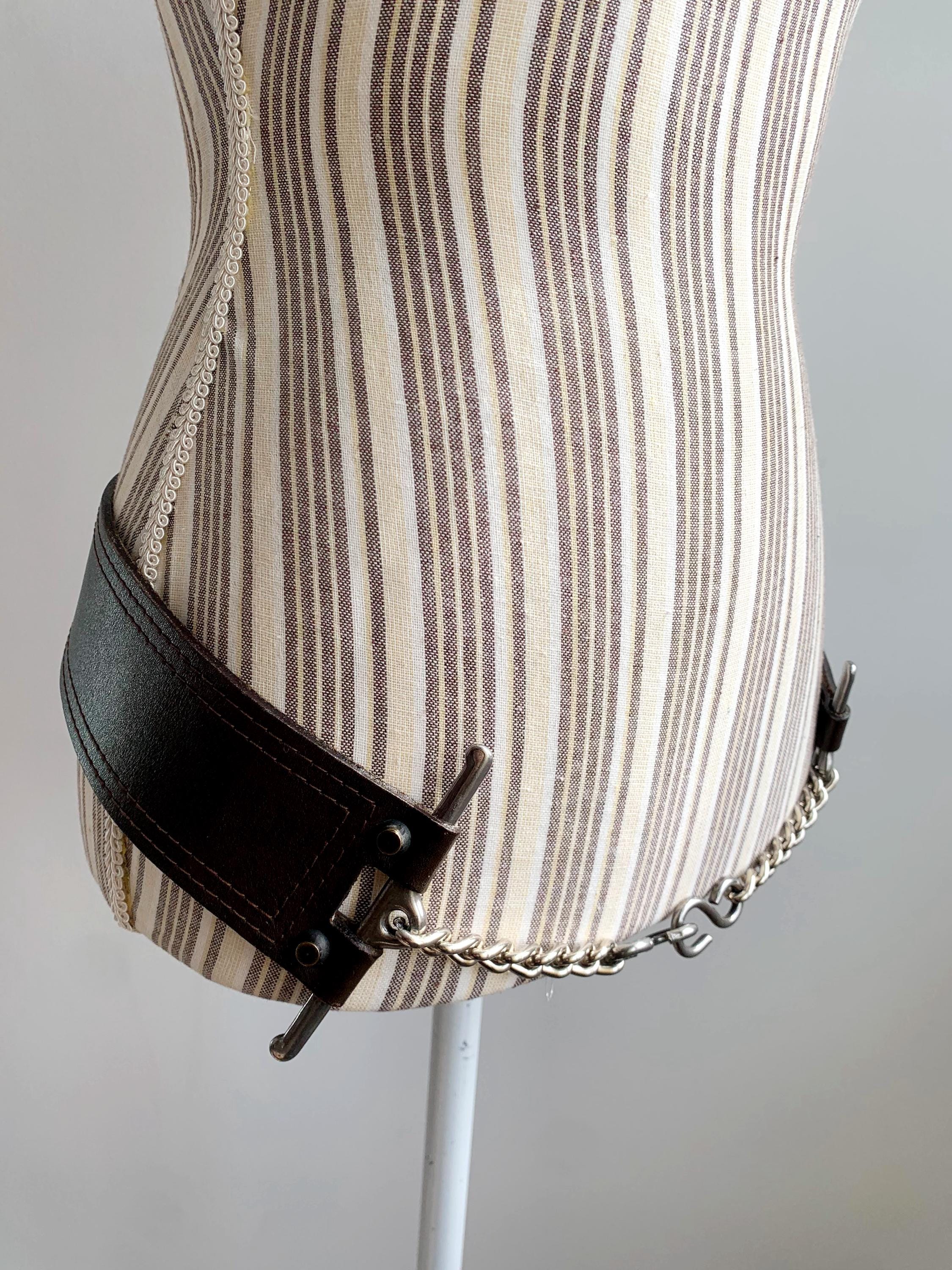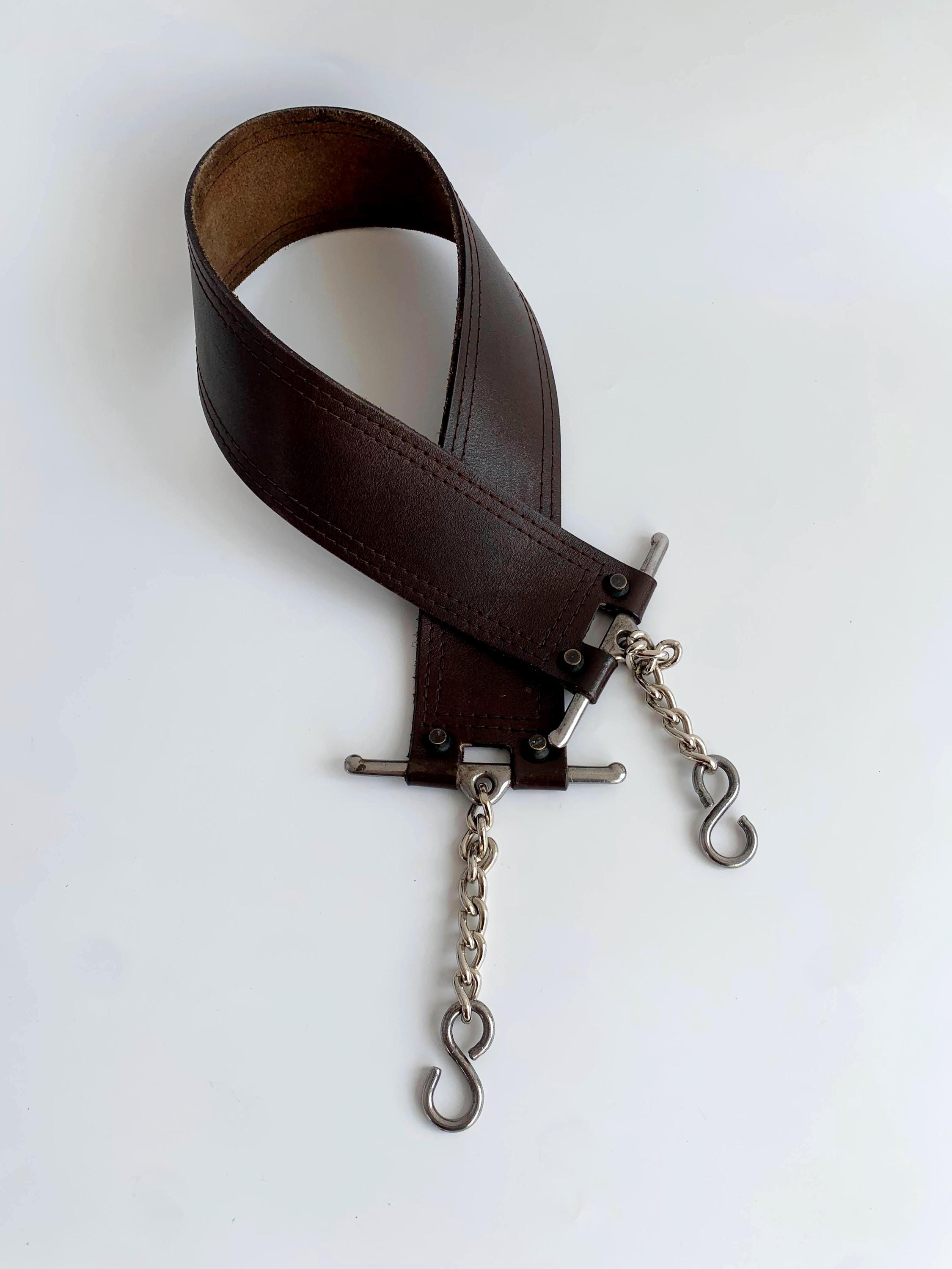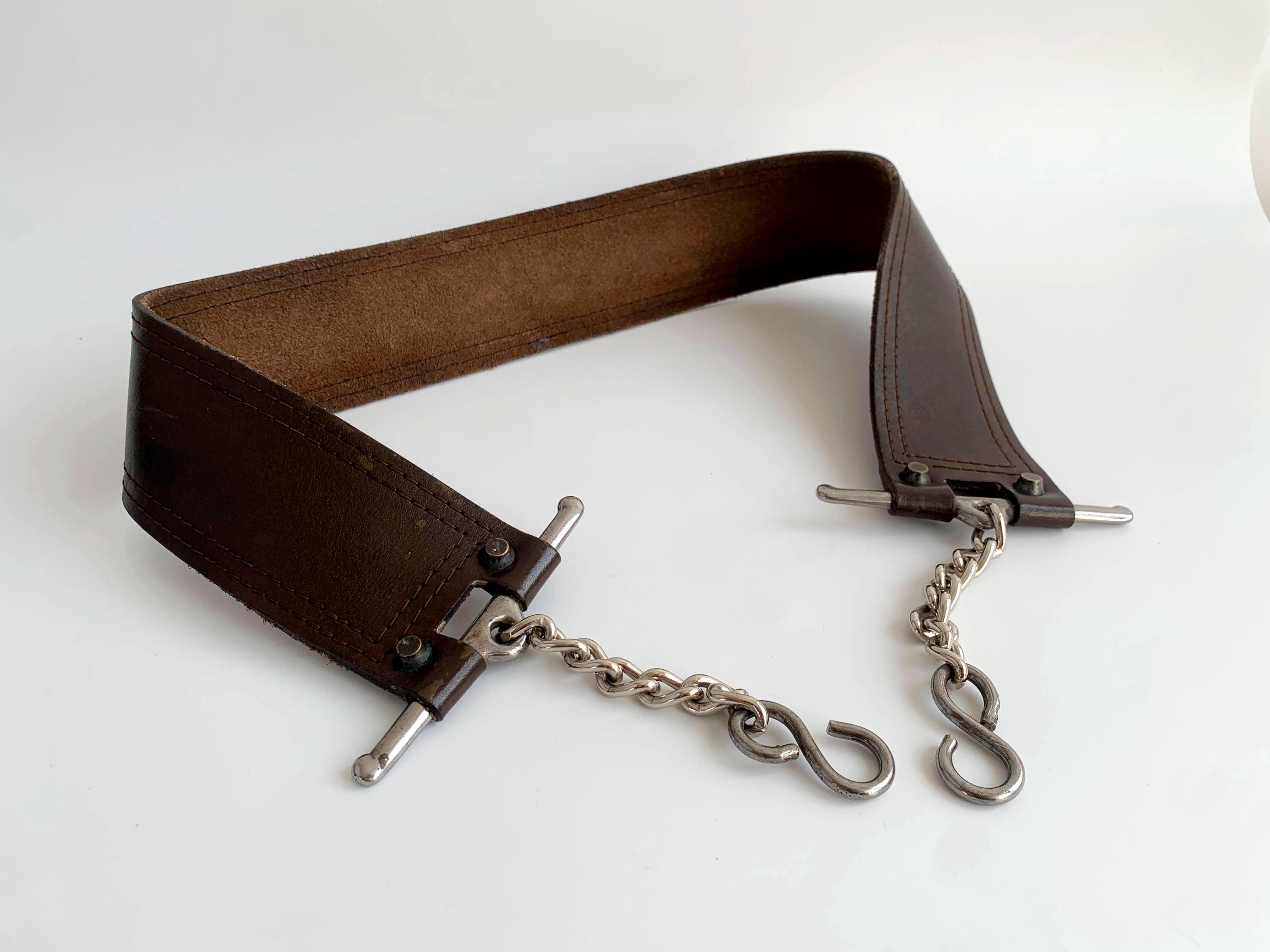This is a vintage wxtra wide brown leather belt with silver tone interlocking chain clasp.