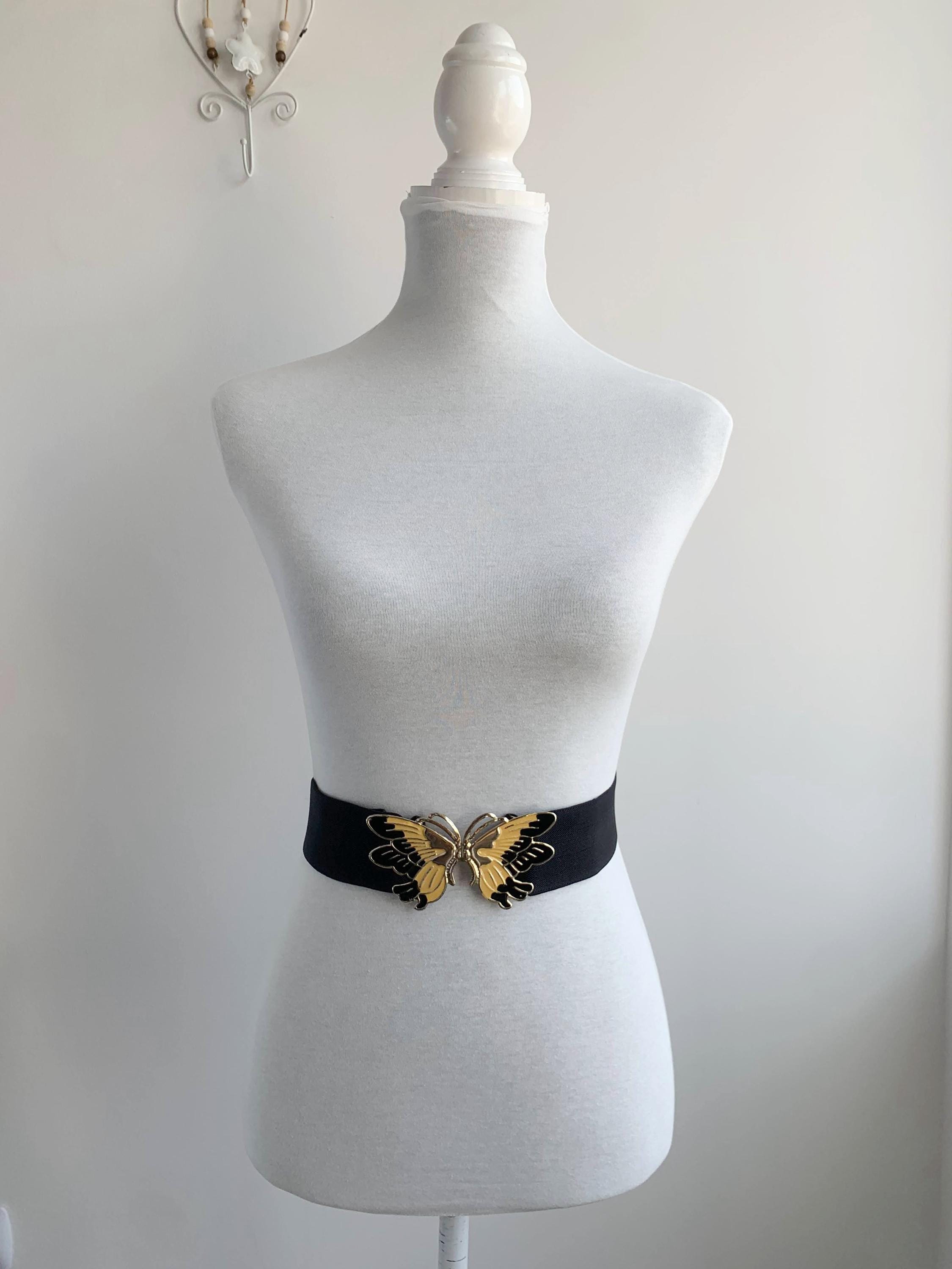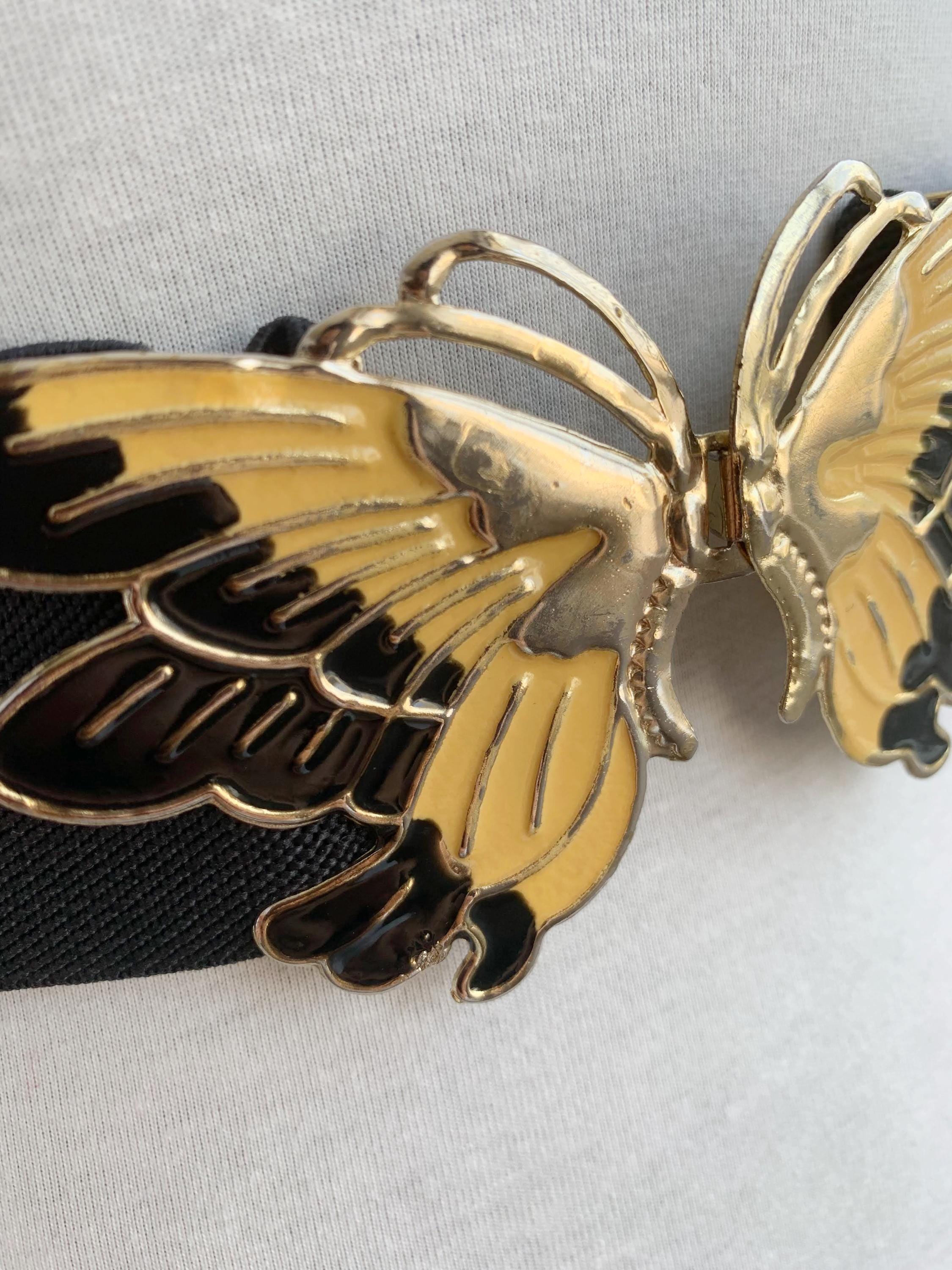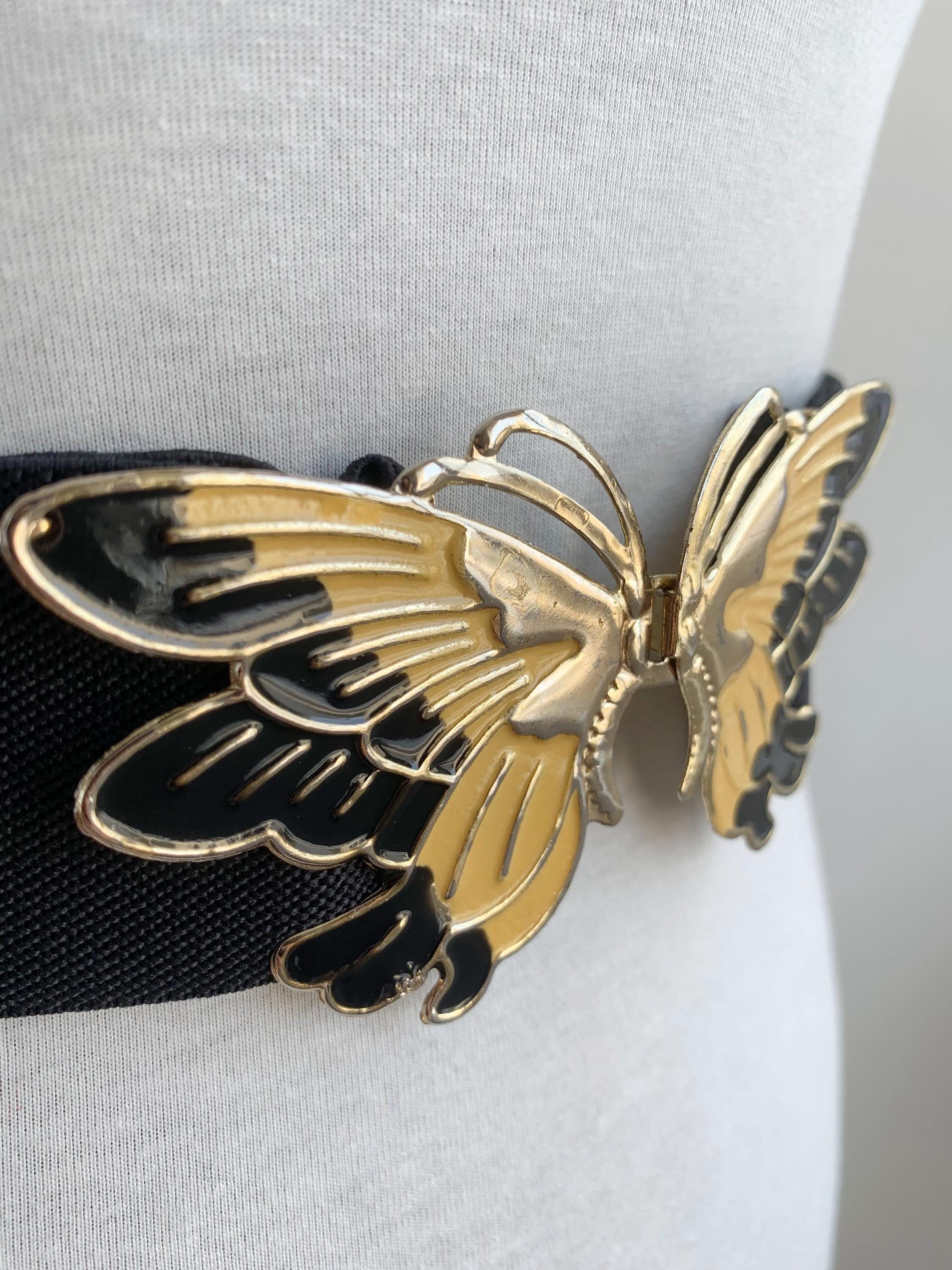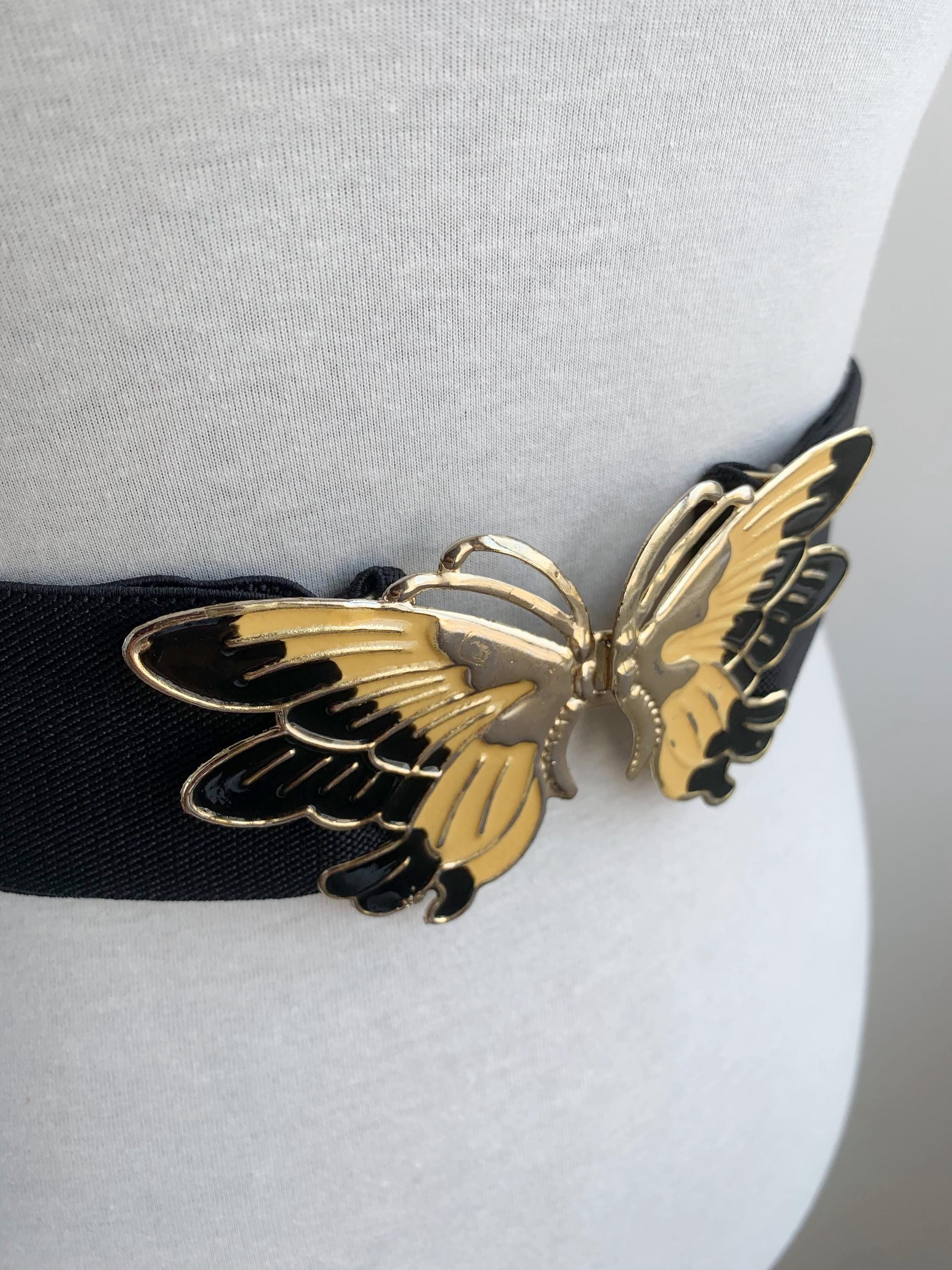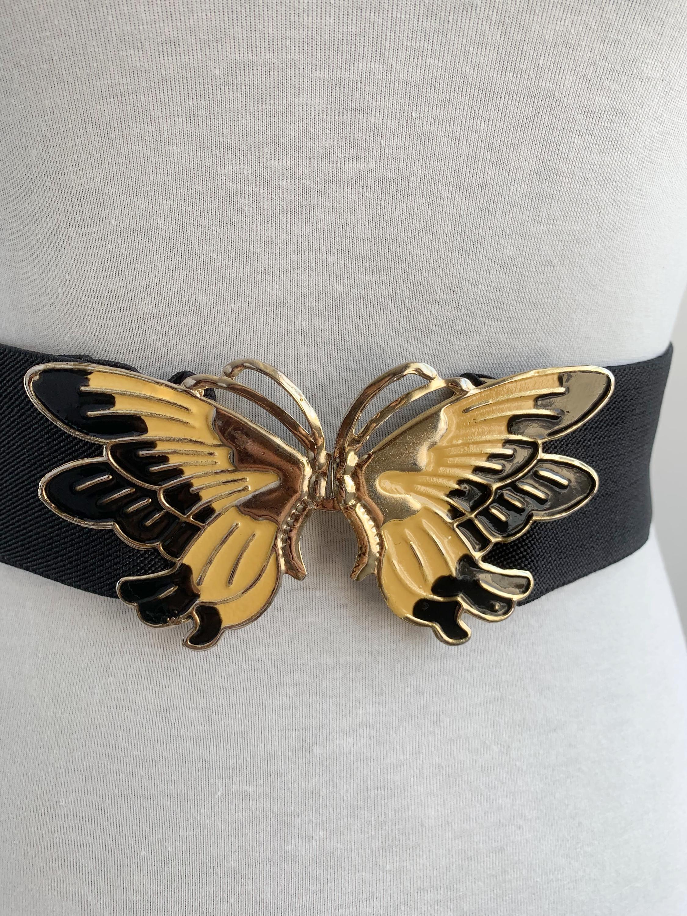 This is a lovely vintage 90s pre-loved wide black elastic belt with beautiful statement butterfly enamelled buckle in black, gold and yellow. This adorable vintage waist cincher dates back to the 90s and it's in pre-loved vintage condition with some scratches on the butterfly buckle. This stretchy waist cincher has a wide elastic base which can be adjusted underneath the butterfly interlocking clasp. This statement retro belt is perfect for proms, weddings and other special occasions. This 90s waist cincher will make a great gift for bold ladies who now how to show class and style and be intriguing at the same time.