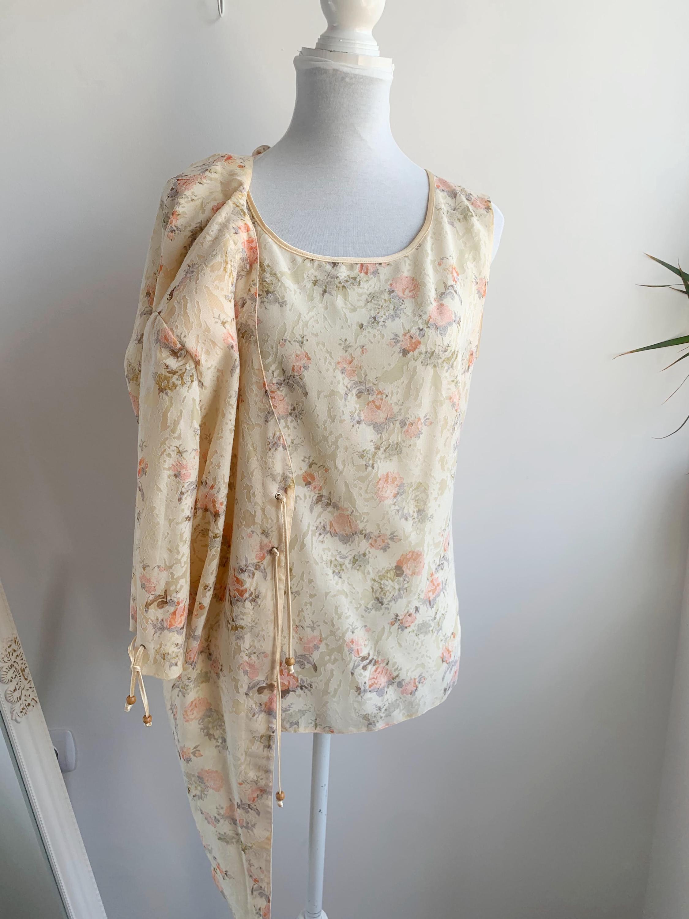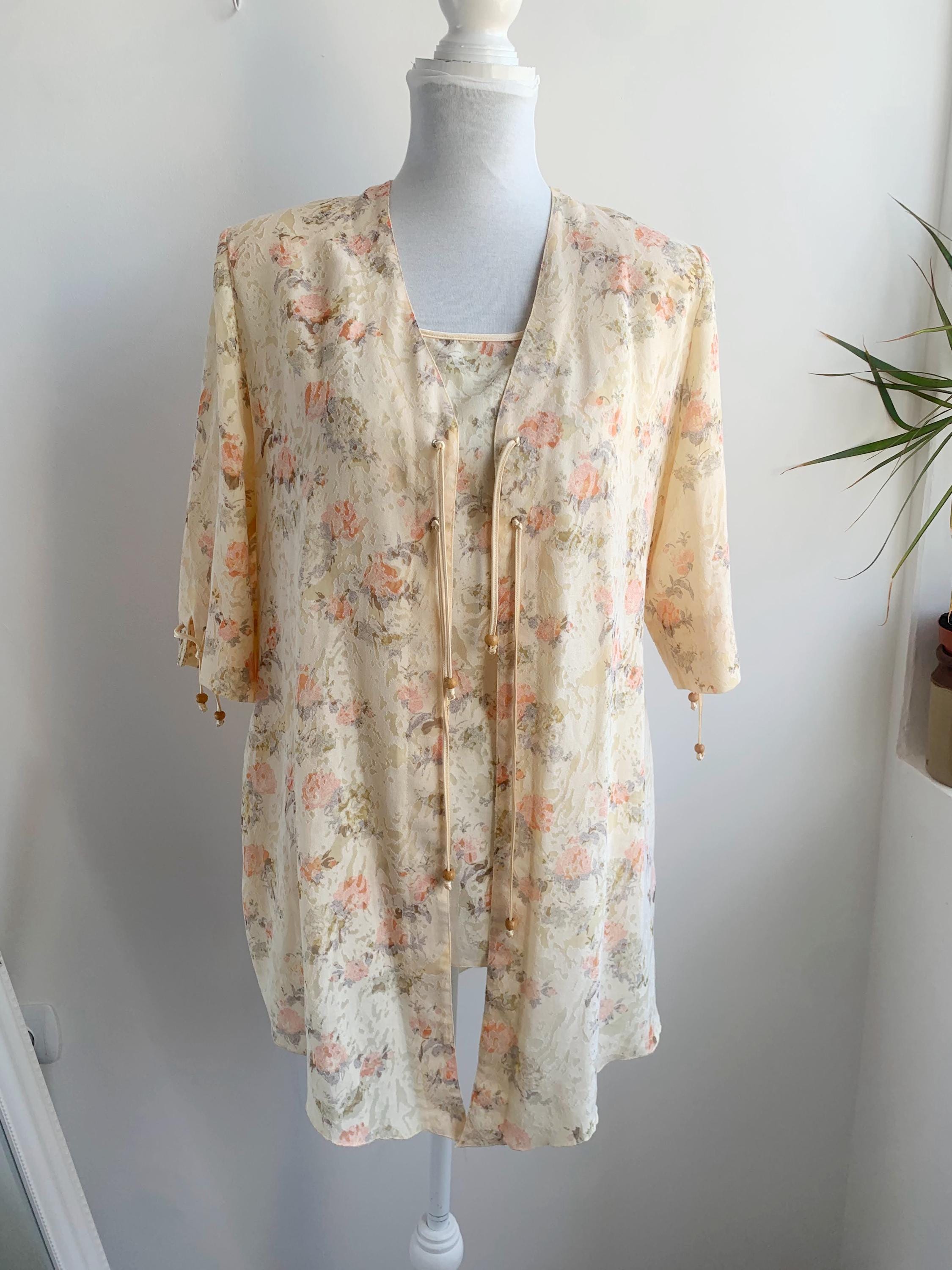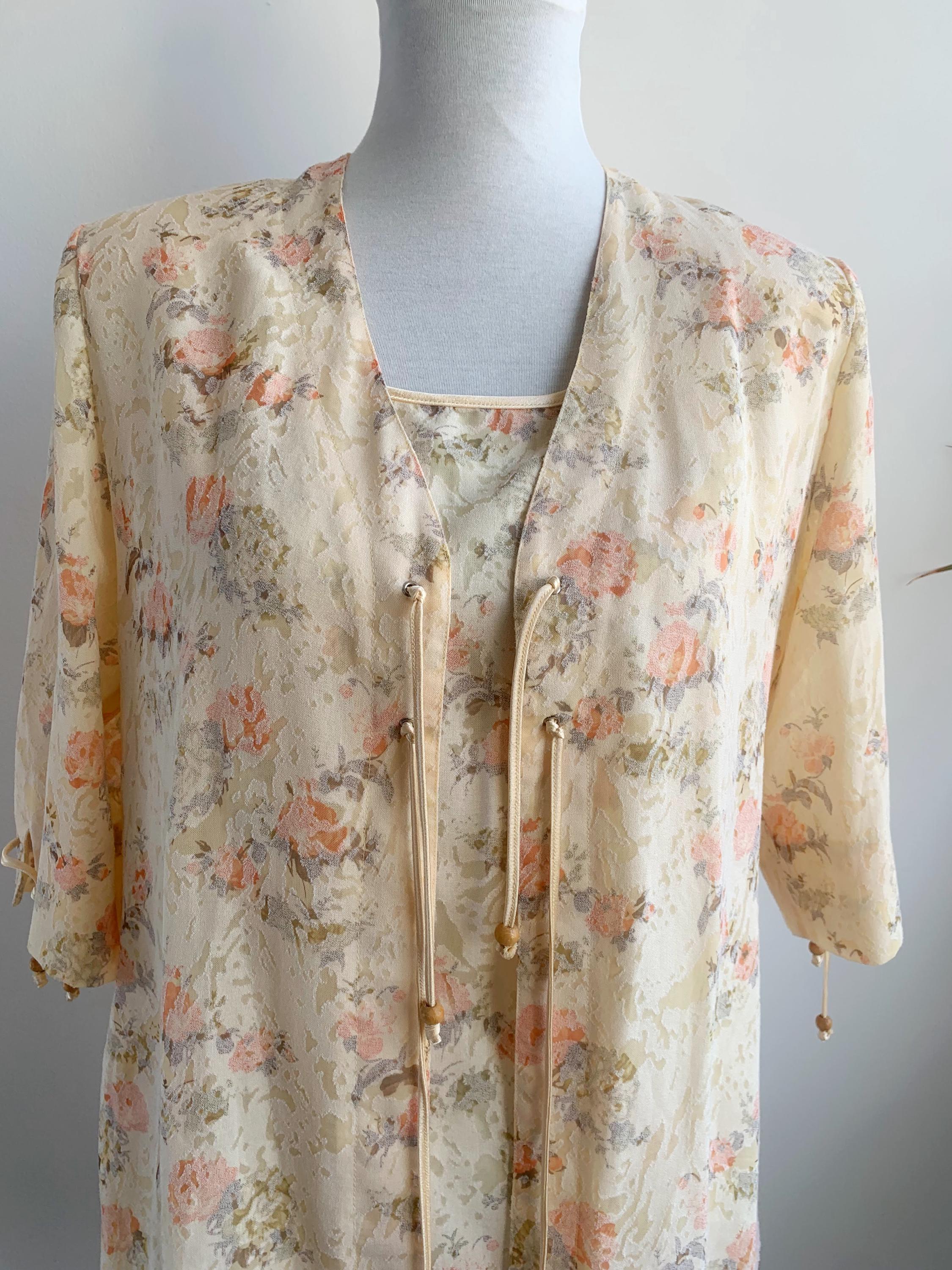 This vintage 90s exquisite ensemble features a sleeveless tank top with zip up back and a perfectly matching open-front short sleeve kimono-style jacket. Both pieces are adorned with a subtle, textured floral pattern in a harmonious palette of soft peach, and gentle sage green, beautifully contrasted against a creamy, pale yellow background. The fabric itself has a subtle jacquard woven texture, adding depth beyond a simple print.