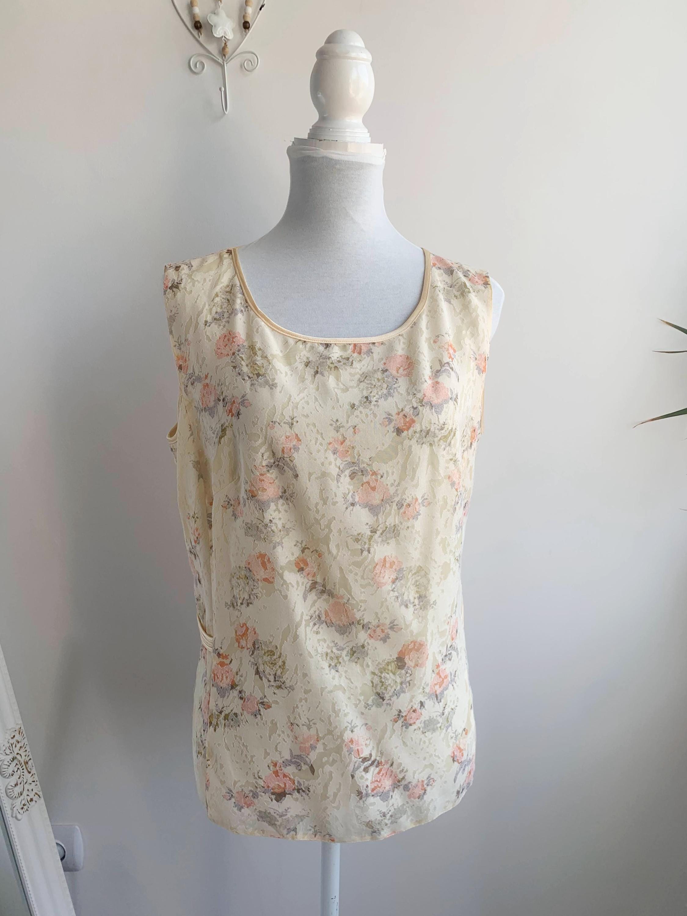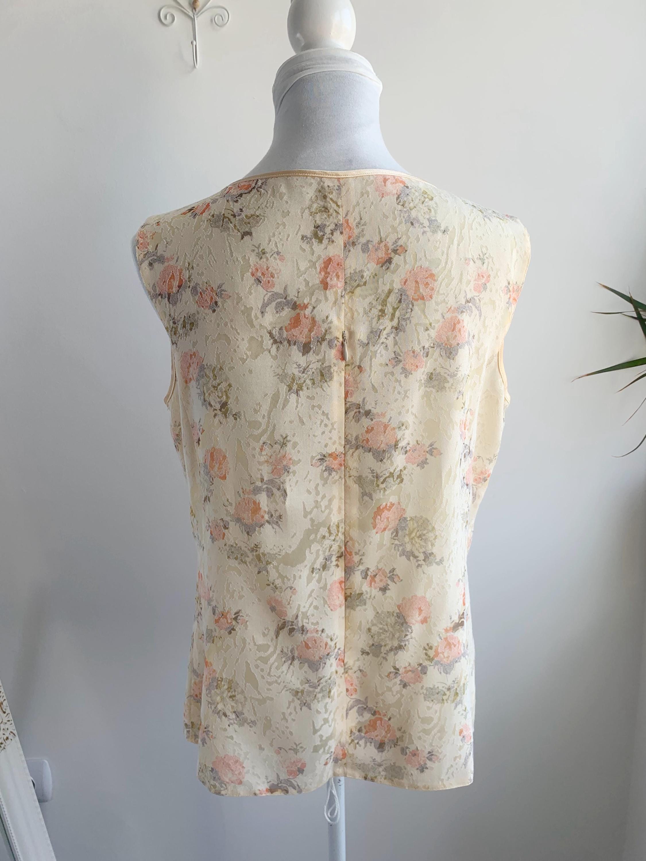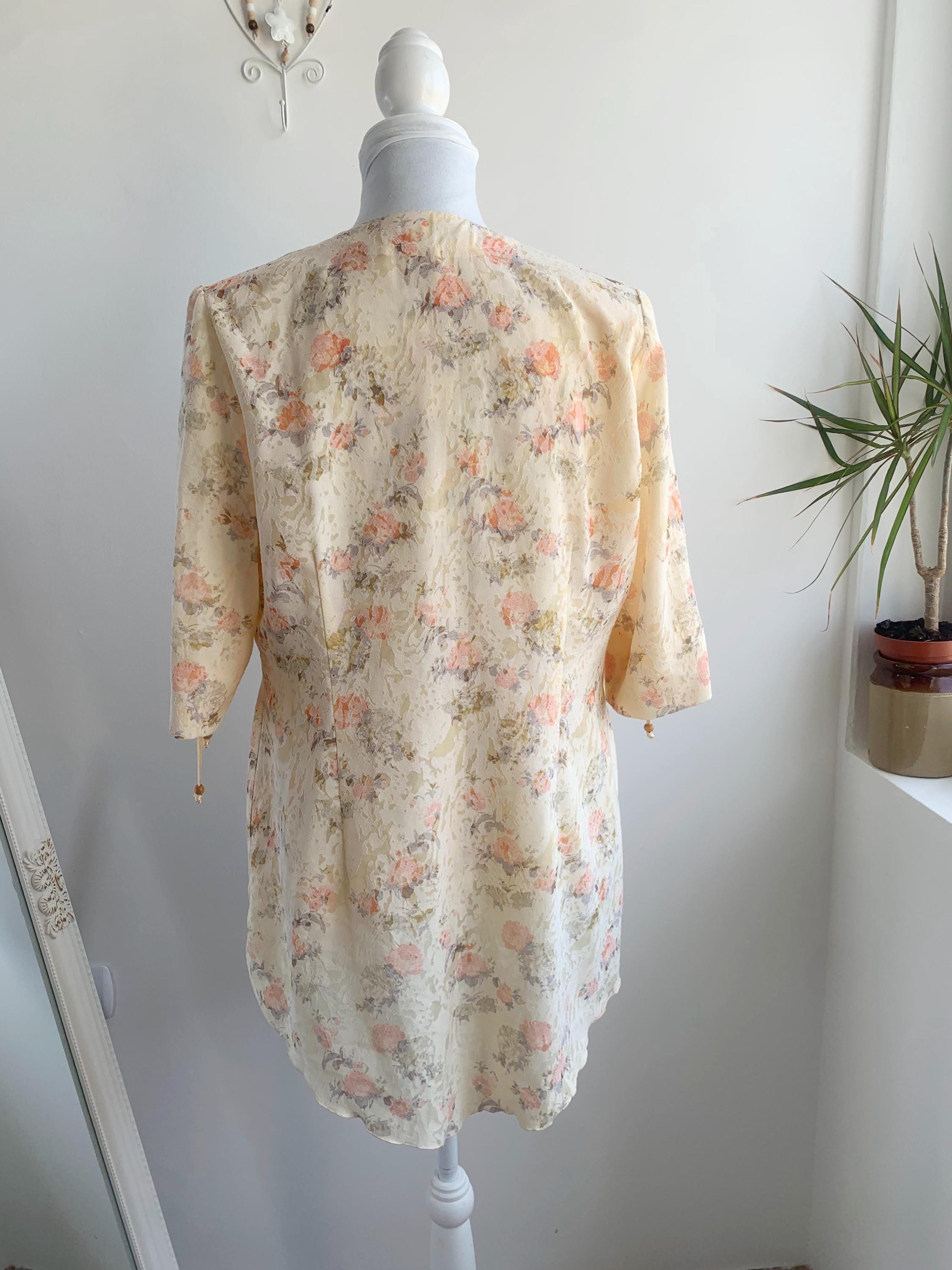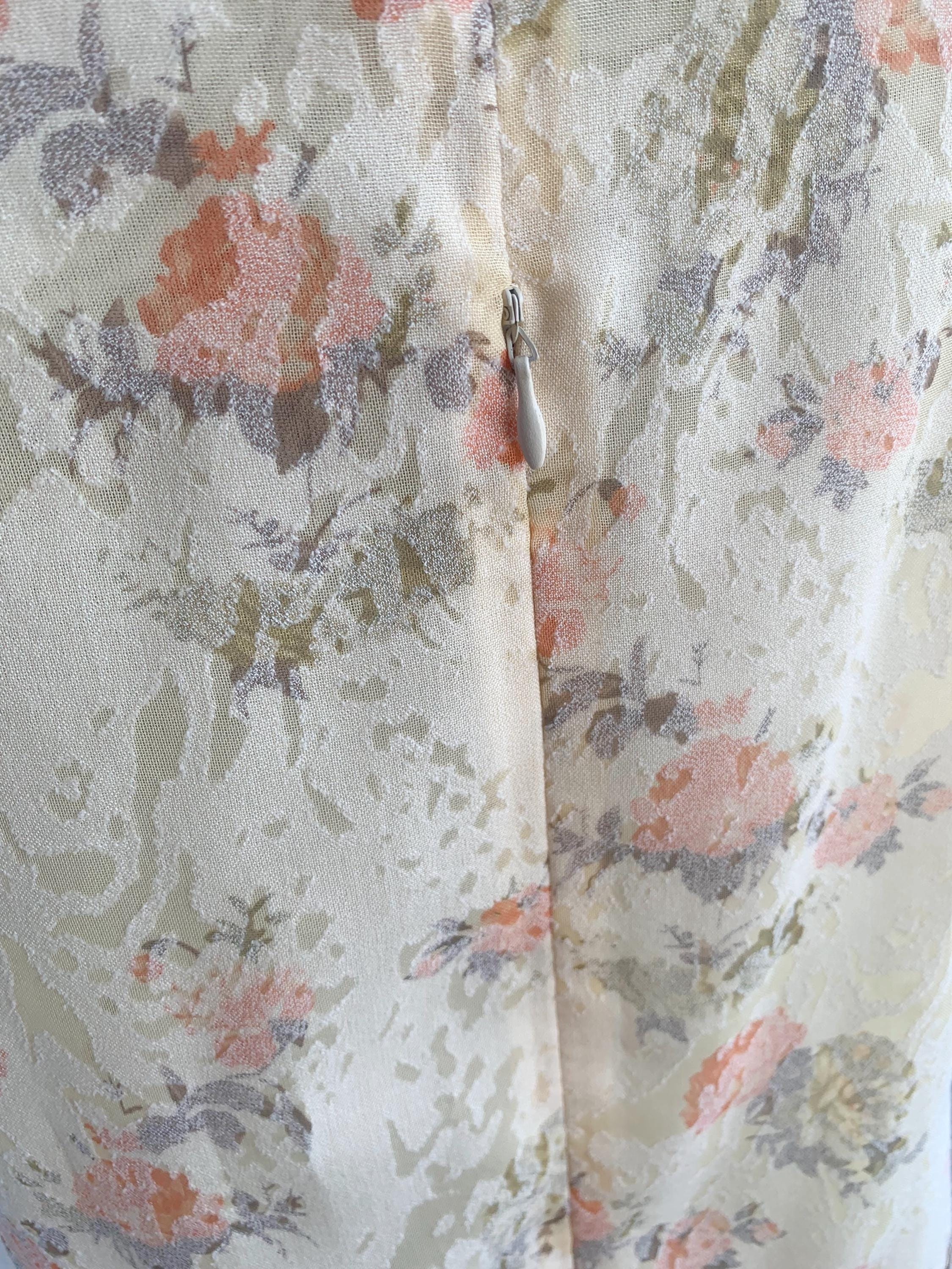 This vintage 90s exquisite ensemble features a sleeveless tank top with zip up back and a perfectly matching open-front short sleeve kimono-style jacket. Both pieces are adorned with a subtle, textured floral pattern in a harmonious palette of soft peach, and gentle sage green, beautifully contrasted against a creamy, pale yellow background. The fabric itself has a subtle jacquard woven texture, adding depth beyond a simple print.