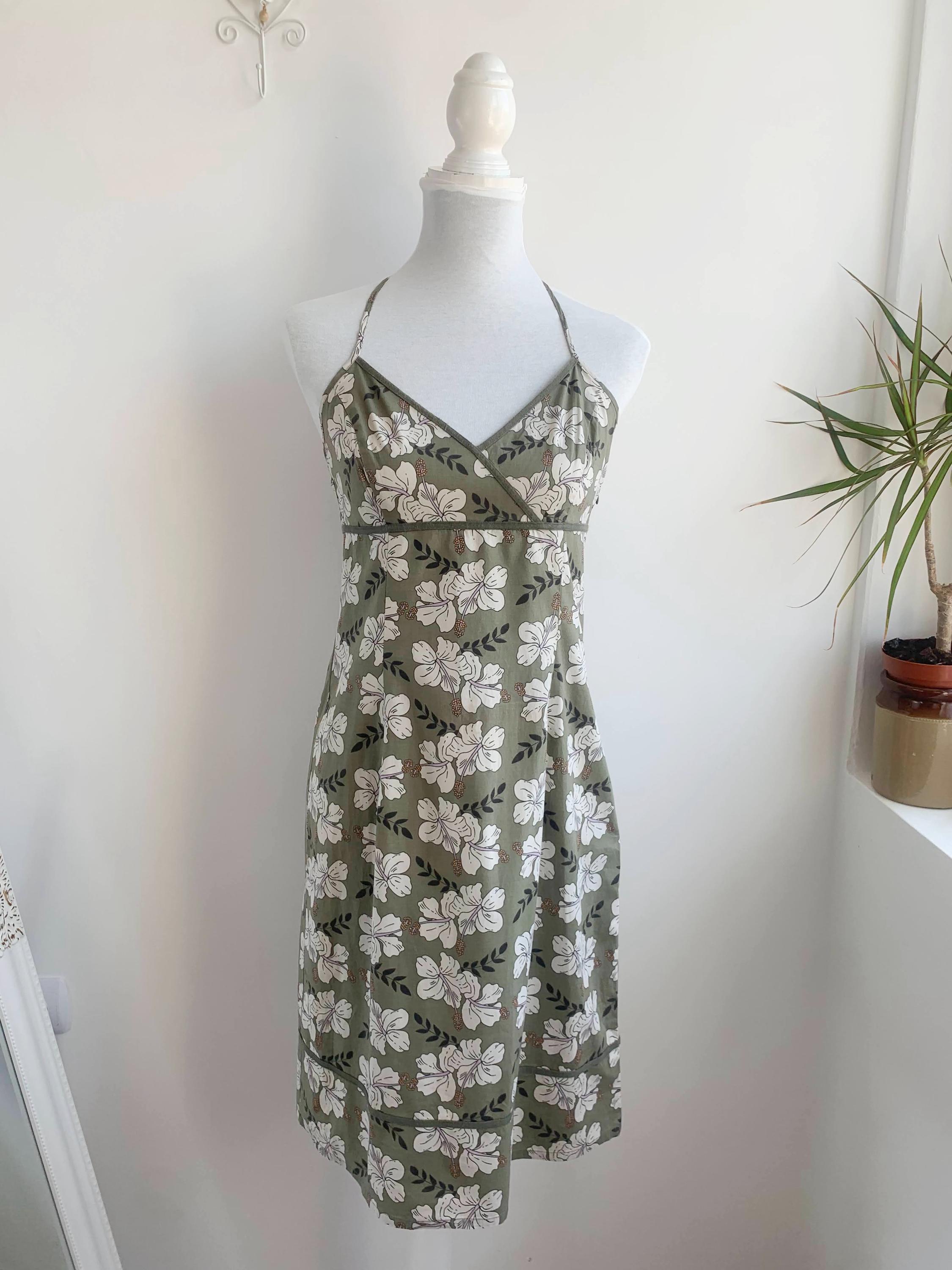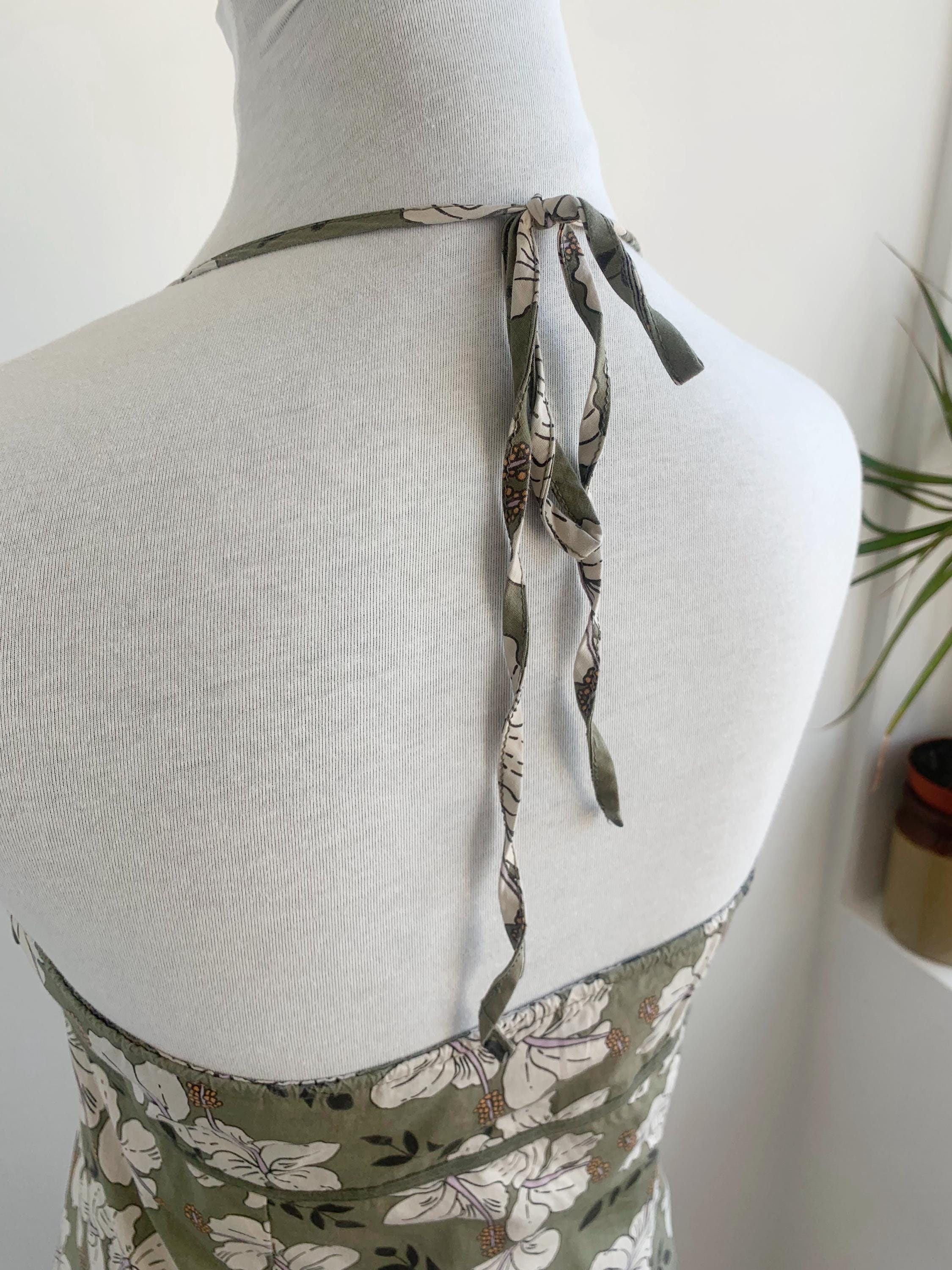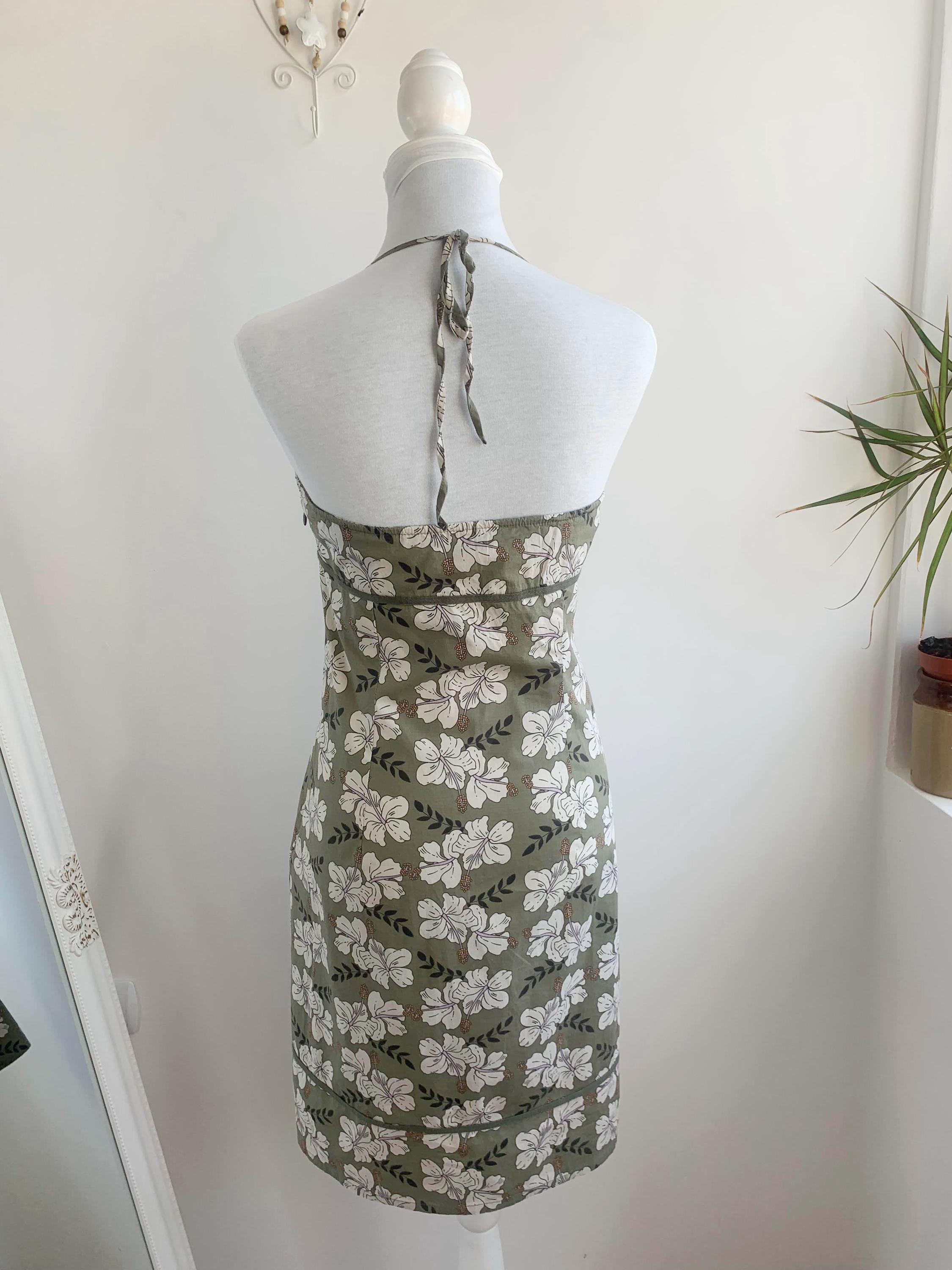 Step back in time to the carefree days of the late 90s and early 2000s with this absolutely dreamy Vintage Y2K Olive Green Floral Halter Mini Dress! This piece perfectly captures that nostalgic, free-spirited vibe we all adore.