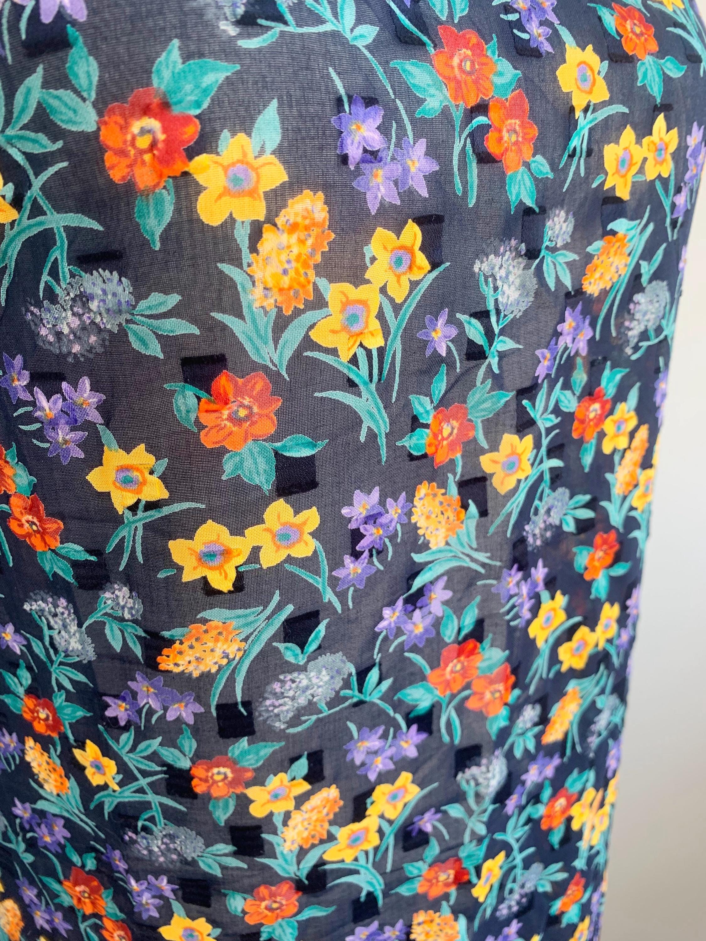 Embrace your inner boho hippie soul with this beautiful floral sleeveless blouse, featuring a vibrant, multicolored floral print set against a dark navy blue background. The sheer cotton fabric makes it an ideal festival layering piece, perfect for adding an intriguing dimension to your outfits. Imagine pairing it over a simple camisole, a bandeau, or even under an open denim shirt for that authentic Grunge floral vest aesthetic. The pattern is a true celebration of nature, with blooms in cheerful yellow, fiery orange, rich purple, and refreshing teal, making it a versatile retro flower print that effortlessly transitions from day to night.