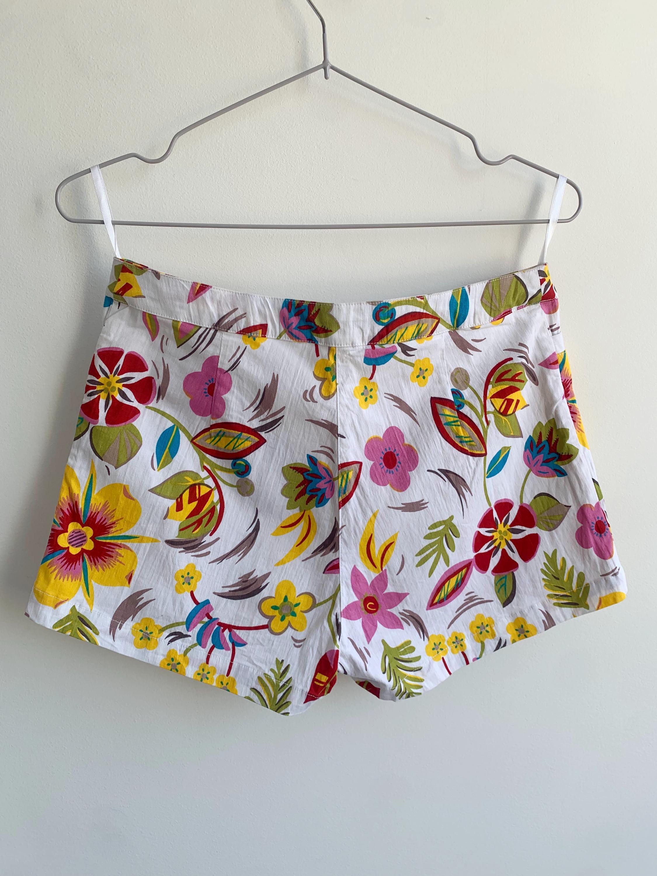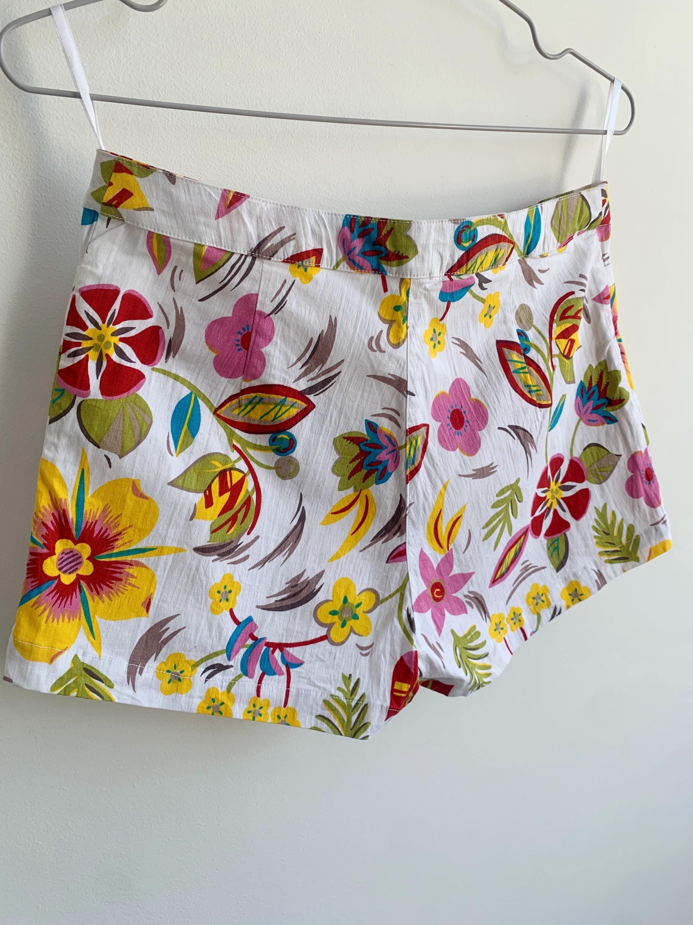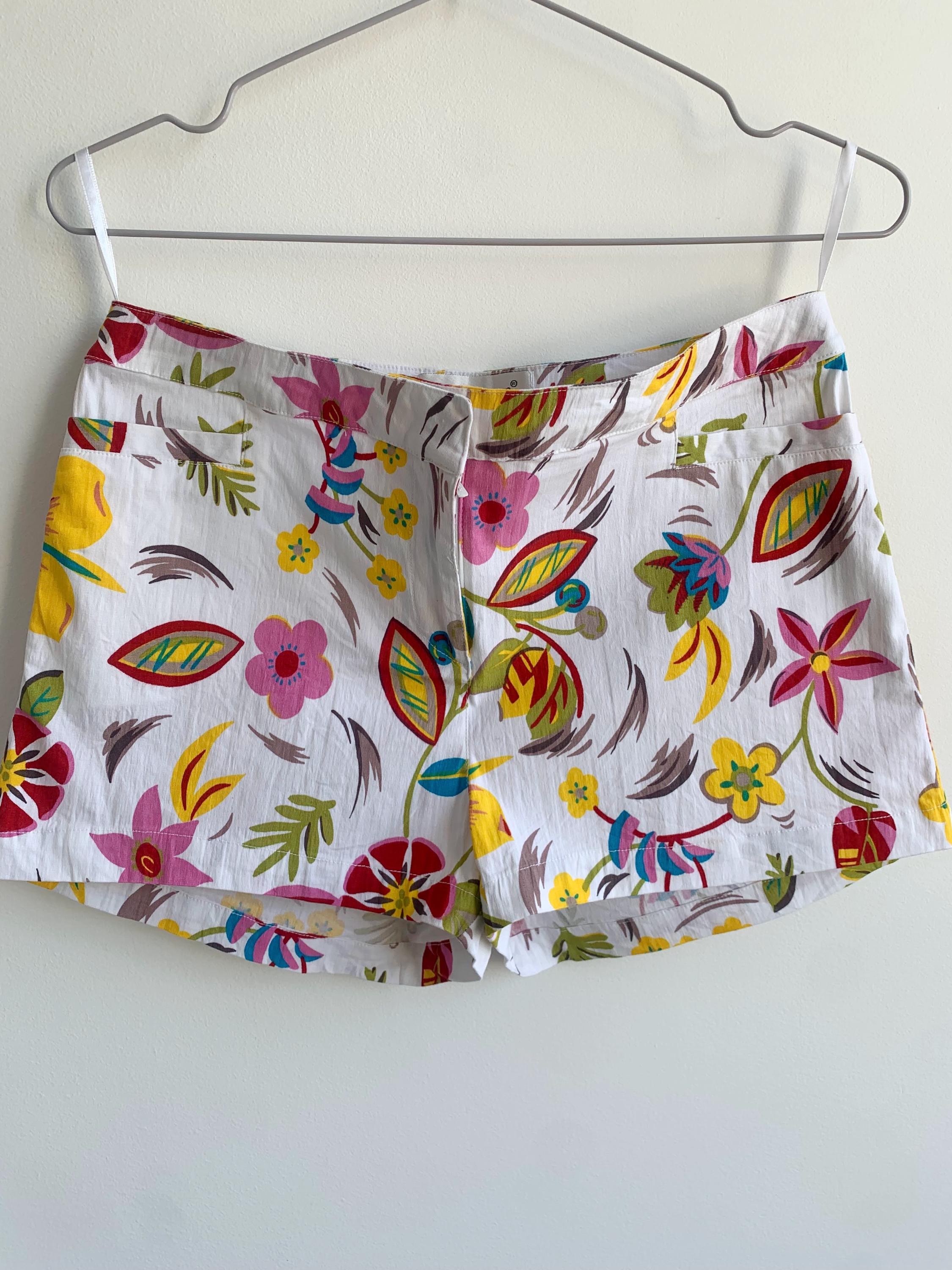 Step into a vibrant time with these absolutely stunning vintage Hennes Collection floral fhorts! If you're a 90s boho lover with a free spirit and a passion for sustainable fashion, these colorful short pants are your next must-have. These retro low waist short trousers boast a truly vibrant print floral pattern of colorful blooms on a crisp white background, perfect for a summer festival or your next getaway.